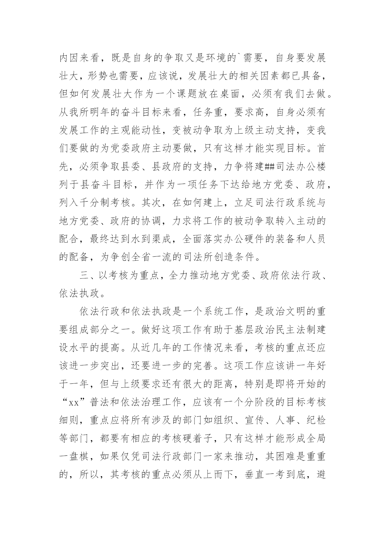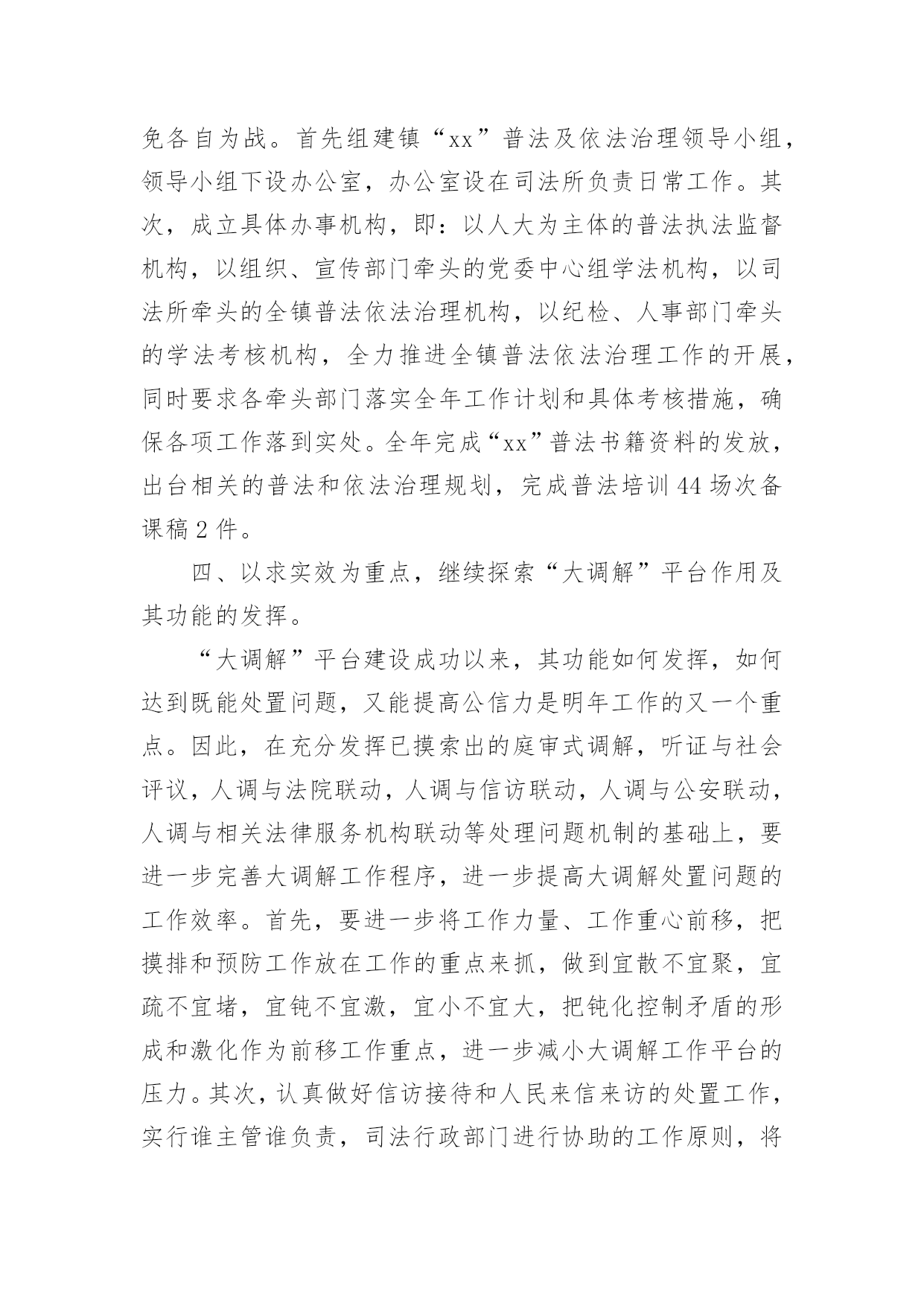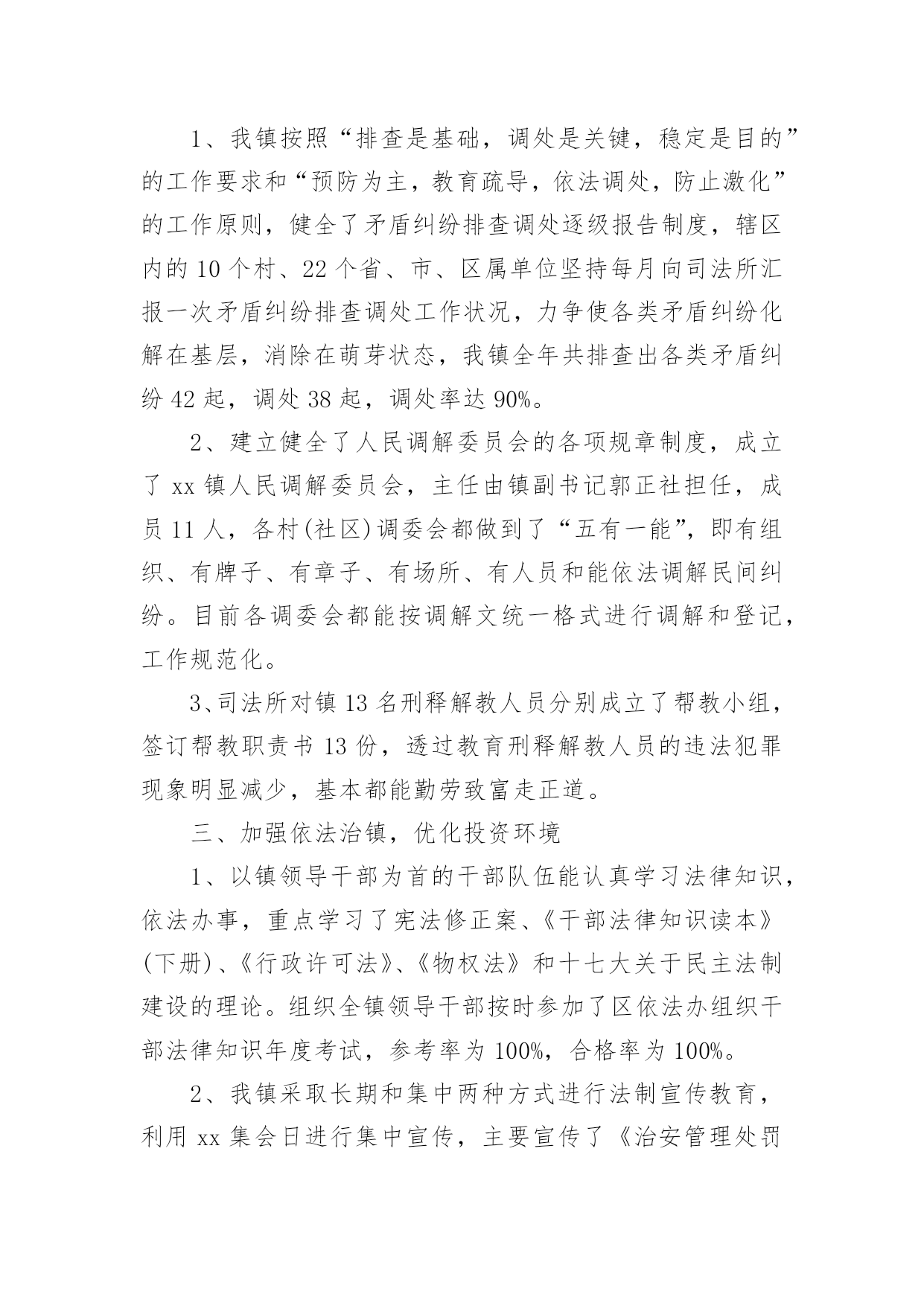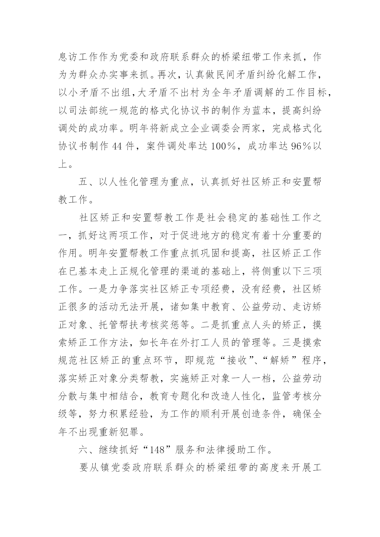 司法所年终工作总结司法所年终工作总结12篇总结是事后对某一时期、某一项目或某些工作进行回顾和分析,从而做出带有规律性的结论,它能使我们及时找出错误并改正,不如我们来制定一份总结吧。但是总结有什么要求呢?以下是小编为大家整理的司法所年终工作总结,仅供参考,欢迎大家阅读。司法所年终工作总结1回顾这半年来的工作,有领导的关心,有同事的关怀,有工作中的挫折,也有取得的小小成绩,工作使我学到了丰富的实践知识、工作技巧以及做人的道理。110接处警是我在街道司法科的第一项工作,起初,由于我以前未从事过街道方面的工作,加上对周围地区的不熟悉,因此,工作效率不是很高,但是,在司法科负责人和办公室其他工作人员的帮助下,我很快了解了街道内的×个居委会,并且通过走访形式,熟悉了各居委会所在的地理位置,认识了一些居委会干部,这对我开展110接处警工作起到了相当大的作用。每当发生110接警案件时,我积极与各个居委会联系情况,及时了解矛盾的解决情况,基本上做到了当天情况当天反馈区司法局的目标。同时,我对司法科110接警单进行了无纸化办公,将每一份11处理单进行计算机登记,做到统一化管理。我是学法律专业‘出生’,而且法律咨询工作一直是我的强项,因此,在司法科“窗口”接待工作中,我基本‘承包’了所有居民的来访法律接待工作。每一次接待我都要求自己做到“四心”,即接待居民要热心、解答问题要细心、遇到疑问要耐心、弱势群体要关心。可以说,做到这“四心”是实现居民咨询满意率达100%的基本前提。另外,我还利用业余时间不断充实丰富自己的法律知识,做到居民带着疑惑烦恼来,提着满意高兴走。在法律宣传方面,我坚持每月出版一期街道法律动态,及时传递各类法律、信息动态,让居民了解我街道司法科的工作,做到政务公开,接受居民监督。11月份我制作了法律宣传栏,为了能尽快使宣传栏投入使用,我不仅利用工作时间,而且利用午休以及平时休息时间,从构思策划到收集资料,再到制作版面以及绘图上彩,用整整1星期的时间将法律宣传栏的四个版块‘法律小常识、援助天地、警示钟、信息之窗’制作完成。由于宣传栏有各类丰富的法律常识、案例、信息等,并配以色彩艳丽的图画,图文并茂,吸引了大量居民的兴趣,也得到了居民的高度认可。总而言之,工作才刚刚开始,取得的成绩也仅仅代表过去,我知道,我不懂的东西还很多,要学习的也很多,一时的沾沾自喜或骄傲自满都是不可取的,因此,在今后的工作中我仍然要继续努力学习业务知识,积累实践经验,兢兢业业,踏实勤奋;在政治思想上,要处处以的标准严格要求自己,积极要求上进。我相信,随着时间的推移,我会将工作做得更好。在各位领导的指导下,在同志们的支持和帮助下,我紧紧围绕我局的中心工作,充分发挥岗位职能,不断改进工作方法,较好地履行了工作职责,完成工作任务。现将工作情况作以简要汇报。一是勤于学习,提高政治水平和业务素质。利用工作和业余时间系统地学习各项理论知识,经过不断积累经验,能够较为从容地处理日常工作中出现的各类问题,保证本岗位各项工作的'正常运行,在实施各项工作的过程中,没出现过明显失误。二是勤于动笔,增强文字功底和思维能力。为提高自身写作能力,我从已经成型的材料入手,边写边改,边练边记,在这方面,各位领导和同志们给予我很多建议帮助,使我荣获河北省财政系统公文写作比赛优秀奖。三是勤于沟通,加强关系处理和主动补位。能与其他股室人员密切配合,互相支持,保证整体工作不出现纰漏。在工作中明确工作原则,本职工作要保质保量完成,不属于自己本职工作范围的,也要配合其他人员按时完成,做到主动帮忙、热情服务。虽然这一年的工作中我取得一些成绩,但还存在一定的问题和不足。一是工作有急躁情绪,有时工作急于求成,反而影响了工作的进度和质量;二是处理部分工作时还不能得心应手,当出现新的主题活动时,显得无从着手。20xx年,我从思想认识上、业务及理论知识上有了明显提高,这些进步是与局领导、同事们对我极大支持和帮助离不开的。在此,我表示衷心的感谢和致敬,也真诚地希望在今后的工作中,局领导、同事们能给予我一如既往的关怀和支持,做得不妥之处还请批评和指正。在新的一年里,我将更加努力工作,发扬成绩,改正不足。司法所年终工作总结220xx年,##镇司法行政工作总的指导思想是:紧紧围绕创建“平安##”构建和谐社会为工作出发点,从稳定压倒一切的政治高度,突出抓好“大调解”平台建设,强化工作重点,积极推进民主法制进程,从人性化管理的角度出发,突出提高队伍的综合素质,以人为本推动全局工作,为地区的经济、社会发展和政治文明建设作出应有的贡献。20xx年工作目标是:1、力争筹建镇司法办公大楼一幢,进一步改善办公条件;2、继续探索“大调解”平台作用以及功能的发挥;3、新组建基层人民调委会两个;4、争取申报省厅集体二等功;5、确保信访工作有序,