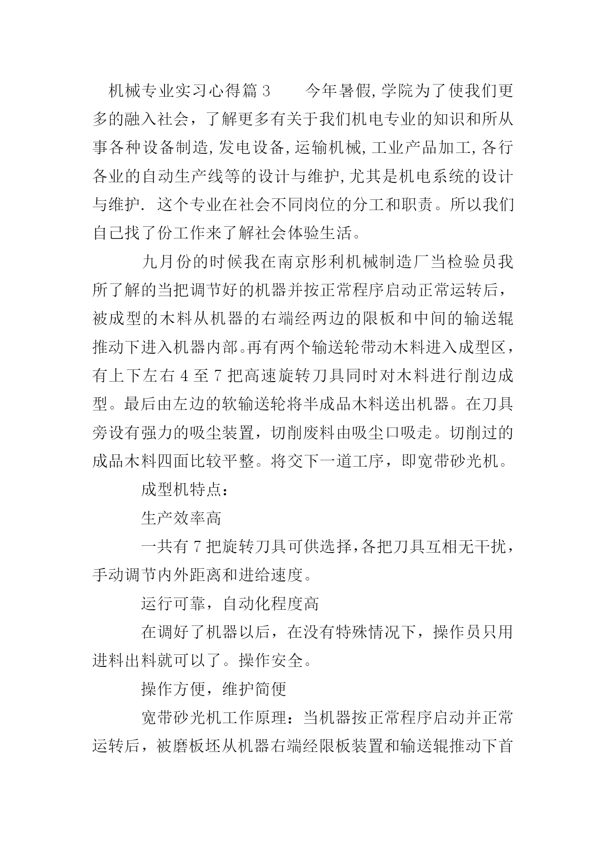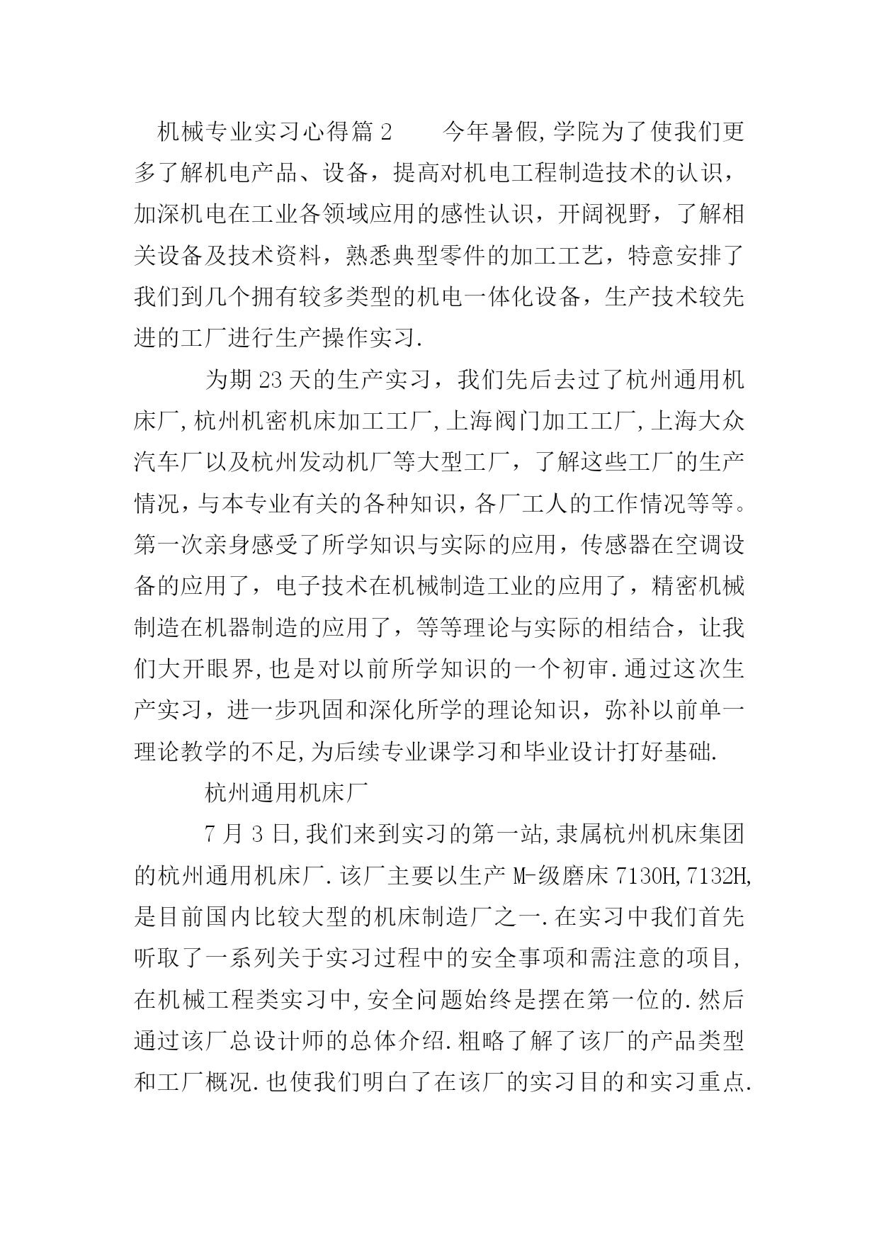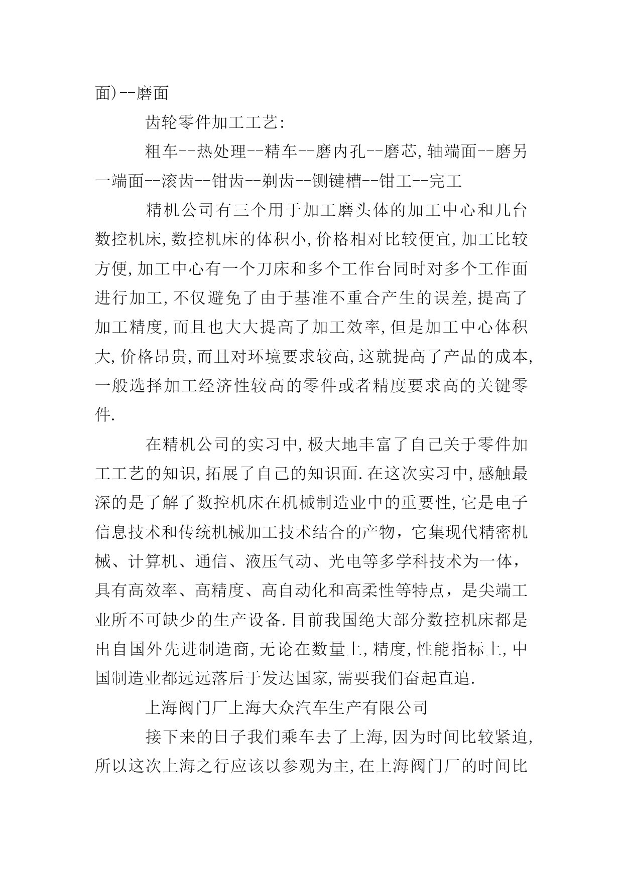 机械专业实习心得机械专业实习心得篇1我是机械学院学院XX级的学生,我从XX年9份开始学习有关机械专业的知识今年的7月份大概有两年的时间了,在这两年的时间里我学习了有关机械的相关课程,具备了部分的能力。今年暑假我投身到实习的大军中,找到了某公司进行实习,下面就我的实习感受,将暑期实习工作总结报告如下:1)感受到了公司中真是气氛。我在编写程序的时候觉得其中一个地方要按我以为的怎样怎样写,后来项目经理在测试的时候发现了问题,和其他程序员的模块衔接出现了一些乱码,就是用全角的中文输入时会出现乱码状况,项目经理就很气氛,把我给批了一顿。但是当时感觉自己的想法没有错,却没有想到会出现乱码状况,才发现自己学的还是不是很系统。项目经理的话或者说老板在公司中就是头儿,服从,其实也是职员该做的事情。2)学会了沟通和处理问题的能力。和需求公司的人聊他们的需求的时候,那个人对网站的一些术语不是很懂,就需要我们用最通俗的话去和他们沟通交流,在做项目的时候得学会和同事交流沟通,相互帮助相互的发现彼此的问题,团队精神在尤其是做项目最后的时候得以体现。同时明天沟通交流的重要性,比如我的程序中我没有用过全角的汉字输入测试过,但是项目经理就查出来了,如果让其他同事帮我测试下,说不定就可与避免这种问题。毕竟一个人的能力不可能样样都通。同时做事情一定要细心,遇到任何事情都不要慌张。3)我快速学习的能力也得以提升。在学习中老师不肯能把所有的东西都教会你,在学校中老师只是大概提了一些的东西甚至一点都没有提到的知识,在做项目的时候却用到了。就需要你快速的学习能力,接受能力,并且把所学到的东西快速的运用到实践中去,做好工作计划,让工作有条有理。实践,就是把我们在学校所学到的理论知识},运用到客观实际中去,使自己所学的理论知识}有用武之地。只学习不实践,那么所学就等于零。理论应该与实践相结合。而另一方面,实践可以为以后找工作打下基础。通过,,这段时间的实习,我学到了一些在课堂上学不到的东西。因为在这里身处的环境不同,所接触的人与事也不相同,从中学到的东西自然就不一样了。要学会在实践中学习,从学习中实践。通过这次工作实习让我学到了很多,而当初参加暑假工作实习的目的是对自己这一年来的所学到计算机知识、所培养的能力以实践的方式来检验,培养自己主动学习知识、分析问题、解决问题的能力和团队合作精神与人协调处理事物的能力,学会了用工作计划来约束自己,虽然这次实习没能全面的学会,但是也让我稍稍的浅尝了滋味,让我提高很多,这次实习真是受益匪浅。机械专业实习心得篇2今年暑假,学院为了使我们更多了解机电产品、设备,提高对机电工程制造技术的认识,加深机电在工业各领域应用的感性认识,开阔视野,了解相关设备及技术资料,熟悉典型零件的加工工艺,特意安排了我们到几个拥有较多类型的机电一体化设备,生产技术较先进的工厂进行生产操作实习.为期23天的生产实习,我们先后去过了杭州通用机床厂,杭州机密机床加工工厂,上海阀门加工工厂,上海大众汽车厂以及杭州发动机厂等大型工厂,了解这些工厂的生产情况,与本专业有关的各种知识,各厂工人的工作情况等等。第一次亲身感受了所学知识与实际的应用,传感器在空调设备的应用了,电子技术在机械制造工业的应用了,精密机械制造在机器制造的应用了,等等理论与实际的相结合,让我们大开眼界,也是对以前所学知识的一个初审.通过这次生产实习,进一步巩固和深化所学的理论知识,弥补以前单一理论教学的不足,为后续专业课学习和毕业设计打好基础.杭州通用机床厂7月3日,我们来到实习的第一站,隶属杭州机床集团的杭州通用机床厂.该厂主要以生产M-级磨床7130H,7132H,是目前国内比较大型的机床制造厂之一.在实习中我们首先听取了一系列关于实习过程中的安全事项和需注意的项目,在机械工程类实习中,安全问题始终是摆在第一位的.然后通过该厂总设计师的总体介绍.粗略了解了该厂的产品类型和工厂概况.也使我们明白了在该厂的实习目的和实习重点.在接下来的一端时间,我们分三组陆续在通机车间,专机车间和加工车间进行生产实习.在通机车间,该车间负责人带我们参观了他们的生产装配流水线,并为我们详细讲解了平面磨床个主要零部件的加工装配工艺和整机的动力驱动问题以及内部液压系统的一系列构造.我最感兴趣的应该是该平面磨床的液压系统,共分为供油机构,执行机构,辅助机构和控制机构.从不同的角度出发,可以把液压系统分成不同的形式.按油液的循环方式,液压系统可分为开式系统和闭式系统。开式系统是指液压泵从油箱吸油,油经各种控制阀后,驱动液压执行元件,回油再经过换向阀回油箱。这种系统结构较为简单,可以发挥油箱的散热、沉淀杂质作用,但因油液常与空气接触,使空气易于渗入系统,导致机构运动不平稳等后果。