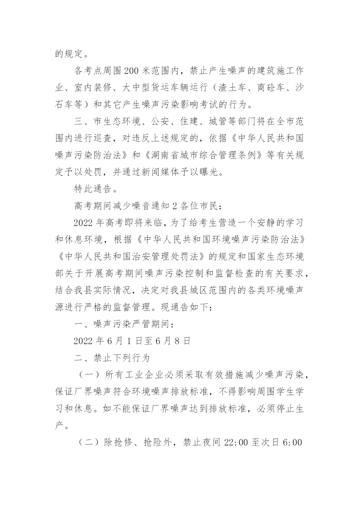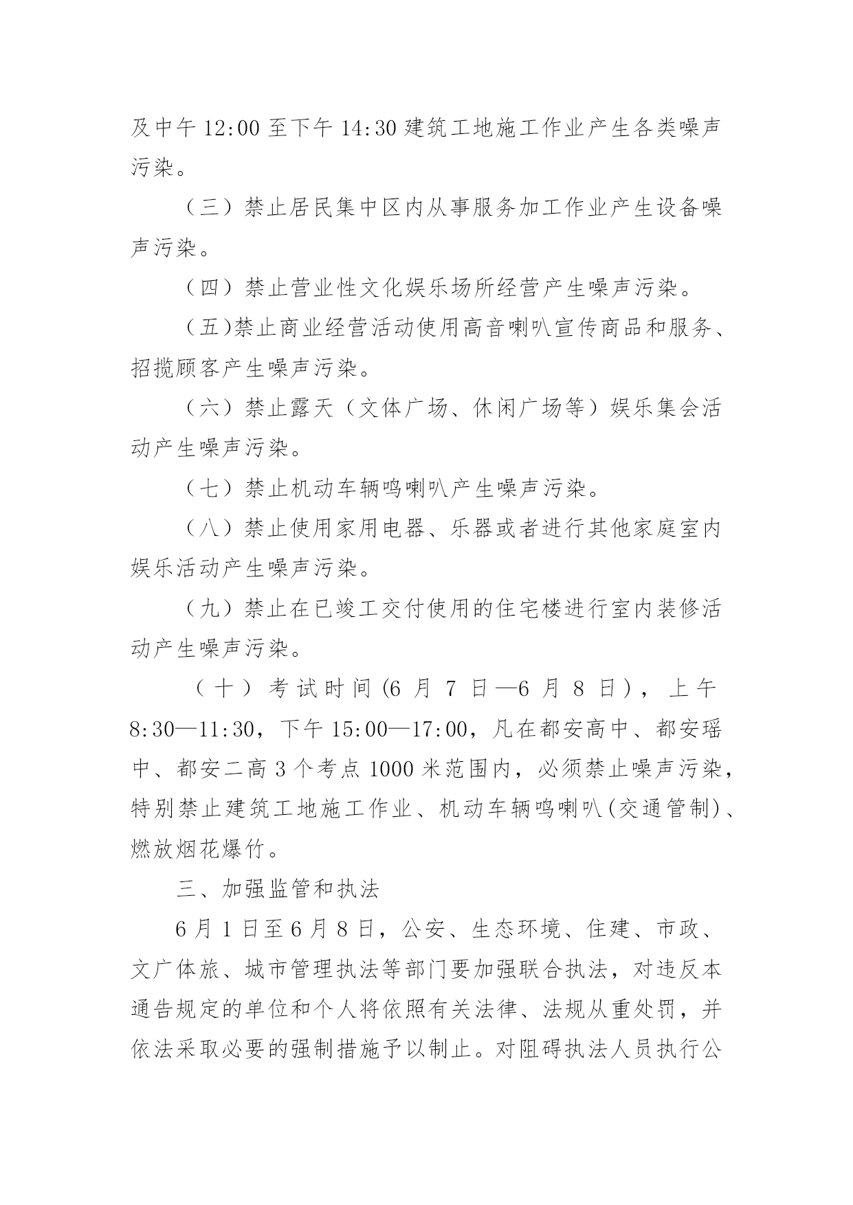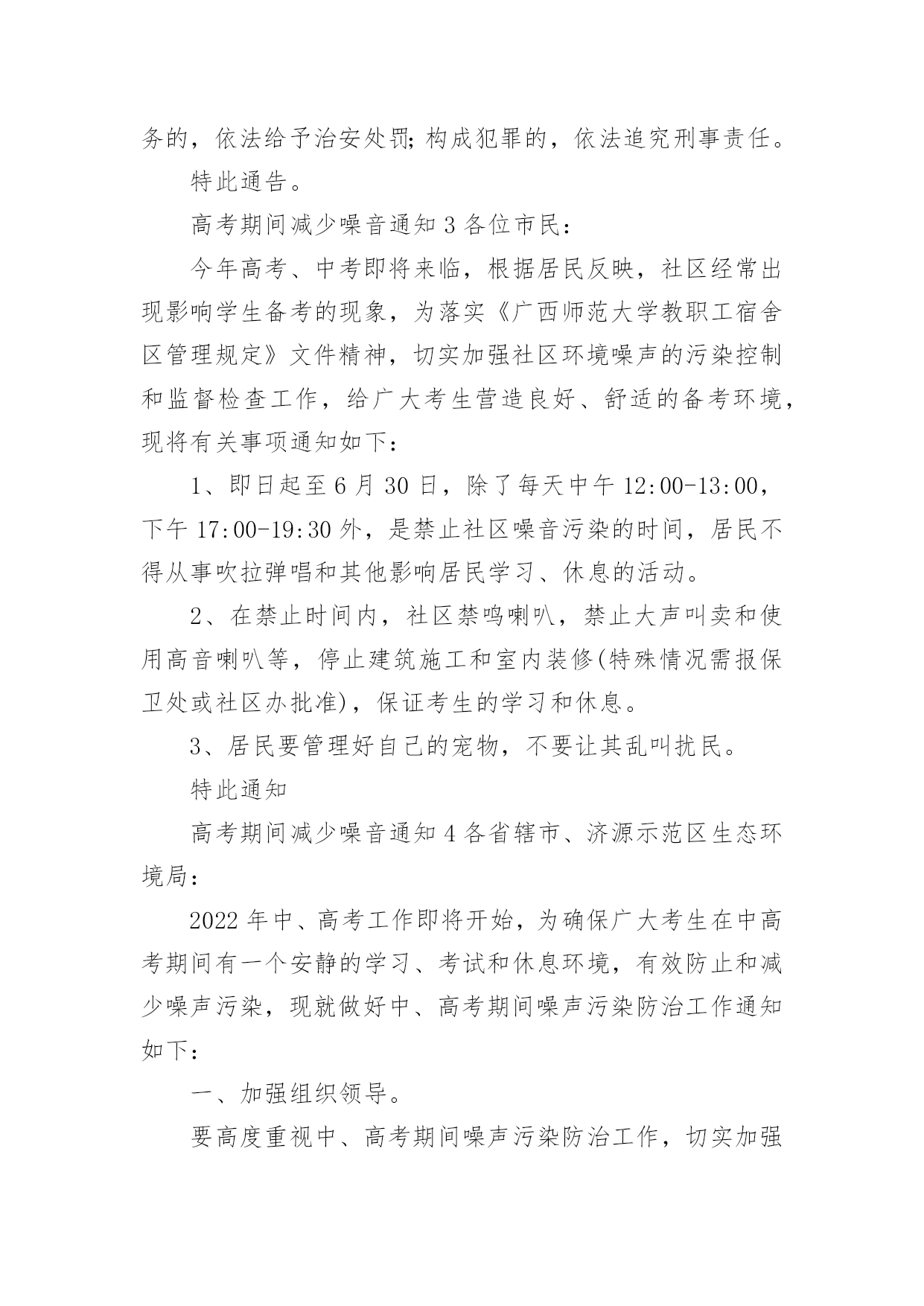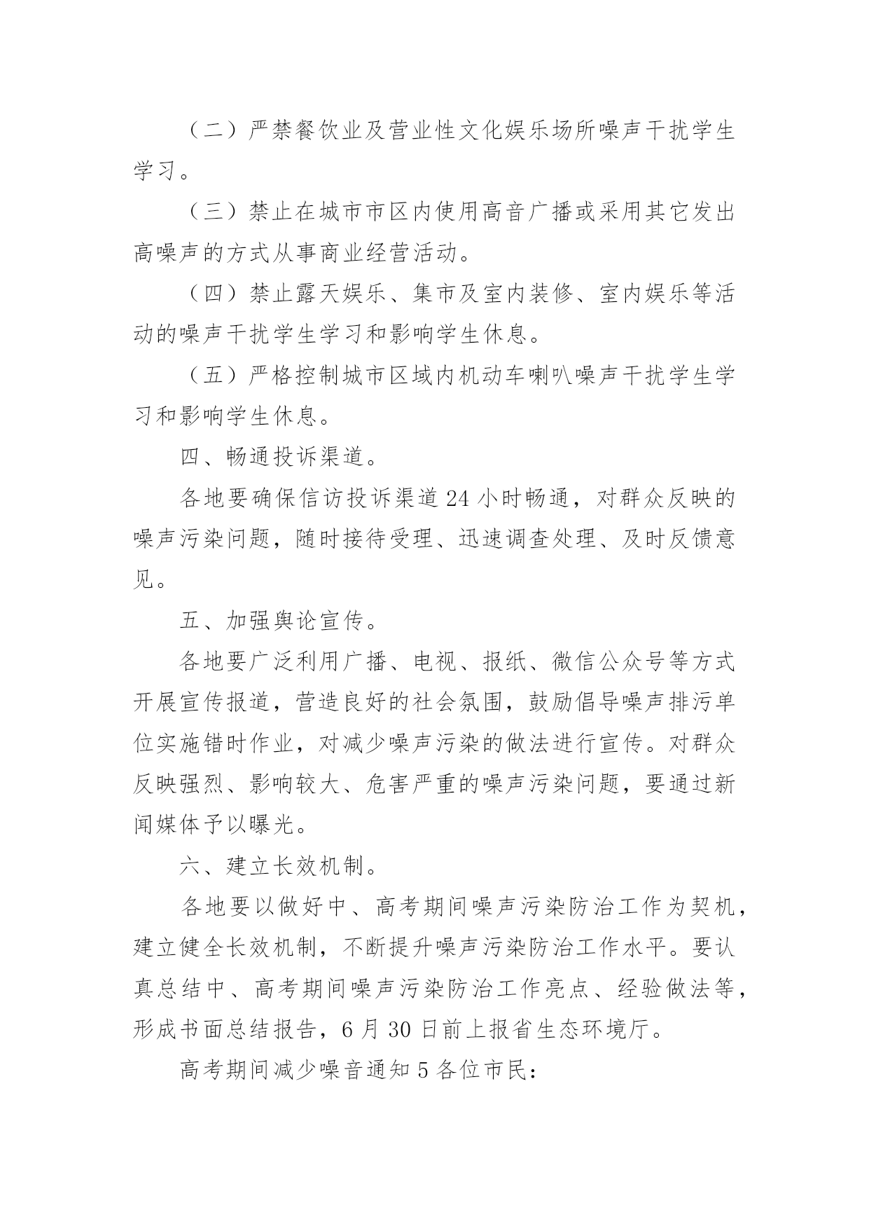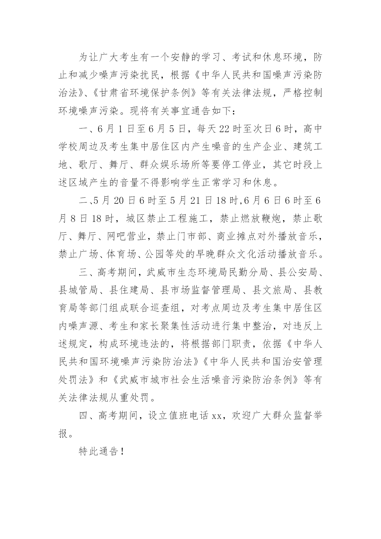 高考期间减少噪音通知高考期间减少噪音通知(精选5篇)在现实社会中,很多情况下我们需要用到通知,通告是党和国家机关、人民团体、企事业单位在一定范围内公布应当遵守或者周知的事项时,使用的下行公文。在写之前,可以先参考范文,以下是小编为大家整理的高考期间减少噪音通知(精选5篇),仅供参考,欢迎大家阅读。高考期间减少噪音通知1各位市民:2022年高考、学考和中考“三考”即将临近,为给考生提供良好的学习、考试和休息环境,依据《中华人民共和国噪声污染防治法》和《湖南省城市综合管理条例》等法律法规要求,经研究,决定在“三考”期间严格控制我市环境噪声污染,现就有关事项通告如下:一、6月7日至9日高考期间、6月12日至14日学考期间、6月18日至20日中考期间,在市区范围内禁止午间(中午12时至15时)和夜间(20时至次日凌晨7时)从事建筑施工作业、室内装修活动和其它产生噪声的生产、经营活动(抢修抢险等特殊作业除外)。二、6月7日至9日高考期间、6月12日至14日学考期间、6月18日至20日中考期间,严格控制在公共场所组织娱乐、集会等产生环境噪声污染的活动。禁止在商业经营活动中使用高音喇叭或采用其他发出高噪声的方法招揽顾客。严格控制机动车噪声污染,机动车辆必须遵守市区禁鸣的规定。各考点周围200米范围内,禁止产生噪声的建筑施工作业、室内装修、大中型货运车辆运行(渣土车、商砼车、沙石车等)和其它产生噪声污染影响考试的行为。三、市生态环境、公安、住建、城管等部门将在全市范围内进行巡查,对违反上述规定的,依据《中华人民共和国噪声污染防治法》和《湖南省城市综合管理条例》等有关规定予以处罚,并通过新闻媒体予以曝光。特此通告。高考期间减少噪音通知2各位市民:2022年高考即将来临,为了给考生营造一个安静的学习和休息环境,根据《中华人民共和国环境噪声污染防治法》《中华人民共和国治安管理处罚法》的规定和国家生态环境部关于开展高考期间噪声污染控制和监督检查的有关要求,结合我县实际情况,决定对我县城区范围内的各类环境噪声源进行严格的监督管理。现通告如下:一、噪声污染严管期间:2022年6月1日至6月8日二、禁止下列行为(一)所有工业企业必须采取有效措施减少噪声污染,保证厂界噪声符合环境噪声排放标准,不得影响周围学生学习和休息。如不能保证厂界噪声达到排放标准,必须停止生产。(二)除抢修、抢险外,禁止夜间22:00至次日6:00及中午12:00至下午14:30建筑工地施工作业产生各类噪声污染。(三)禁止居民集中区内从事服务加工作业产生设备噪声污染。(四)禁止营业性文化娱乐场所经营产生噪声污染。(五)禁止商业经营活动使用高音喇叭宣传商品和服务、招揽顾客产生噪声污染。(六)禁止露天(文体广场、休闲广场等)娱乐集会活动产生噪声污染。(七)禁止机动车辆鸣喇叭产生噪声污染。(八)禁止使用家用电器、乐器或者进行其他家庭室内娱乐活动产生噪声污染。(九)禁止在已竣工交付使用的住宅楼进行室内装修活动产生噪声污染。(十)考试时间(6月7日—6月8日),上午8:30—11:30,下午15:00—17:00,凡在都安高中、都安瑶中、都安二高3个考点1000米范围内,必须禁止噪声污染,特别禁止建筑工地施工作业、机动车辆鸣喇叭(交通管制)、燃放烟花爆竹。三、加强监管和执法6月1日至6月8日,公安、生态环境、住建、市政、文广体旅、城市管理执法等部门要加强联合执法,对违反本通告规定的单位和个人将依照有关法律、法规从重处罚,并依法采取必要的强制措施予以制止。对阻碍执法人员执行公务的,依法给予治安处罚;构成犯罪的,依法追究刑事责任。特此通告。高考期间减少噪音通知3各位市民:今年高考、中考即将来临,根据居民反映,社区经常出现影响学生备考的现象,为落实《广西师范大学教职工宿舍区管理规定》文件精神,切实加强社区环境噪声的污染控制和监督检查工作,给广大考生营造良好、舒适的备考环境,现将有关事项通知如下:1、即日起至6月30日,除了每天中午12:00-13:00,下午17:00-19:30外,是禁止社区噪音污染的时间,居民不得从事吹拉弹唱和其他影响居民学习、休息的活动。2、在禁止时间内,社区禁鸣喇叭,禁止大声叫卖和使用高音喇叭等,停止建筑施工和室内装修(特殊情况需报保卫处或社区办批准),保证考生的学习和休息。3、居民要管理好自己的宠物,不要让其乱叫扰民。特此通知高考期间减少噪音通知4各省辖市、济源示范区生态环境局:2022年中、高考工作即将开始,为确保广大考生在中高考期间有一个安静的学习、考试和休息环境,有效防止和减少噪声污染,现就做好中、高考期间噪声污染防治工作通知如下:一、加强组织领导。要高度重视中、高考期间噪声污染防治工作,切实加强组织领导,严格按照《中华人民共和国噪声污染防治法》等法律法规,落实噪声污
