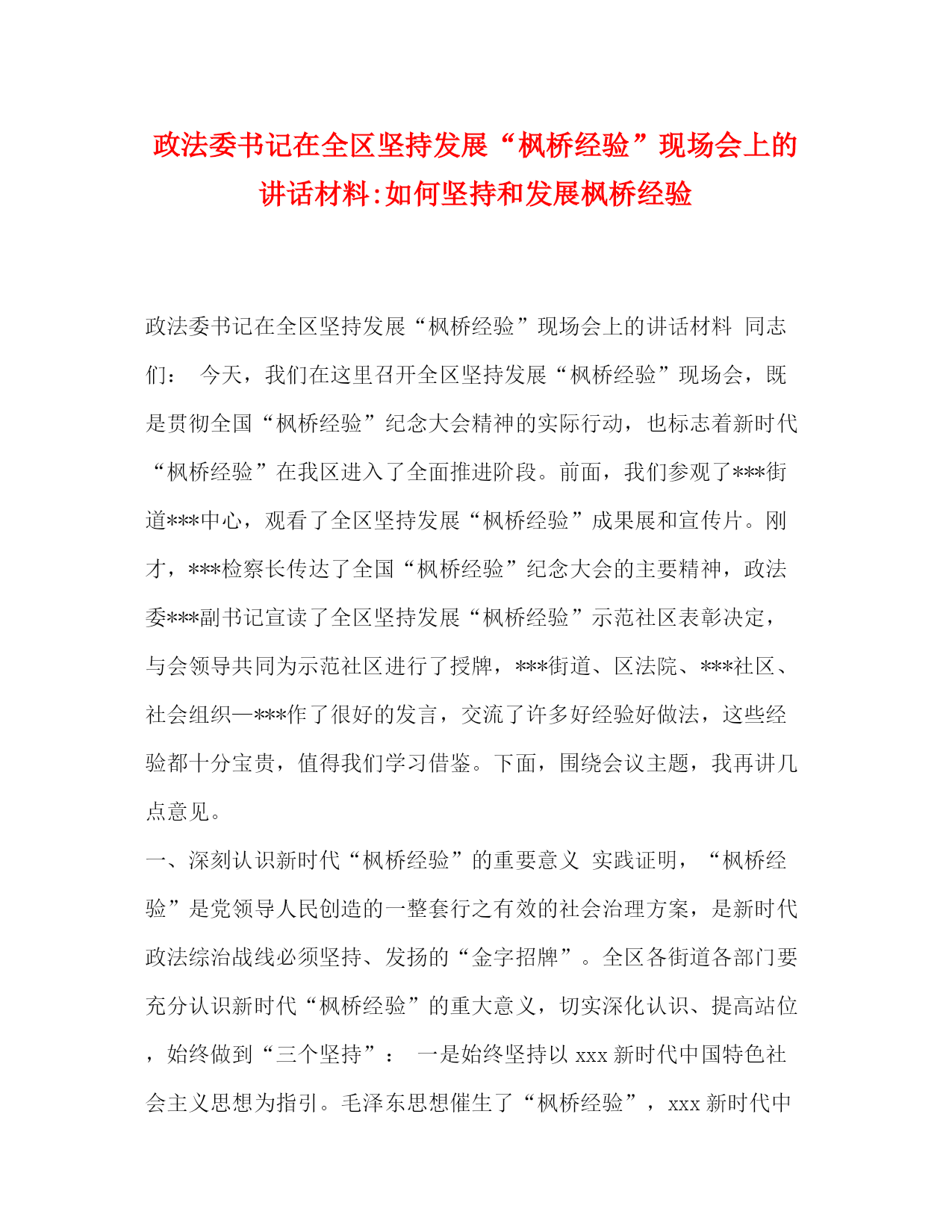 精编之政法委书记在全区坚持发展枫桥经验现场会上的讲话材料如何坚持和发展枫桥经验