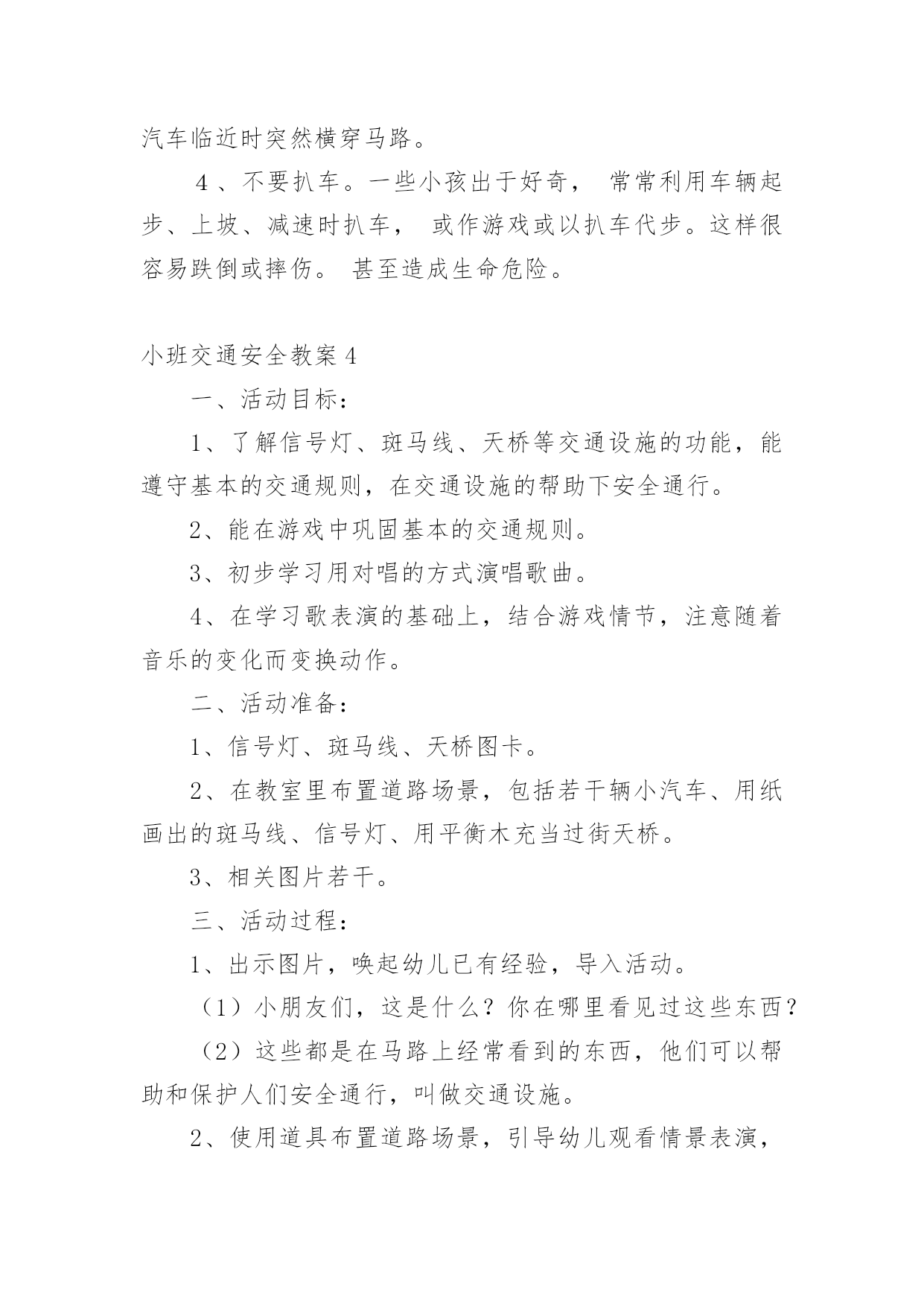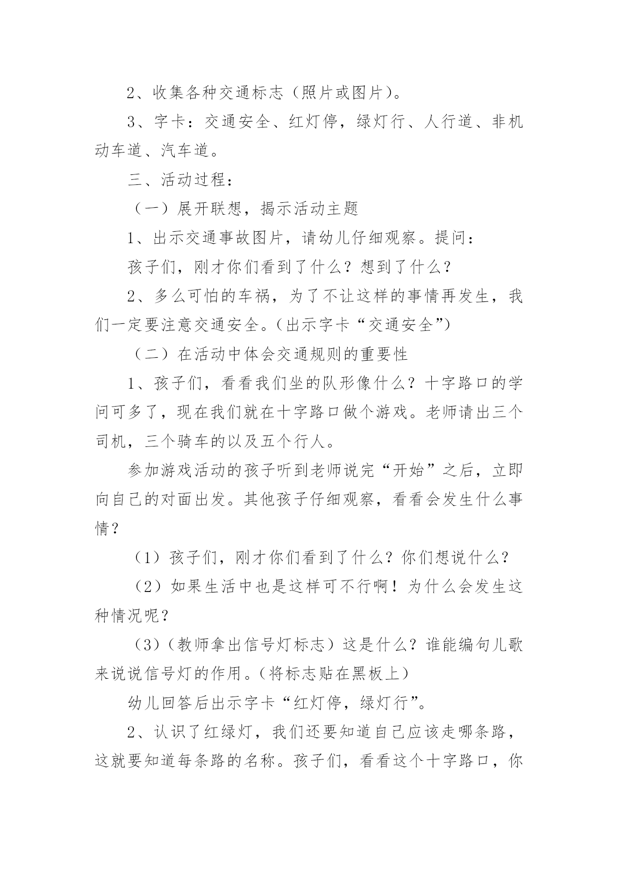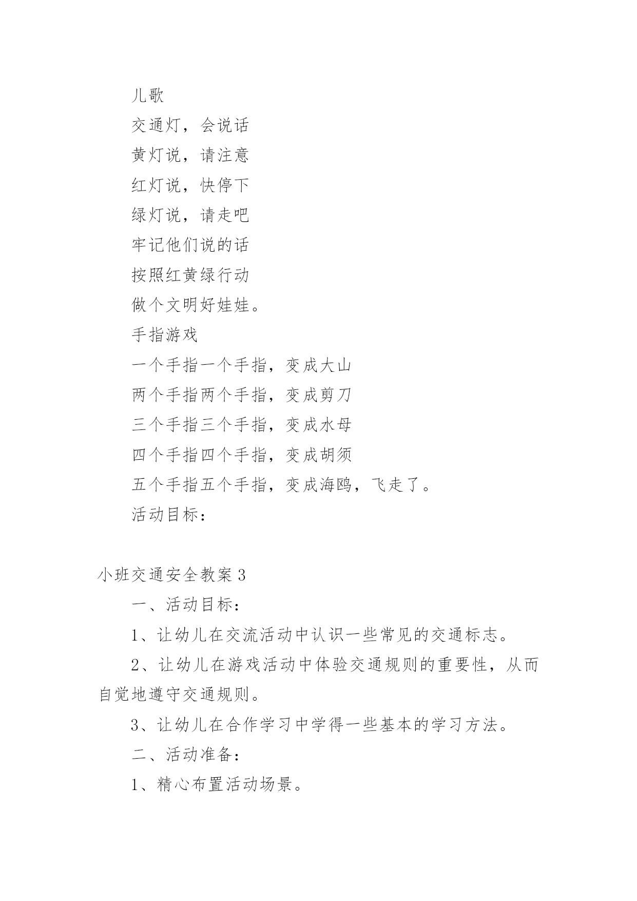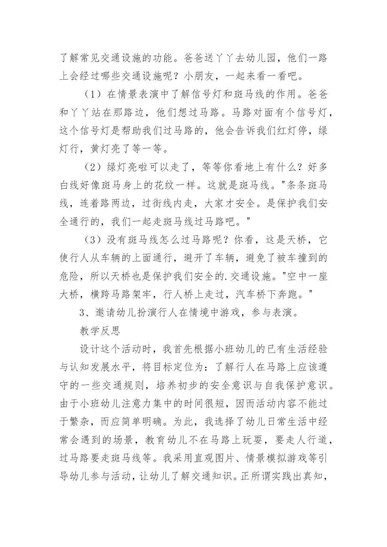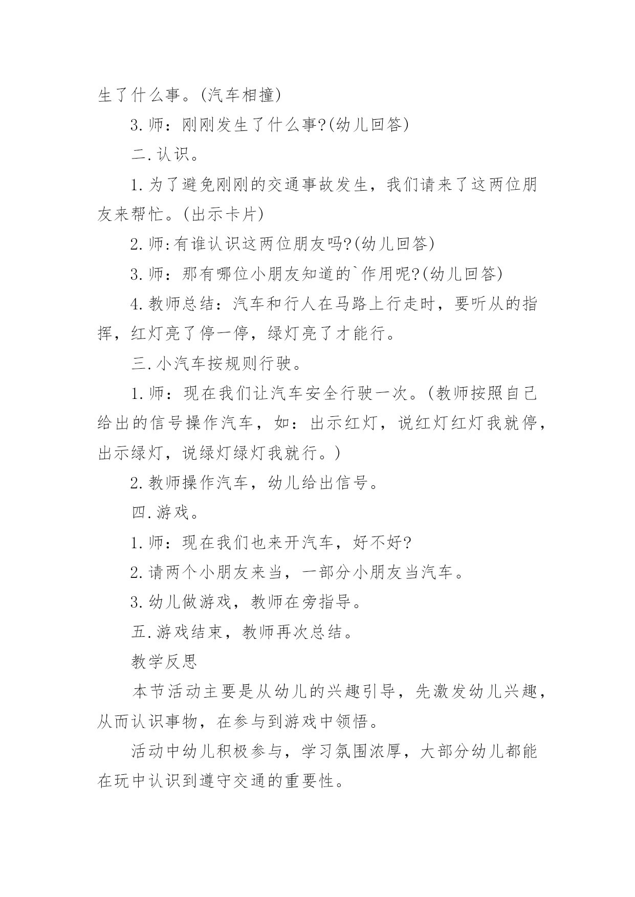 小班交通安全教案作为一位无私奉献的人民教师,通常会被要求编写教案,编写教案助于积累教学经验,不断提高教学质量。那么你有了解过教案吗?下面是小编为大家整理的小班交通安全教案,仅供参考,希望能够帮助到大家。小班交通安全教案1交通的不断发展促使我们加强交通,让幼儿了解一些危险因素,知道遵守交通规则的重要性,懂得如何保护自己。活动目标1.知道汽车、行人在马路上行走要遵守交通规则,听从的指挥。2.能根据信号做动作。教学重点、难点感知交通常识——,,。活动准备1.卡片红灯、绿灯各一个,两辆玩具小汽车。2.设置马路场景。活动过程一.导入,引起幼儿兴趣。1.师:看看,今天老师给小朋友们带来了什么?(教师出示两辆玩具汽车)2.教师示范,将两辆汽车成十字形相向开来,让幼儿发生了什么事。(汽车相撞)3.师:刚刚发生了什么事?(幼儿回答)二.认识。1.为了避免刚刚的交通事故发生,我们请来了这两位朋友来帮忙。(出示卡片)2.师:有谁认识这两位朋友吗?(幼儿回答)3.师:那有哪位小朋友知道的`作用呢?(幼儿回答)4.教师总结:汽车和行人在马路上行走时,要听从的指挥,红灯亮了停一停,绿灯亮了才能行。三.小汽车按规则行驶。1.师:现在我们让汽车安全行驶一次。(教师按照自己给出的信号操作汽车,如:出示红灯,说红灯红灯我就停,出示绿灯,说绿灯绿灯我就行。)2.教师操作汽车,幼儿给出信号。四.游戏。1.师:现在我们也来开汽车,好不好?2.请两个小朋友来当,一部分小朋友当汽车。3.幼儿做游戏,教师在旁指导。五.游戏结束,教师再次总结。教学反思本节活动主要是从幼儿的兴趣引导,先激发幼儿兴趣,从而认识事物,在参与到游戏中领悟。活动中幼儿积极参与,学习氛围浓厚,大部分幼儿都能在玩中认识到遵守交通的重要性。不足的地方就是,有一小部分幼儿只注重于玩的过程,而没能在过程中认识到游戏的真正意义。所以,如果再重新上这节课,我会在游戏中多让幼儿讨论,让他们自己去倾听领悟。活动目标:小班交通安全教案21、让幼儿了解一些基本的交通安全知识,知道,的道理。2、知道时要注意自己的安全,让幼儿知道不走斑马线的.危险性。活动准备:1、图片、斑马线2、儿歌《交通灯》活动过程:1、手指游戏,稳定幼儿情绪。"小朋友们伸出小手,跟叔叔一起玩个手指游戏好不好?"2、谈话,引入主题。"小朋友们知道怎样吗?时应该注意些什么?"(幼儿讨论)3、出示图片,提高幼儿兴趣。"我们小班小朋友太乖了,叔叔让你们看以些图片好不好?想不想看?小朋友们把小眼睛闭上,叔叔把小图片请,3,2,1,好了,睁开小眼睛。""呀?()小朋友们见过吗?小朋友们跟上街的时候有没有见过?"(幼儿讨论)4、引导幼儿认识"小班小朋友真棒,叔叔来告诉小朋友,这个是,小朋友们跟上街时候可以看一看,马路上的十字路口就有了。"5、引导幼儿讨论"我们小班小朋友那么聪明,那么,你们知道要怎样看吗?"(幼儿讨论)6、讲解怎样"小朋友说街上车多不多?危不危险?所以小朋友们一定要知道怎样看是不是。那小朋友们要张开小嘴巴跟叔叔学了好不好。""(出示图片红灯),(出示图片绿灯)。"(反复教幼儿三遍)7、引导幼儿认识斑马线"小朋友们看,这又是什么呀?你们有没有见过"(同上,介绍时一样)"小朋友们张开小嘴巴跟叔叔念,要走斑马线"8、引导幼儿学习儿歌"今天中三班小朋友表现太棒了,叔叔来你们一首儿歌好不好?每个小朋友都要张开小嘴巴跟叔叔读了,叔叔来一下,看哪个小朋友的声音最好听,等一下我们就送给它。"9、带幼儿读儿歌(引导幼儿读第一遍,鼓励幼儿读第二遍,表扬幼儿读得棒,提到幼儿兴趣,读第三遍。)10、延伸"小朋友跟上街时候还要注意些什么呀?"(做公车时先下后上,上街时要拉好的手,不能攀爬街上的护栏等等)11、请小朋友跟图片说再见,活动结束。儿歌交通灯,会说话黄灯说,请注意红灯说,快停下绿灯说,请走吧牢记他们说的话按照红黄绿行动做个文明好娃娃。手指游戏一个手指一个手指,变成大山两个手指两个手指,变成剪刀三个手指三个手指,变成水母四个手指四个手指,变成胡须五个手指五个手指,变成海鸥,飞走了。活动目标:小班交通安全教案3一、活动目标:1、让幼儿在交流活动中认识一些常见的交通标志。2、让幼儿在游戏活动中体验交通规则的重要性,从而自觉地遵守交通规则。3、让幼儿在合作学习中学得一些基本的学习方法。二、活动准备:1、精心布置活动场景。2、收集各种交通标志(照片或图片)。3、字卡:交通安全、红灯停,绿灯行、人行道、非机动车道、汽车道。三、活动过程:(一)展开联想,揭示活动主题1、出示交通事故图片,请幼儿仔细观察。提问:孩子们,刚才你们看到了什么?想到了什么?2、多么可怕的车祸,为了不让这样的事情再发生,我们一定要注意交通安全。(出示字卡“交通安全”)(二)在活动中体会交通规则的重要性1、孩