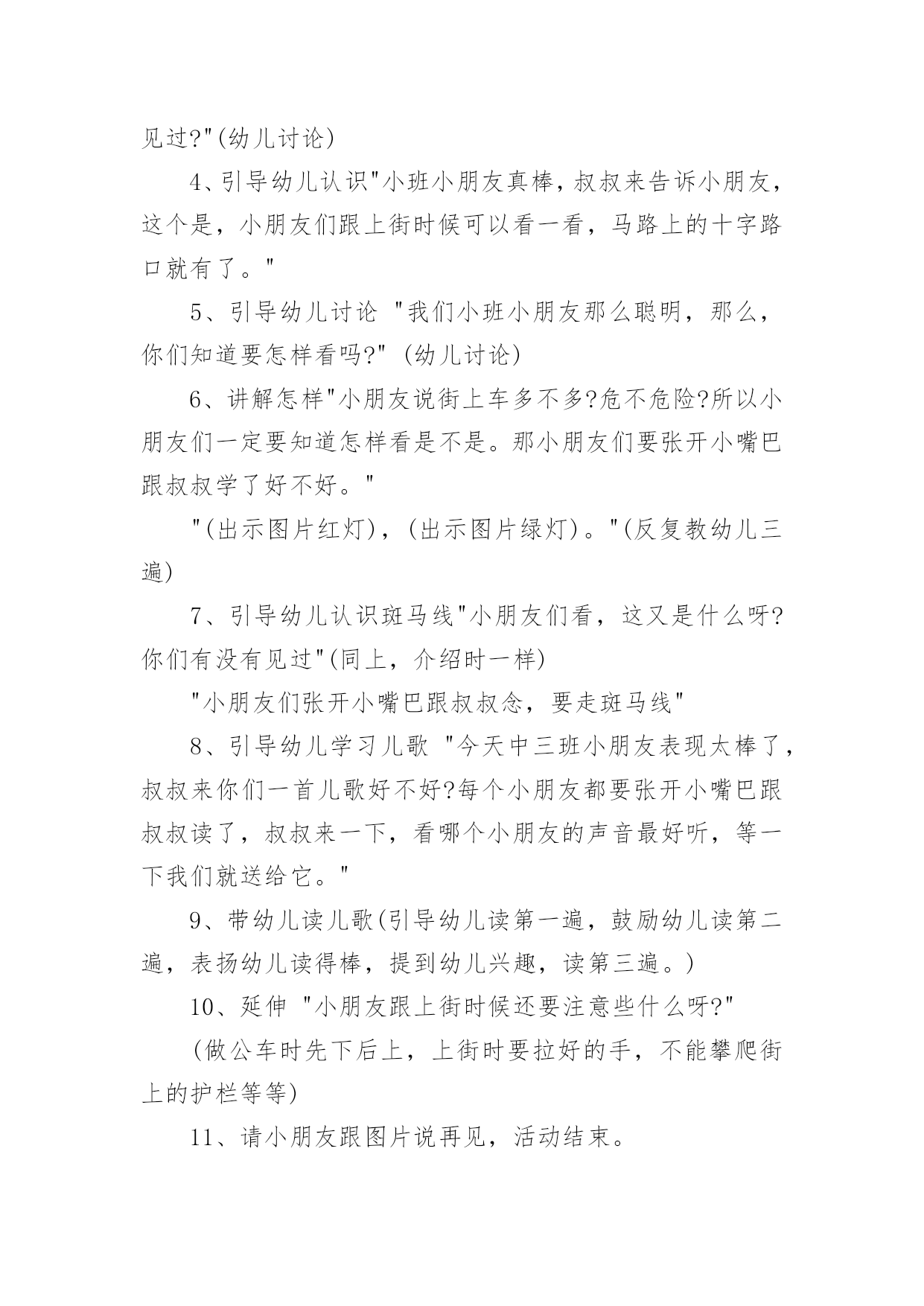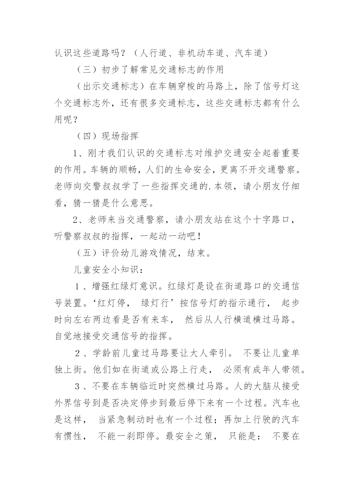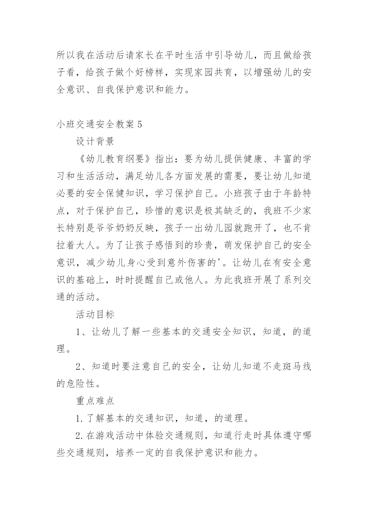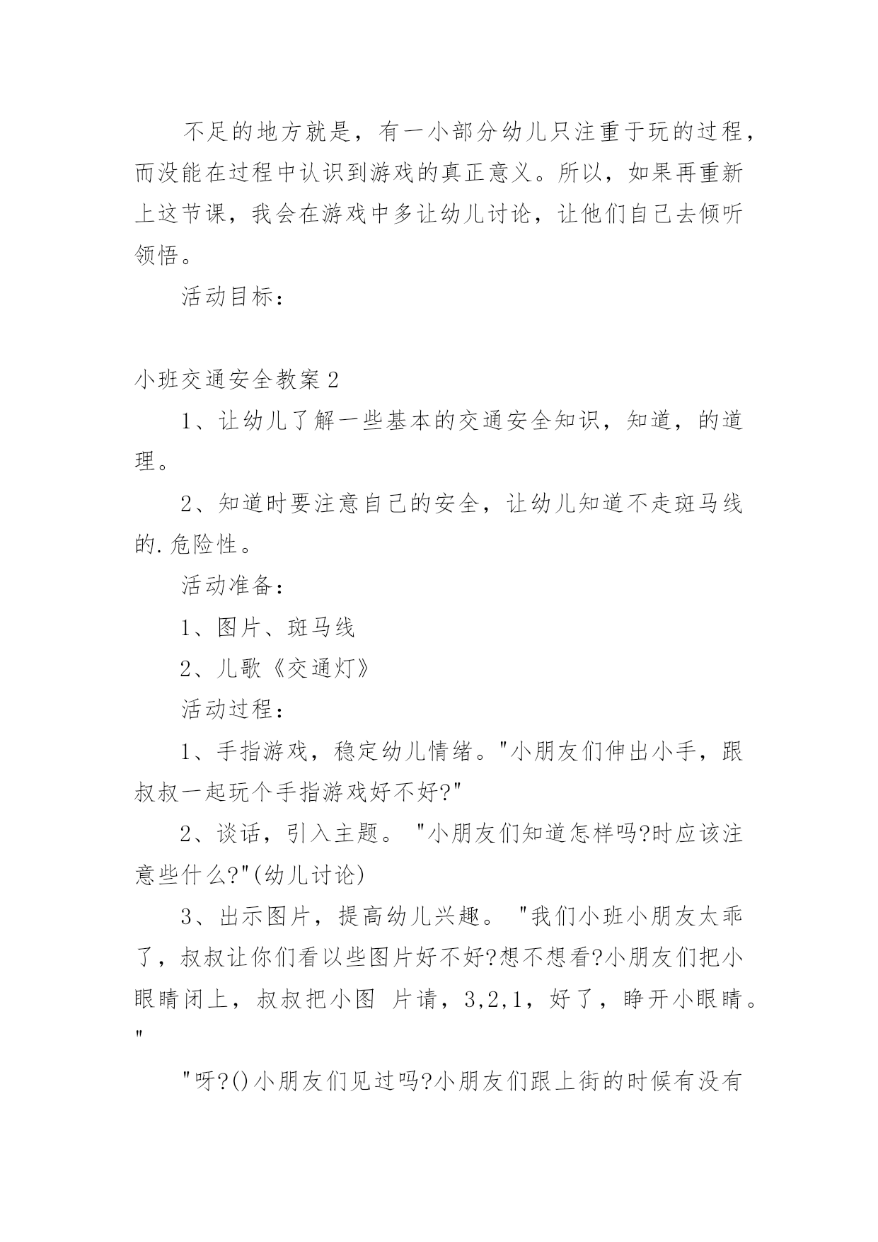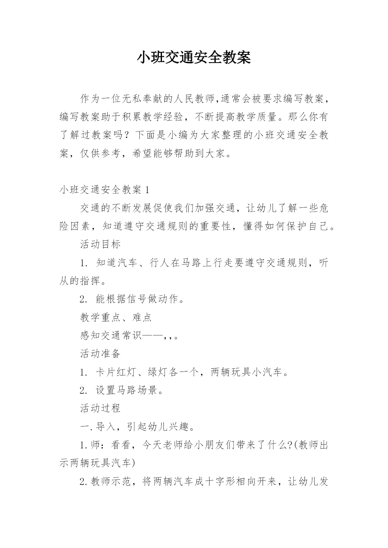 小班交通安全教案作为一位无私奉献的人民教师,通常会被要求编写教案,编写教案助于积累教学经验,不断提高教学质量。那么你有了解过教案吗?下面是小编为大家整理的小班交通安全教案,仅供参考,希望能够帮助到大家。小班交通安全教案1交通的不断发展促使我们加强交通,让幼儿了解一些危险因素,知道遵守交通规则的重要性,懂得如何保护自己。活动目标1.知道汽车、行人在马路上行走要遵守交通规则,听从的指挥。2.能根据信号做动作。教学重点、难点感知交通常识——,,。活动准备1.卡片红灯、绿灯各一个,两辆玩具小汽车。2.设置马路场景。活动过程一.导入,引起幼儿兴趣。1.师:看看,今天老师给小朋友们带来了什么?(教师出示两辆玩具汽车)2.教师示范,将两辆汽车成十字形相向开来,让幼儿发生了什么事。(汽车相撞)3.师:刚刚发生了什么事?(幼儿回答)二.认识。1.为了避免刚刚的交通事故发生,我们请来了这两位朋友来帮忙。(出示卡片)2.师:有谁认识这两位朋友吗?(幼儿回答)3.师:那有哪位小朋友知道的`作用呢?(幼儿回答)4.教师总结:汽车和行人在马路上行走时,要听从的指挥,红灯亮了停一停,绿灯亮了才能行。三.小汽车按规则行驶。1.师:现在我们让汽车安全行驶一次。(教师按照自己给出的信号操作汽车,如:出示红灯,说红灯红灯我就停,出示绿灯,说绿灯绿灯我就行。)2.教师操作汽车,幼儿给出信号。四.游戏。1.师:现在我们也来开汽车,好不好?2.请两个小朋友来当,一部分小朋友当汽车。3.幼儿做游戏,教师在旁指导。五.游戏结束,教师再次总结。教学反思本节活动主要是从幼儿的兴趣引导,先激发幼儿兴趣,从而认识事物,在参与到游戏中领悟。活动中幼儿积极参与,学习氛围浓厚,大部分幼儿都能在玩中认识到遵守交通的重要性。不足的地方就是,有一小部分幼儿只注重于玩的过程,而没能在过程中认识到游戏的真正意义。所以,如果再重新上这节课,我会在游戏中多让幼儿讨论,让他们自己去倾听领悟。活动目标:小班交通安全教案21、让幼儿了解一些基本的交通安全知识,知道,的道理。2、知道时要注意自己的安全,让幼儿知道不走斑马线的.危险性。活动准备:1、图片、斑马线2、儿歌《交通灯》活动过程:1、手指游戏,稳定幼儿情绪。"小朋友们伸出小手,跟叔叔一起玩个手指游戏好不好?"2、谈话,引入主题。"小朋友们知道怎样吗?时应该注意些什么?"(幼儿讨论)3、出示图片,提高幼儿兴趣。"我们小班小朋友太乖了,叔叔让你们看以些图片好不好?想不想看?小朋友们把小眼睛闭上,叔叔把小图片请,3,2,1,好了,睁开小眼睛。""呀?()小朋友们见过吗?小朋友们跟上街的时候有没有见过?"(幼儿讨论)4、引导幼儿认识"小班小朋友真棒,叔叔来告诉小朋友,这个是,小朋友们跟上街时候可以看一看,马路上的十字路口就有了。"5、引导幼儿讨论"我们小班小朋友那么聪明,那么,你们知道要怎样看吗?"(幼儿讨论)6、讲解怎样"小朋友说街上车多不多?危不危险?所以小朋友们一定要知道怎样看是不是。那小朋友们要张开小嘴巴跟叔叔学了好不好。""(出示图片红灯),(出示图片绿灯)。"(反复教幼儿三遍)7、引导幼儿认识斑马线"小朋友们看,这又是什么呀?你们有没有见过"(同上,介绍时一样)"小朋友们张开小嘴巴跟叔叔念,要走斑马线"8、引导幼儿学习儿歌"今天中三班小朋友表现太棒了,叔叔来你们一首儿歌好不好?每个小朋友都要张开小嘴巴跟叔叔读了,叔叔来一下,看哪个小朋友的声音最好听,等一下我们就送给它。"9、带幼儿读儿歌(引导幼儿读第一遍,鼓励幼儿读第二遍,表扬幼儿读得棒,提到幼儿兴趣,读第三遍。)10、延伸"小朋友跟上街时候还要注意些什么呀?"(做公车时先下后上,上街时要拉好的手,不能攀爬街上的护栏等等)11、请小朋友跟图片说再见,活动结束。儿歌交通灯,会说话黄灯说,请注意红灯说,快停下绿灯说,请走吧牢记他们说的话按照红黄绿行动做个文明好娃娃。手指游戏一个手指一个手指,变成大山两个手指两个手指,变成剪刀三个手指三个手指,变成水母四个手指四个手指,变成胡须五个手指五个手指,变成海鸥,飞走了。活动目标:小班交通安全教案3一、活动目标:1、让幼儿在交流活动中认识一些常见的交通标志。2、让幼儿在游戏活动中体验交通规则的重要性,从而自觉地遵守交通规则。3、让幼儿在合作学习中学得一些基本的学习方法。二、活动准备:1、精心布置活动场景。2、收集各种交通标志(照片或图片)。3、字卡:交通安全、红灯停,绿灯行、人行道、非机动车道、汽车道。三、活动过程:(一)展开联想,揭示活动主题1、出示交通事故图片,请幼儿仔细观察。提问:孩子们,刚才你们看到了什么?想到了什么?2、多么可怕的车祸,为了不让这样的事情再发生,我们一定要注意交通安全。(出示字卡“交通安全”)(二)在活动中体会交通规则的重要性1、孩