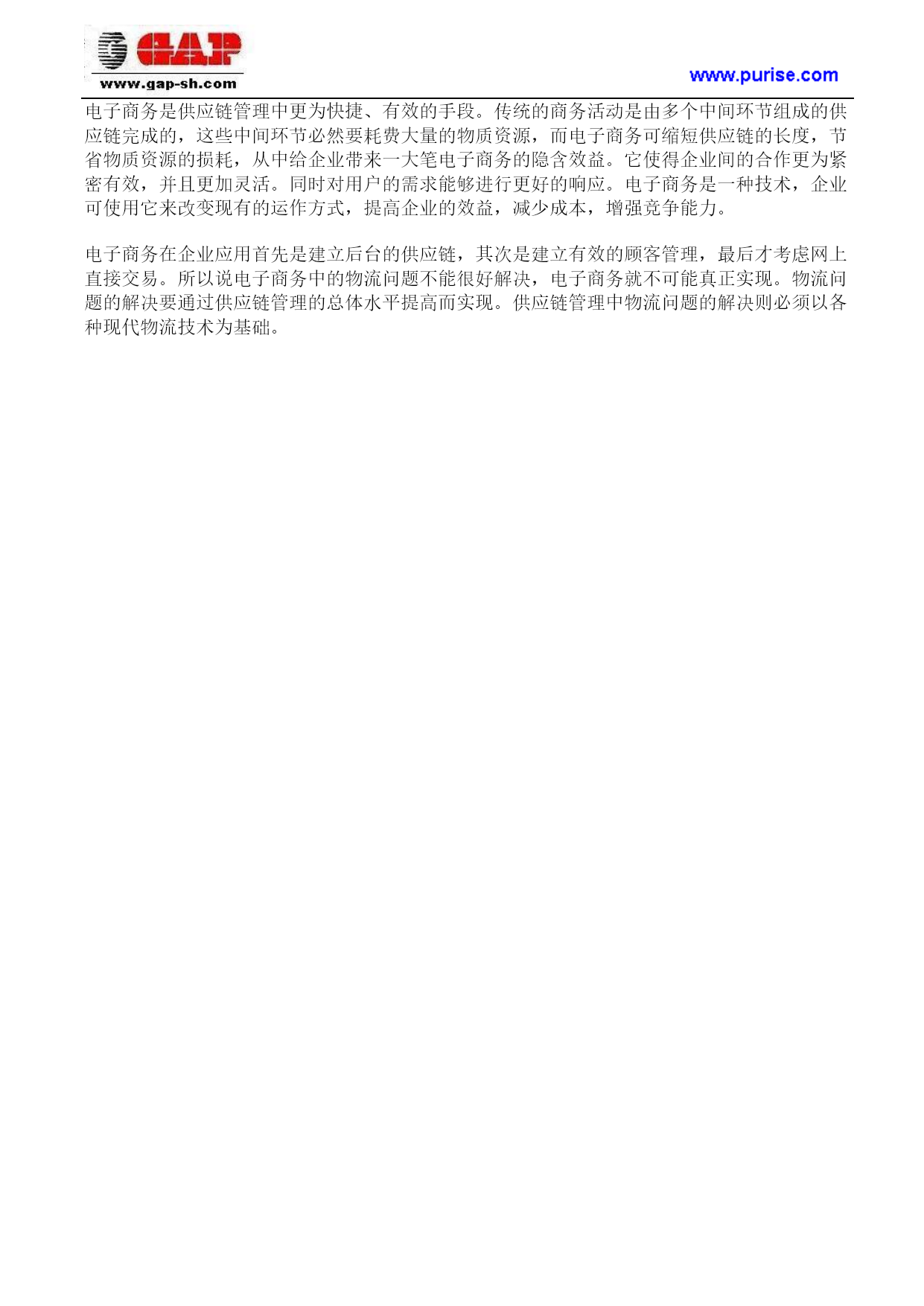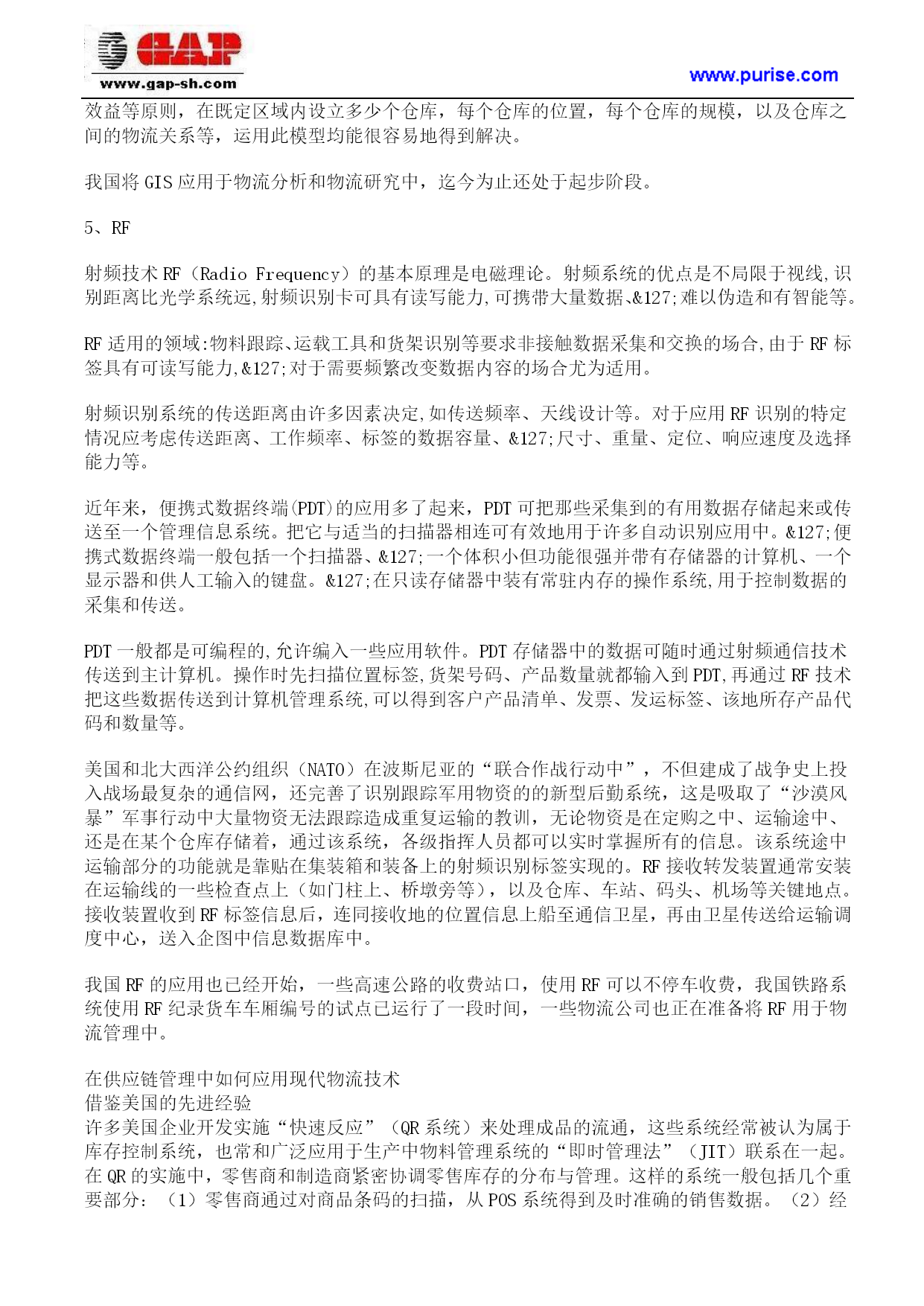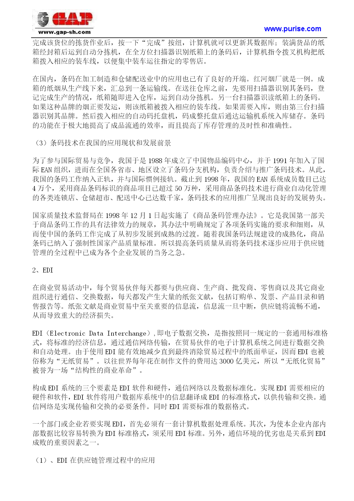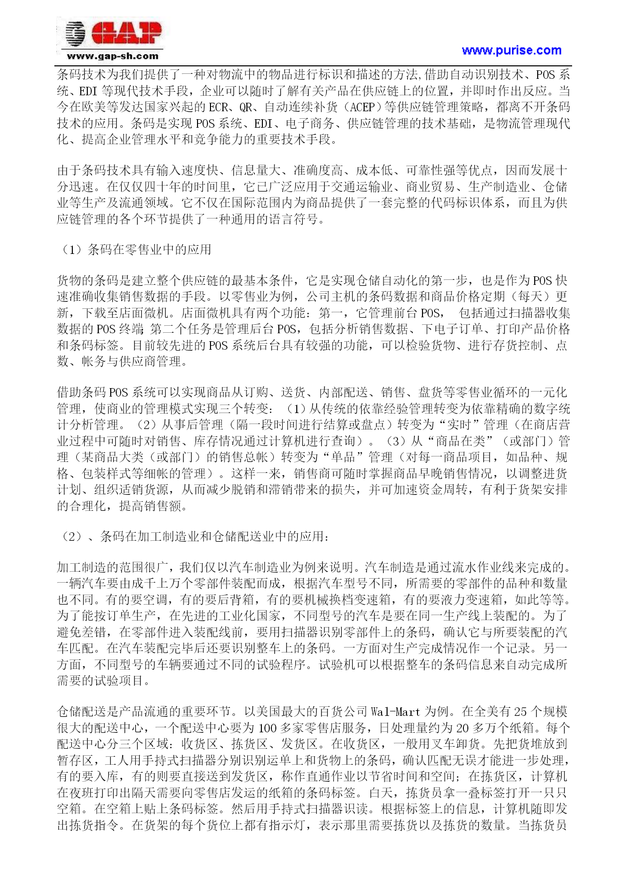 现代物流技术的应用,使供应链管理更加科学所谓供应链,是指产品生产和流通中所涉及的原材料供应商、生产商、批发商、零售商以及最终消费者组成的供需网络。这种供应链是由物料获取并加工成中间件或成品,再将成品送到消费者手中所涉及到的一些企业和部门的供应链所构成的网络。在这个网络中,每个贸易伙伴都具有双重角色:既是供应商,又是客户。他们即向上游伙伴订购产品,又向下游伙伴提供产品,建立一条业务相关紧密、经济利益相连的供应链,才能实现优势互补,增强市场竞争实力。供应链管理是指对供应链中的物流、商流、业务流、价值流、资金流和信息流进行的计划、组织、协调及控制。它是在社会化生产分工越来越细、产品生产日趋全球化的过程中提出的一种管理理念,当前正处于形成和发展探索阶段。供应链管理是一种通过贸易伙伴间的密切合作以最小的成本为客户提供最大的价值和最好的服务的管理,各个贸易伙伴共享信息、共担风险。它的目标是提高整个供应链运行的速度、效益及附加值,为整个供应链上的所有贸易伙伴带来巨大的经济效益。每天在全球范围内发生着数以百万计的商业交易,每一笔商业交易的背后都伴随着物流和信息流。供应链上的贸易伙伴都需要这些信息以便对产品进行发送、跟踪、分拣、接收、存贮、提货以及包装等。在世界信息化高度发展的今天,物流与信息流的相互配合体现得越来越重要。在供应链管理中必然要用到越来越多的现代物流技术。物流技术一般是指与物流要素活动有关的所有专业技术的总称,可以包括各种操作方法、管理技能等,如流通加工技术、物品包装技术、物品标识技术、物品实时跟踪技术等;物流技术还包括物流规划、物流评价、物流设计、物流策略等;当计算机网络技术的应用普及后,物流技术中综合了许多现代技术,如GIS(地理信息系统)、GPS(全球卫星定位)、EDI(电子数据交换)、BARCODE(条码)等等。现代物流技术的应用,使供应链管理更加科学,并由此产生更大的经济效益。二、现代物流技术及其应用1、BARCODE条码技术的特点:是实现各行业自动化管理的有力武器,有得于进货、销售、仓储管理一体化;是实现EDI、节约资源的基础;是及时沟通产、供、销的纽带和桥梁;是提高市场竞争力的工具;可以节省消费者的购物时间,扩大商品销售额。条码技术是在计算机的应用实践中产生和发展起来的一种自动识别技术。它是为实现对信息的自动扫描而设计的。它是实现快速、准确而可靠地采集数据的有效手段。条码技术的应用解决了数据录入和数据采集的“瓶颈”问题,为供应链管理提供了有力的技术支持。条码技术为我们提供了一种对物流中的物品进行标识和描述的方法,借助自动识别技术、POS系统、EDI等现代技术手段,企业可以随时了解有关产品在供应链上的位置,并即时作出反应。当今在欧美等发达国家兴起的ECR、QR、自动连续补货(ACEP)等供应链管理策略,都离不开条码技术的应用。条码是实现POS系统、EDI、电子商务、供应链管理的技术基础,是物流管理现代化、提高企业管理水平和竞争能力的重要技术手段。由于条码技术具有输入速度快、信息量大、准确度高、成本低、可靠性强等优点,因而发展十分迅速。在仅仅四十年的时间里,它已广泛应用于交通运输业、商业贸易、生产制造业、仓储业等生产及流通领域。它不仅在国际范围内为商品提供了一套完整的代码标识体系,而且为供应链管理的各个环节提供了一种通用的语言符号。(1)条码在零售业中的应用货物的条码是建立整个供应链的最基本条件,它是实现仓储自动化的第一步,也是作为POS快速准确收集销售数据的手段。以零售业为例,公司主机的条码数据和商品价格定期(每天)更新,下载至店面微机。店面微机具有两个功能:第一,它管理前台POS,包括通过扫描器收集数据的POS终端;第二个任务是管理后台POS,包括分析销售数据、下电子订单、打印产品价格和条码标签。目前较先进的POS系统后台具有较强的功能,可以检验货物、进行存货控制、点数、帐务与供应商管理。借助条码POS系统可以实现商品从订购、送货、内部配送、销售、盘货等零售业循环的一元化管理,使商业的管理模式实现三个转变:(1)从传统的依靠经验管理转变为依靠精确的数字统计分析管理。(2)从事后管理(隔一段时间进行结算或盘点)转变为“实时”管理(在商店营业过程中可随时对销售、库存情况通过计算机进行查询)。(3)从“商品在类”(或部门)管理(某商品大类(或部门)的销售总帐)转变为“单品”管理(对每一商品项目,如品种、规格、包装样式等细帐的管理)。这样一来,销售商可随时掌握商品早晚销售情况,以调整进货计划、组织适销货源,从而减少脱销和滞销带来的损失,并可加速资金周转,有利于货架安排的合理化,提高销售额。(2)、条码在加工制造业和仓储配送业中的应用:加工制造的范围很广,我们仅以汽车制造业为例来说明。汽车
