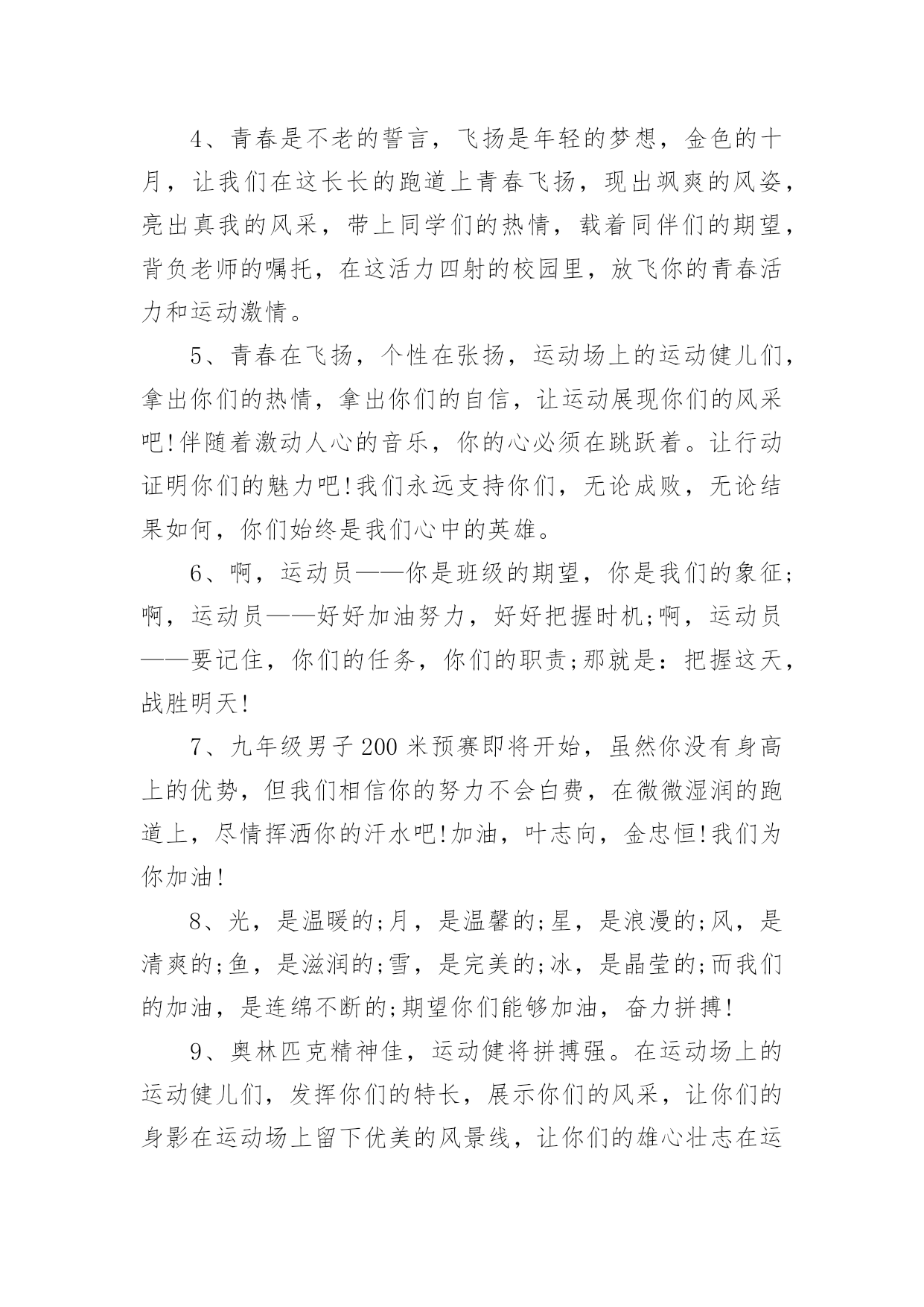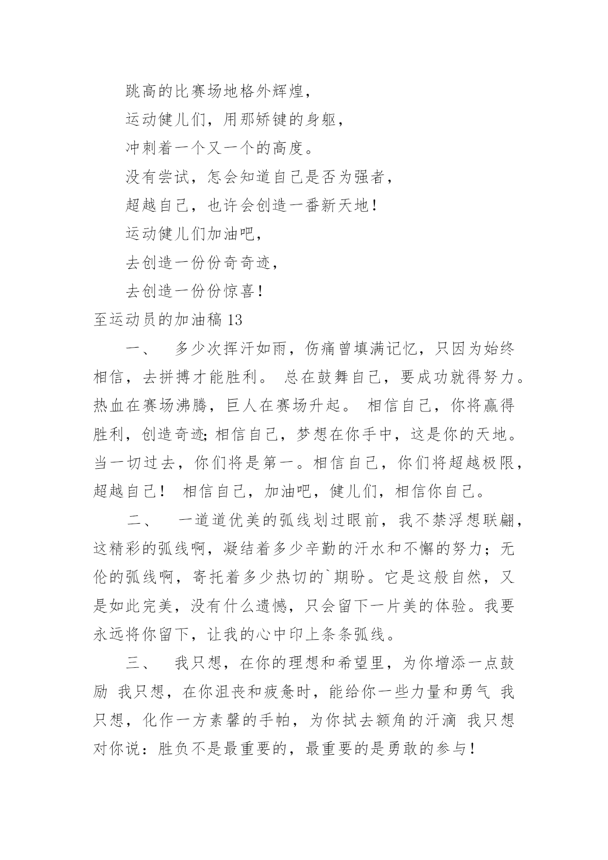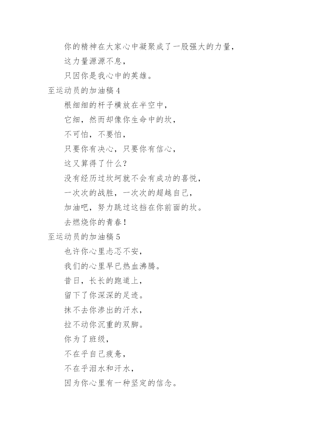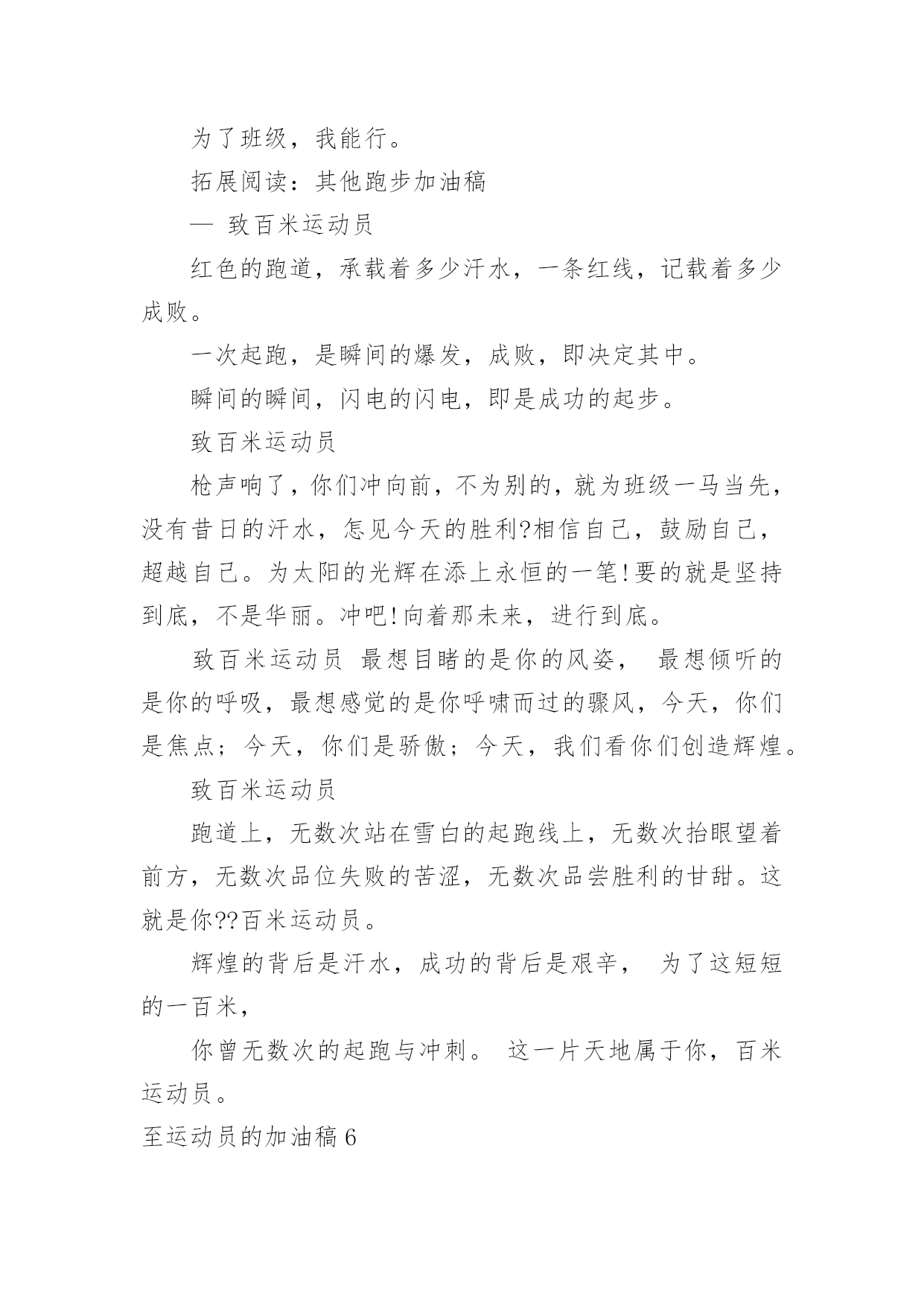 至运动员的加油稿至运动员的加油稿在发展不断提速的社会中,我们用到加油稿的地方越来越多,加油稿可以激励对方更好地参加活动。为了让您在写加油稿时更加简单方便,以下是小编帮大家整理的至运动员的加油稿,希望对大家有所帮助。至运动员的加油稿1有多少次挥汗如雨,伤+痛曾添满记忆,只因为始终相信,去拼搏才能胜利。总在鼓舞自己,要成功就得努力。热血在赛场沸腾,巨人在赛场升起。相信自己,你将赢得胜利,创造奇迹;相信自己,梦想在你手中,这是你的天地。当一切过去,你们将是第一。相信自己,你们将超越极限,超越自己!相信自己,加油吧,健儿们,相信你自己。至运动员的加油稿2如果条件能允许,我们要前去助威鼓励。可是时间,终不能让我们相聚。我们不会抱怨军训的苦累,因为内心明白这是磨砺。我们的心里再不会叛逆,做一个优秀合格的南开人。我们说南开为人称道的魅力,不及第一次踏进校区,时光流逝心中更加坚定。如果两个校区连在一起,走上四年只为拥抱你。吊坠了我们的人生,难忘。我们听见有人唱着古老的校歌,唱着今天还在继续传承的。至运动员的加油稿3你是我心中的英雄有人说,运动场上狂奔的男儿,是一匹匹黑色的骏马。有人说,运动场上活跃的巾帼,是一道道亮丽的风景。我说,你们都是我心中的英雄,你的飒爽英姿,你的顽强拼搏,你的永不屈服,你的自我挑战,都深深地烙在每个人的心中,你的精神在大家心中凝聚成了一股强大的力量,这力量源源不息,只因你是我心中的英雄。至运动员的加油稿4根细细的杆子横放在半空中,它细,然而却像你生命中的坎,不可怕,不要怕,只要你有决心,只要你有信心,这又算得了什么?没有经历过坎坷就不会有成功的喜悦,一次次的战胜,一次次的超越自己,加油吧,努力跳过这挡在你前面的坎。去燃烧你的青春!至运动员的加油稿5也许你心里忐忑不安,我们的心里早已热血沸腾。昔日,长长的跑道上,留下了你深深的足迹。抹不去你渗出的汗水,拉不动你沉重的双脚。你为了班级,不在乎自己疲惫,不在乎泪水和汗水,因为你心里有一种坚定的信念。为了班级,我能行。拓展阅读:其他跑步加油稿—致百米运动员红色的跑道,承载着多少汗水,一条红线,记载着多少成败。一次起跑,是瞬间的爆发,成败,即决定其中。瞬间的瞬间,闪电的闪电,即是成功的起步。致百米运动员枪声响了,你们冲向前,不为别的,就为班级一马当先,没有昔日的汗水,怎见今天的胜利?相信自己,鼓励自己,超越自己。为太阳的光辉在添上永恒的一笔!要的就是坚持到底,不是华丽。冲吧!向着那未来,进行到底。致百米运动员最想目睹的是你的风姿,最想倾听的是你的呼吸,最想感觉的是你呼啸而过的骤风,今天,你们是焦点;今天,你们是骄傲;今天,我们看你们创造辉煌。致百米运动员跑道上,无数次站在雪白的起跑线上,无数次抬眼望着前方,无数次品位失败的苦涩,无数次品尝胜利的甘甜。这就是你??百米运动员。辉煌的背后是汗水,成功的背后是艰辛,为了这短短的一百米,你曾无数次的起跑与冲刺。这一片天地属于你,百米运动员。至运动员的加油稿6这是一根普同的木棒红白的对比刻画出它们的公正与刚毅。它握在你们--我们的接力运动员的手中。冰冷变为热情,刚毅溶进柔和。今天我们握它在赛场上飞奔,明天我们将与它共同踏上接力征程。至运动员的加油稿71、在同一片晴空下,我们相聚一齐,或欢乐、或失落、或兴奋、或悲伤,尽数写在我们的脸旁。我们曾一齐悲伤,在那个败北的沙坑上;我们也一齐击掌,在这红色的跑道上。在同一片晴空下,我们拼搏,为美丽的目标;我们奋斗,为班级的辉煌。这就是团结、奋进、礼貌的03企管班。2、ibelieve,成功是一幅诱人的蓝图,滴滴汗珠,才能把它绘出;ibelieve,失败是一剂苦口良药,经历风雨,才能见到彩虹;ibelieve,命运不能将我们摆布,年轻的心永不服输,我们笑着应对挑战,笑着比赛,互相祝福!3、运动员们,你们就像一只飞鸟一样,为自己的目标而不放下任何一点期望。在这么闷热的时候,在这么激动的时刻,我们为你们而欢呼,你们是最棒的,要相信自己,不管结果如何,只要你们努力拼搏,努力为自己的目标而奋斗,我们相信,胜利的结果永远属于你们,努力地向前冲吧!4、青春是不老的誓言,飞扬是年轻的梦想,金色的十月,让我们在这长长的跑道上青春飞扬,现出飒爽的风姿,亮出真我的风采,带上同学们的热情,载着同伴们的期望,背负老师的嘱托,在这活力四射的校园里,放飞你的青春活力和运动激情。5、青春在飞扬,个性在张扬,运动场上的运动健儿们,拿出你们的热情,拿出你们的自信,让运动展现你们的风采吧!伴随着激动人心的音乐,你的心必须在跳跃着。让行动证明你们的魅力吧!我们永远支持你们,无论成败,无论结果如何,你们始终是我们心中的英雄。6、啊,运动员——你是班级的期望,你是我们的象征;啊,运动员——好好加油努力,好好把握时机;啊,运动员——要记住,你们