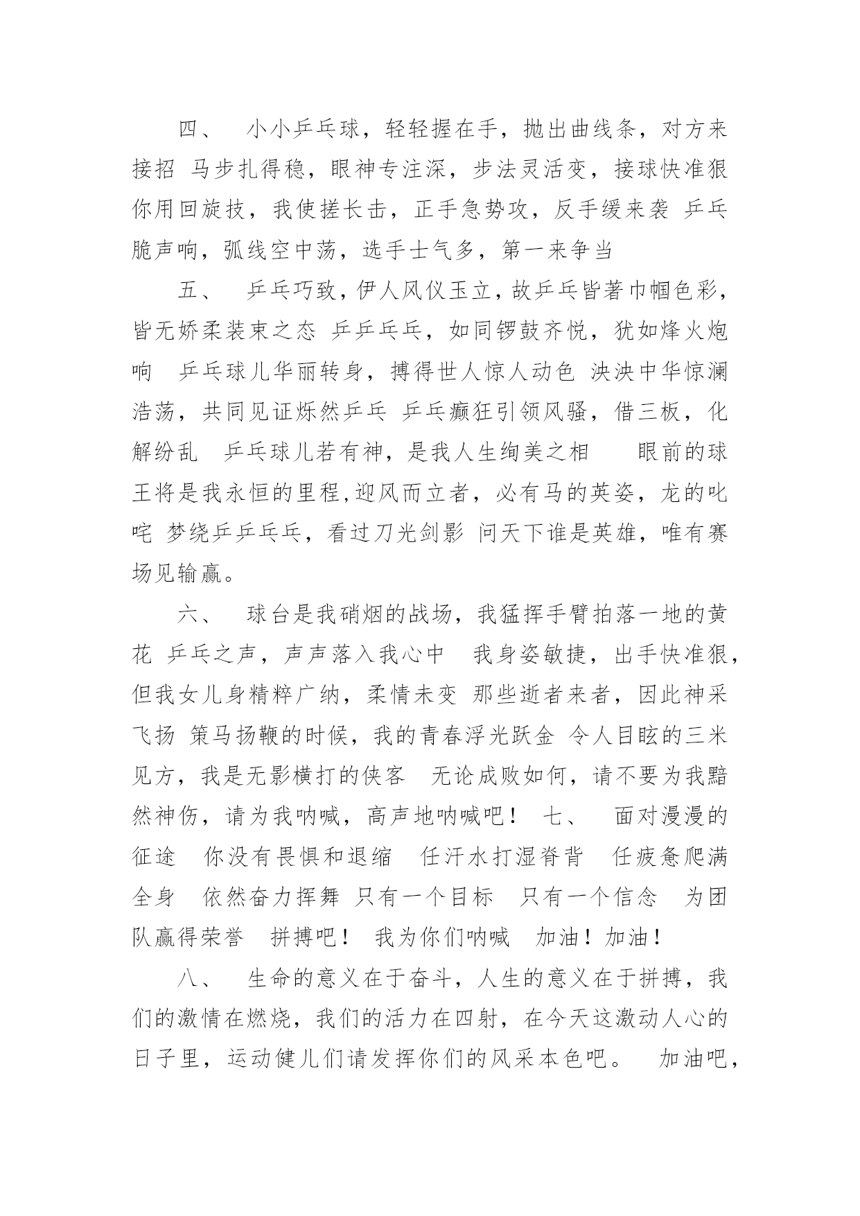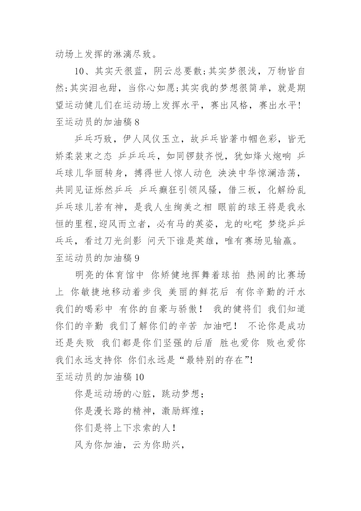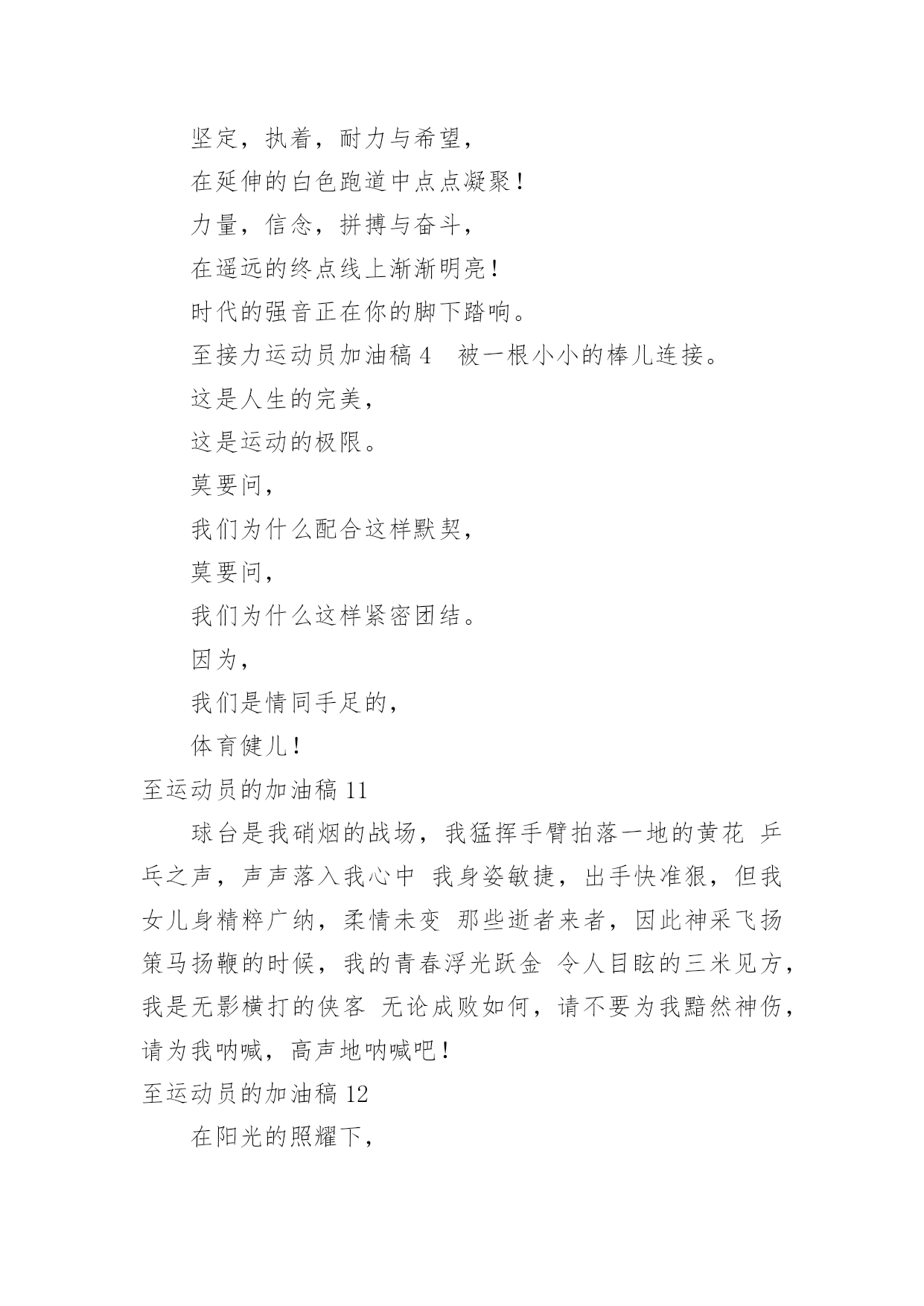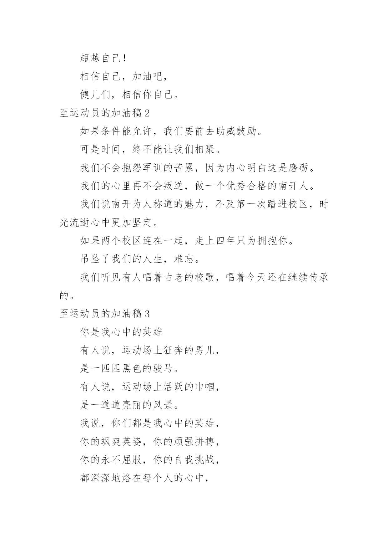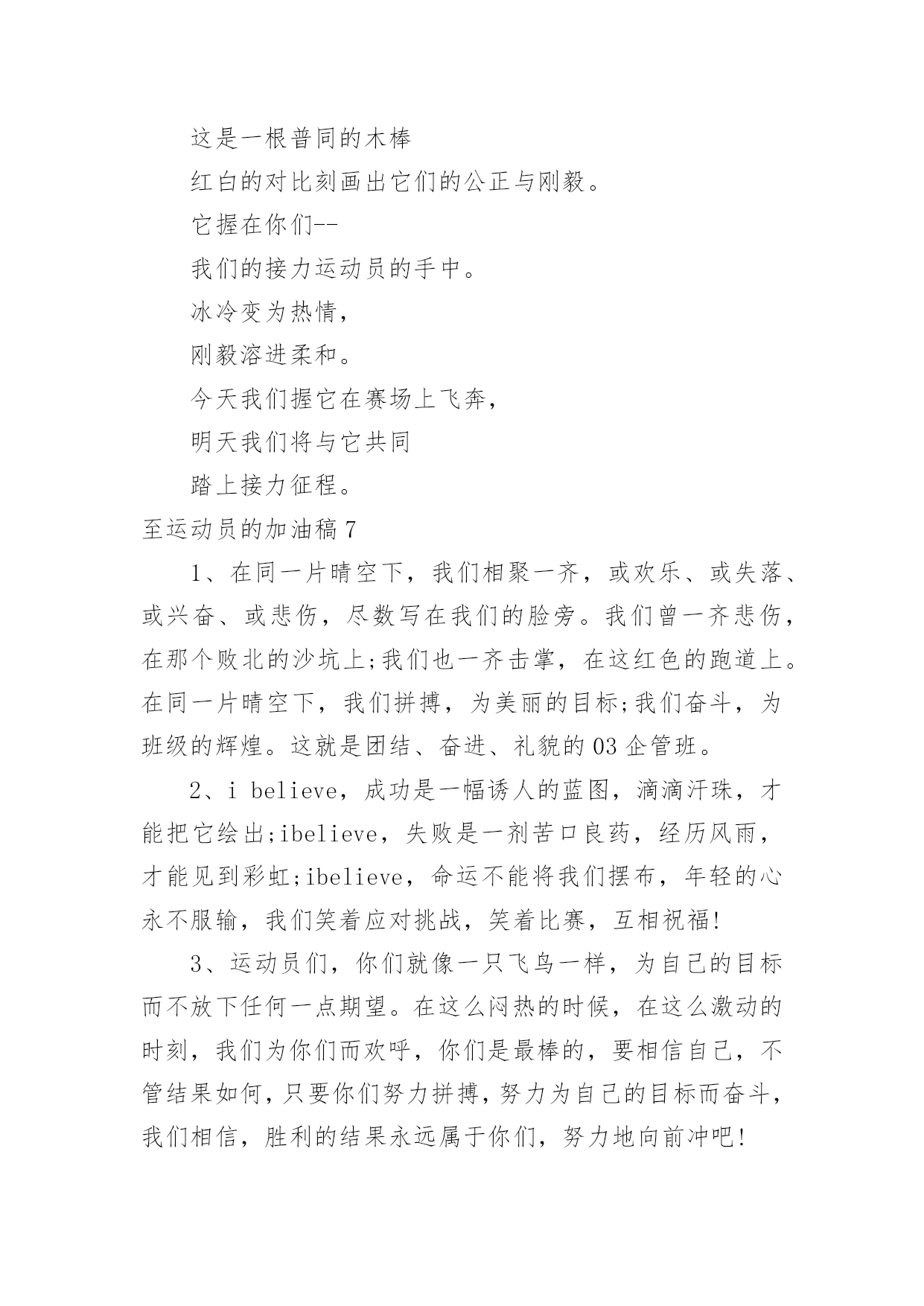 至运动员的加油稿至运动员的加油稿在发展不断提速的社会中,我们用到加油稿的地方越来越多,加油稿可以激励对方更好地参加活动。为了让您在写加油稿时更加简单方便,以下是小编帮大家整理的至运动员的加油稿,希望对大家有所帮助。至运动员的加油稿1有多少次挥汗如雨,伤+痛曾添满记忆,只因为始终相信,去拼搏才能胜利。总在鼓舞自己,要成功就得努力。热血在赛场沸腾,巨人在赛场升起。相信自己,你将赢得胜利,创造奇迹;相信自己,梦想在你手中,这是你的天地。当一切过去,你们将是第一。相信自己,你们将超越极限,超越自己!相信自己,加油吧,健儿们,相信你自己。至运动员的加油稿2如果条件能允许,我们要前去助威鼓励。可是时间,终不能让我们相聚。我们不会抱怨军训的苦累,因为内心明白这是磨砺。我们的心里再不会叛逆,做一个优秀合格的南开人。我们说南开为人称道的魅力,不及第一次踏进校区,时光流逝心中更加坚定。如果两个校区连在一起,走上四年只为拥抱你。吊坠了我们的人生,难忘。我们听见有人唱着古老的校歌,唱着今天还在继续传承的。至运动员的加油稿3你是我心中的英雄有人说,运动场上狂奔的男儿,是一匹匹黑色的骏马。有人说,运动场上活跃的巾帼,是一道道亮丽的风景。我说,你们都是我心中的英雄,你的飒爽英姿,你的顽强拼搏,你的永不屈服,你的自我挑战,都深深地烙在每个人的心中,你的精神在大家心中凝聚成了一股强大的力量,这力量源源不息,只因你是我心中的英雄。至运动员的加油稿4根细细的杆子横放在半空中,它细,然而却像你生命中的坎,不可怕,不要怕,只要你有决心,只要你有信心,这又算得了什么?没有经历过坎坷就不会有成功的喜悦,一次次的战胜,一次次的超越自己,加油吧,努力跳过这挡在你前面的坎。去燃烧你的青春!至运动员的加油稿5也许你心里忐忑不安,我们的心里早已热血沸腾。昔日,长长的跑道上,留下了你深深的足迹。抹不去你渗出的汗水,拉不动你沉重的双脚。你为了班级,不在乎自己疲惫,不在乎泪水和汗水,因为你心里有一种坚定的信念。为了班级,我能行。拓展阅读:其他跑步加油稿—致百米运动员红色的跑道,承载着多少汗水,一条红线,记载着多少成败。一次起跑,是瞬间的爆发,成败,即决定其中。瞬间的瞬间,闪电的闪电,即是成功的起步。致百米运动员枪声响了,你们冲向前,不为别的,就为班级一马当先,没有昔日的汗水,怎见今天的胜利?相信自己,鼓励自己,超越自己。为太阳的光辉在添上永恒的一笔!要的就是坚持到底,不是华丽。冲吧!向着那未来,进行到底。致百米运动员最想目睹的是你的风姿,最想倾听的是你的呼吸,最想感觉的是你呼啸而过的骤风,今天,你们是焦点;今天,你们是骄傲;今天,我们看你们创造辉煌。致百米运动员跑道上,无数次站在雪白的起跑线上,无数次抬眼望着前方,无数次品位失败的苦涩,无数次品尝胜利的甘甜。这就是你??百米运动员。辉煌的背后是汗水,成功的背后是艰辛,为了这短短的一百米,你曾无数次的起跑与冲刺。这一片天地属于你,百米运动员。至运动员的加油稿6这是一根普同的木棒红白的对比刻画出它们的公正与刚毅。它握在你们--我们的接力运动员的手中。冰冷变为热情,刚毅溶进柔和。今天我们握它在赛场上飞奔,明天我们将与它共同踏上接力征程。至运动员的加油稿71、在同一片晴空下,我们相聚一齐,或欢乐、或失落、或兴奋、或悲伤,尽数写在我们的脸旁。我们曾一齐悲伤,在那个败北的沙坑上;我们也一齐击掌,在这红色的跑道上。在同一片晴空下,我们拼搏,为美丽的目标;我们奋斗,为班级的辉煌。这就是团结、奋进、礼貌的03企管班。2、ibelieve,成功是一幅诱人的蓝图,滴滴汗珠,才能把它绘出;ibelieve,失败是一剂苦口良药,经历风雨,才能见到彩虹;ibelieve,命运不能将我们摆布,年轻的心永不服输,我们笑着应对挑战,笑着比赛,互相祝福!3、运动员们,你们就像一只飞鸟一样,为自己的目标而不放下任何一点期望。在这么闷热的时候,在这么激动的时刻,我们为你们而欢呼,你们是最棒的,要相信自己,不管结果如何,只要你们努力拼搏,努力为自己的目标而奋斗,我们相信,胜利的结果永远属于你们,努力地向前冲吧!4、青春是不老的誓言,飞扬是年轻的梦想,金色的十月,让我们在这长长的跑道上青春飞扬,现出飒爽的风姿,亮出真我的风采,带上同学们的热情,载着同伴们的期望,背负老师的嘱托,在这活力四射的校园里,放飞你的青春活力和运动激情。5、青春在飞扬,个性在张扬,运动场上的运动健儿们,拿出你们的热情,拿出你们的自信,让运动展现你们的风采吧!伴随着激动人心的音乐,你的心必须在跳跃着。让行动证明你们的魅力吧!我们永远支持你们,无论成败,无论结果如何,你们始终是我们心中的英雄。6、啊,运动员——你是班级的期望,你是我们的象征;啊,运动员——好好加油努力,好好把握时机;啊,运动员——要记住,你们