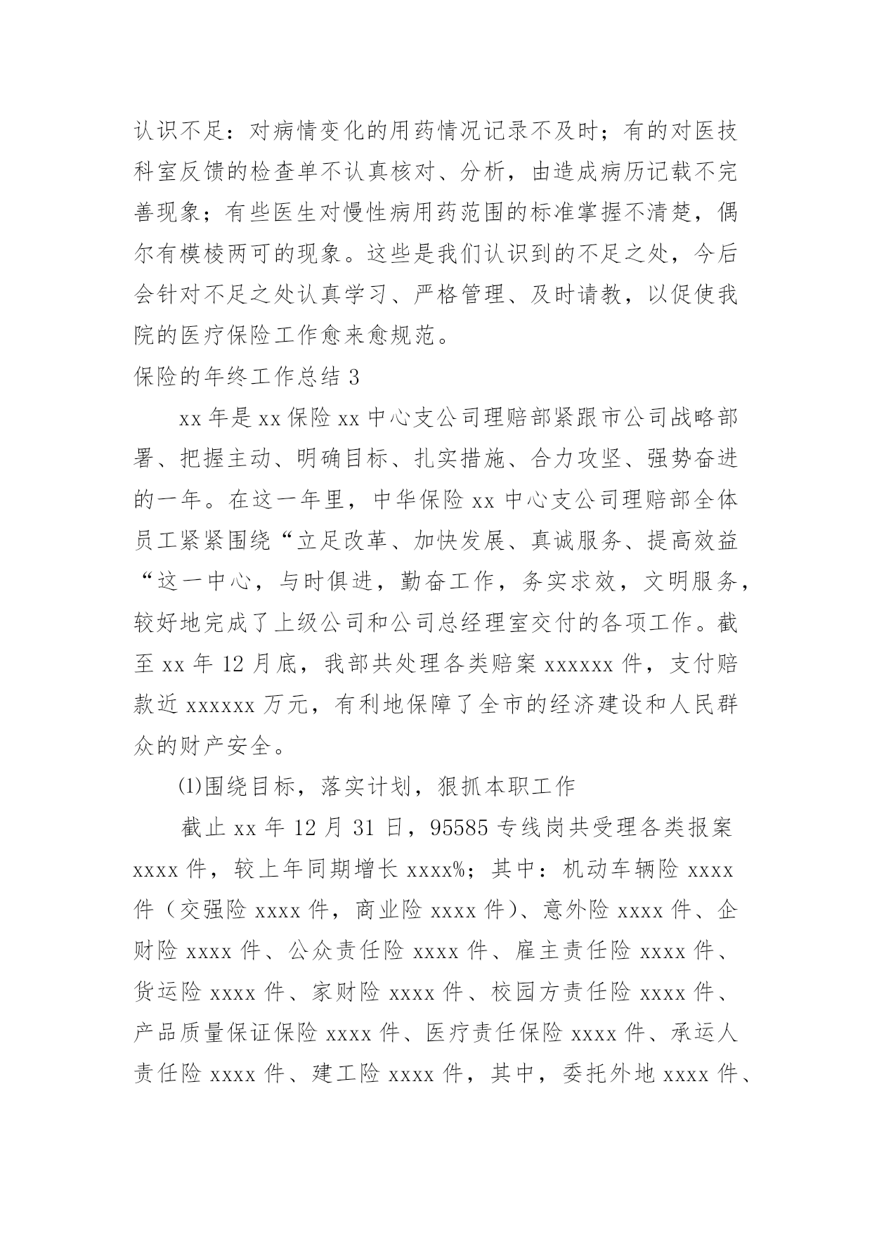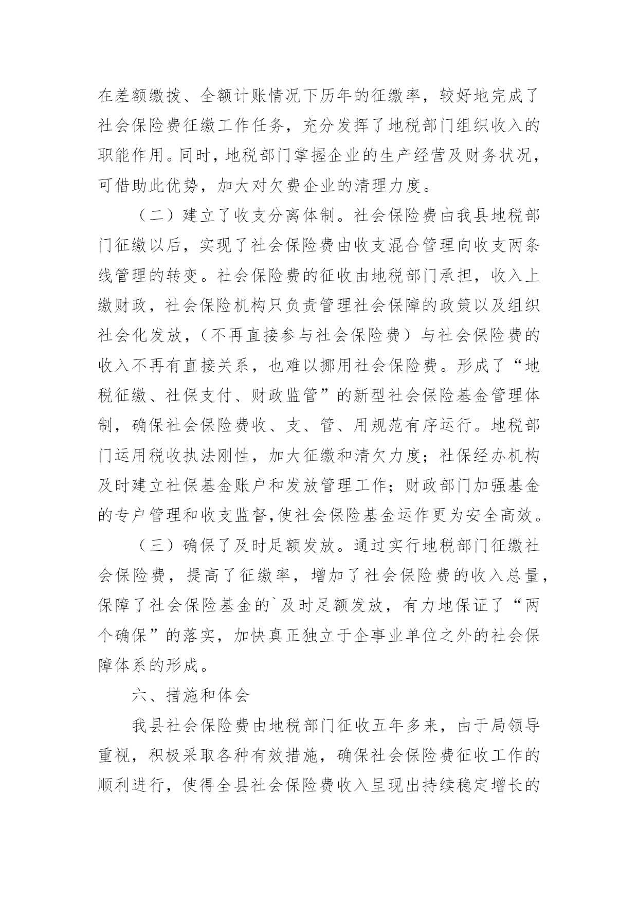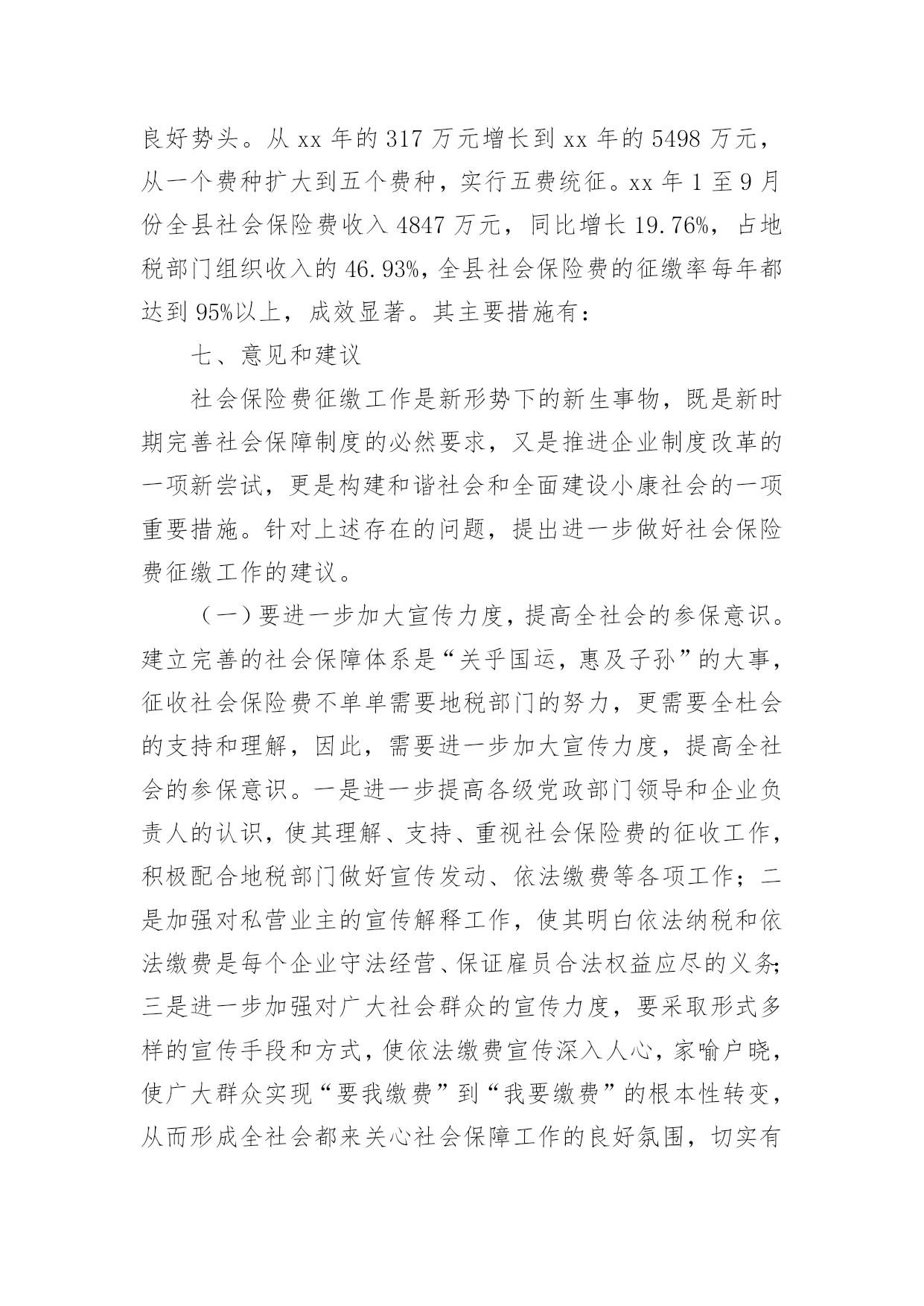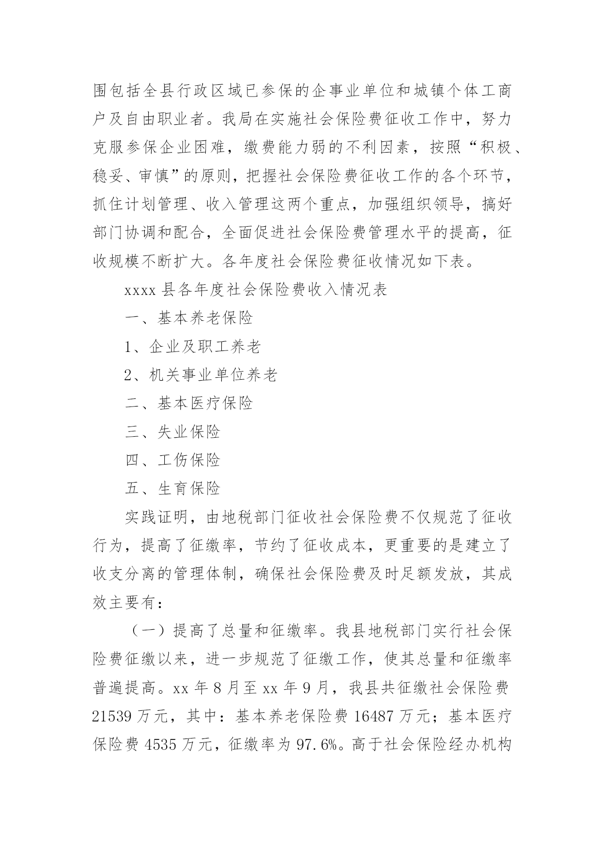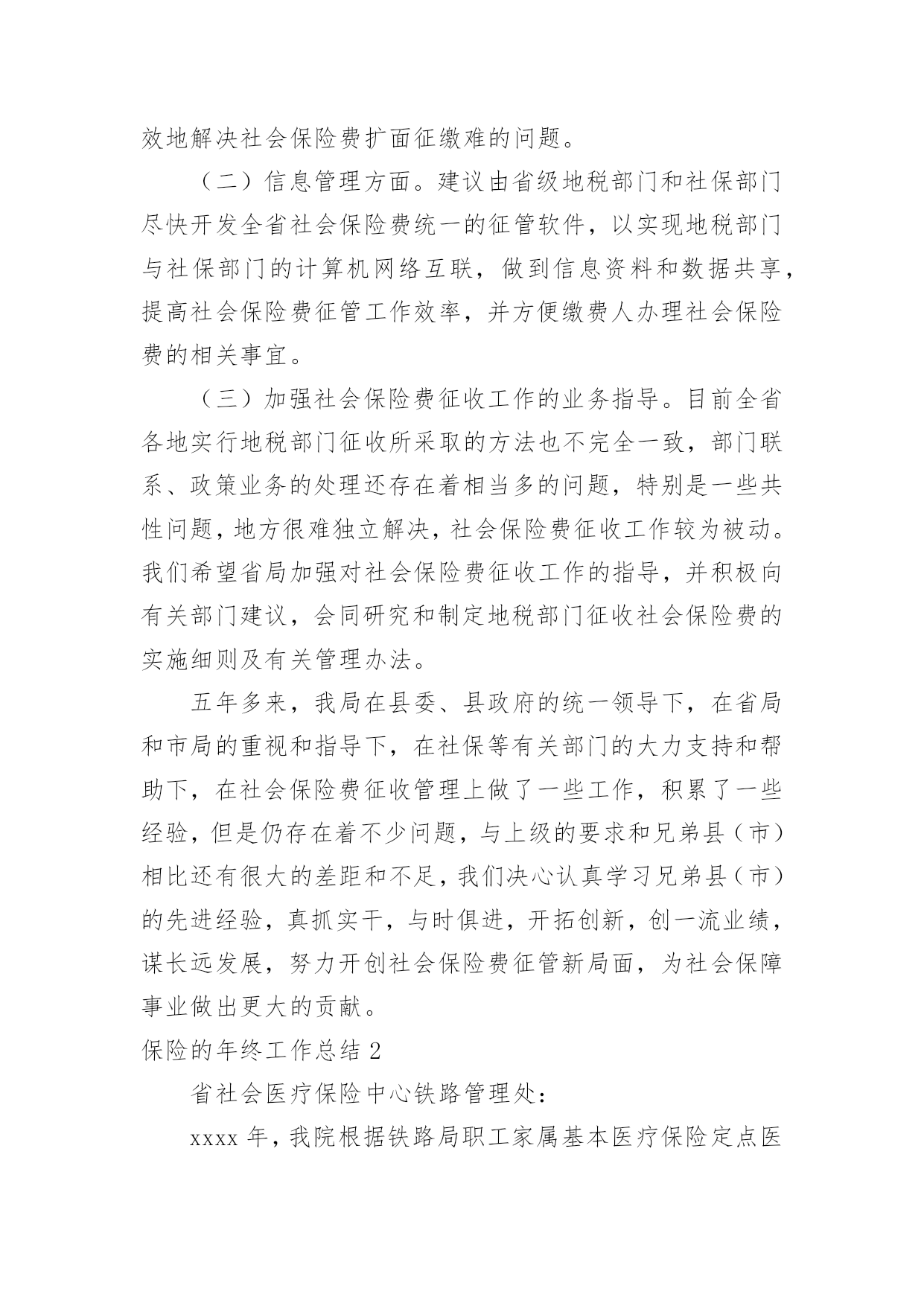 保险的年终工作总结保险的年终工作总结总结是在某一时期、某一项目或某些工作告一段落或者全部完成后进行回顾检查、分析评价,从而得出教训和一些规律性认识的一种书面材料,通过它可以正确认识以往学习和工作中的优缺点,因此好好准备一份总结吧。总结怎么写才不会千篇一律呢?下面是小编帮大家整理的保险的年终工作总结,希望对大家有所帮助。保险的年终工作总结1近年来,我局社保费征收管理工作在县委、县政府和上级主管部门的领导下,认真贯彻落实省委、省政府有关社会保险费征缴的重要文件精神,坚持以组织收入为中心,坚持税费并重,积极配合劳动保障、财政部门,全面加强和规范社会保险费征缴工作,大力组织社会保险费收入,较好地完成了上级赋予的任务。5年来,共组织社会保险费收入21539万元,其中,基本养老保险费16487万元,基本医疗保险费4535万元,失业保险费347万元,工伤保险费156万元,生育保险费14万元。社会保险费的征管工作取得了可喜成效,现将我局社会保险费征管工作情况总结如下:我局自xx年8月接手征收社会保险费,征收费种由基本养老保险费扩大到基本医疗保险费、失业保险费、工伤保险费、生育保险费,实行“五费统征”的征收模式。征收范围包括全县行政区域已参保的企事业单位和城镇个体工商户及自由职业者。我局在实施社会保险费征收工作中,努力克服参保企业困难,缴费能力弱的不利因素,按照“积极、稳妥、审慎”的原则,把握社会保险费征收工作的各个环节,抓住计划管理、收入管理这两个重点,加强组织领导,搞好部门协调和配合,全面促进社会保险费管理水平的提高,征收规模不断扩大。各年度社会保险费征收情况如下表。xxxx县各年度社会保险费收入情况表一、基本养老保险1、企业及职工养老2、机关事业单位养老二、基本医疗保险三、失业保险四、工伤保险五、生育保险实践证明,由地税部门征收社会保险费不仅规范了征收行为,提高了征缴率,节约了征收成本,更重要的是建立了收支分离的管理体制,确保社会保险费及时足额发放,其成效主要有:(一)提高了总量和征缴率。我县地税部门实行社会保险费征缴以来,进一步规范了征缴工作,使其总量和征缴率普遍提高。xx年8月至xx年9月,我县共征缴社会保险费21539万元,其中:基本养老保险费16487万元;基本医疗保险费4535万元,征缴率为97.6%。高于社会保险经办机构在差额缴拨、全额计账情况下历年的征缴率,较好地完成了社会保险费征缴工作任务,充分发挥了地税部门组织收入的职能作用。同时,地税部门掌握企业的生产经营及财务状况,可借助此优势,加大对欠费企业的清理力度。(二)建立了收支分离体制。社会保险费由我县地税部门征缴以后,实现了社会保险费由收支混合管理向收支两条线管理的转变。社会保险费的征收由地税部门承担,收入上缴财政,社会保险机构只负责管理社会保障的政策以及组织社会化发放,(不再直接参与社会保险费)与社会保险费的收入不再有直接关系,也难以挪用社会保险费。形成了“地税征缴、社保支付、财政监管”的新型社会保险基金管理体制,确保社会保险费收、支、管、用规范有序运行。地税部门运用税收执法刚性,加大征缴和清欠力度;社保经办机构及时建立社保基金账户和发放管理工作;财政部门加强基金的专户管理和收支监督,使社会保险基金运作更为安全高效。(三)确保了及时足额发放。通过实行地税部门征缴社会保险费,提高了征缴率,增加了社会保险费的收入总量,保障了社会保险基金的`及时足额发放,有力地保证了“两个确保”的落实,加快真正独立于企事业单位之外的社会保障体系的形成。六、措施和体会我县社会保险费由地税部门征收五年多来,由于局领导重视,积极采取各种有效措施,确保社会保险费征收工作的顺利进行,使得全县社会保险费收入呈现出持续稳定增长的良好势头。从xx年的317万元增长到xx年的5498万元,从一个费种扩大到五个费种,实行五费统征。xx年1至9月份全县社会保险费收入4847万元,同比增长19.76%,占地税部门组织收入的46.93%,全县社会保险费的征缴率每年都达到95%以上,成效显著。其主要措施有:七、意见和建议社会保险费征缴工作是新形势下的新生事物,既是新时期完善社会保障制度的必然要求,又是推进企业制度改革的一项新尝试,更是构建和谐社会和全面建设小康社会的一项重要措施。针对上述存在的问题,提出进一步做好社会保险费征缴工作的建议。(一)要进一步加大宣传力度,提高全社会的参保意识。建立完善的社会保障体系是“关乎国运,惠及子孙”的大事,征收社会保险费不单单需要地税部门的努力,更需要全杜会的支持和理解,因此,需要进一步加大宣传力度,提高全社会的参保意识。一是进一步提高各级党政部门领导和企业负责人的认识,使其理解、支持、重视社会保险费的征收工作,积极配合地税部门做好宣传发动、依法缴费等各项工作;二是加强对私营业主的