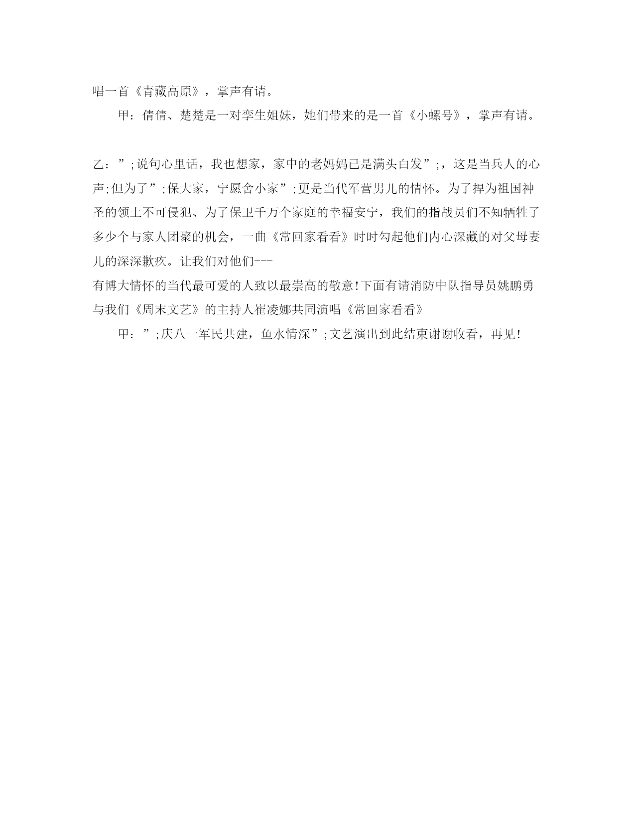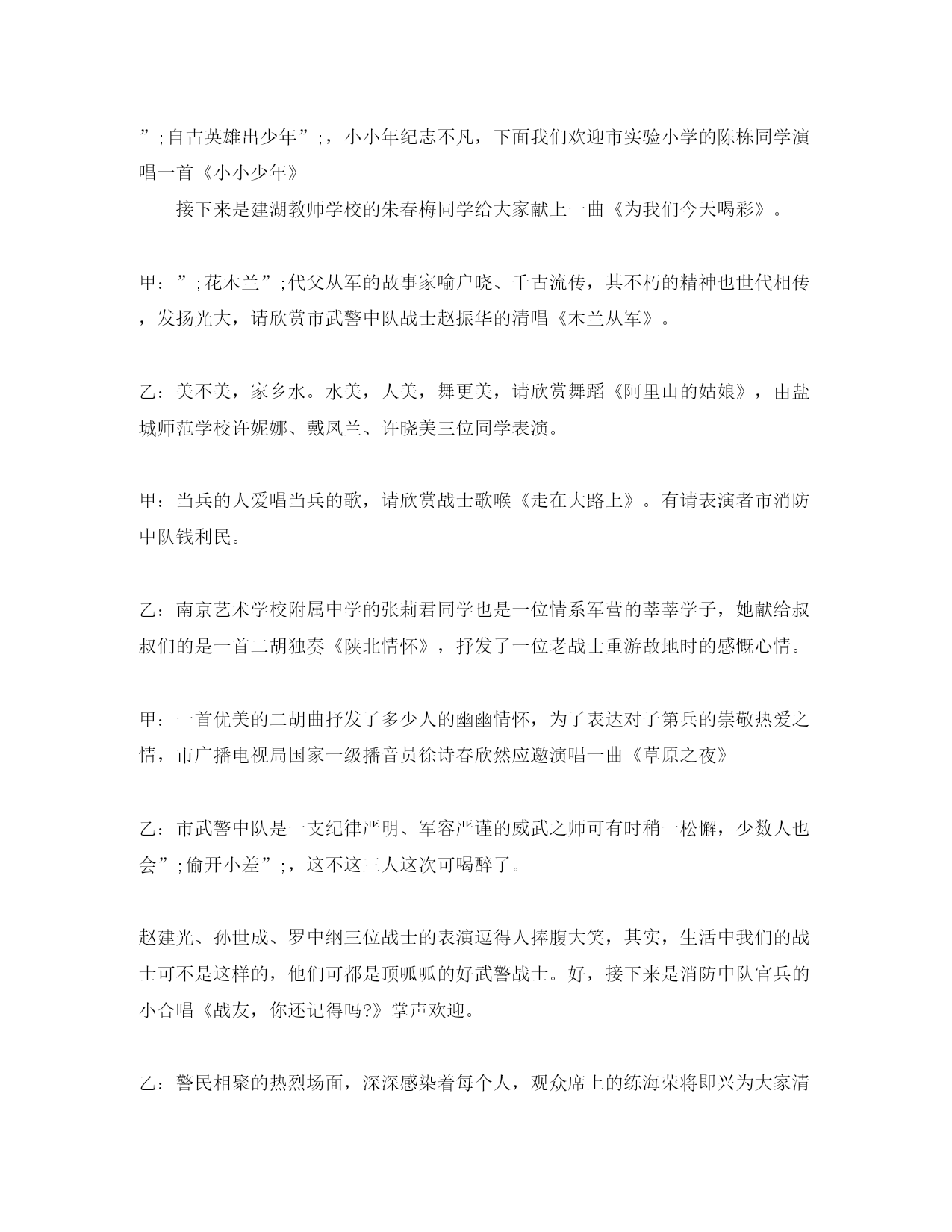 此资料由网络收集而来,如有侵权请告知上传者立即删除。资料共分享,我们负责传递知识。庆八一建军节共建晚会主持稿范本甲:尊敬的驻部队官兵们!乙:亲爱的子弟兵朋友们!合:你们好!甲:在又一个建军节即将到来之际,乙:在迎来共和国五十华诞的喜庆日子里,甲:我们代表东台百万人民向辛勤驻守、无私奉献的广大官兵们表示亲切的慰问并致以崇高的敬意!乙:感谢你们为保持社会稳定、护卫一方安宁作出的巨大奉献,让我们真诚地道一声:”;你们,辛苦了!”;甲:军爱民、民拥军,军民情意似海深。东台是革命老区,陈毅、粟裕等老一辈革命家曾经在这里留下了光辉的战斗足迹,军民之间保持着天然的鱼水深情。在新的历史时期,军民们又同心携手谱写出了拥军优属、拥政爱民的鱼水新篇。乙:下面就让我们用歌声、舞蹈来赞一曲军民情深,说一段鱼水佳话!甲:刘丹小朋友是新东小学的学生,小小年纪的他就立志当一名威风凛凛的小号手,他给我们送上的是一曲《小号手》,掌声有请。刘丹小朋友用歌声表达了他对解放军叔叔的崇敬和热爱。来自盐城鲁迅艺术学校的小号手袁斯维同学对兵叔叔也是情有独爱,暑假里的他特意来演奏献艺。让我们掌声欢迎。乙:看到这位可爱的”;小不点”;走上台来,不少观众朋友一定以为谁家的孩子走错了。咦,可别小瞧他,他可是我们特地邀请来的小演员呢。问:小朋友,你叫什么名字?答:缪丹彤。问:今年几岁了?答:岁半。问:你从哪里来?答:新街镇。问:今天到这里来干什么啊?答:慰问解放军。问:你给解放军叔叔表演什么节目呢?答:《数鸭子》。乙:下面请听独唱《让我们荡起双桨》,由荣获市实验小学”;十佳少年”;、”;十佳小歌手”;、”;十佳小舞蹈家”;称号的尤希同学演唱,大家欢迎。乙:兵哥哥在远方戍安边防,痴妹妹在家乡情寄兵郎。一曲情思绵绵的《兵哥哥》包含了多少个不眠的夜晚。请欣赏市广播电视局特约节目主持人许晓燕表演的独舞《兵哥哥》。甲:看看叔叔阿姨、哥哥姐姐们又唱又跳,市幼儿园的夏世豪小朋友也耐不住寂寞了,他献给叔叔们的是一首儿歌《一分钱》。居佳同学是东台镇中心小学的学生,她曾经入选过全国第五届推新人大赛”;十佳选手”;。这位文艺新人给大家表演的是她的拿手曲目《葡萄熟了》。乙:市消防中队是一支拉得出、打得响的精锐之师,个个身手不凡,下面他们要为我们表演一套擒敌拳套路,掌声欢迎。”;自古英雄出少年”;,小小年纪志不凡,下面我们欢迎市实验小学的陈栋同学演唱一首《小小少年》接下来是建湖教师学校的朱春梅同学给大家献上一曲《为我们今天喝彩》。甲:”;花木兰”;代父从军的故事家喻户晓、千古流传,其不朽的精神也世代相传,发扬光大,请欣赏市武警中队战士赵振华的清唱《木兰从军》。乙:美不美,家乡水。水美,人美,舞更美,请欣赏舞蹈《阿里山的姑娘》,由盐城师范学校许妮娜、戴凤兰、许晓美三位同学表演。甲:当兵的人爱唱当兵的歌,请欣赏战士歌喉《走在大路上》。有请表演者市消防中队钱利民。乙:南京艺术学校附属中学的张莉君同学也是一位情系军营的莘莘学子,她献给叔叔们的是一首二胡独奏《陕北情怀》,抒发了一位老战士重游故地时的感慨心情。甲:一首优美的二胡曲抒发了多少人的幽幽情怀,为了表达对子第兵的崇敬热爱之情,市广播电视局国家一级播音员徐诗春欣然应邀演唱一曲《草原之夜》乙:市武警中队是一支纪律严明、军容严谨的威武之师可有时稍一松懈,少数人也会”;偷开小差”;,这不这三人这次可喝醉了。赵建光、孙世成、罗中纲三位战士的表演逗得人捧腹大笑,其实,生活中我们的战士可不是这样的,他们可都是顶呱呱的好武警战士。好,接下来是消防中队官兵的小合唱《战友,你还记得吗?》掌声欢迎。乙:警民相聚的热烈场面,深深感染着每个人,观众席上的练海荣将即兴为大家清唱一首《青藏高原》,掌声有请。甲:倩倩、楚楚是一对孪生姐妹,她们带来的是一首《小螺号》,掌声有请。乙:”;说句心里话,我也想家,家中的老妈妈已是满头白发”;,这是当兵人的心声;但为了”;保大家,宁愿舍小家”;更是当代军营男儿的情怀。为了捍为祖国神圣的领土不可侵犯、为了保卫千万个家庭的幸福安宁,我们的指战员们不知牺牲了多少个与家人团聚的机会,一曲《常回家看看》时时勾起他们内心深藏的对父母妻儿的深深歉疚。让我们对他们---有博大情怀的当代最可爱的人致以最崇高的敬意!下面有请消防中队指导员姚鹏勇与我们《周末文艺》的主持人崔凌娜共同演唱《常回家看看》甲:”;庆八一军民共建,鱼水情深”;文艺演出到此结束谢谢收看,再见!