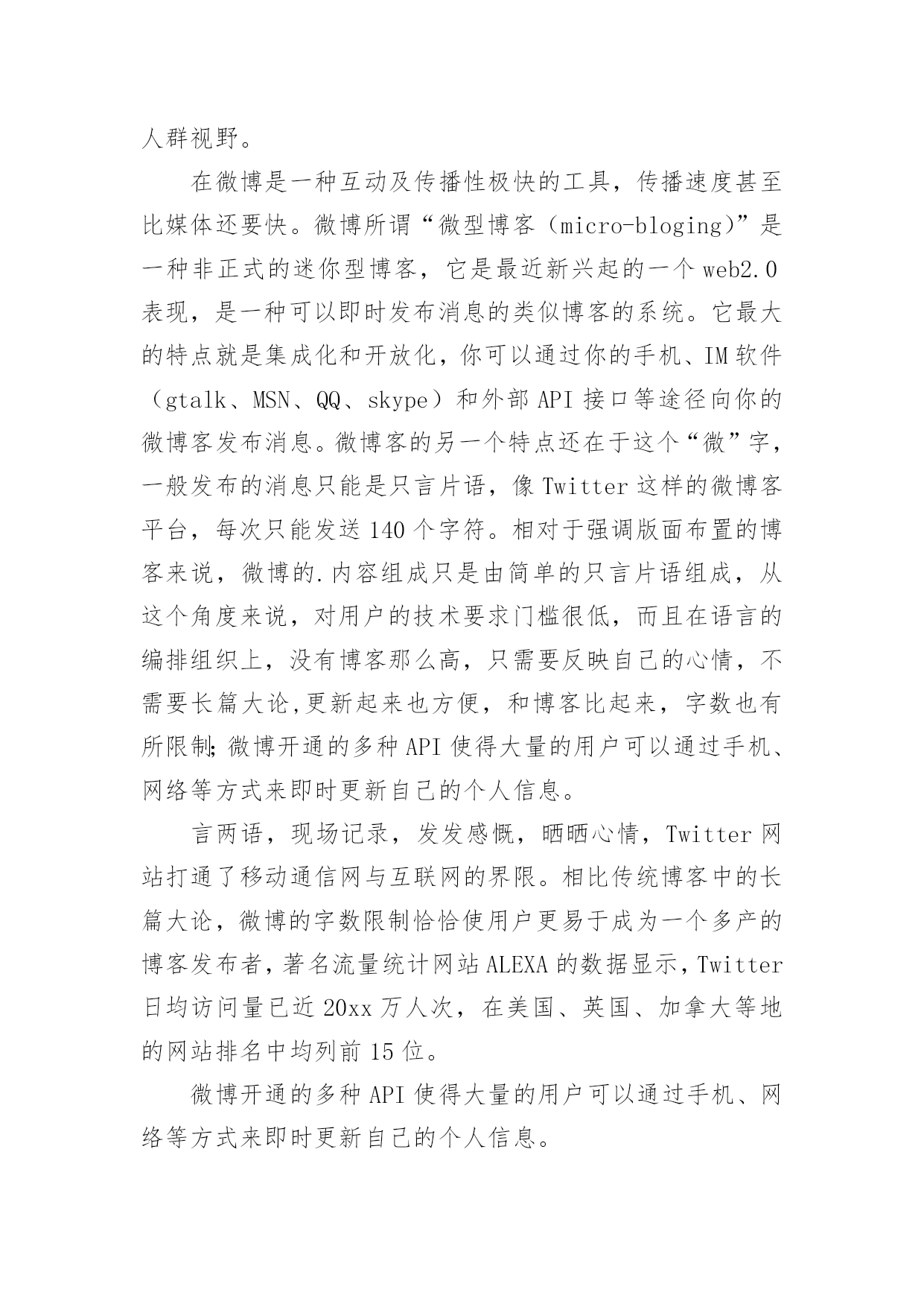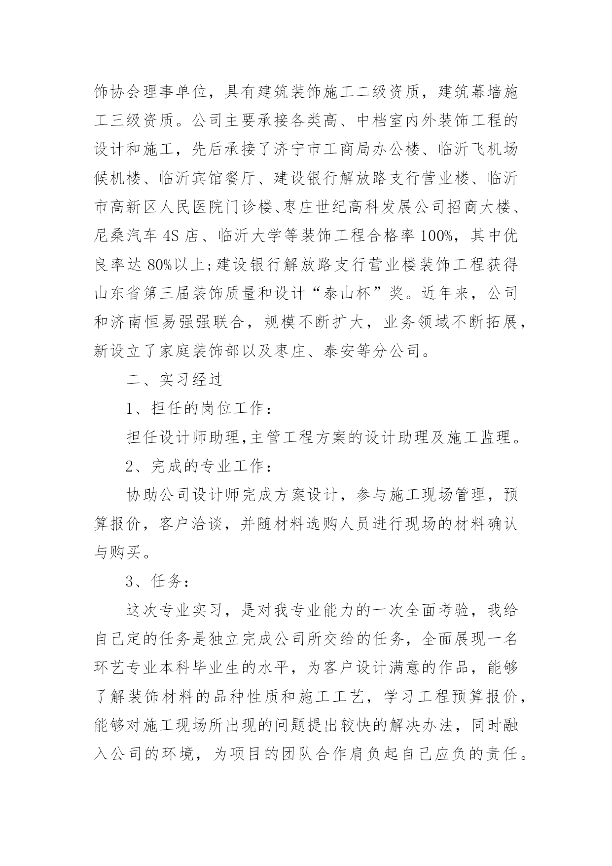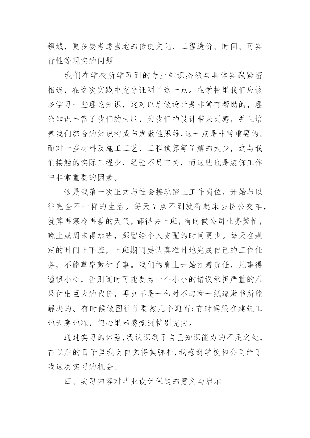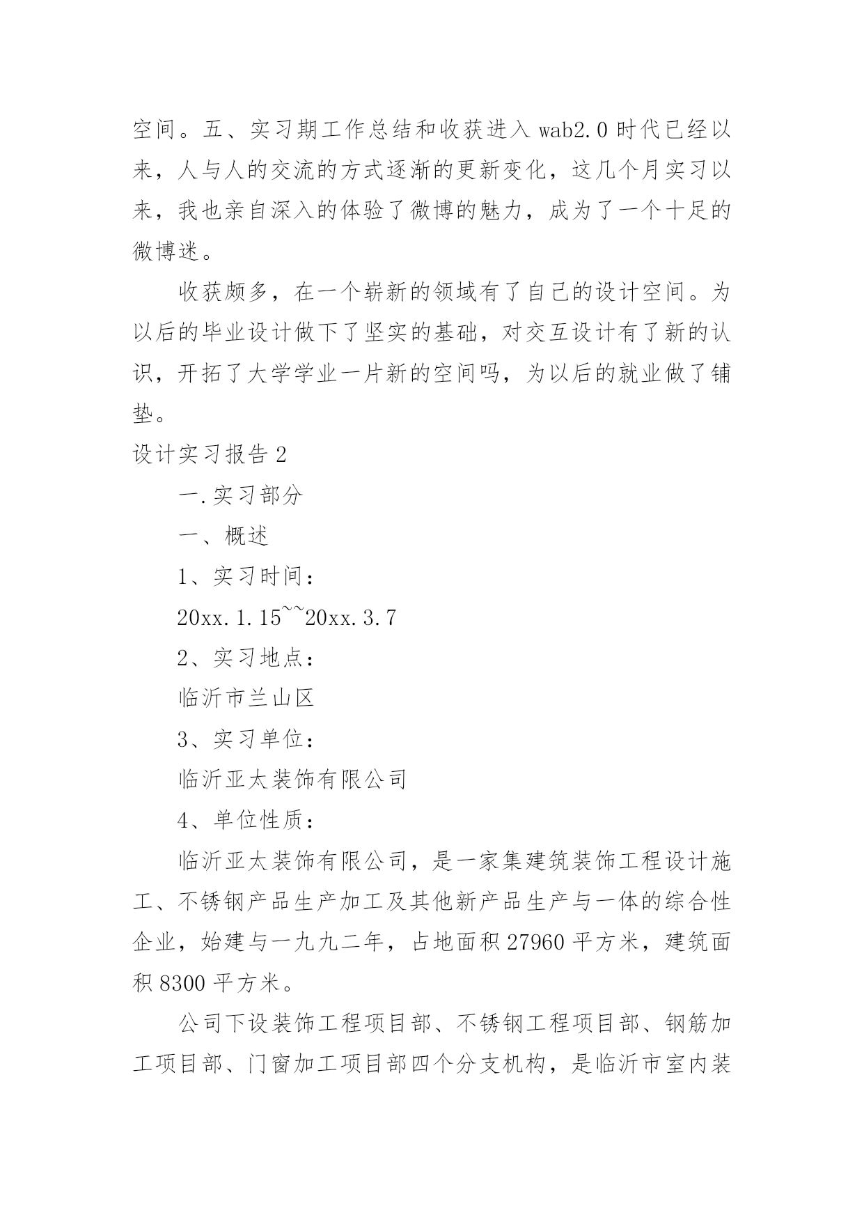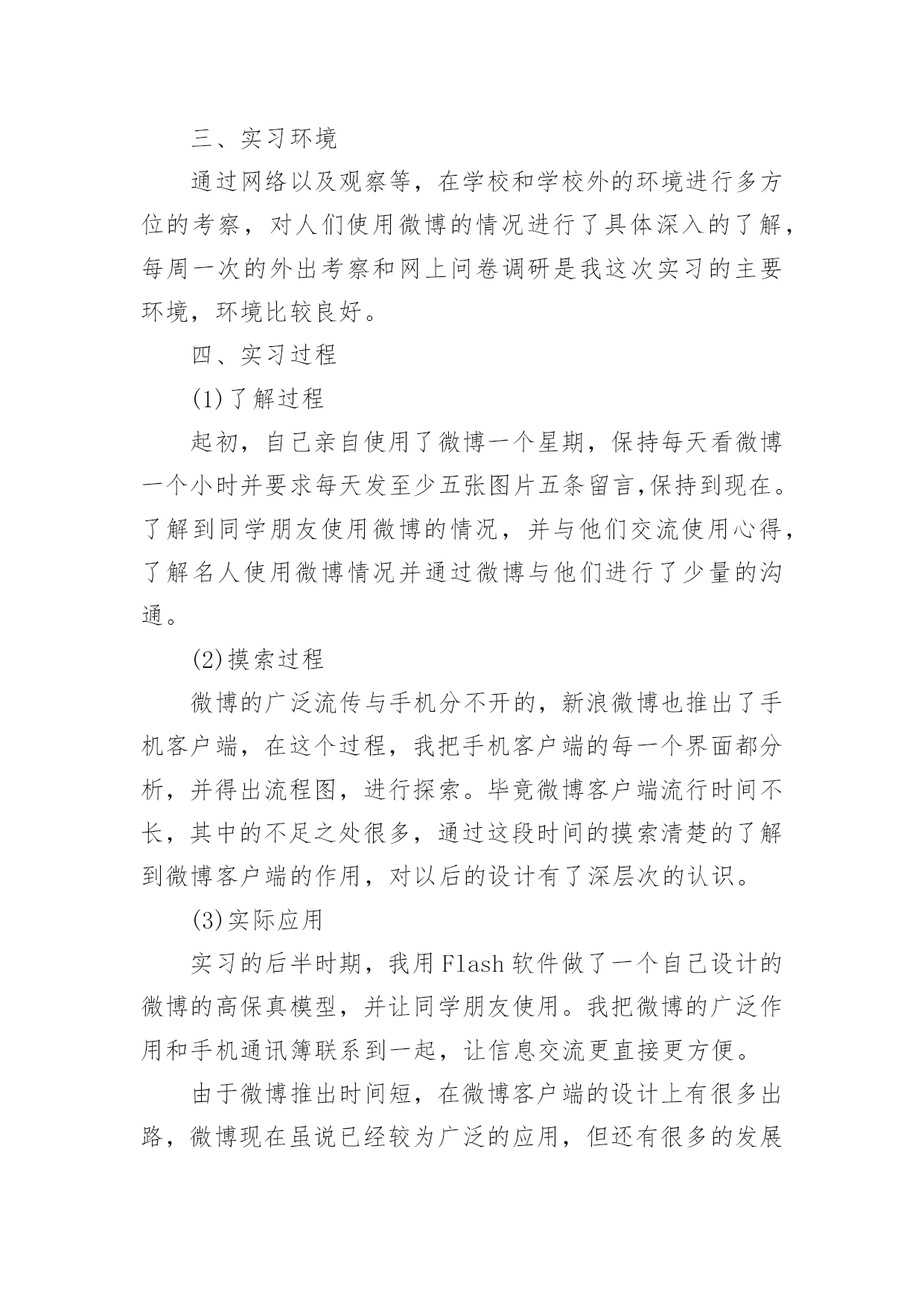 设计实习报告设计实习报告15篇在当下社会,越来越多人会去使用报告,报告包含标题、正文、结尾等。相信许多人会觉得报告很难写吧,以下是小编收集整理的设计实习报告,供大家参考借鉴,希望可以帮助到有需要的朋友。设计实习报告1一、实习说明(1)实习时间:20xx年10月20日至20xx年1月5日(2)实习内容:关于手机微波客户端的交互分析(3)实习性质:毕业实习二、实习内容介绍微博,即微博客(MicroBlog)的简称,是一个基于用户关系的信息分享、传播以及获取平台,用户可以通过WEB、WAP以及各种客户端组件个人社区,以140字左右的文字更新信息,并实现即时分享。最早也是最著名的微博是美国的twitter,根据相关公开数据,截至20xx年1月份,该产品在全球已经拥有7500万注册用户。20xx年8月份中国最大的门户网站新浪网推出“新浪微博”内测版,成为门户网站中第一家提供微博服务的网站,微博正式进入中文上网主流人群视野。在微博是一种互动及传播性极快的工具,传播速度甚至比媒体还要快。微博所谓“微型博客(micro-bloging)”是一种非正式的迷你型博客,它是最近新兴起的一个web2.0表现,是一种可以即时发布消息的类似博客的系统。它最大的特点就是集成化和开放化,你可以通过你的手机、IM软件(gtalk、MSN、QQ、skype)和外部API接口等途径向你的微博客发布消息。微博客的另一个特点还在于这个“微”字,一般发布的消息只能是只言片语,像Twitter这样的微博客平台,每次只能发送140个字符。相对于强调版面布置的博客来说,微博的.内容组成只是由简单的只言片语组成,从这个角度来说,对用户的技术要求门槛很低,而且在语言的编排组织上,没有博客那么高,只需要反映自己的心情,不需要长篇大论,更新起来也方便,和博客比起来,字数也有所限制;微博开通的多种API使得大量的用户可以通过手机、网络等方式来即时更新自己的个人信息。言两语,现场记录,发发感慨,晒晒心情,Twitter网站打通了移动通信网与互联网的界限。相比传统博客中的长篇大论,微博的字数限制恰恰使用户更易于成为一个多产的博客发布者,著名流量统计网站ALEXA的数据显示,Twitter日均访问量已近20xx万人次,在美国、英国、加拿大等地的网站排名中均列前15位。微博开通的多种API使得大量的用户可以通过手机、网络等方式来即时更新自己的个人信息。三、实习环境通过网络以及观察等,在学校和学校外的环境进行多方位的考察,对人们使用微博的情况进行了具体深入的了解,每周一次的外出考察和网上问卷调研是我这次实习的主要环境,环境比较良好。四、实习过程(1)了解过程起初,自己亲自使用了微博一个星期,保持每天看微博一个小时并要求每天发至少五张图片五条留言,保持到现在。了解到同学朋友使用微博的情况,并与他们交流使用心得,了解名人使用微博情况并通过微博与他们进行了少量的沟通。(2)摸索过程微博的广泛流传与手机分不开的,新浪微博也推出了手机客户端,在这个过程,我把手机客户端的每一个界面都分析,并得出流程图,进行探索。毕竟微博客户端流行时间不长,其中的不足之处很多,通过这段时间的摸索清楚的了解到微博客户端的作用,对以后的设计有了深层次的认识。(3)实际应用实习的后半时期,我用Flash软件做了一个自己设计的微博的高保真模型,并让同学朋友使用。我把微博的广泛作用和手机通讯簿联系到一起,让信息交流更直接更方便。由于微博推出时间短,在微博客户端的设计上有很多出路,微博现在虽说已经较为广泛的应用,但还有很多的发展空间。五、实习期工作总结和收获进入wab2.0时代已经以来,人与人的交流的方式逐渐的更新变化,这几个月实习以来,我也亲自深入的体验了微博的魅力,成为了一个十足的微博迷。收获颇多,在一个崭新的领域有了自己的设计空间。为以后的毕业设计做下了坚实的基础,对交互设计有了新的认识,开拓了大学学业一片新的空间吗,为以后的就业做了铺垫。设计实习报告2一.实习部分一、概述1、实习时间:20xx.1.15~~20xx.3.72、实习地点:临沂市兰山区3、实习单位:临沂亚太装饰有限公司4、单位性质:临沂亚太装饰有限公司,是一家集建筑装饰工程设计施工、不锈钢产品生产加工及其他新产品生产与一体的综合性企业,始建与一九九二年,占地面积27960平方米,建筑面积8300平方米。公司下设装饰工程项目部、不锈钢工程项目部、钢筋加工项目部、门窗加工项目部四个分支机构,是临沂市室内装饰协会理事单位,具有建筑装饰施工二级资质,建筑幕墙施工三级资质。公司主要承接各类高、中档室内外装饰工程的设计和施工,先后承接了济宁市工商局办公楼、临沂飞机场候机楼、临沂宾馆餐厅、建设银行解放路支行营业楼、临沂市高新区人民医院门诊楼、枣庄世纪高科发展公司招商大楼、尼桑