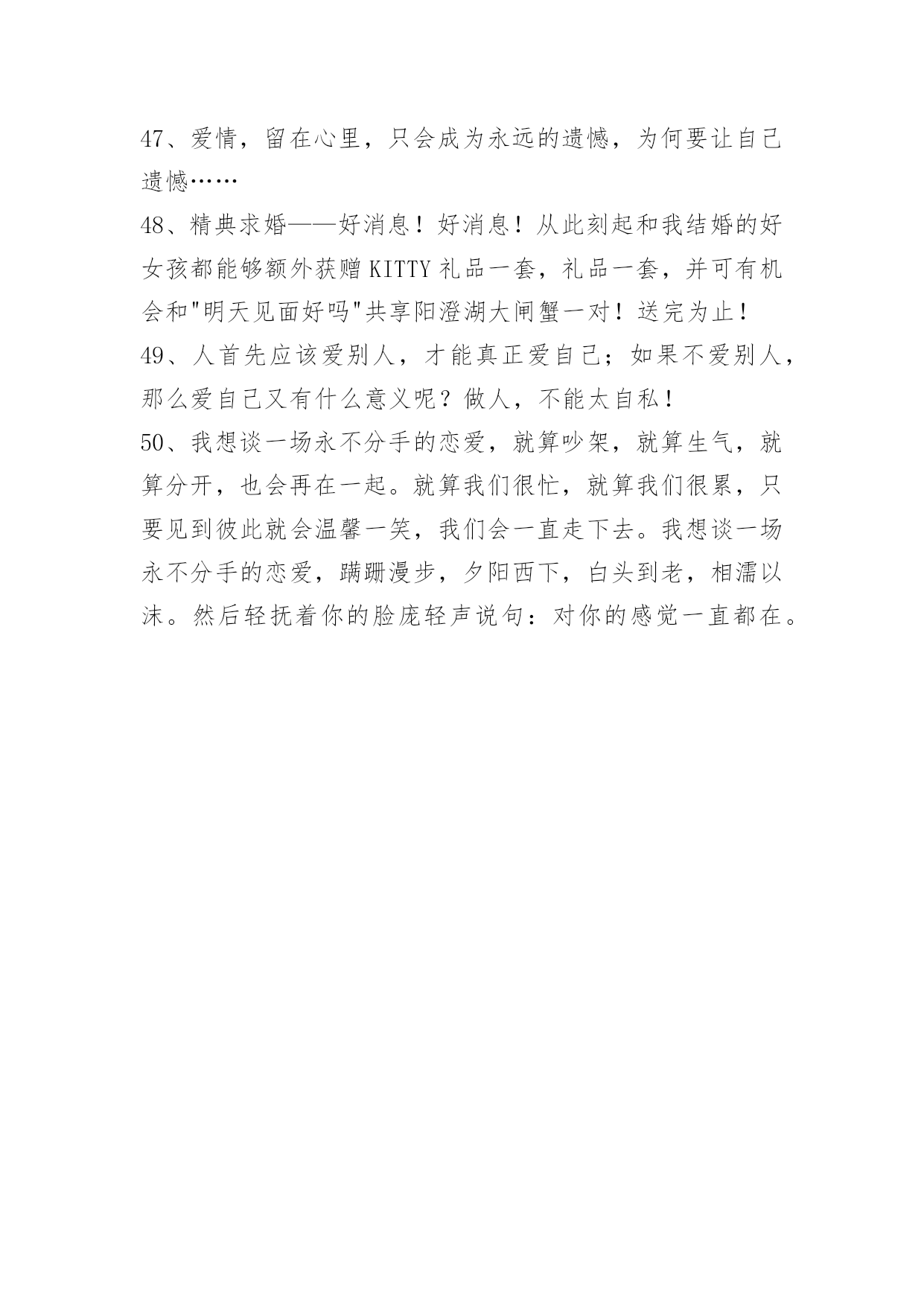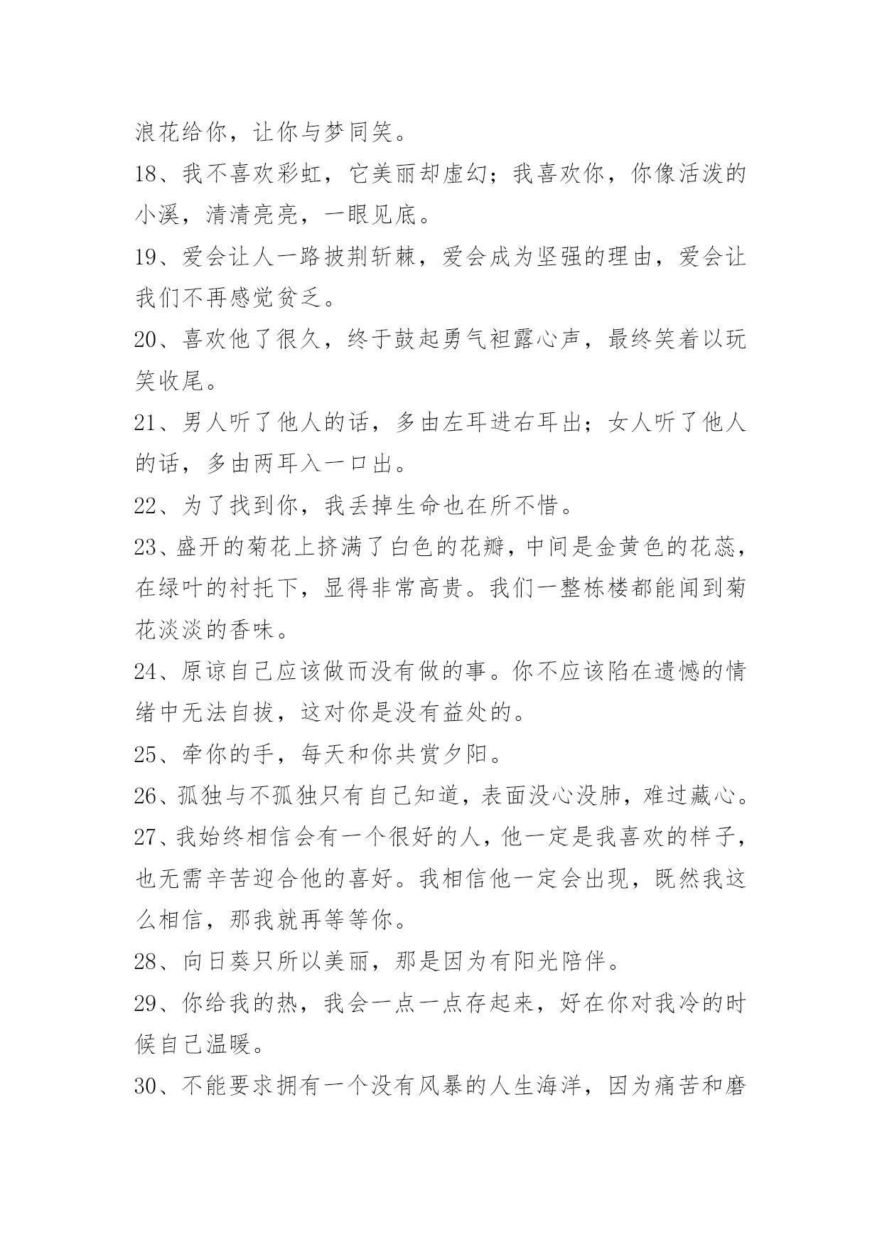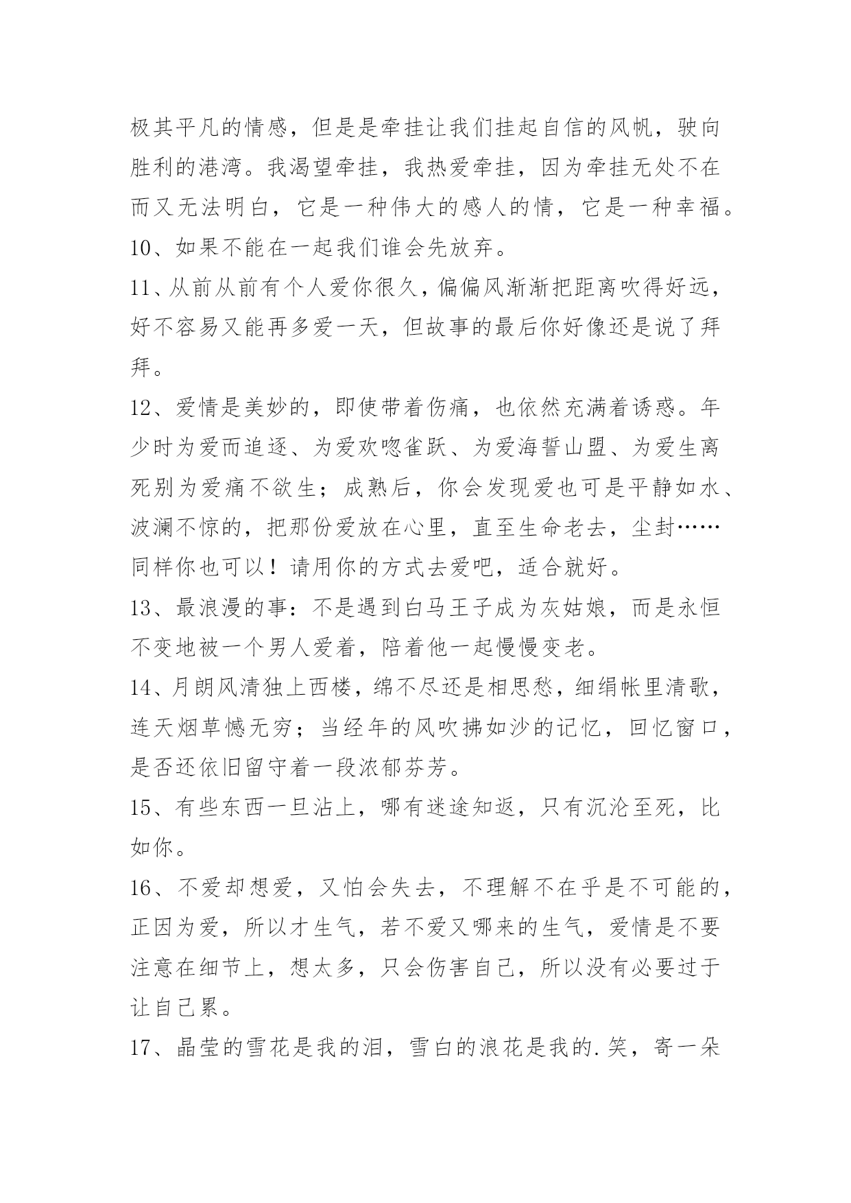 爱情句子50条2022年常用爱情句子汇总50条一个悲伤的男人背后一定有一段不幸的婚姻,一个忧郁的女人背后一定有一段不幸的爱情以下是小编为大家整理推荐的爱情句子50条,仅供参考,希望能够帮助到大家。1、我爱你,不会很久。比永远多一天。2、明明是你靠近我,怎么舍不得的会是我。3、经典爱情语录,的犹豫期已经超过,不许三心二意了!从今天起,只许温柔体贴,不许横行霸道;只许爱,不许恨;只许笑,不许哭。4、无法肯定的爱,左右摇摆,只好把心酸往深心里塞。5、你曾经爱一个人爱到一百分。今天,你爱上另一个人,但是你已经不像从前。你已经无法再爱一个人爱到一百分了。一个人老了,或者长大了,经历的事情太多,见过的悲欢太多,已经无法回到一百分的阶段,八十分已经是极限。《我最爱的人是你》6、每次回头看风景,若隐若现着一个爱过的心疼的容颜,曾经的故事里的美丽与哀愁,只能默默的咀嚼,却不能道破。盛夏的那一陇草香,吻香了我今生最美的爱情的脚印。7、要有多么地深爱才会恋恋不忘,要有多么地思念才会如此对你想起。8、关于爱情,我们都不懂,因为人心看不透。9、被人牵挂是一种幸福,是前世修来的难得的特殊的而又极其平凡的情感,但是是牵挂让我们挂起自信的风帆,驶向胜利的港湾。我渴望牵挂,我热爱牵挂,因为牵挂无处不在而又无法明白,它是一种伟大的感人的情,它是一种幸福。10、如果不能在一起我们谁会先放弃。11、从前从前有个人爱你很久,偏偏风渐渐把距离吹得好远,好不容易又能再多爱一天,但故事的最后你好像还是说了拜拜。12、爱情是美妙的,即使带着伤痛,也依然充满着诱惑。年少时为爱而追逐、为爱欢唿雀跃、为爱海誓山盟、为爱生离死别为爱痛不欲生;成熟后,你会发现爱也可是平静如水、波澜不惊的,把那份爱放在心里,直至生命老去,尘封……同样你也可以!请用你的方式去爱吧,适合就好。13、最浪漫的事:不是遇到白马王子成为灰姑娘,而是永恒不变地被一个男人爱着,陪着他一起慢慢变老。14、月朗风清独上西楼,绵不尽还是相思愁,细绢帐里清歌,连天烟草憾无穷;当经年的风吹拂如沙的记忆,回忆窗口,是否还依旧留守着一段浓郁芬芳。15、有些东西一旦沾上,哪有迷途知返,只有沉沦至死,比如你。16、不爱却想爱,又怕会失去,不理解不在乎是不可能的,正因为爱,所以才生气,若不爱又哪来的生气,爱情是不要注意在细节上,想太多,只会伤害自己,所以没有必要过于让自己累。17、晶莹的雪花是我的泪,雪白的浪花是我的.笑,寄一朵浪花给你,让你与梦同笑。18、我不喜欢彩虹,它美丽却虚幻;我喜欢你,你像活泼的小溪,清清亮亮,一眼见底。19、爱会让人一路披荆斩棘,爱会成为坚强的理由,爱会让我们不再感觉贫乏。20、喜欢他了很久,终于鼓起勇气袒露心声,最终笑着以玩笑收尾。21、男人听了他人的话,多由左耳进右耳出;女人听了他人的话,多由两耳入一口出。22、为了找到你,我丢掉生命也在所不惜。23、盛开的菊花上挤满了白色的花瓣,中间是金黄色的花蕊,在绿叶的衬托下,显得非常高贵。我们一整栋楼都能闻到菊花淡淡的香味。24、原谅自己应该做而没有做的事。你不应该陷在遗憾的情绪中无法自拔,这对你是没有益处的。25、牵你的手,每天和你共赏夕阳。26、孤独与不孤独只有自己知道,表面没心没肺,难过藏心。27、我始终相信会有一个很好的人,他一定是我喜欢的样子,也无需辛苦迎合他的喜好。我相信他一定会出现,既然我这么相信,那我就再等等你。28、向日葵只所以美丽,那是因为有阳光陪伴。29、你给我的热,我会一点一点存起来,好在你对我冷的时候自己温暖。30、不能要求拥有一个没有风暴的人生海洋,因为痛苦和磨难是人生的一部分。一个没有风暴的海洋,那不是海,是泥塘。31、我怀念,是你的味道。32、每一天醒来时回想梦中的你倍感甜蜜;中午时想你倍感情绪舒畅;晚上想你倍感幸福完美;在梦中见到你楚楚动人。33、家,是情感的栖息地,物质生活的后盾,安全健康的保障,好似学校,娱乐天地和今后发展的大本营。515国际家庭日,祝你家庭和睦,全家幸福安康!34、为了你眼里的光芒,怎敢让你失望。35、收完稻子的人徘徊在狭窄的田间小路,俯身捡拾稻草的老奶奶与成片的土地成了一幅静默的油画,在层次丰富的黄色调里看的见希望。36、我曾经无数次劝自己把你放下,可是根本就做不到,你能教教我吗?37、可是走到最后分手的理由,你给不了我想要的。38、如果在爱情里你足够坚强,就能逃脱过去,抵御未来。39、暮色时分,我也只是一个人的独角戏。40、一天,当你很老很老了,身体变小,小得像一颗葡萄乾,眼睛花花,往事蒙蒙,你是否还记得这一生你曾经深深地、深深地爱过一个人?是不记得了呢?抑或虽然记得却是依稀?当一个人独自活得太长太长,爱情其实没那麽深刻。一切都没那么深刻了。41、最美好的事是有人爱你,最安心的事是有人信你,最幸福的事