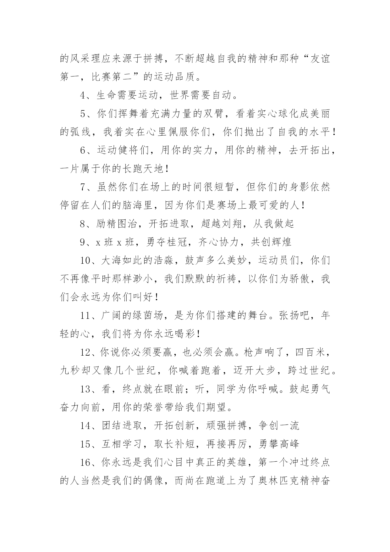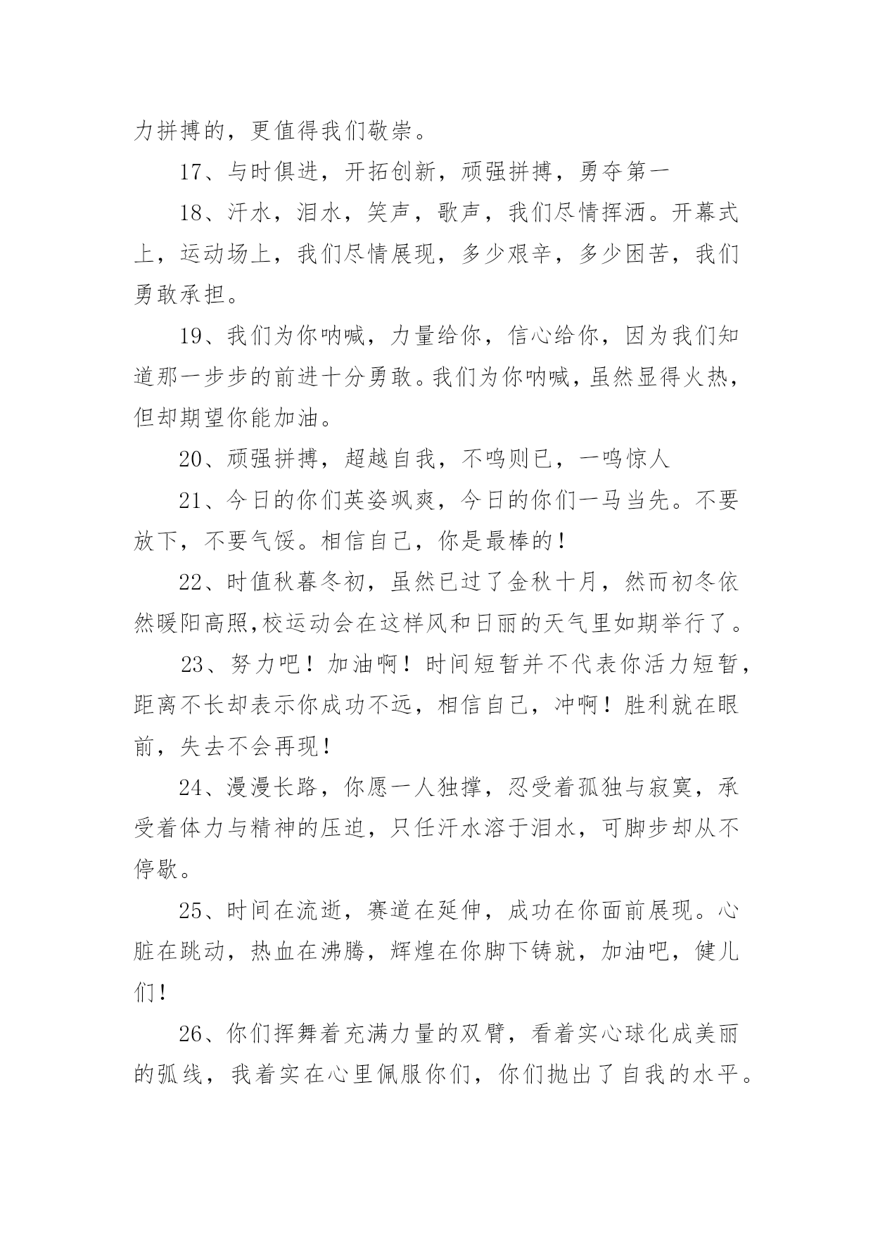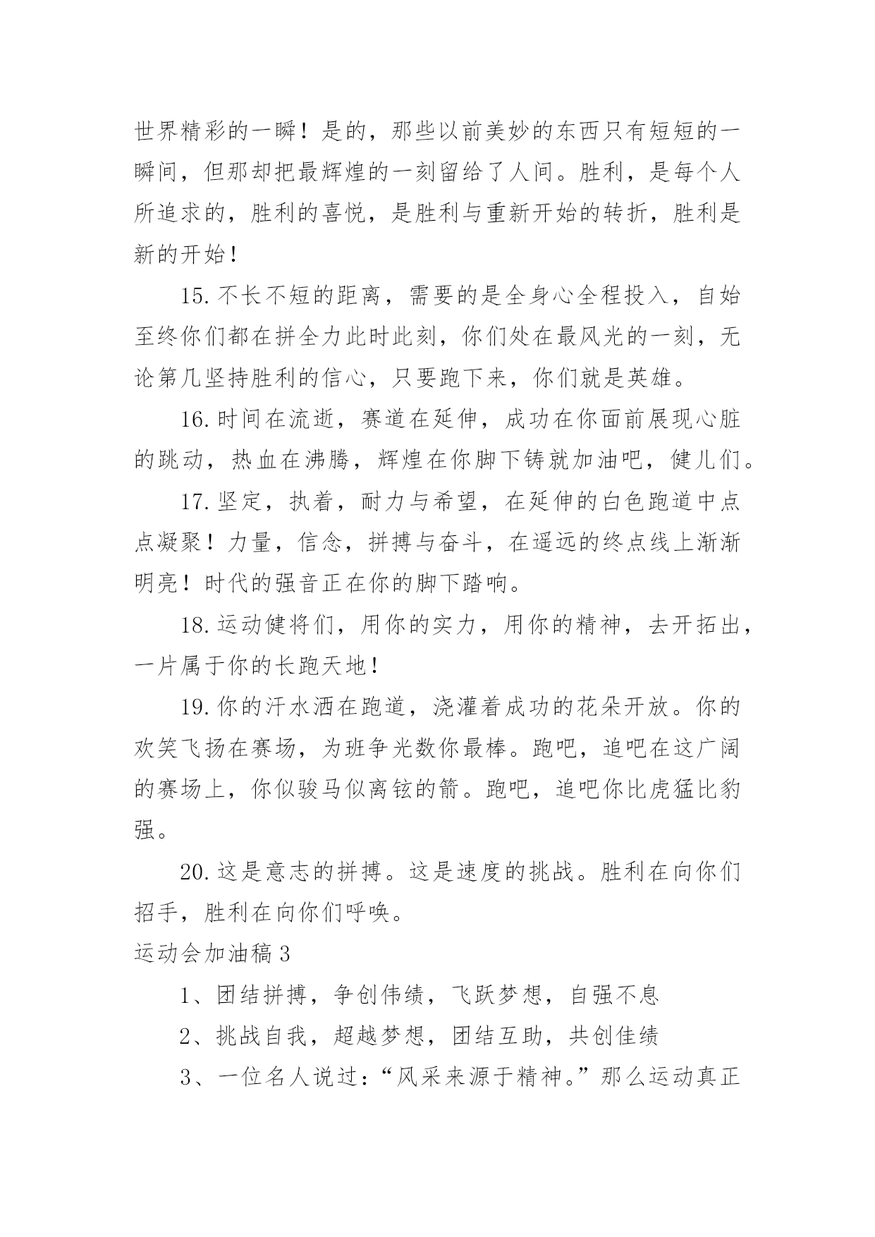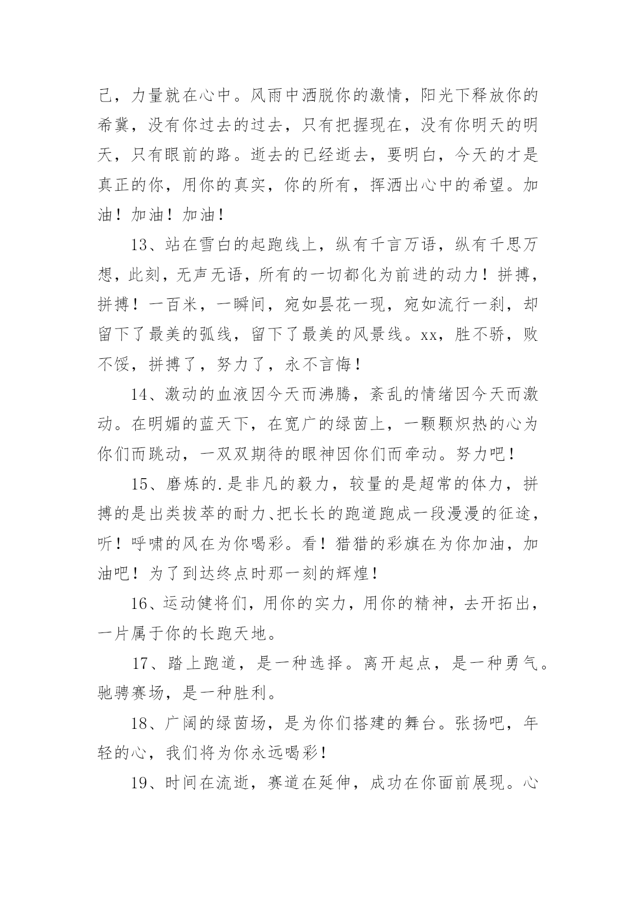 运动会加油稿运动会加油稿随着社会一步步向前发展,我们需要用到加油稿的情形越来越多,加油稿可以起到鼓励场上的人、增添其信心的作用。相信很多朋友都对写加油稿感到非常苦恼吧,以下是小编整理的运动会加油稿,希望对大家有所帮助。运动会加油稿11、步子迈开,让我们飞驰在红色跑道上,用我们的泪水和热血,更改历史的记录,起立吧,歌唱吧!为我们的勇士加油!2、这是意志的拼搏。这是速度的挑战。胜利在向你们招手、胜利在向你们呼唤。3、看,终点就在眼前,听,同学为你呼喊。鼓起勇气奋力向前,用你的荣誉带给我们希望。4、今天的你们英姿飒爽,今天的你们朝气蓬勃,今天的你们一马当先。相信自己,你是最棒的!不要放弃,不要气馁。成功永远属于你们。运动员~加油!5、你是跑道上划过的流星,燃烧自己,洒下光辉,也许你并没有看到成功像你挥手,但你已奋斗拼搏过,相信自己,力量就在心中。6、在黑白相间的跑道上,留下了你们灿烂的身影。在枪响的那一刹那,似流星、似闪电,如骏马奔腾,如蛟龙腾空,如猛虎出洞,不在乎名次高低,不在乎成绩高下。努力拼搏,顽强奋斗,即使落后,也顽强不屈,永不退缩!7、晨风轻轻地唤醒骄阳,校园的操场传来发令枪的声响,彩旗与呐喊声一起在飘荡着,心和起点紧紧的相连,用青春和热血来铺洒白色的跑道,用激情点燃胜利的曙光。8、你听那激烈奔跑的脚步声,震撼大地。你听那欢呼加油的呐喊声,催人奋进。赛场上的旋律,如旋风般急速,如号角般激扬,如激流般奔腾不息。创新!突破!超越!永远是赛场上最激动人心的旋律。9、在我们心中,你是一个神话。漫漫的长路上,你独挡一面;运动场上,你是颗冲刺的流星。看台上,千百只眼睛充满希望的望着你。人生拼搏的机会能有几何?把握机会,一定成功!10、运动场上有你们的飒爽英姿,运动场上有你们的拼搏身影,面对漫漫的征途,你没有畏惧和退缩。任汗水打湿脊背,任疲惫爬满全身,依然奋力追赶。只有一个目标,只有一个信念,为班级赢得荣誉。拼搏吧!我为你们呐喊!加油,加油!11、环形的跑道,一圈又一圈的坚持,毅力与精神活跃在会场上,湿透的衣衫,满头的大汗,无限追求奋力追赶,我们为你欢呼跳跃,我们为你骄傲。12、你是跑道上划过的流星,燃烧自己,洒下光辉,也许你并没有看到成功像你挥手,但你已奋斗拼搏过,相信自己,力量就在心中。风雨中洒脱你的激情,阳光下释放你的希冀,没有你过去的过去,只有把握现在,没有你明天的明天,只有眼前的路。逝去的已经逝去,要明白,今天的才是真正的你,用你的真实,你的所有,挥洒出心中的希望。加油!加油!加油!13、站在雪白的起跑线上,纵有千言万语,纵有千思万想,此刻,无声无语,所有的一切都化为前进的动力!拼搏,拼搏!一百米,一瞬间,宛如昙花一现,宛如流行一刹,却留下了最美的弧线,留下了最美的风景线。xx,胜不骄,败不馁,拼搏了,努力了,永不言悔!14、激动的血液因今天而沸腾,紊乱的情绪因今天而激动。在明媚的蓝天下,在宽广的绿茵上,一颗颗炽热的心为你们而跳动,一双双期待的眼神因你们而牵动。努力吧!15、磨炼的.是非凡的毅力,较量的是超常的体力,拼搏的是出类拔萃的耐力、把长长的跑道跑成一段漫漫的征途,听!呼啸的风在为你喝彩。看!猎猎的彩旗在为你加油,加油吧!为了到达终点时那一刻的辉煌!16、运动健将们,用你的实力,用你的精神,去开拓出,一片属于你的长跑天地。17、踏上跑道,是一种选择。离开起点,是一种勇气。驰骋赛场,是一种胜利。18、广阔的绿茵场,是为你们搭建的舞台。张扬吧,年轻的心,我们将为你永远喝彩!19、时间在流逝,赛道在延伸,成功在你面前展现。心脏的跳动,热血在沸腾,辉煌在你脚下铸就加油吧,健儿们!运动会加油稿21.心中坚定的信念,脚下沉稳的步伐,你用行动告诉我们一个不变之理,没有走不完的路,没有过不了的山,成功正在终点冲着你高高的招手,用你那顽强的意志去努力,去迎接终点的鲜花与掌声,相信成功必须是属于你。2.你用行动述说着过城的重要,没有无尽的终点,没有无法攀登的险峰,希望载着终点在向你微笑,拼搏吧!经历是一种精彩,迸发你全部的能量,成功是你汗水的写照。3.虽然你们在场上的时间很短暂,但你们的身影依然停留在人们的脑海里,因为你们是赛场上最可爱的人。4.萧瑟的秋风,挡不住你们破竹的锐气。5.年轻的我们自信飞扬,青春的气息如同出生的朝阳,蓬勃的力量如同阳光的挥洒。此时此刻,跑道便是我们精彩的舞台,声声加油便是我们的奖项!论何成功,谈何荣辱,心中的信念只有一个:拼搏!6.坚定,执着,耐力与希望,在延伸的白色跑道中点点凝聚!力量,信念,拼搏与奋斗,在遥远的'终点线上渐渐明亮!时代的强音正在你的脚下踏响。7.温暖的阳光洒在赛场上,男子乙组标枪的比赛即将开始。赛场上,一道道优美的弧线将轻盈地划过天空。健儿们用手中的标枪向距离的权限发起一轮又一轮的挑战。标