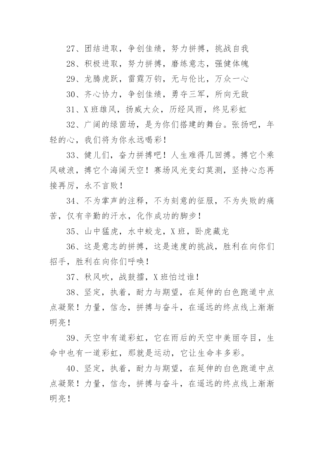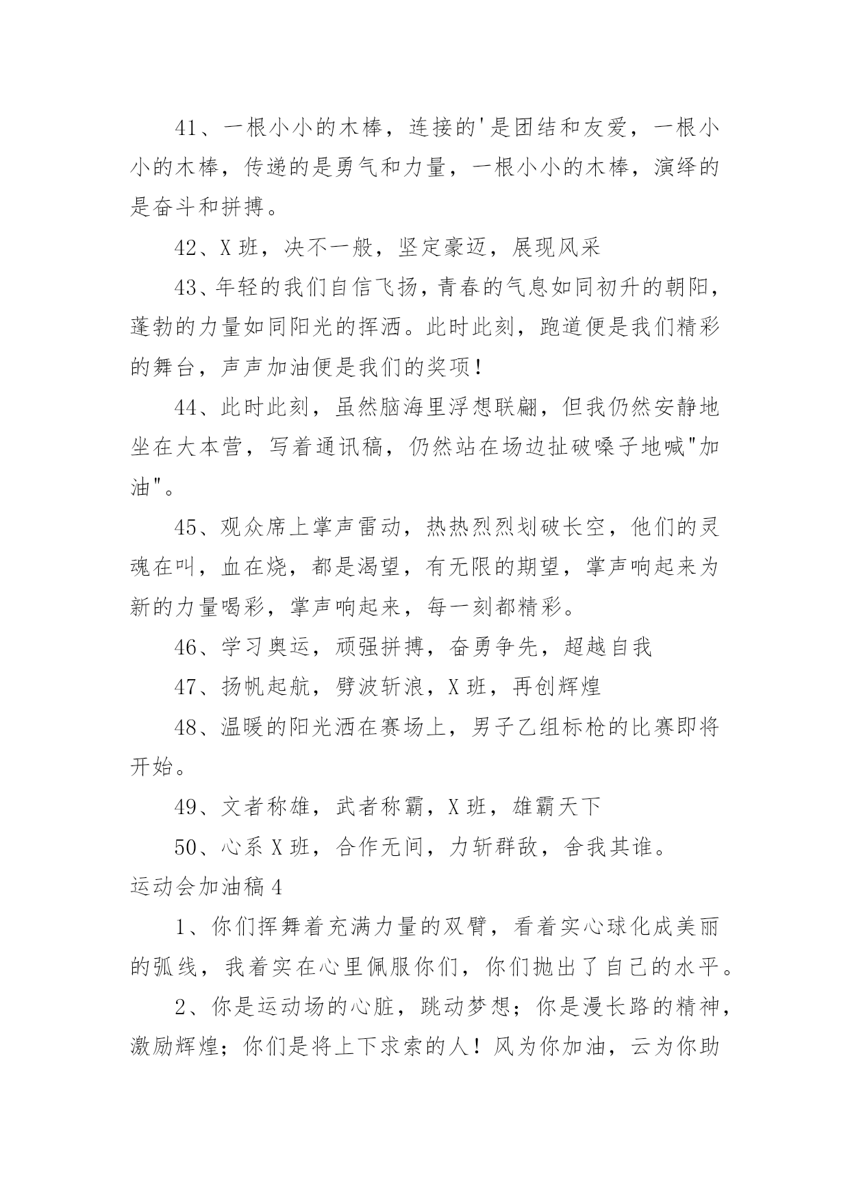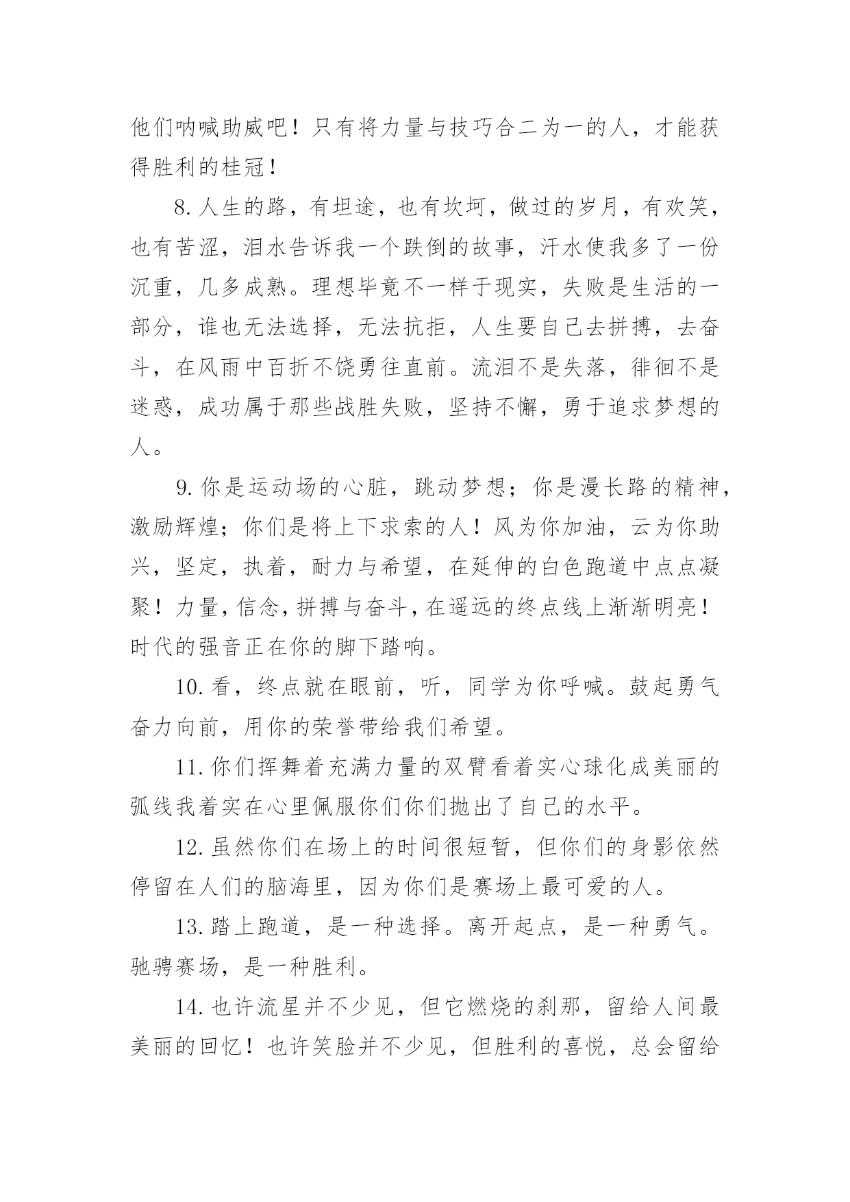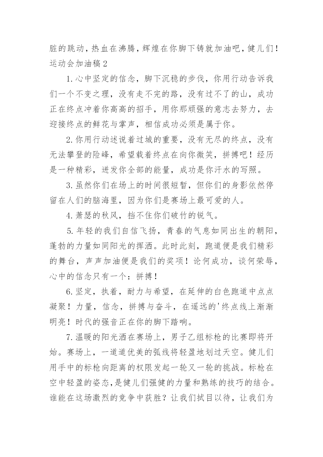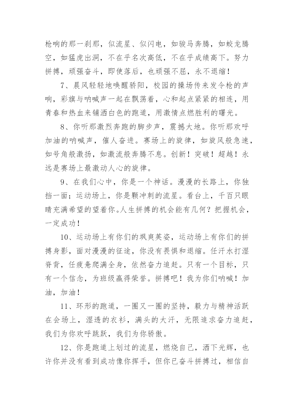 运动会加油稿运动会加油稿随着社会一步步向前发展,我们需要用到加油稿的情形越来越多,加油稿可以起到鼓励场上的人、增添其信心的作用。相信很多朋友都对写加油稿感到非常苦恼吧,以下是小编整理的运动会加油稿,希望对大家有所帮助。运动会加油稿11、步子迈开,让我们飞驰在红色跑道上,用我们的泪水和热血,更改历史的记录,起立吧,歌唱吧!为我们的勇士加油!2、这是意志的拼搏。这是速度的挑战。胜利在向你们招手、胜利在向你们呼唤。3、看,终点就在眼前,听,同学为你呼喊。鼓起勇气奋力向前,用你的荣誉带给我们希望。4、今天的你们英姿飒爽,今天的你们朝气蓬勃,今天的你们一马当先。相信自己,你是最棒的!不要放弃,不要气馁。成功永远属于你们。运动员~加油!5、你是跑道上划过的流星,燃烧自己,洒下光辉,也许你并没有看到成功像你挥手,但你已奋斗拼搏过,相信自己,力量就在心中。6、在黑白相间的跑道上,留下了你们灿烂的身影。在枪响的那一刹那,似流星、似闪电,如骏马奔腾,如蛟龙腾空,如猛虎出洞,不在乎名次高低,不在乎成绩高下。努力拼搏,顽强奋斗,即使落后,也顽强不屈,永不退缩!7、晨风轻轻地唤醒骄阳,校园的操场传来发令枪的声响,彩旗与呐喊声一起在飘荡着,心和起点紧紧的相连,用青春和热血来铺洒白色的跑道,用激情点燃胜利的曙光。8、你听那激烈奔跑的脚步声,震撼大地。你听那欢呼加油的呐喊声,催人奋进。赛场上的旋律,如旋风般急速,如号角般激扬,如激流般奔腾不息。创新!突破!超越!永远是赛场上最激动人心的旋律。9、在我们心中,你是一个神话。漫漫的长路上,你独挡一面;运动场上,你是颗冲刺的流星。看台上,千百只眼睛充满希望的望着你。人生拼搏的机会能有几何?把握机会,一定成功!10、运动场上有你们的飒爽英姿,运动场上有你们的拼搏身影,面对漫漫的征途,你没有畏惧和退缩。任汗水打湿脊背,任疲惫爬满全身,依然奋力追赶。只有一个目标,只有一个信念,为班级赢得荣誉。拼搏吧!我为你们呐喊!加油,加油!11、环形的跑道,一圈又一圈的坚持,毅力与精神活跃在会场上,湿透的衣衫,满头的大汗,无限追求奋力追赶,我们为你欢呼跳跃,我们为你骄傲。12、你是跑道上划过的流星,燃烧自己,洒下光辉,也许你并没有看到成功像你挥手,但你已奋斗拼搏过,相信自己,力量就在心中。风雨中洒脱你的激情,阳光下释放你的希冀,没有你过去的过去,只有把握现在,没有你明天的明天,只有眼前的路。逝去的已经逝去,要明白,今天的才是真正的你,用你的真实,你的所有,挥洒出心中的希望。加油!加油!加油!13、站在雪白的起跑线上,纵有千言万语,纵有千思万想,此刻,无声无语,所有的一切都化为前进的动力!拼搏,拼搏!一百米,一瞬间,宛如昙花一现,宛如流行一刹,却留下了最美的弧线,留下了最美的风景线。xx,胜不骄,败不馁,拼搏了,努力了,永不言悔!14、激动的血液因今天而沸腾,紊乱的情绪因今天而激动。在明媚的蓝天下,在宽广的绿茵上,一颗颗炽热的心为你们而跳动,一双双期待的眼神因你们而牵动。努力吧!15、磨炼的.是非凡的毅力,较量的是超常的体力,拼搏的是出类拔萃的耐力、把长长的跑道跑成一段漫漫的征途,听!呼啸的风在为你喝彩。看!猎猎的彩旗在为你加油,加油吧!为了到达终点时那一刻的辉煌!16、运动健将们,用你的实力,用你的精神,去开拓出,一片属于你的长跑天地。17、踏上跑道,是一种选择。离开起点,是一种勇气。驰骋赛场,是一种胜利。18、广阔的绿茵场,是为你们搭建的舞台。张扬吧,年轻的心,我们将为你永远喝彩!19、时间在流逝,赛道在延伸,成功在你面前展现。心脏的跳动,热血在沸腾,辉煌在你脚下铸就加油吧,健儿们!运动会加油稿21.心中坚定的信念,脚下沉稳的步伐,你用行动告诉我们一个不变之理,没有走不完的路,没有过不了的山,成功正在终点冲着你高高的招手,用你那顽强的意志去努力,去迎接终点的鲜花与掌声,相信成功必须是属于你。2.你用行动述说着过城的重要,没有无尽的终点,没有无法攀登的险峰,希望载着终点在向你微笑,拼搏吧!经历是一种精彩,迸发你全部的能量,成功是你汗水的写照。3.虽然你们在场上的时间很短暂,但你们的身影依然停留在人们的脑海里,因为你们是赛场上最可爱的人。4.萧瑟的秋风,挡不住你们破竹的锐气。5.年轻的我们自信飞扬,青春的气息如同出生的朝阳,蓬勃的力量如同阳光的挥洒。此时此刻,跑道便是我们精彩的舞台,声声加油便是我们的奖项!论何成功,谈何荣辱,心中的信念只有一个:拼搏!6.坚定,执着,耐力与希望,在延伸的白色跑道中点点凝聚!力量,信念,拼搏与奋斗,在遥远的'终点线上渐渐明亮!时代的强音正在你的脚下踏响。7.温暖的阳光洒在赛场上,男子乙组标枪的比赛即将开始。赛场上,一道道优美的弧线将轻盈地划过天空。健儿们用手中的标枪向距离的权限发起一轮又一轮的挑战。标