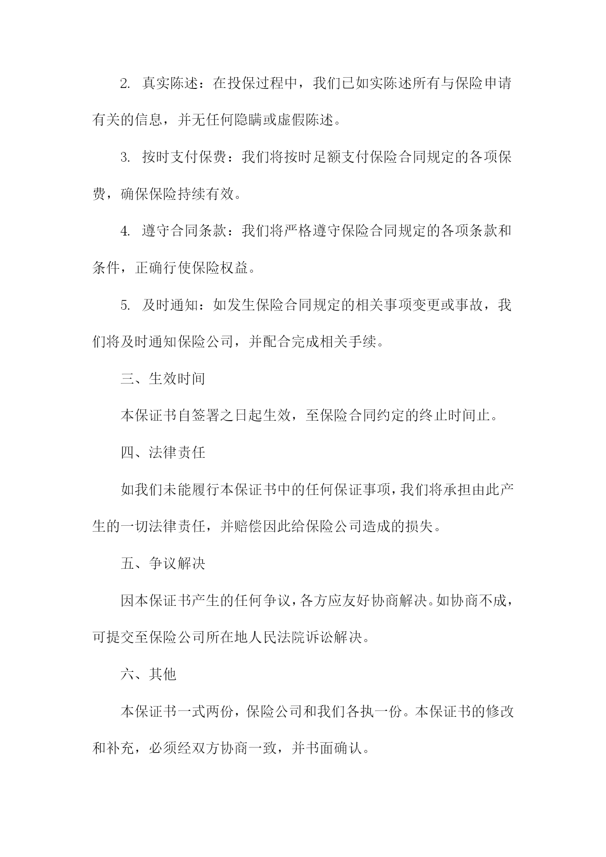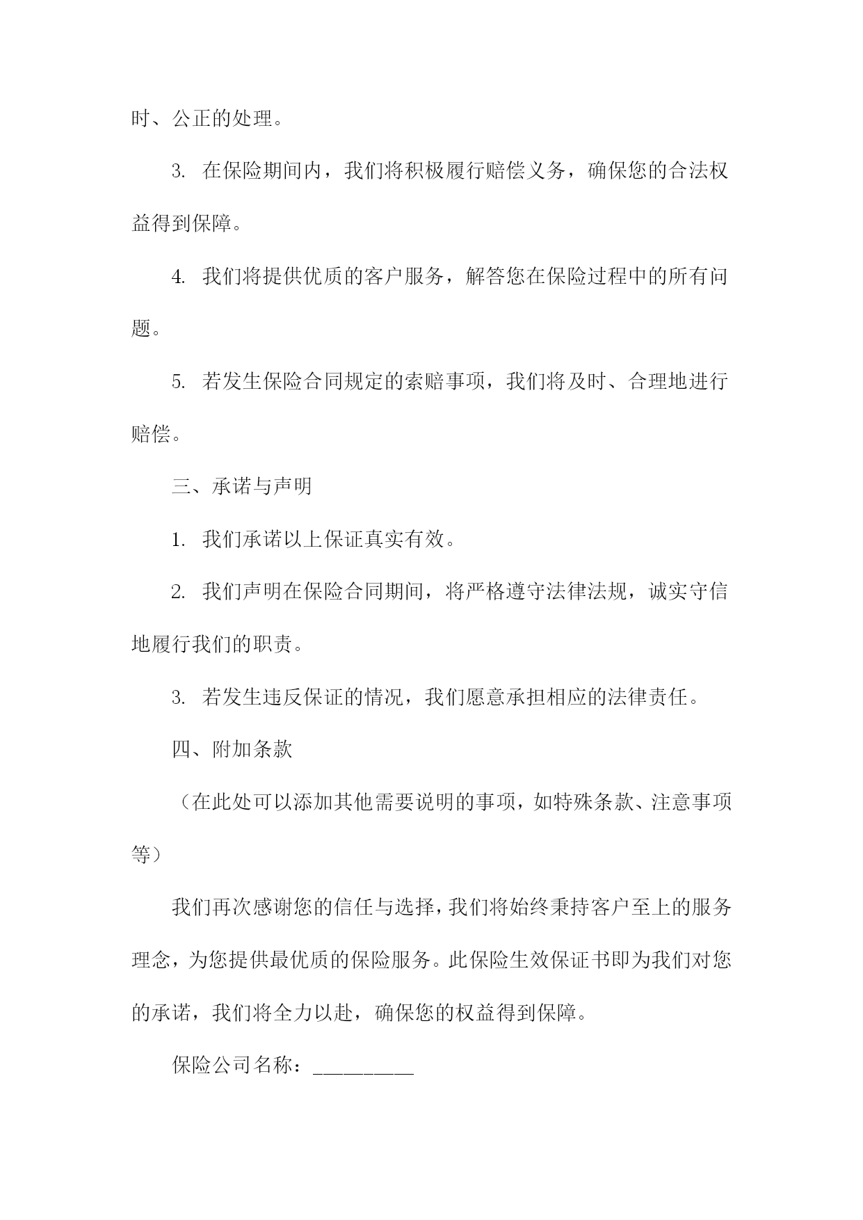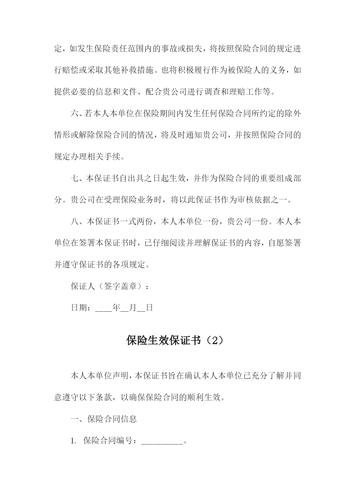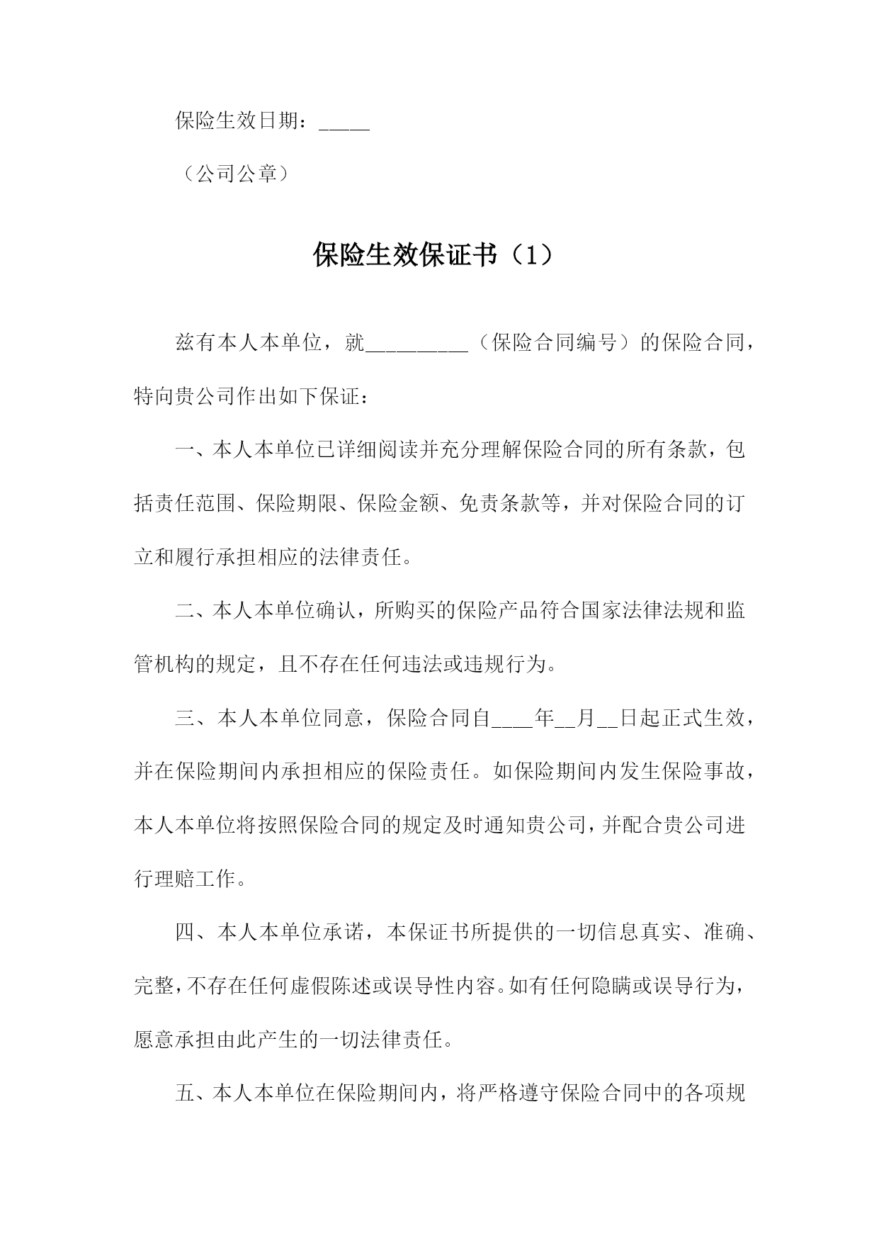 保险生效保证书尊敬的保险持有人客户,本着公平、公正和诚信的原则,我司(保险机构名称)向您发出此份保险生效保证书。我们深感对您的信任和选择感到荣幸,因此承诺在此保险期间内,我们将全面履行我们的责任和义务,确保您的保险权益得到充分保障。一、保证事项说明1.保险合同编号:__________(填写保险合同的具体编号)2.保险类型:__________(填写保险类型,如寿险、车险、财产险等)3.保险生效日期:_____(填写保险的生效日期)4.保险期限:_____(填写保险的有效期限)5.保险金额及赔偿标准:_____(详细说明保险金额及相应的赔偿标准)二、保证内容1.我们保证在保险生效日期起,保险合同所述的所有保险责任和义务将立即生效。2.我们将严格按照保险合同的规定,对发生的保险事故进行及时、公正的处理。3.在保险期间内,我们将积极履行赔偿义务,确保您的合法权益得到保障。4.我们将提供优质的客户服务,解答您在保险过程中的所有问题。5.若发生保险合同规定的索赔事项,我们将及时、合理地进行赔偿。三、承诺与声明1.我们承诺以上保证真实有效。2.我们声明在保险合同期间,将严格遵守法律法规,诚实守信地履行我们的职责。3.若发生违反保证的情况,我们愿意承担相应的法律责任。四、附加条款(在此处可以添加其他需要说明的事项,如特殊条款、注意事项等)我们再次感谢您的信任与选择,我们将始终秉持客户至上的服务理念,为您提供最优质的保险服务。此保险生效保证书即为我们对您的承诺,我们将全力以赴,确保您的权益得到保障。保险公司名称:__________保险生效日期:_____(公司公章)保险生效保证书(1)兹有本人本单位,就__________(保险合同编号)的保险合同,特向贵公司作出如下保证:一、本人本单位已详细阅读并充分理解保险合同的所有条款,包括责任范围、保险期限、保险金额、免责条款等,并对保险合同的订立和履行承担相应的法律责任。二、本人本单位确认,所购买的保险产品符合国家法律法规和监管机构的规定,且不存在任何违法或违规行为。三、本人本单位同意,保险合同自____年__月__日起正式生效,并在保险期间内承担相应的保险责任。如保险期间内发生保险事故,本人本单位将按照保险合同的规定及时通知贵公司,并配合贵公司进行理赔工作。四、本人本单位承诺,本保证书所提供的一切信息真实、准确、完整,不存在任何虚假陈述或误导性内容。如有任何隐瞒或误导行为,愿意承担由此产生的一切法律责任。五、本人本单位在保险期间内,将严格遵守保险合同中的各项规定,如发生保险责任范围内的事故或损失,将按照保险合同的规定进行赔偿或采取其他补救措施。也将积极履行作为被保险人的义务,如提供必要的信息和文件、配合贵公司进行调查和理赔工作等。六、若本人本单位在保险期间内发生任何保险合同所约定的除外情形或解除保险合同的情况,将及时通知贵公司,并按照保险合同的规定办理相关手续。七、本保证书自出具之日起生效,并作为保险合同的重要组成部分。贵公司在受理保险业务时,将以此保证书作为审核依据之一。八、本保证书一式两份,本人本单位一份,贵公司一份。本人本单位在签署本保证书时,已仔细阅读并理解保证书的内容,自愿签署并遵守保证书的各项规定。保证人(签字盖章):日期:____年__月__日保险生效保证书(2)本人本单位声明,本保证书旨在确认本人本单位已充分了解并同意遵守以下条款,以确保保险合同的顺利生效。一、保险合同信息1.保险合同编号:__________。2.保险公司名称:__________。3.保险产品名称:__________。4.保险期限:自____年__月__日起至____年__月__日止。二、保证内容1.本人本单位已如实告知保险公司被保险人的健康状况、年龄、职业等相关信息,并符合投保条件。2.本人本单位已按照保险公司的要求支付了首期保险费,并承诺在保险期间内按时支付续期保险费。3.本人本单位将妥善保管保险合同及相关文件,确保其完整性和可追溯性。三、责任免除1.因以下原因导致保险合同无法生效或失效,本人本单位不承担任何责任:提供虚假信息或隐瞒重要事实;恶意制造保险事故;其他违反保险合同约定的行为。四、保险责任与免责条款1.保险公司将根据保险合同的约定,在保险期间内承担相应的保险责任。2.若发生保险责任范围内的事故,保险公司将按照保险合同的规定进行赔偿或给付。3.对于免责条款中明确列出的事项,保险公司不承担赔偿责任。五、其他1.本保证书自本人本单位签字(或盖章)之日起生效。2.本保证书一式两份,本人本单位一份,保险公司一份。本人本单位已仔细阅读并理解上述条款,对保险合同的生效和履行承担相应责任。