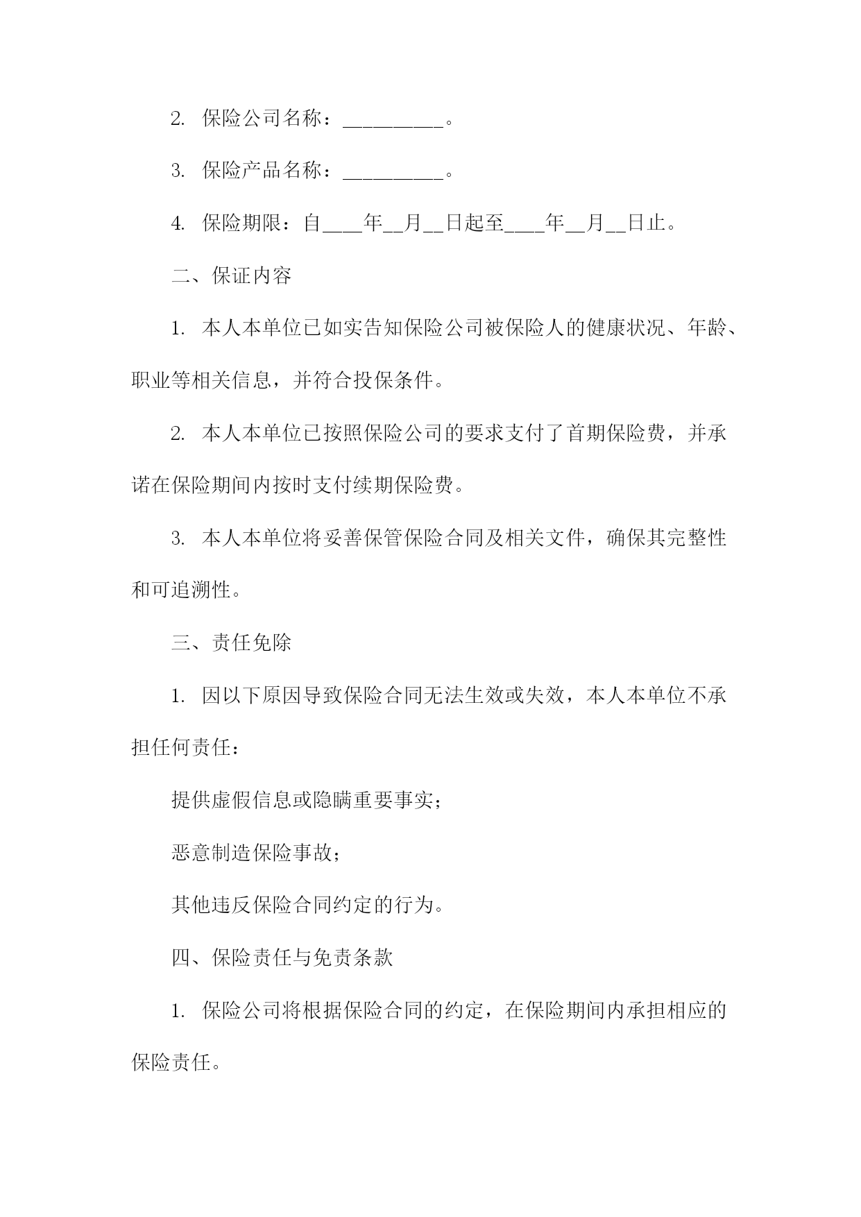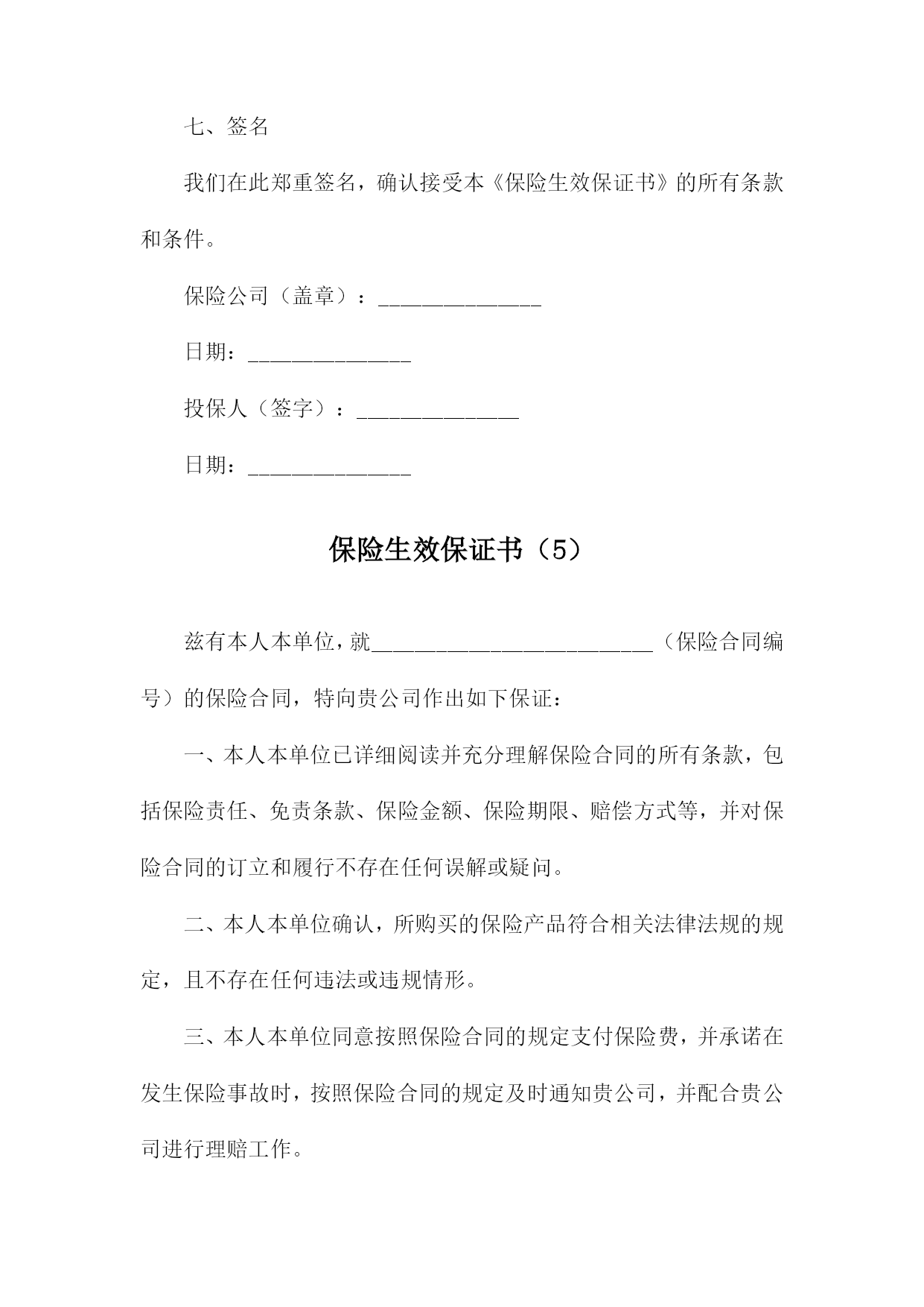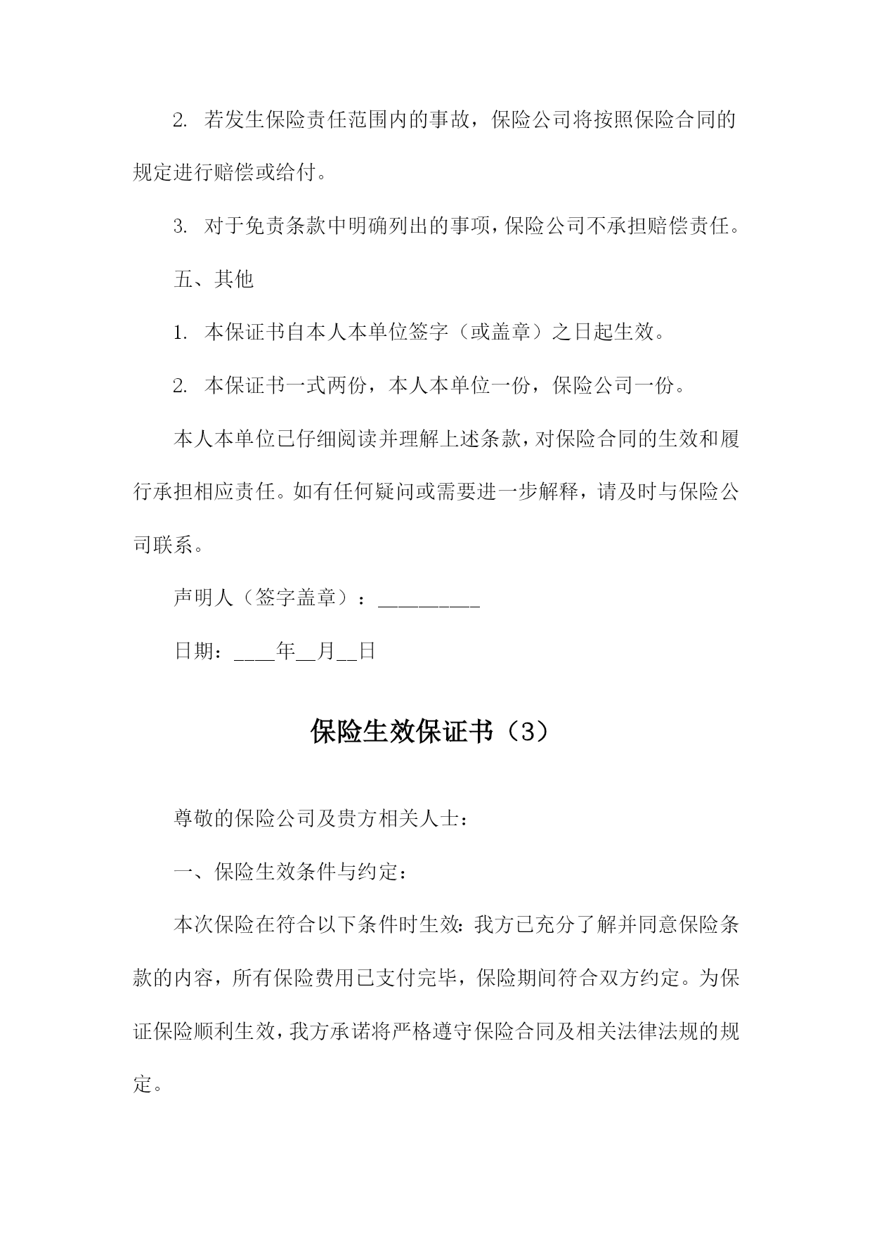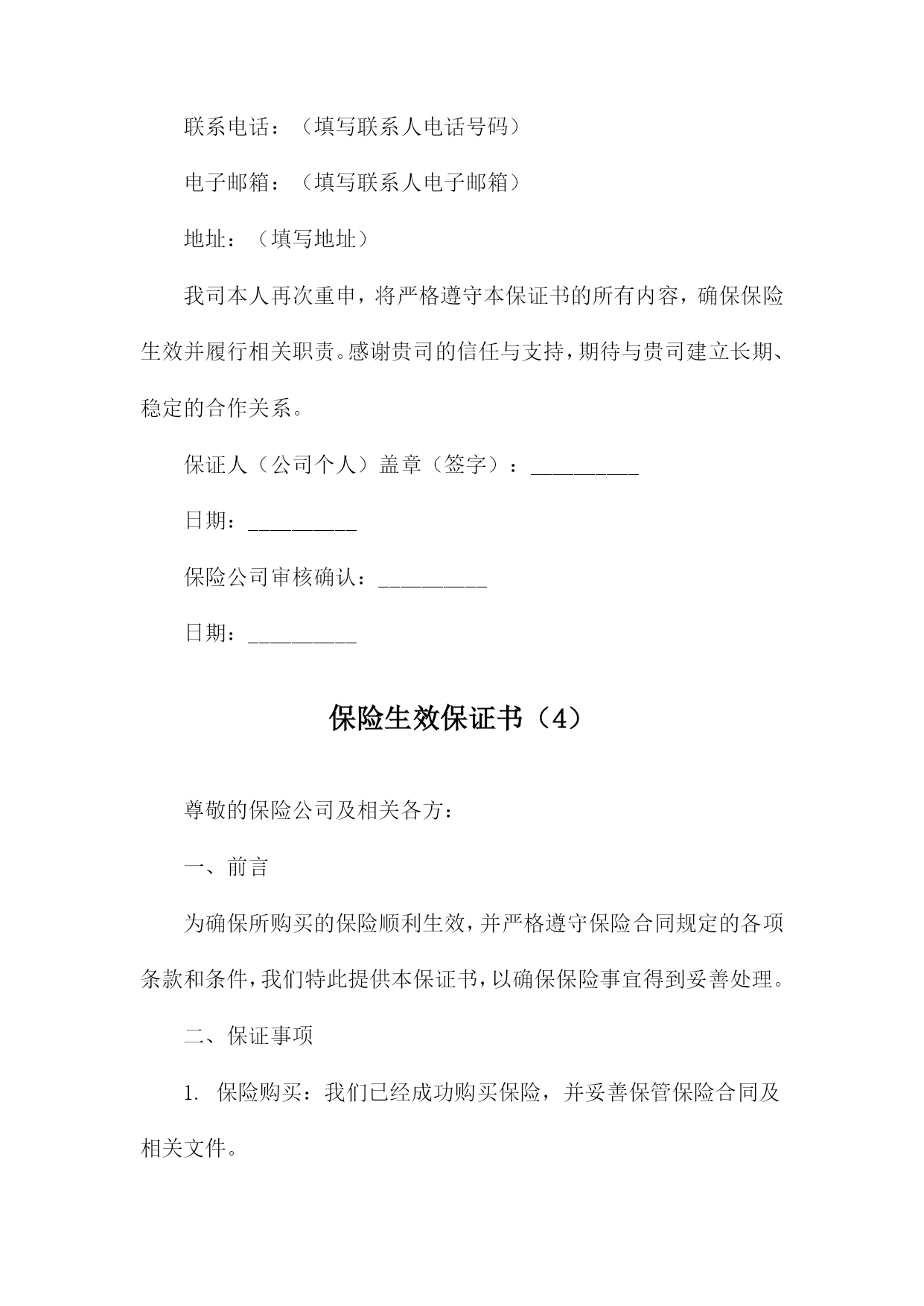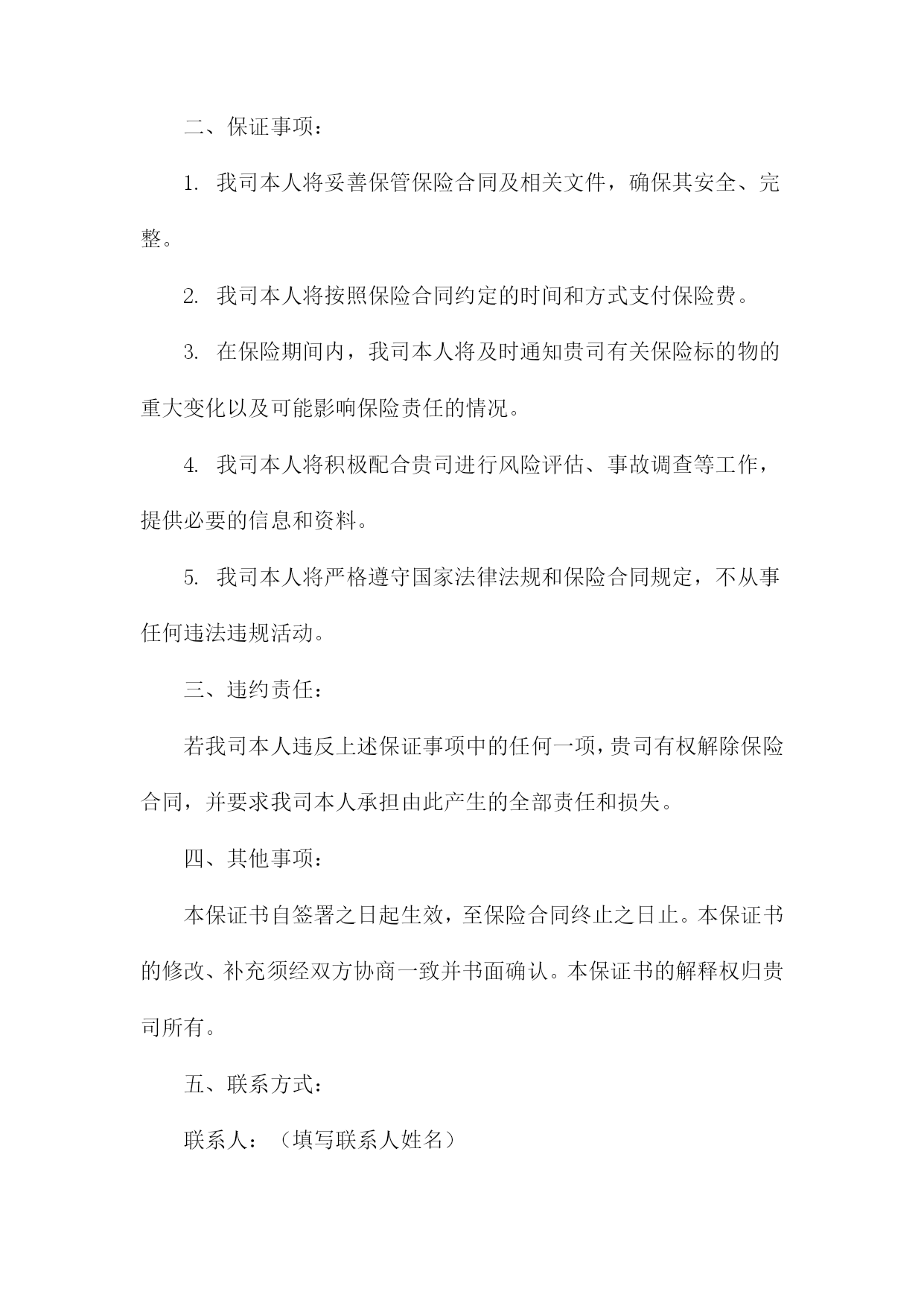 保险生效保证书尊敬的保险持有人客户,本着公平、公正和诚信的原则,我司(保险机构名称)向您发出此份保险生效保证书。我们深感对您的信任和选择感到荣幸,因此承诺在此保险期间内,我们将全面履行我们的责任和义务,确保您的保险权益得到充分保障。一、保证事项说明1.保险合同编号:__________(填写保险合同的具体编号)2.保险类型:__________(填写保险类型,如寿险、车险、财产险等)3.保险生效日期:_____(填写保险的生效日期)4.保险期限:_____(填写保险的有效期限)5.保险金额及赔偿标准:_____(详细说明保险金额及相应的赔偿标准)二、保证内容1.我们保证在保险生效日期起,保险合同所述的所有保险责任和义务将立即生效。2.我们将严格按照保险合同的规定,对发生的保险事故进行及时、公正的处理。3.在保险期间内,我们将积极履行赔偿义务,确保您的合法权益得到保障。4.我们将提供优质的客户服务,解答您在保险过程中的所有问题。5.若发生保险合同规定的索赔事项,我们将及时、合理地进行赔偿。三、承诺与声明1.我们承诺以上保证真实有效。2.我们声明在保险合同期间,将严格遵守法律法规,诚实守信地履行我们的职责。3.若发生违反保证的情况,我们愿意承担相应的法律责任。四、附加条款(在此处可以添加其他需要说明的事项,如特殊条款、注意事项等)我们再次感谢您的信任与选择,我们将始终秉持客户至上的服务理念,为您提供最优质的保险服务。此保险生效保证书即为我们对您的承诺,我们将全力以赴,确保您的权益得到保障。保险公司名称:__________保险生效日期:_____(公司公章)保险生效保证书(1)兹有本人本单位,就__________(保险合同编号)的保险合同,特向贵公司作出如下保证:一、本人本单位已详细阅读并充分理解保险合同的所有条款,包括责任范围、保险期限、保险金额、免责条款等,并对保险合同的订立和履行承担相应的法律责任。二、本人本单位确认,所购买的保险产品符合国家法律法规和监管机构的规定,且不存在任何违法或违规行为。三、本人本单位同意,保险合同自____年__月__日起正式生效,并在保险期间内承担相应的保险责任。如保险期间内发生保险事故,本人本单位将按照保险合同的规定及时通知贵公司,并配合贵公司进行理赔工作。四、本人本单位承诺,本保证书所提供的一切信息真实、准确、完整,不存在任何虚假陈述或误导性内容。如有任何隐瞒或误导行为,愿意承担由此产生的一切法律责任。五、本人本单位在保险期间内,将严格遵守保险合同中的各项规定,如发生保险责任范围内的事故或损失,将按照保险合同的规定进行赔偿或采取其他补救措施。也将积极履行作为被保险人的义务,如提供必要的信息和文件、配合贵公司进行调查和理赔工作等。六、若本人本单位在保险期间内发生任何保险合同所约定的除外情形或解除保险合同的情况,将及时通知贵公司,并按照保险合同的规定办理相关手续。七、本保证书自出具之日起生效,并作为保险合同的重要组成部分。贵公司在受理保险业务时,将以此保证书作为审核依据之一。八、本保证书一式两份,本人本单位一份,贵公司一份。本人本单位在签署本保证书时,已仔细阅读并理解保证书的内容,自愿签署并遵守保证书的各项规定。保证人(签字盖章):日期:____年__月__日保险生效保证书(2)本人本单位声明,本保证书旨在确认本人本单位已充分了解并同意遵守以下条款,以确保保险合同的顺利生效。一、保险合同信息1.保险合同编号:__________。2.保险公司名称:__________。3.保险产品名称:__________。4.保险期限:自____年__月__日起至____年__月__日止。二、保证内容1.本人本单位已如实告知保险公司被保险人的健康状况、年龄、职业等相关信息,并符合投保条件。2.本人本单位已按照保险公司的要求支付了首期保险费,并承诺在保险期间内按时支付续期保险费。3.本人本单位将妥善保管保险合同及相关文件,确保其完整性和可追溯性。三、责任免除1.因以下原因导致保险合同无法生效或失效,本人本单位不承担任何责任:提供虚假信息或隐瞒重要事实;恶意制造保险事故;其他违反保险合同约定的行为。四、保险责任与免责条款1.保险公司将根据保险合同的约定,在保险期间内承担相应的保险责任。2.若发生保险责任范围内的事故,保险公司将按照保险合同的规定进行赔偿或给付。3.对于免责条款中明确列出的事项,保险公司不承担赔偿责任。五、其他1.本保证书自本人本单位签字(或盖章)之日起生效。2.本保证书一式两份,本人本单位一份,保险公司一份。本人本单位已仔细阅读并理解上述条款,对保险合同的生效和履行承担相应责任。
