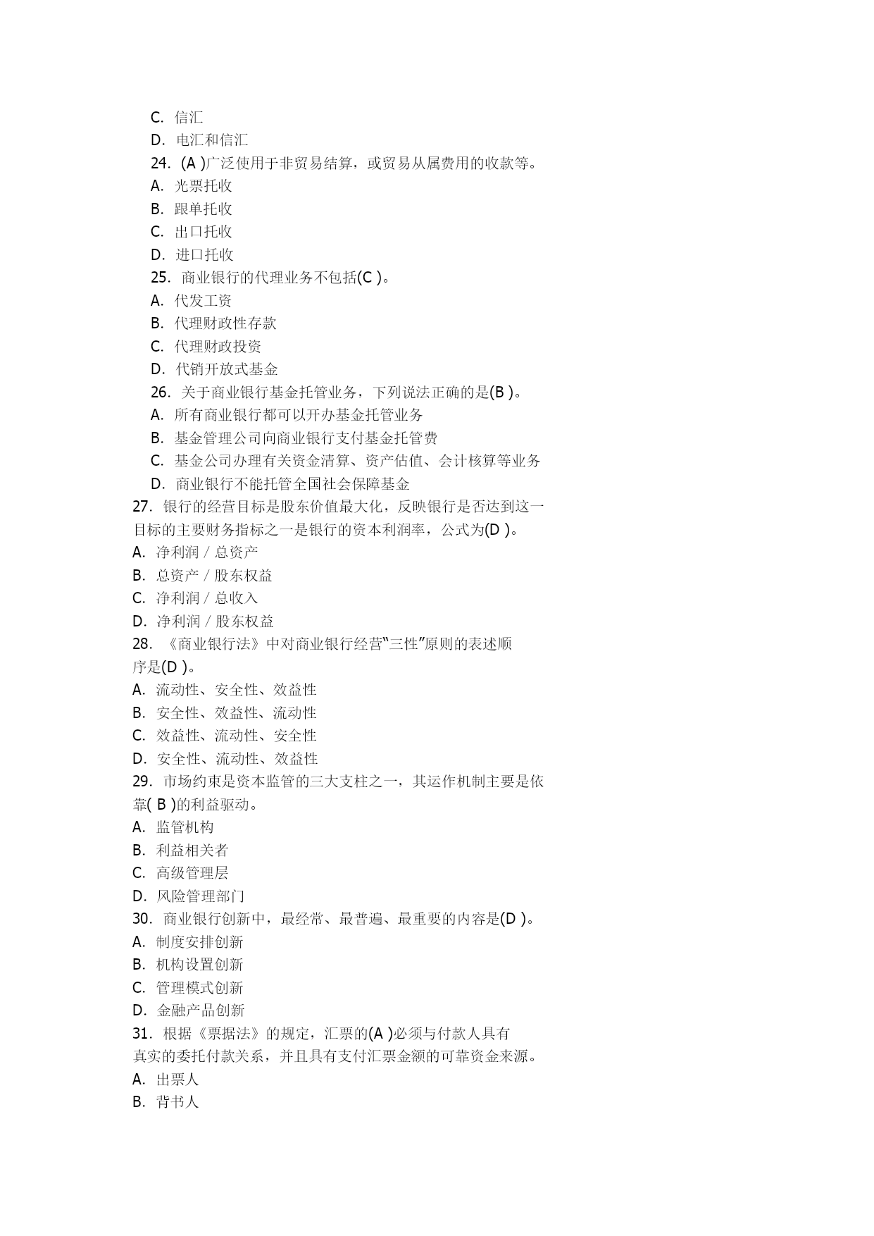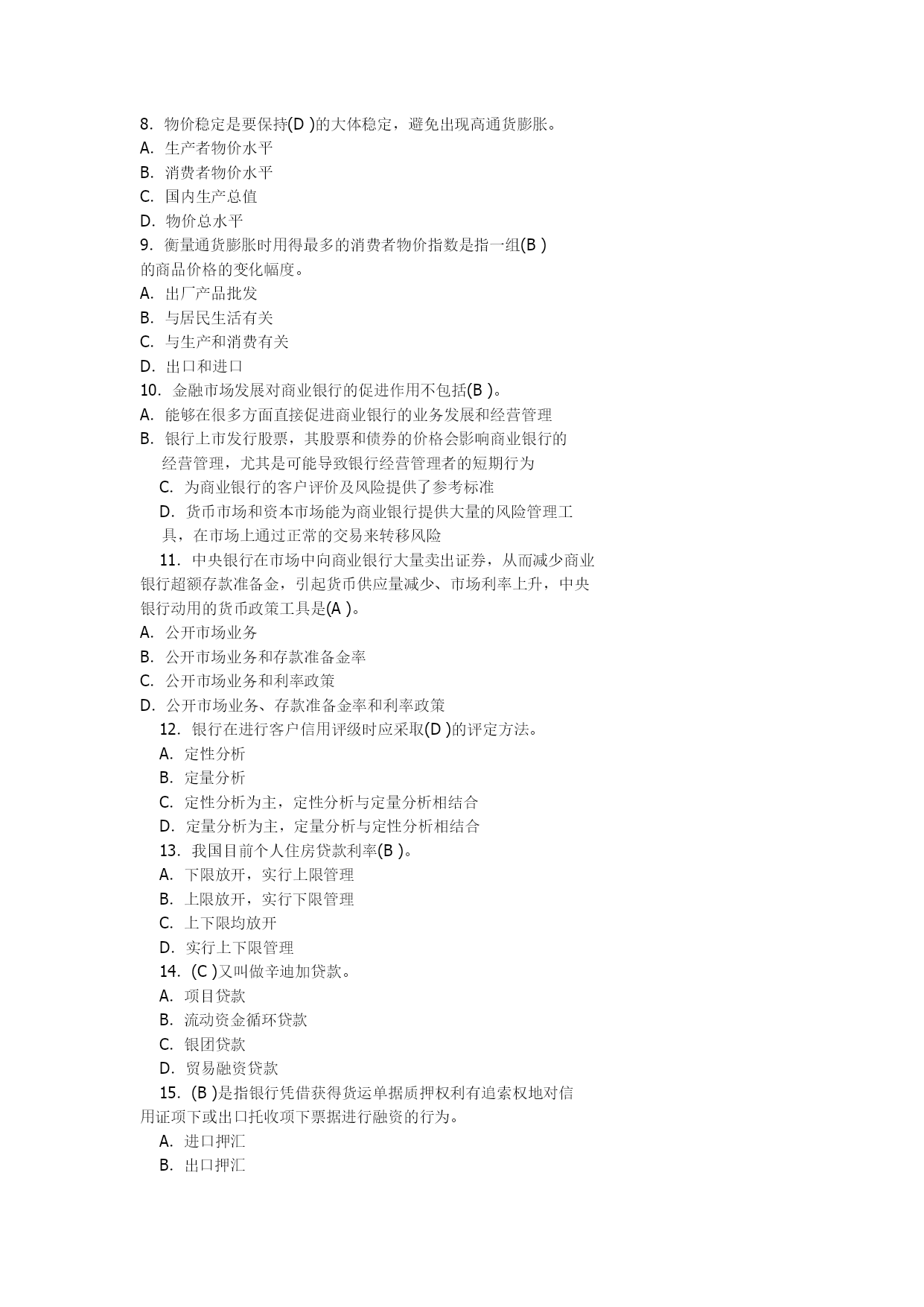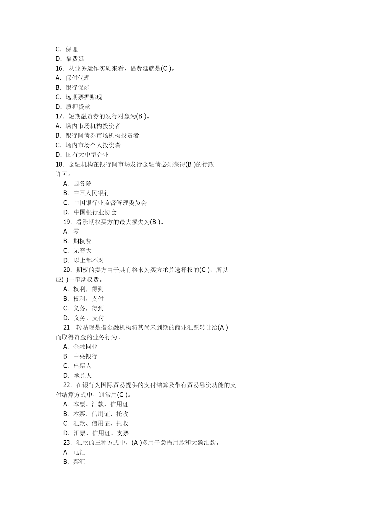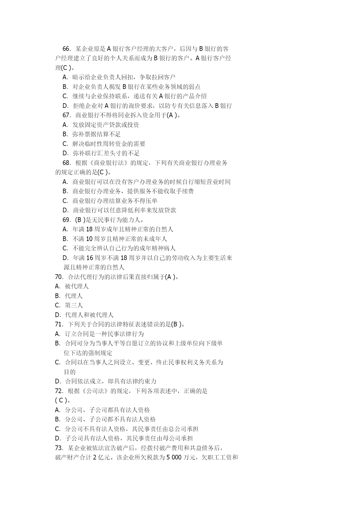 银行从业资格考试公共基础模拟试题(全套有答案)发布日期:2008/4/18:44:21来源:作者:点击:8730-银行从业资格考试公共基础模拟试题(全套有答案)(一)单选题在以下各小题所给出的4个选项中,只有1个选项符合题目要求,请将正确选项的代码填入括号内。1.《商业银行法》规定,商业银行资本充足率(A)。A.不得低于8%B.不得高于8%C.不得低于10%D.不得高于10%2.下列有关商业银行贷款的表述不正确的是(C)。A.商业银行有权拒绝任何单位和个人强令其发放贷款或者提供担保B.商业银行贷款,应当对借款人的借款用途等进行严格审查C.借款人到期未归还担保贷款的,商业银行只能要求保证人归还保证金或该担保物优先受偿,不能要求保证人归还利息D.商业银行不能利用拆入资金发放固定资产贷款或用于投资3.汽车金融公司的监管机构是(B)。A.中国人民银行B.银监会C.中国证监会D.中国银行业协会4.中国银行业协会的会员单位包括(C)。A.中国人民银行B.银监会C.工行、农行、中行、建行、交行D.中央汇金公司5.2007年3月20日,(D)挂牌。A.渤海银行B.张家港市农村商业银行C.上海银行D.中国邮政储蓄银行6.根据《金融租赁公司管理办法》的规定,金融租赁公司以经营(D)业务为主。A.经营租赁B.转租赁C.租赁D.融资租赁7.经济增长是指一个特定时期内一国(或地区)(C)的增长。A.经济产出B.居民收人C.经济产出和居民收入D.经济收入8.物价稳定是要保持(D)的大体稳定,避免出现高通货膨胀。A.生产者物价水平B.消费者物价水平C.国内生产总值D.物价总水平9.衡量通货膨胀时用得最多的消费者物价指数是指一组(B)的商品价格的变化幅度。A.出厂产品批发B.与居民生活有关C.与生产和消费有关D.出口和进口10.金融市场发展对商业银行的促进作用不包括(B)。A.能够在很多方面直接促进商业银行的业务发展和经营管理B.银行上市发行股票,其股票和债券的价格会影响商业银行的经营管理,尤其是可能导致银行经营管理者的短期行为C.为商业银行的客户评价及风险提供了参考标准D.货币市场和资本市场能为商业银行提供大量的风险管理工具,在市场上通过正常的交易来转移风险11.中央银行在市场中向商业银行大量卖出证券,从而减少商业银行超额存款准备金,引起货币供应量减少、市场利率上升,中央银行动用的货币政策工具是(A)。A.公开市场业务B.公开市场业务和存款准备金率C.公开市场业务和利率政策D.公开市场业务、存款准备金率和利率政策12.银行在进行客户信用评级时应采取(D)的评定方法。A.定性分析B.定量分析C.定性分析为主,定性分析与定量分析相结合D.定量分析为主,定量分析与定性分析相结合13.我国目前个人住房贷款利率(B)。A.下限放开,实行上限管理B.上限放开,实行下限管理C.上下限均放开D.实行上下限管理14.(C)又叫做辛迪加贷款。A.项目贷款B.流动资金循环贷款C.银团贷款D.贸易融资贷款15.(B)是指银行凭借获得货运单据质押权利有追索权地对信用证项下或出口托收项下票据进行融资的行为。A.进口押汇B.出口押汇C.保理D.福费廷16.从业务运作实质来看,福费廷就是(C)。A.保付代理B.银行保函C.远期票据贴现D.质押贷款17.短期融资券的发行对象为(B)。A.场内市场机构投资者B.银行间债券市场机构投资者C.场内市场个人投资者D.国有大中型企业18.金融机构在银行间市场发行金融债必须获得(B)的行政许可。A.国务院B.中国人民银行C.中国银行业监督管理委员会D.中国银行业协会19.看涨期权买方的最大损失为(B)。A.零B.期权费C.无穷大D.以上都不对20.期权的卖方由于具有将来为买方承兑选择权的(C),所以应()一笔期权费。A.权利,得到B.权利,支付C.义务,得到D.义务,支付21.转贴现是指金融机构将其尚未到期的商业汇票转让给(A)而取得资金的业务行为。A.金融同业B.中央银行C.出票人D.承兑人22.在银行为国际贸易提供的支付结算及带有贸易融资功能的支付结算方式中,通常用(C)。A.本票、汇款、信用证B.本票、信用证、托收C.汇款、信用证、托收D.汇票、信用证、支票23.汇款的三种方式中,(A)多用于急需用款和大额汇款。A.电汇B.票汇C.信汇D.电汇和信汇24.(A)广泛使用于非贸易结算,或贸易从属费用的收款等。A.光票托收B.跟单托收C.出口托收D.进口托收25.商业银行的代理业务不包括(C)。A.代发工资B.代理财政性存款C.代理财政投资D.代销开放式基金26.关于商业银行基金托管业务,下列说法正确的是(B)。A.所有商业银行都可以开办基金托管业务B.基金管理公司向商业银行支付基金托管费C.基金公司办理有关资金清算、资产估值、会计核算等业务