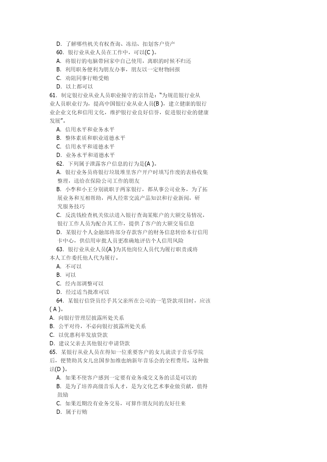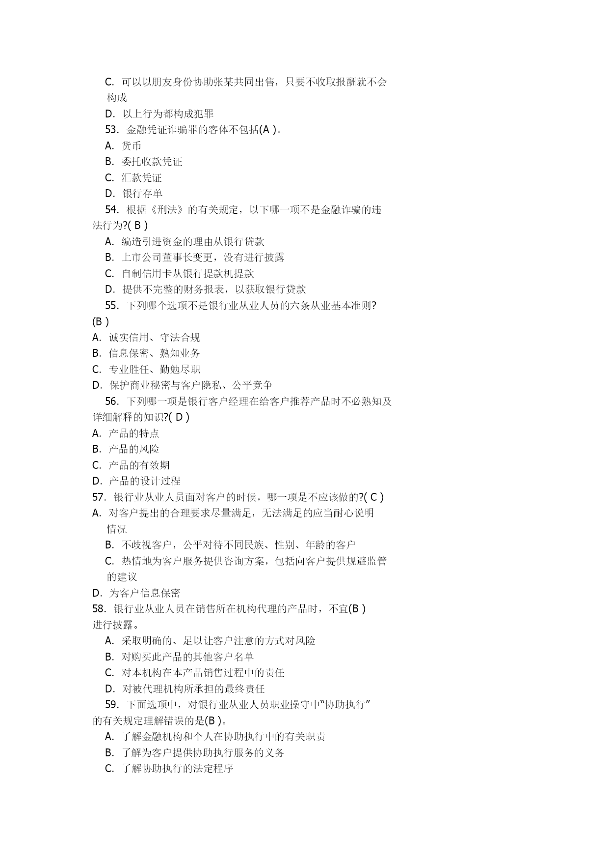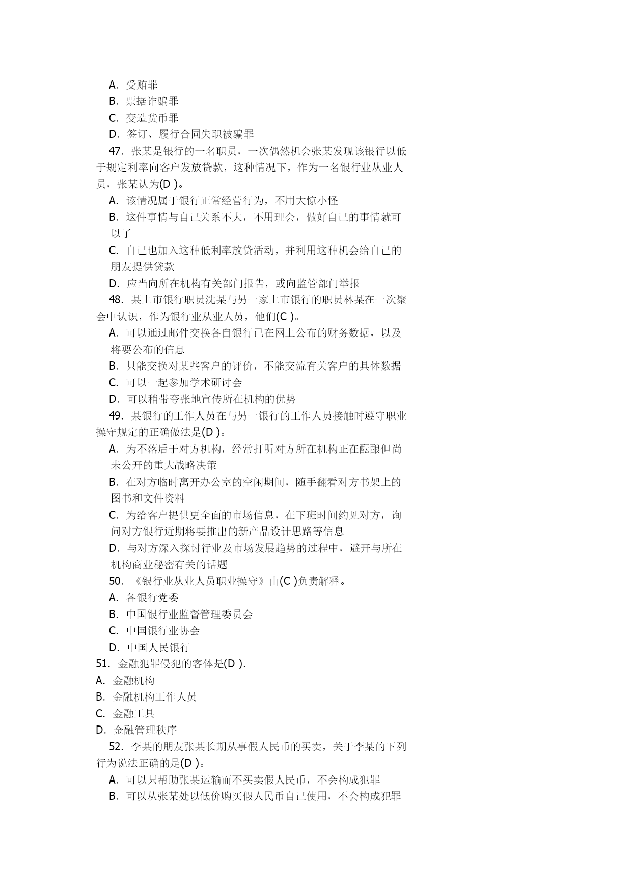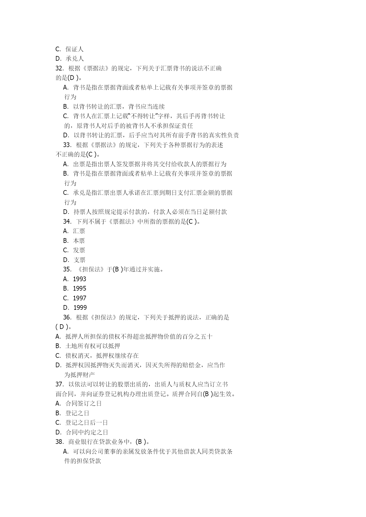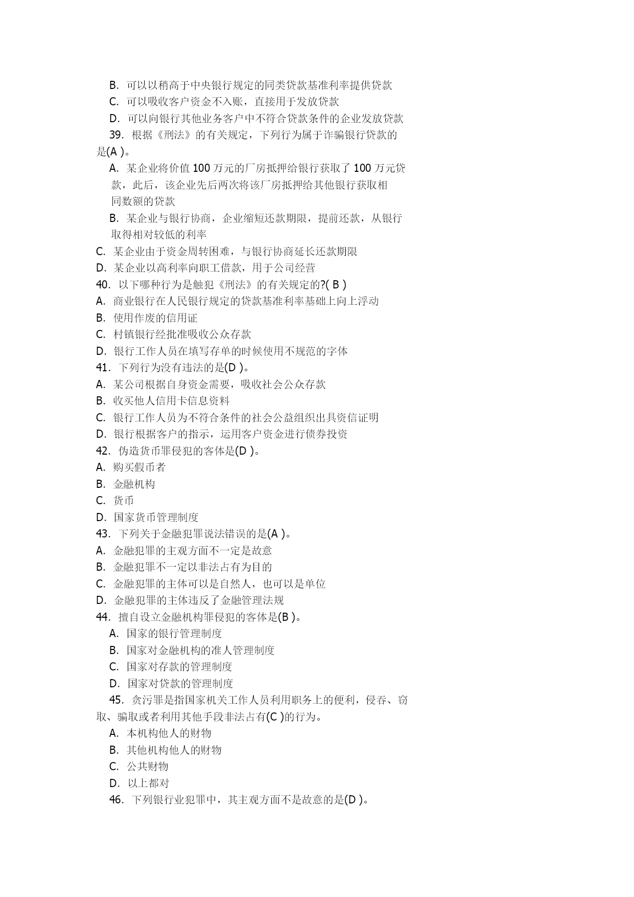 银行从业资格考试公共基础模拟试题(全套有答案)发布日期:2008/4/18:44:21来源:作者:点击:8730-银行从业资格考试公共基础模拟试题(全套有答案)(一)单选题在以下各小题所给出的4个选项中,只有1个选项符合题目要求,请将正确选项的代码填入括号内。1.《商业银行法》规定,商业银行资本充足率(A)。A.不得低于8%B.不得高于8%C.不得低于10%D.不得高于10%2.下列有关商业银行贷款的表述不正确的是(C)。A.商业银行有权拒绝任何单位和个人强令其发放贷款或者提供担保B.商业银行贷款,应当对借款人的借款用途等进行严格审查C.借款人到期未归还担保贷款的,商业银行只能要求保证人归还保证金或该担保物优先受偿,不能要求保证人归还利息D.商业银行不能利用拆入资金发放固定资产贷款或用于投资3.汽车金融公司的监管机构是(B)。A.中国人民银行B.银监会C.中国证监会D.中国银行业协会4.中国银行业协会的会员单位包括(C)。A.中国人民银行B.银监会C.工行、农行、中行、建行、交行D.中央汇金公司5.2007年3月20日,(D)挂牌。A.渤海银行B.张家港市农村商业银行C.上海银行D.中国邮政储蓄银行6.根据《金融租赁公司管理办法》的规定,金融租赁公司以经营(D)业务为主。A.经营租赁B.转租赁C.租赁D.融资租赁7.经济增长是指一个特定时期内一国(或地区)(C)的增长。A.经济产出B.居民收人C.经济产出和居民收入D.经济收入8.物价稳定是要保持(D)的大体稳定,避免出现高通货膨胀。A.生产者物价水平B.消费者物价水平C.国内生产总值D.物价总水平9.衡量通货膨胀时用得最多的消费者物价指数是指一组(B)的商品价格的变化幅度。A.出厂产品批发B.与居民生活有关C.与生产和消费有关D.出口和进口10.金融市场发展对商业银行的促进作用不包括(B)。A.能够在很多方面直接促进商业银行的业务发展和经营管理B.银行上市发行股票,其股票和债券的价格会影响商业银行的经营管理,尤其是可能导致银行经营管理者的短期行为C.为商业银行的客户评价及风险提供了参考标准D.货币市场和资本市场能为商业银行提供大量的风险管理工具,在市场上通过正常的交易来转移风险11.中央银行在市场中向商业银行大量卖出证券,从而减少商业银行超额存款准备金,引起货币供应量减少、市场利率上升,中央银行动用的货币政策工具是(A)。A.公开市场业务B.公开市场业务和存款准备金率C.公开市场业务和利率政策D.公开市场业务、存款准备金率和利率政策12.银行在进行客户信用评级时应采取(D)的评定方法。A.定性分析B.定量分析C.定性分析为主,定性分析与定量分析相结合D.定量分析为主,定量分析与定性分析相结合13.我国目前个人住房贷款利率(B)。A.下限放开,实行上限管理B.上限放开,实行下限管理C.上下限均放开D.实行上下限管理14.(C)又叫做辛迪加贷款。A.项目贷款B.流动资金循环贷款C.银团贷款D.贸易融资贷款15.(B)是指银行凭借获得货运单据质押权利有追索权地对信用证项下或出口托收项下票据进行融资的行为。A.进口押汇B.出口押汇C.保理D.福费廷16.从业务运作实质来看,福费廷就是(C)。A.保付代理B.银行保函C.远期票据贴现D.质押贷款17.短期融资券的发行对象为(B)。A.场内市场机构投资者B.银行间债券市场机构投资者C.场内市场个人投资者D.国有大中型企业18.金融机构在银行间市场发行金融债必须获得(B)的行政许可。A.国务院B.中国人民银行C.中国银行业监督管理委员会D.中国银行业协会19.看涨期权买方的最大损失为(B)。A.零B.期权费C.无穷大D.以上都不对20.期权的卖方由于具有将来为买方承兑选择权的(C),所以应()一笔期权费。A.权利,得到B.权利,支付C.义务,得到D.义务,支付21.转贴现是指金融机构将其尚未到期的商业汇票转让给(A)而取得资金的业务行为。A.金融同业B.中央银行C.出票人D.承兑人22.在银行为国际贸易提供的支付结算及带有贸易融资功能的支付结算方式中,通常用(C)。A.本票、汇款、信用证B.本票、信用证、托收C.汇款、信用证、托收D.汇票、信用证、支票23.汇款的三种方式中,(A)多用于急需用款和大额汇款。A.电汇B.票汇C.信汇D.电汇和信汇24.(A)广泛使用于非贸易结算,或贸易从属费用的收款等。A.光票托收B.跟单托收C.出口托收D.进口托收25.商业银行的代理业务不包括(C)。A.代发工资B.代理财政性存款C.代理财政投资D.代销开放式基金26.关于商业银行基金托管业务,下列说法正确的是(B)。A.所有商业银行都可以开办基金托管业务B.基金管理公司向商业银行支付基金托管费C.基金公司办理有关资金清算、资产估值、会计核算等业务