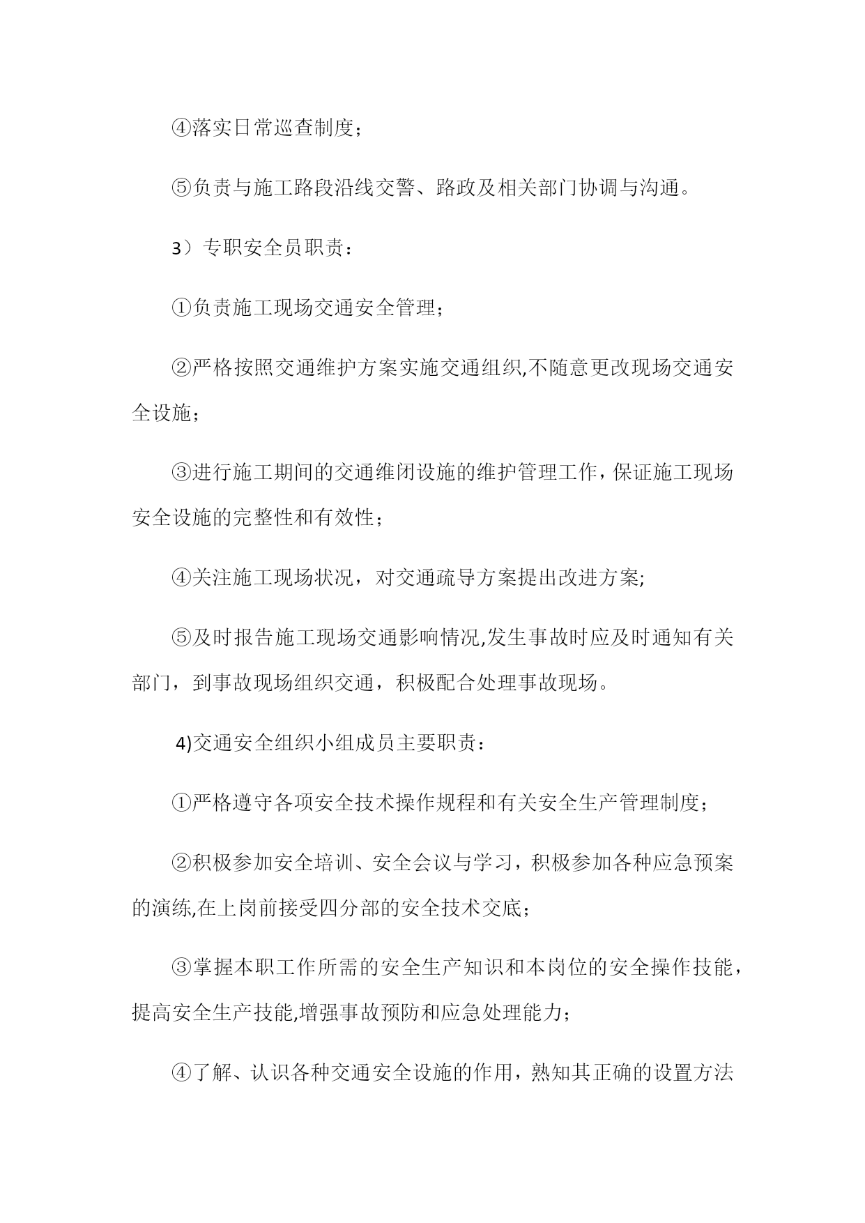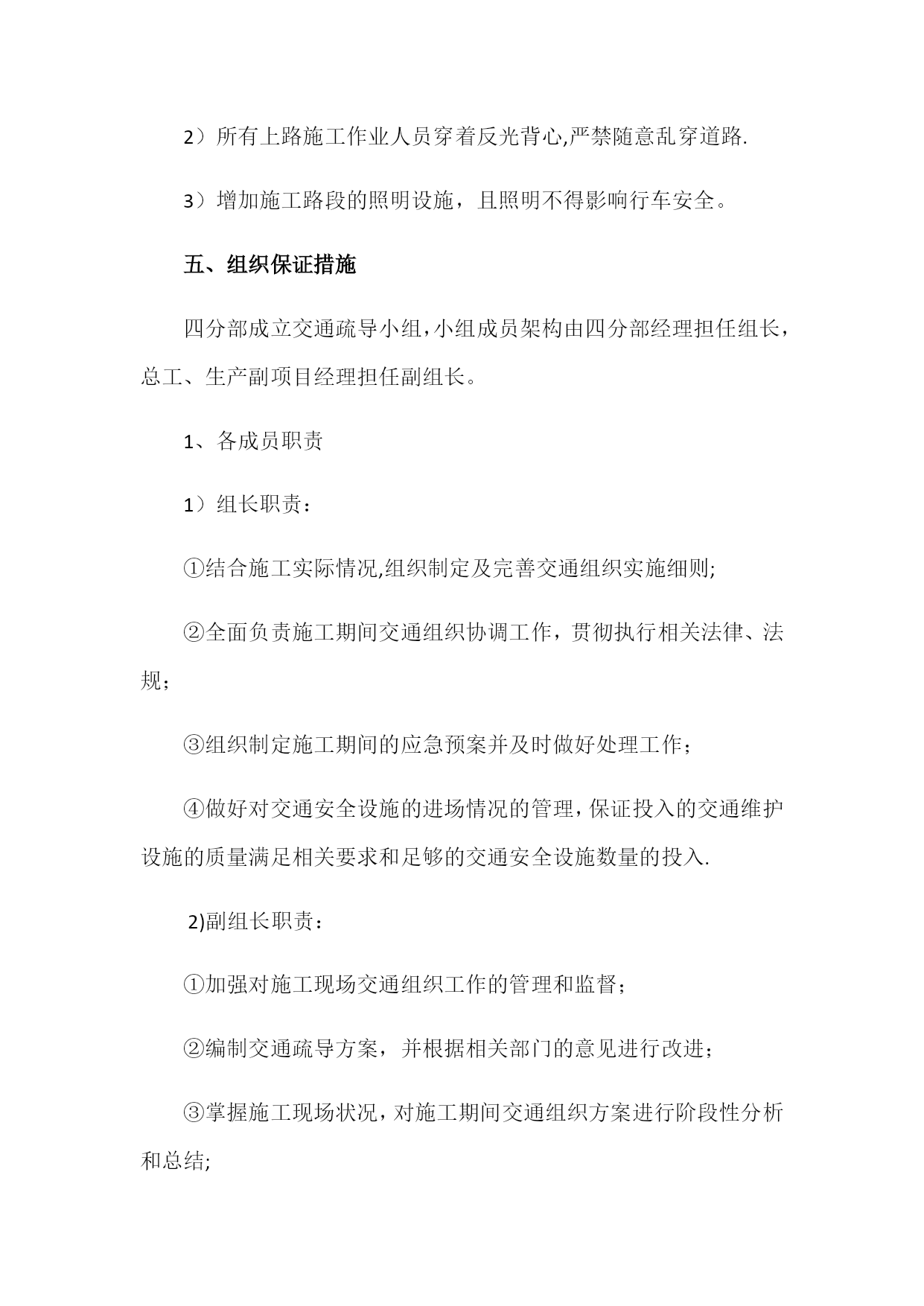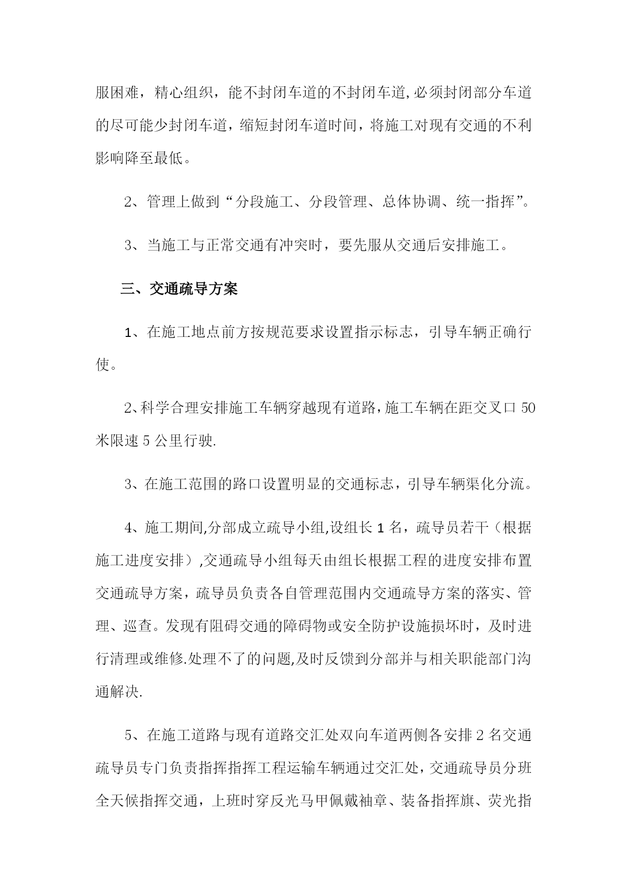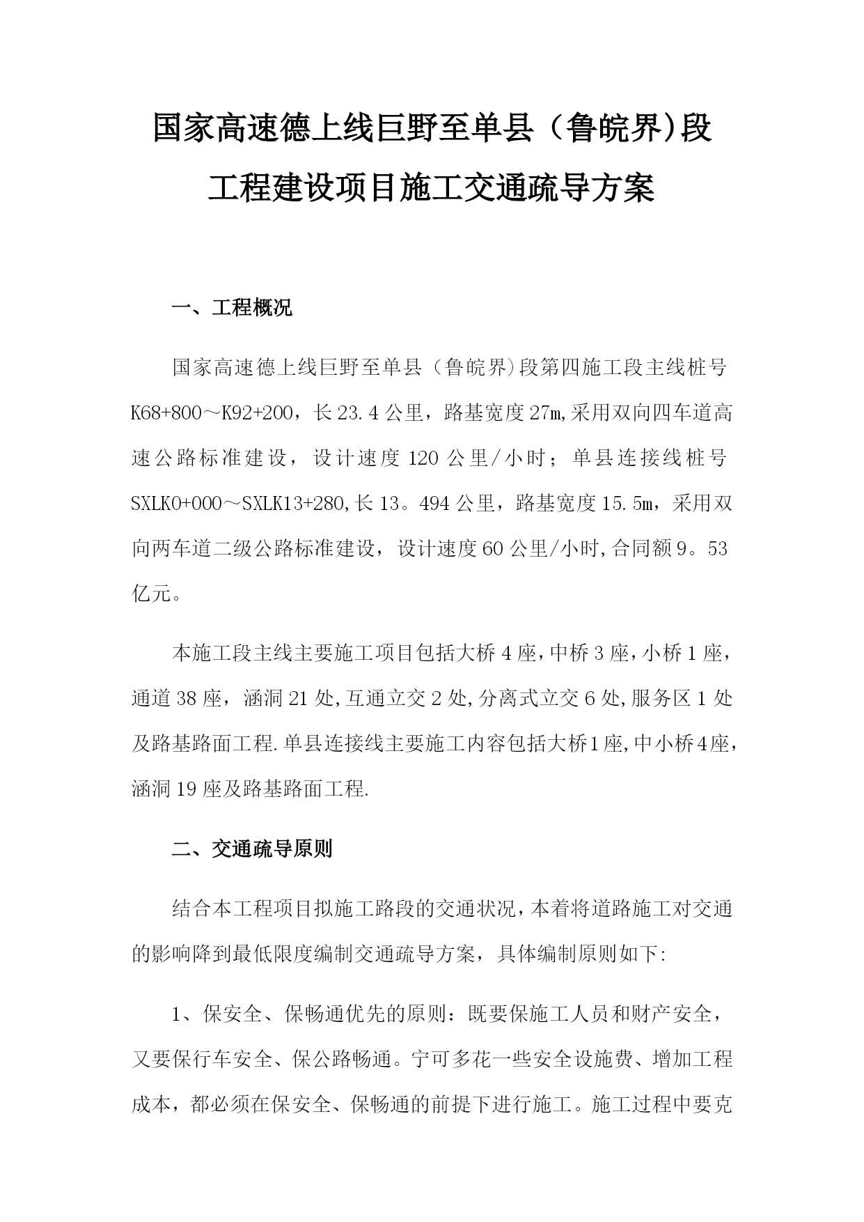 项目施工交通疏导方案实用文档(实用文档,可以直接使用,可编辑优秀版资料,欢迎下载)国家高速德上线巨野至单县(鲁皖界)段工程建设项目施工交通疏导方案一、工程概况国家高速德上线巨野至单县(鲁皖界)段第四施工段主线桩号K68+800~K92+200,长23.4公里,路基宽度27m,采用双向四车道高速公路标准建设,设计速度120公里/小时;单县连接线桩号SXLKO+000~SXLK13+280,长13。494公里,路基宽度15.5m,采用双向两车道二级公路标准建设,设计速度60公里/小时,合同额9。53亿元。本施工段主线主要施工项目包括大桥4座,中桥3座,小桥1座,通道38座,涵洞21处,互通立交2处,分离式立交6处,服务区1处及路基路面工程.单县连接线主要施工内容包括大桥1座,中小桥4座,涵洞19座及路基路面工程.二、交通疏导原则结合本工程项目拟施工路段的交通状况,本着将道路施工对交通的影响降到最低限度编制交通疏导方案,具体编制原则如下:保安全、保畅通优先的原则:既要保施工人员和财产安全,又要保行车安全、保公路畅通。宁可多花一些安全设施费、增加工程成本,都必须在保安全、保畅通的前提下进行施工。施工过程中要克服困难,精心组织,能不封闭车道的不封闭车道,必须封闭部分车道的尽可能少封闭车道,缩短封闭车道时间,将施工对现有交通的不利影响降至最低。管理上做到“分段施工、分段管理、总体协调、统一指挥”。3、当施工与正常交通有冲突时,要先服从交通后安排施工。三、交通疏导方案1、在施工地点前方按规范要求设置指示标志,引导车辆正确行使。2、科学合理安排施工车辆穿越现有道路,施工车辆在距交叉口50米限速5公里行驶.3、在施工范围的路口设置明显的交通标志,引导车辆渠化分流。4、施工期间,分部成立疏导小组,设组长1名,疏导员若干(根据施工进度安排),交通疏导小组每天由组长根据工程的进度安排布置交通疏导方案,疏导员负责各自管理范围内交通疏导方案的落实、管理、巡查。发现有阻碍交通的障碍物或安全防护设施损坏时,及时进行清理或维修.处理不了的问题,及时反馈到分部并与相关职能部门沟通解决.5、在施工道路与现有道路交汇处双向车道两侧各安排2名交通疏导员专门负责指挥指挥工程运输车辆通过交汇处,交通疏导员分班全天候指挥交通,上班时穿反光马甲佩戴袖章、装备指挥旗、荧光指挥棒等,按交通指示牌和交警部门批准的疏导方案指挥车辆行使.施工现场合理地安排车辆进出便道,工程车严格按指示和指挥行使,礼让其他车辆.四、交通保证措施1、防止非施工车辆和人员进入施工现场,在施工区前来车方向设置警示标志及警示灯,以策安全。2、在每个施工道路与现有道路交汇处设置告示牌,提醒社会车辆司机前方施工,减速慢行。3、在车流量较大的国道、省道与施工道路交汇处的来车方向,分别设置三条减速带。4、拆掉的中央隔离带在施工车辆不通行时进行封闭,以防止在国道及省道上通行的车辆在此掉头或行人乱穿马路而发生交通事故,采用反光水马围挡进行封闭。5、加强的施工车辆驾驶员的教育和培训力度,定期组织驾驶员学习.6、夜间施工保证措施:1)夜间施工前检查交通安全设施的设置情况,增加爆闪灯等夜间施工交通设施,对不完善的设施及时进行补增,并在车辆交汇处增加交通疏导、警示人员。2)所有上路施工作业人员穿着反光背心,严禁随意乱穿道路.3)增加施工路段的照明设施,且照明不得影响行车安全。五、组织保证措施四分部成立交通疏导小组,小组成员架构由四分部经理担任组长,总工、生产副项目经理担任副组长。1、各成员职责1)组长职责:①结合施工实际情况,组织制定及完善交通组织实施细则;②全面负责施工期间交通组织协调工作,贯彻执行相关法律、法规;③组织制定施工期间的应急预案并及时做好处理工作;④做好对交通安全设施的进场情况的管理,保证投入的交通维护设施的质量满足相关要求和足够的交通安全设施数量的投入.2)副组长职责:①加强对施工现场交通组织工作的管理和监督;②编制交通疏导方案,并根据相关部门的意见进行改进;③掌握施工现场状况,对施工期间交通组织方案进行阶段性分析和总结;④落实日常巡查制度;⑤负责与施工路段沿线交警、路政及相关部门协调与沟通。3)专职安全员职责:①负责施工现场交通安全管理;②严格按照交通维护方案实施交通组织,不随意更改现场交通安全设施;③进行施工期间的交通维闭设施的维护管理工作,保证施工现场安全设施的完整性和有效性;④关注施工现场状况,对交通疏导方案提出改进方案;⑤及时报告施工现场交通影响情况,发生事故时应及时通知有关部门,到事故现场组织交通,积极配合处理事故现场。4)交通安全组织小组成员主要职责:①严格遵守各项安全技术操作规程和有关安全生产管理制