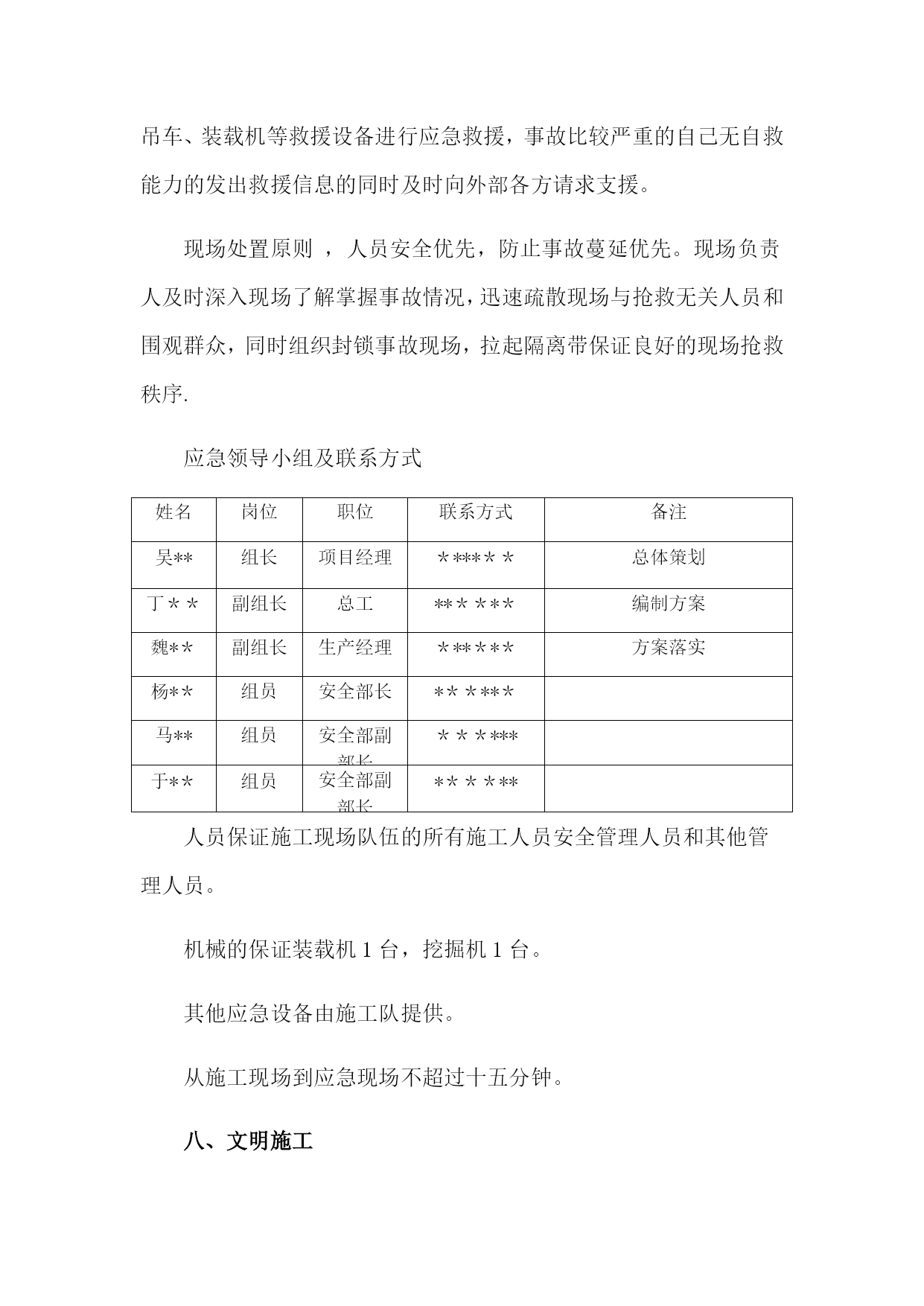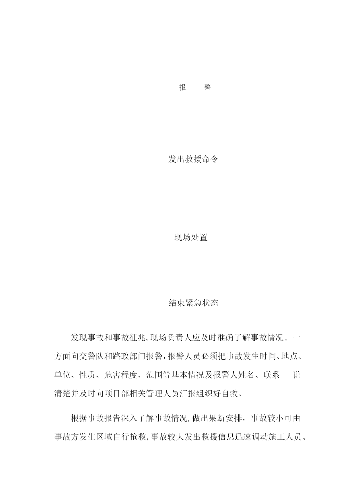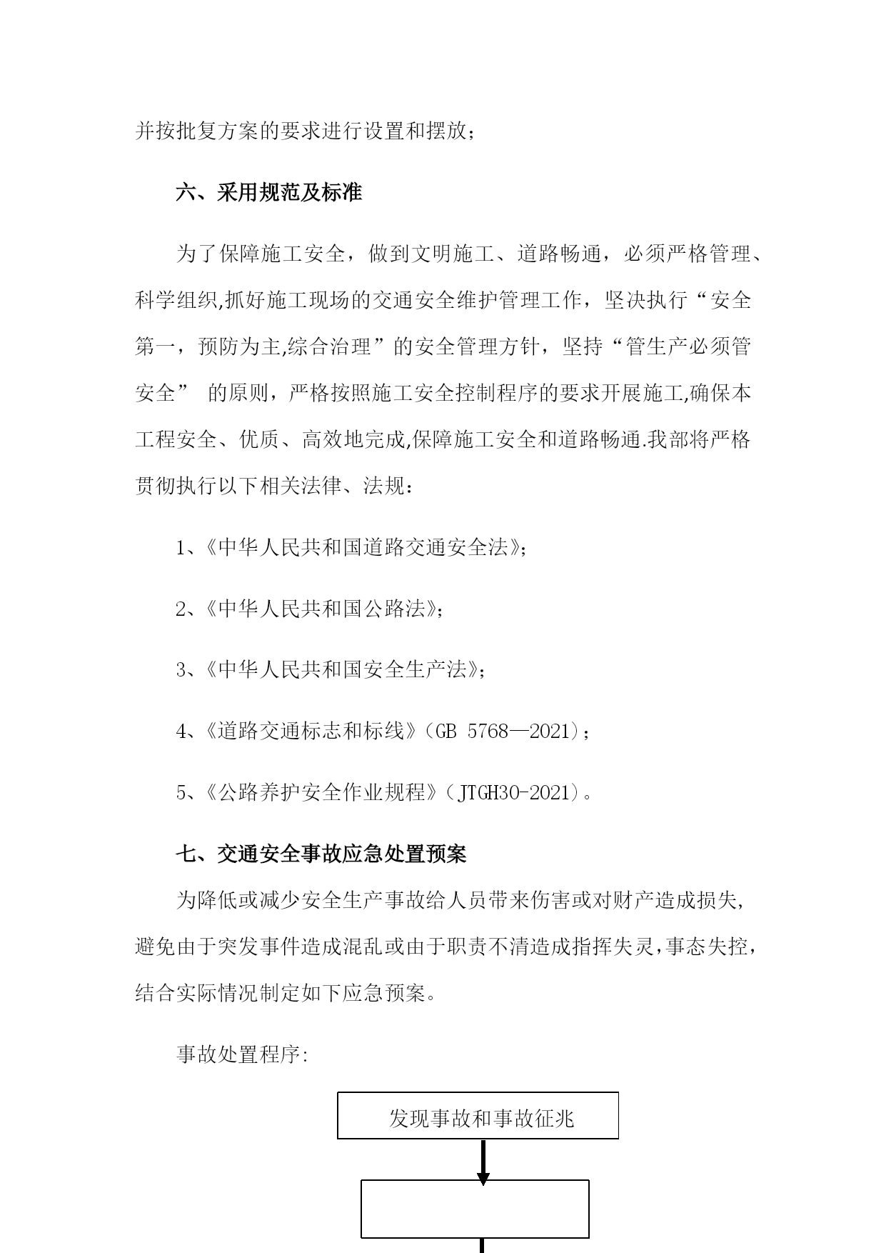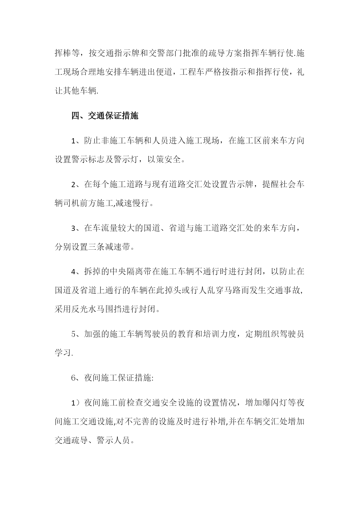 项目施工交通疏导方案实用文档(实用文档,可以直接使用,可编辑优秀版资料,欢迎下载)国家高速德上线巨野至单县(鲁皖界)段工程建设项目施工交通疏导方案一、工程概况国家高速德上线巨野至单县(鲁皖界)段第四施工段主线桩号K68+800~K92+200,长23.4公里,路基宽度27m,采用双向四车道高速公路标准建设,设计速度120公里/小时;单县连接线桩号SXLKO+000~SXLK13+280,长13。494公里,路基宽度15.5m,采用双向两车道二级公路标准建设,设计速度60公里/小时,合同额9。53亿元。本施工段主线主要施工项目包括大桥4座,中桥3座,小桥1座,通道38座,涵洞21处,互通立交2处,分离式立交6处,服务区1处及路基路面工程.单县连接线主要施工内容包括大桥1座,中小桥4座,涵洞19座及路基路面工程.二、交通疏导原则结合本工程项目拟施工路段的交通状况,本着将道路施工对交通的影响降到最低限度编制交通疏导方案,具体编制原则如下:保安全、保畅通优先的原则:既要保施工人员和财产安全,又要保行车安全、保公路畅通。宁可多花一些安全设施费、增加工程成本,都必须在保安全、保畅通的前提下进行施工。施工过程中要克服困难,精心组织,能不封闭车道的不封闭车道,必须封闭部分车道的尽可能少封闭车道,缩短封闭车道时间,将施工对现有交通的不利影响降至最低。管理上做到“分段施工、分段管理、总体协调、统一指挥”。3、当施工与正常交通有冲突时,要先服从交通后安排施工。三、交通疏导方案1、在施工地点前方按规范要求设置指示标志,引导车辆正确行使。2、科学合理安排施工车辆穿越现有道路,施工车辆在距交叉口50米限速5公里行驶.3、在施工范围的路口设置明显的交通标志,引导车辆渠化分流。4、施工期间,分部成立疏导小组,设组长1名,疏导员若干(根据施工进度安排),交通疏导小组每天由组长根据工程的进度安排布置交通疏导方案,疏导员负责各自管理范围内交通疏导方案的落实、管理、巡查。发现有阻碍交通的障碍物或安全防护设施损坏时,及时进行清理或维修.处理不了的问题,及时反馈到分部并与相关职能部门沟通解决.5、在施工道路与现有道路交汇处双向车道两侧各安排2名交通疏导员专门负责指挥指挥工程运输车辆通过交汇处,交通疏导员分班全天候指挥交通,上班时穿反光马甲佩戴袖章、装备指挥旗、荧光指挥棒等,按交通指示牌和交警部门批准的疏导方案指挥车辆行使.施工现场合理地安排车辆进出便道,工程车严格按指示和指挥行使,礼让其他车辆.四、交通保证措施1、防止非施工车辆和人员进入施工现场,在施工区前来车方向设置警示标志及警示灯,以策安全。2、在每个施工道路与现有道路交汇处设置告示牌,提醒社会车辆司机前方施工,减速慢行。3、在车流量较大的国道、省道与施工道路交汇处的来车方向,分别设置三条减速带。4、拆掉的中央隔离带在施工车辆不通行时进行封闭,以防止在国道及省道上通行的车辆在此掉头或行人乱穿马路而发生交通事故,采用反光水马围挡进行封闭。5、加强的施工车辆驾驶员的教育和培训力度,定期组织驾驶员学习.6、夜间施工保证措施:1)夜间施工前检查交通安全设施的设置情况,增加爆闪灯等夜间施工交通设施,对不完善的设施及时进行补增,并在车辆交汇处增加交通疏导、警示人员。2)所有上路施工作业人员穿着反光背心,严禁随意乱穿道路.3)增加施工路段的照明设施,且照明不得影响行车安全。五、组织保证措施四分部成立交通疏导小组,小组成员架构由四分部经理担任组长,总工、生产副项目经理担任副组长。1、各成员职责1)组长职责:①结合施工实际情况,组织制定及完善交通组织实施细则;②全面负责施工期间交通组织协调工作,贯彻执行相关法律、法规;③组织制定施工期间的应急预案并及时做好处理工作;④做好对交通安全设施的进场情况的管理,保证投入的交通维护设施的质量满足相关要求和足够的交通安全设施数量的投入.2)副组长职责:①加强对施工现场交通组织工作的管理和监督;②编制交通疏导方案,并根据相关部门的意见进行改进;③掌握施工现场状况,对施工期间交通组织方案进行阶段性分析和总结;④落实日常巡查制度;⑤负责与施工路段沿线交警、路政及相关部门协调与沟通。3)专职安全员职责:①负责施工现场交通安全管理;②严格按照交通维护方案实施交通组织,不随意更改现场交通安全设施;③进行施工期间的交通维闭设施的维护管理工作,保证施工现场安全设施的完整性和有效性;④关注施工现场状况,对交通疏导方案提出改进方案;⑤及时报告施工现场交通影响情况,发生事故时应及时通知有关部门,到事故现场组织交通,积极配合处理事故现场。4)交通安全组织小组成员主要职责:①严格遵守各项安全技术操作规程和有关安全生产管理制