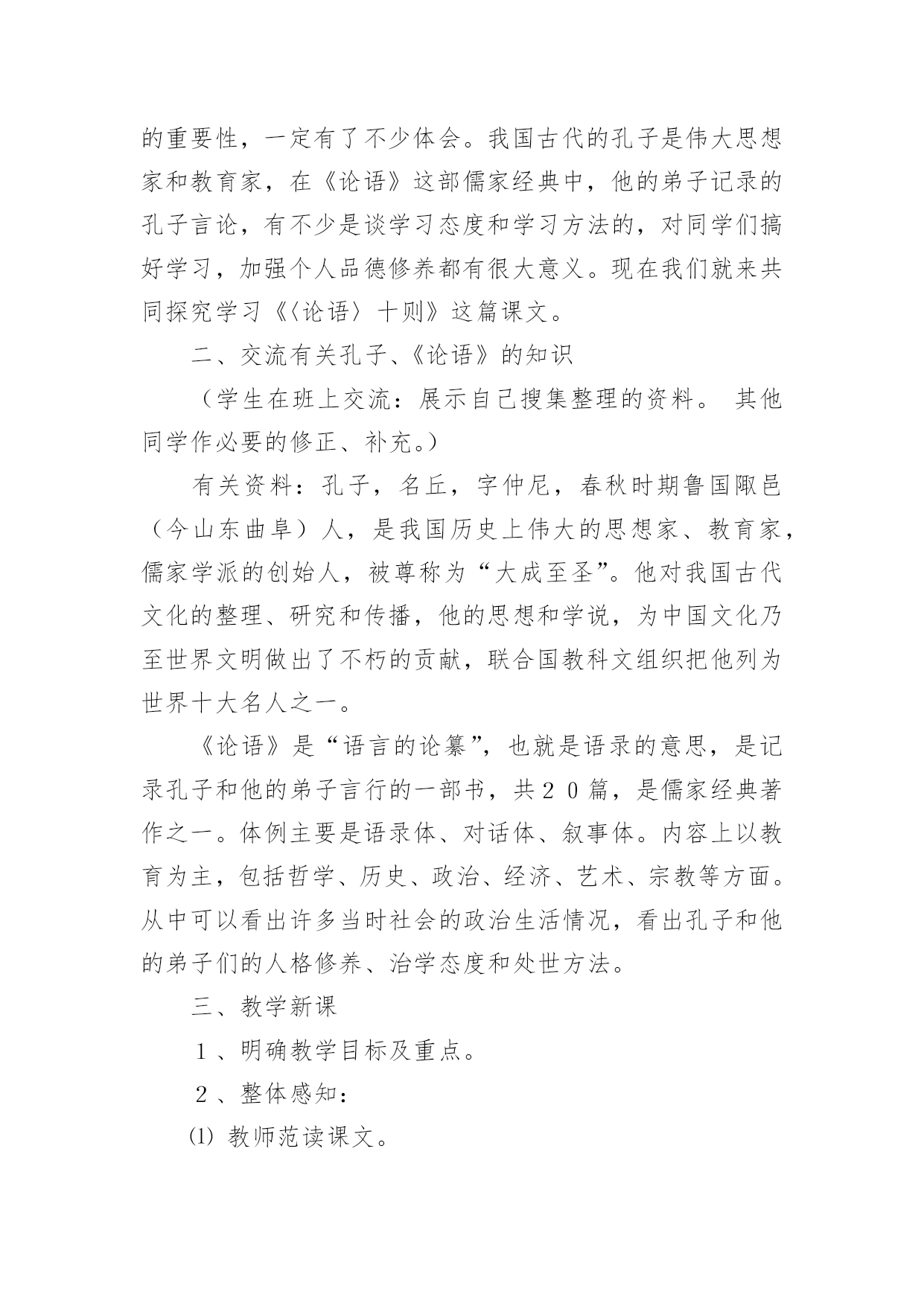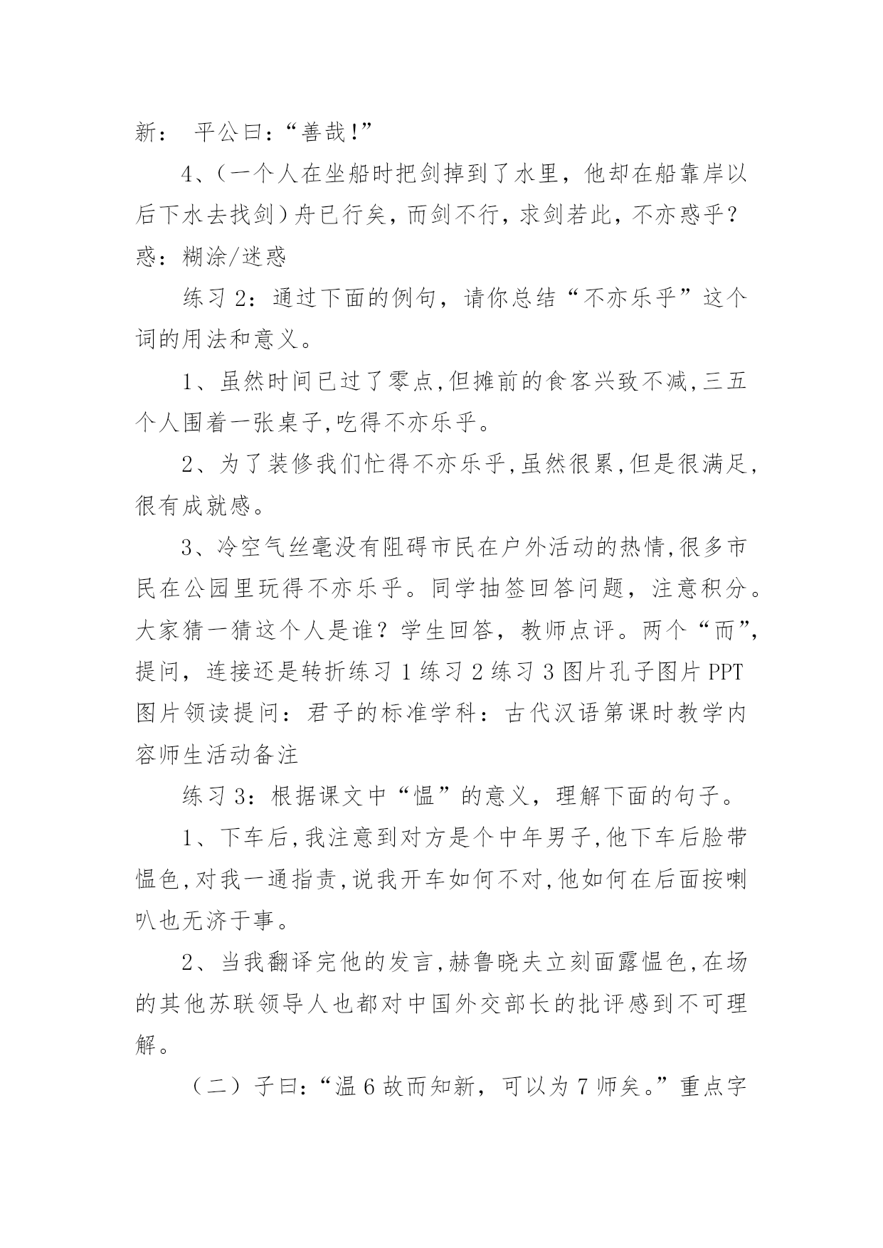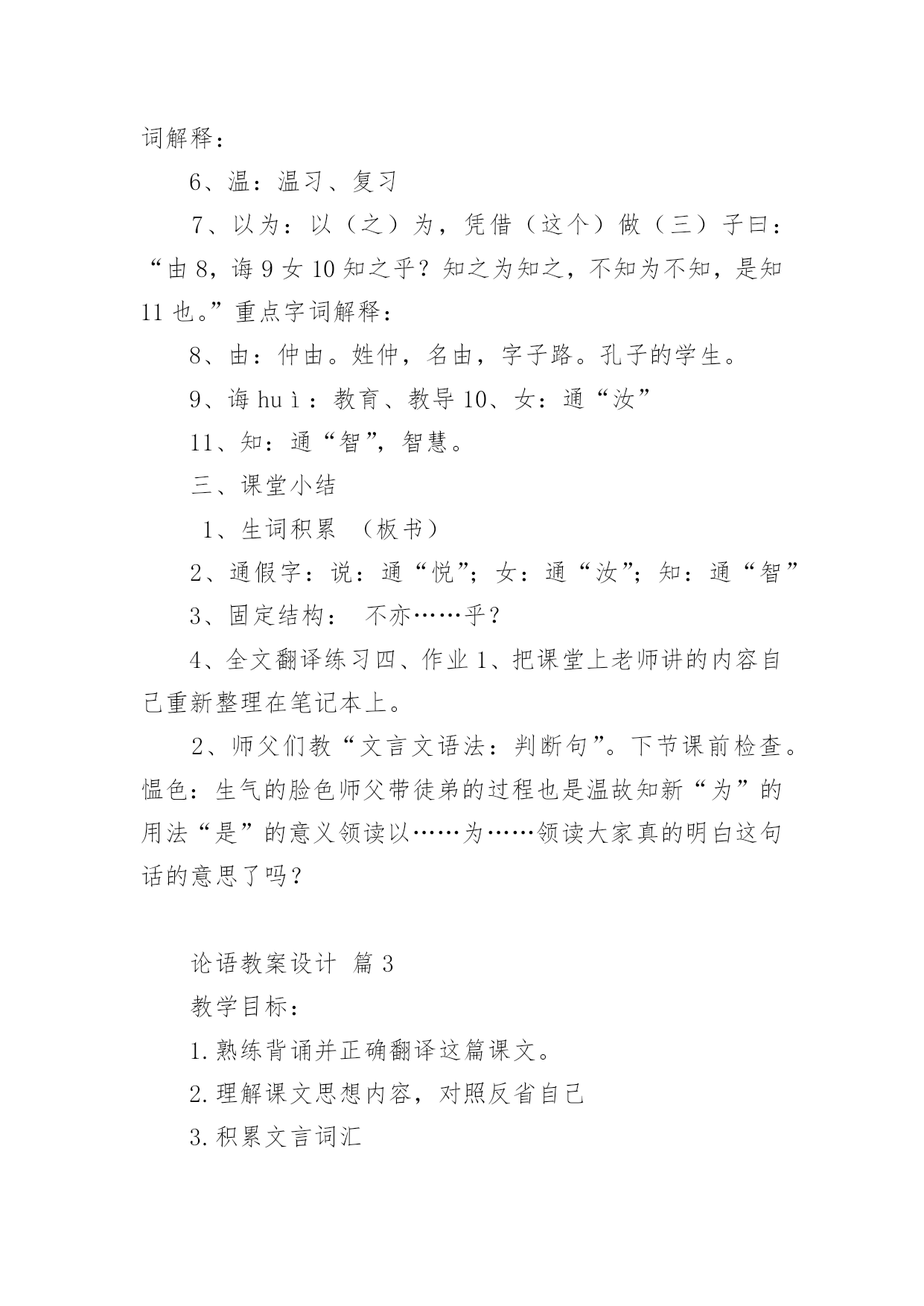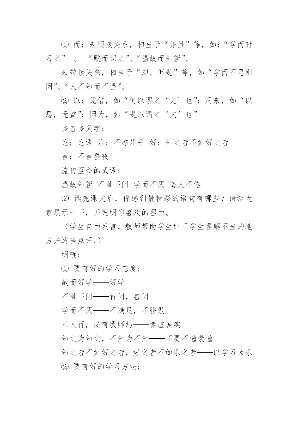 论语教案设计作为一名教职工,常常要写一份优秀的教案,借助教案可以让教学工作更科学化。那么优秀的教案是什么样的呢?下面是小编精心整理的论语教案设计,供大家参考借鉴,希望可以帮助到有需要的朋友。论语教案设计篇1【教学目标及重点】1、积累文言词汇。2、背诵、翻译、理解课文内容。3、培养勤学好问、永不满足的学习态度,掌握良好的学习方法。【教学课型及课时】1、教读课。2、一课时。【教学步骤】一、导入新课中国是一个有着五千年文明史的礼仪之邦,在它源远流长的历史长河中,曾出现过不少光耀千古的文化巨人,为我们留下了极宝贵的文化遗产,如《论语》、《老子》、《孟子》、《庄子》、《荀子》等。这些著述对中华文化曾产生过深远影响,直至今天,仍光芒四射。我们同学们进入中小学学习已经七年了,关于建立正确的学习态度和运用正确的学习方法的重要性,一定有了不少体会。我国古代的孔子是伟大思想家和教育家,在《论语》这部儒家经典中,他的弟子记录的孔子言论,有不少是谈学习态度和学习方法的,对同学们搞好学习,加强个人品德修养都有很大意义。现在我们就来共同探究学习《〈论语〉十则》这篇课文。二、交流有关孔子、《论语》的知识(学生在班上交流:展示自己搜集整理的资料。其他同学作必要的修正、补充。)有关资料:孔子,名丘,字仲尼,春秋时期鲁国陬邑(今山东曲阜)人,是我国历史上伟大的思想家、教育家,儒家学派的创始人,被尊称为“大成至圣”。他对我国古代文化的整理、研究和传播,他的思想和学说,为中国文化乃至世界文明做出了不朽的贡献,联合国教科文组织把他列为世界十大名人之一。《论语》是“语言的论纂”,也就是语录的意思,是记录孔子和他的弟子言行的一部书,共20篇,是儒家经典著作之一。体例主要是语录体、对话体、叙事体。内容上以教育为主,包括哲学、历史、政治、经济、艺术、宗教等方面。从中可以看出许多当时社会的政治生活情况,看出孔子和他的弟子们的人格修养、治学态度和处世方法。三、教学新课1、明确教学目标及重点。2、整体感知:⑴教师范读课文。⑵布置学生划出自己感到最精彩的语句。3、重点学习与训练:⑴教师导学:学习文言文,首先要掌握和积累一定量的.文言词汇。文言文中的基本词汇大多与现代汉语意义相同,这好理解。但有些词,古今意义发生变化。如成语“走马观花”中的“走”是“跑”的意思,如果理解为“行走”,这个成语就讲不通了。再如“赴汤蹈火”中的“汤”是“热水”的意思。这些都与现代汉语完全不同。学习文言文要特别注意这些变义词。另外,一些文言虚词,如“之”、“乎”、“者”、“也”之类,意思比较宽泛,在不同的语言环境里,它的意思可能不同。这就需要联系上下文,正确理解。先仔细读几遍课文,理解各句中重点词语的意思。如果开始不理解懂,试着再读几遍。实在理解不了的,将问题提出来。(学生朗读课文并提出不理解的字词。教师帮助学生解决。)明确:学生重点掌握的文言字词:通假字:①不亦说乎:通假字“说”,本字“悦”,愉快。②由,诲女知之乎:通假字“女”,本字“汝”,你。③是知也:通假字“知”,本字“智”,聪明,智慧。多义词:①而:表顺接关系,相当于“并且”等,如:“学而时习之”、“默而识之”、“温故而知新”。表转接关系,相当于“却、但是”等,如“学而不思则罔”、“人不知而不愠”。②以:凭借,如“何以谓之‘文’也”;用来,如“以思,无益”;因为,如“是以谓之‘文’也”多音多义字:论:论语乐:不亦乐乎好:知之者不如好之者舍:不舍昼夜流传至今的成语:温故知新不耻下问学而不厌诲人不倦⑵读完课文后,你感到最精彩的语句有哪些?请给大家展示一下,并说明你喜欢的理由。(学生自由发言,教师帮助学生纠正学生理解不当的地方并适当点评。)明确:①要有好的学习态度:敏而好学──好学不耻下问──肯问,善问学而不厌──不满足,不骄傲三人行,必有我师焉──谦虚诚实知之为知之,不知为不知──不要不懂装懂知之者不如好之者,好之者不如乐之者──以学习为乐②要有好的学习方法:学而时习之──按时复习温故而知新──总结复习,发现新知学而不思则罔,思而不学则殆──学思结合默而识之──不断积累以思,无益,不如学──学习与实践相结合要珍惜时间──逝者如斯夫③学了这篇课文,你认为哪些内容使你收获最大?谈谈感想。(让学生自由谈。)④与课文自相对照,谈谈自己在哪些方面做得好些,在哪些方面还有欠缺?应怎样改进?⑤“温故而知新”对于指导我们的学习有什么重要意义?4、结束语:《论语》的思想内容博大精深,我国古代有“半部《论语》治天下”之说。我们学的这一部分主要谈的是求知和修养问题。大家不仅要懂得它的意思,更重要的是联系实际,指导自己的言行。今后我们要多接触一点文言文,了解我们民族的历史,继承祖国的文化,陶冶自己的情操。现代社会一方面经济飞速发展,另一方面传统美德亟待发扬。现代著名新儒学大师