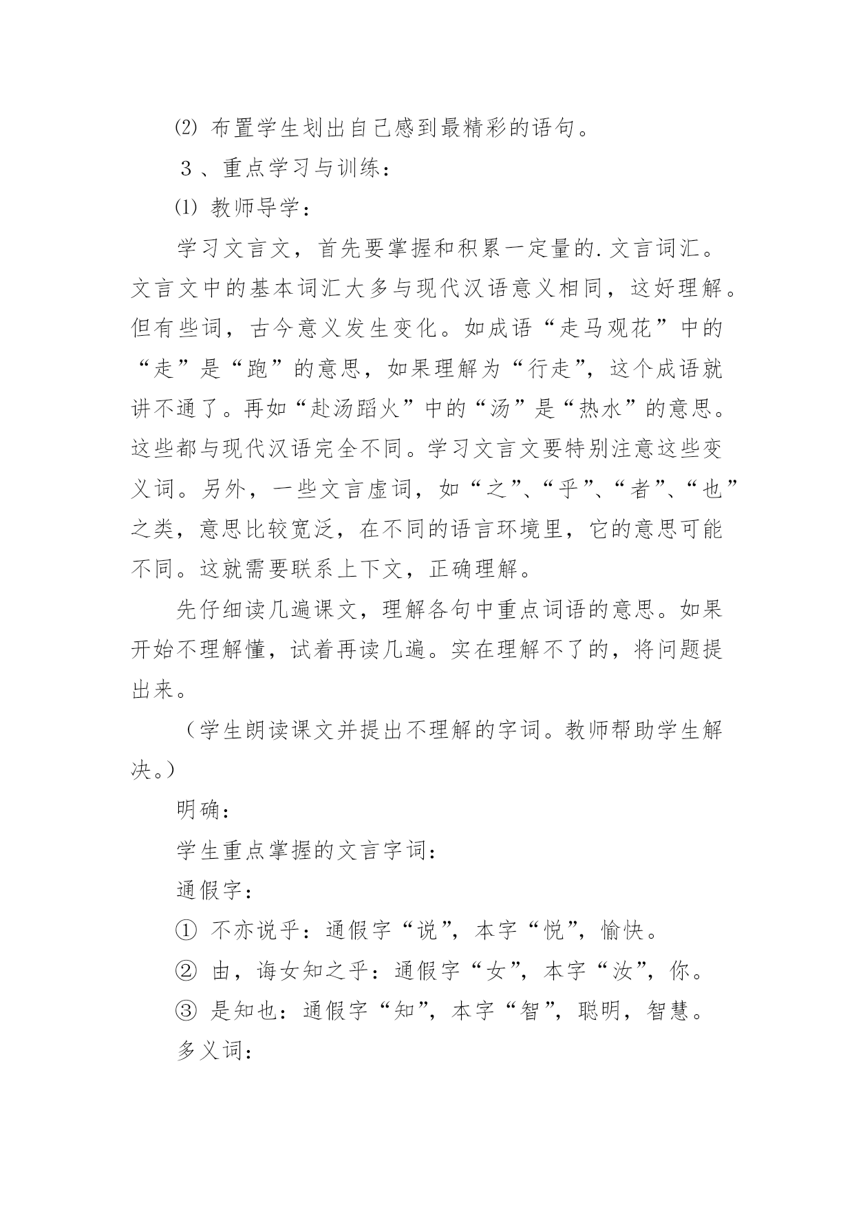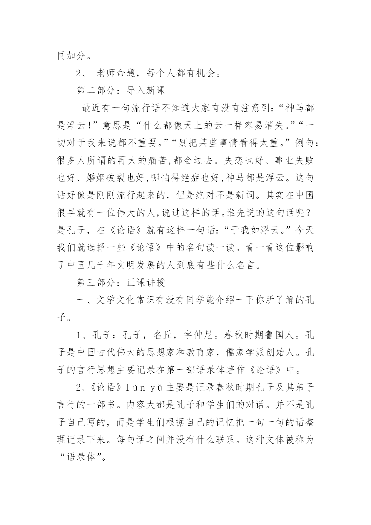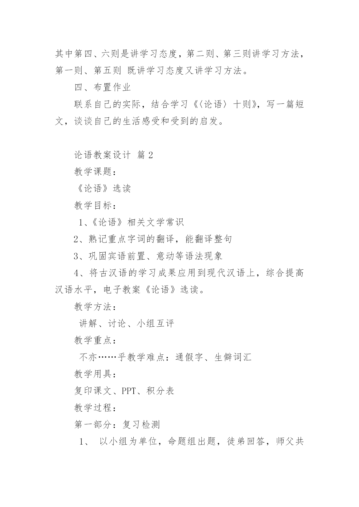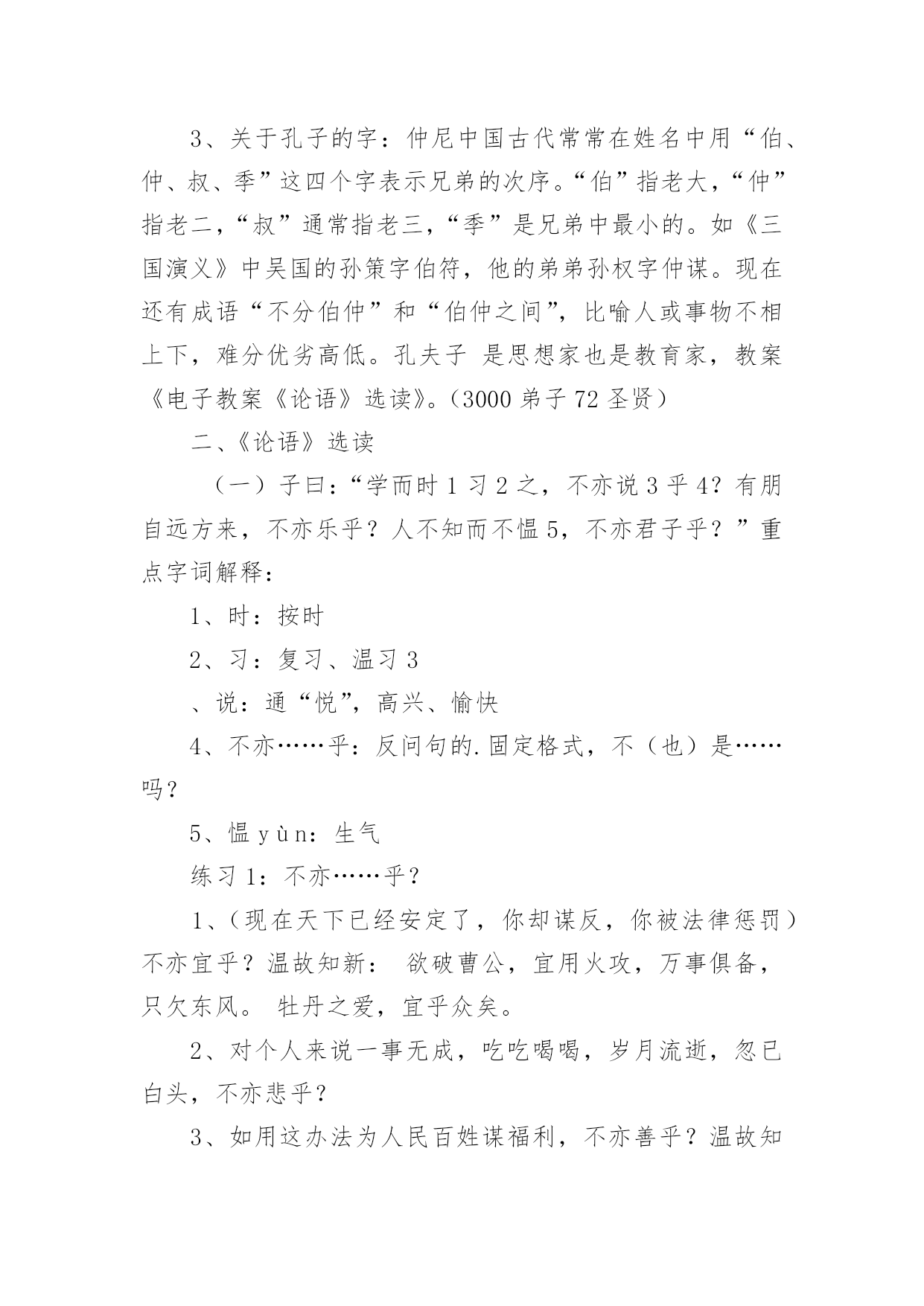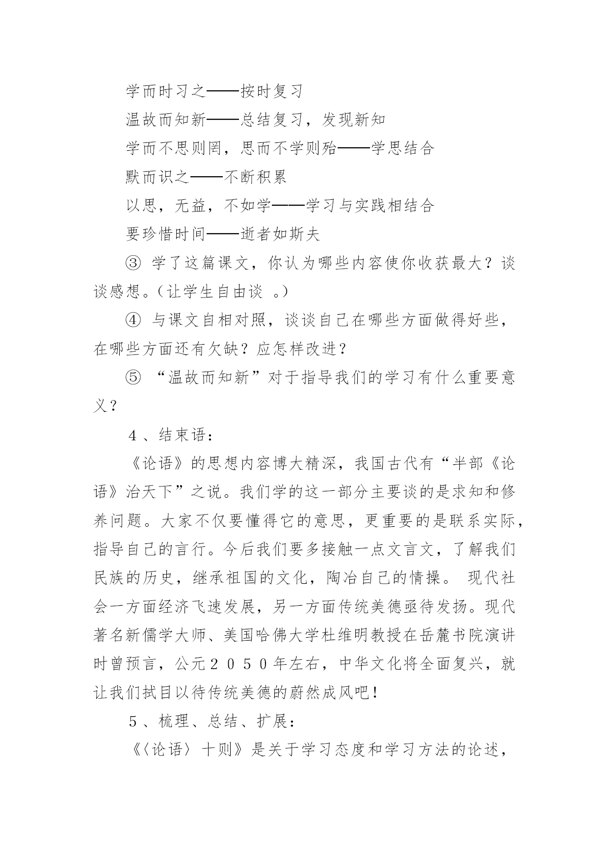 论语教案设计作为一名教职工,常常要写一份优秀的教案,借助教案可以让教学工作更科学化。那么优秀的教案是什么样的呢?下面是小编精心整理的论语教案设计,供大家参考借鉴,希望可以帮助到有需要的朋友。论语教案设计篇1【教学目标及重点】1、积累文言词汇。2、背诵、翻译、理解课文内容。3、培养勤学好问、永不满足的学习态度,掌握良好的学习方法。【教学课型及课时】1、教读课。2、一课时。【教学步骤】一、导入新课中国是一个有着五千年文明史的礼仪之邦,在它源远流长的历史长河中,曾出现过不少光耀千古的文化巨人,为我们留下了极宝贵的文化遗产,如《论语》、《老子》、《孟子》、《庄子》、《荀子》等。这些著述对中华文化曾产生过深远影响,直至今天,仍光芒四射。我们同学们进入中小学学习已经七年了,关于建立正确的学习态度和运用正确的学习方法的重要性,一定有了不少体会。我国古代的孔子是伟大思想家和教育家,在《论语》这部儒家经典中,他的弟子记录的孔子言论,有不少是谈学习态度和学习方法的,对同学们搞好学习,加强个人品德修养都有很大意义。现在我们就来共同探究学习《〈论语〉十则》这篇课文。二、交流有关孔子、《论语》的知识(学生在班上交流:展示自己搜集整理的资料。其他同学作必要的修正、补充。)有关资料:孔子,名丘,字仲尼,春秋时期鲁国陬邑(今山东曲阜)人,是我国历史上伟大的思想家、教育家,儒家学派的创始人,被尊称为“大成至圣”。他对我国古代文化的整理、研究和传播,他的思想和学说,为中国文化乃至世界文明做出了不朽的贡献,联合国教科文组织把他列为世界十大名人之一。《论语》是“语言的论纂”,也就是语录的意思,是记录孔子和他的弟子言行的一部书,共20篇,是儒家经典著作之一。体例主要是语录体、对话体、叙事体。内容上以教育为主,包括哲学、历史、政治、经济、艺术、宗教等方面。从中可以看出许多当时社会的政治生活情况,看出孔子和他的弟子们的人格修养、治学态度和处世方法。三、教学新课1、明确教学目标及重点。2、整体感知:⑴教师范读课文。⑵布置学生划出自己感到最精彩的语句。3、重点学习与训练:⑴教师导学:学习文言文,首先要掌握和积累一定量的.文言词汇。文言文中的基本词汇大多与现代汉语意义相同,这好理解。但有些词,古今意义发生变化。如成语“走马观花”中的“走”是“跑”的意思,如果理解为“行走”,这个成语就讲不通了。再如“赴汤蹈火”中的“汤”是“热水”的意思。这些都与现代汉语完全不同。学习文言文要特别注意这些变义词。另外,一些文言虚词,如“之”、“乎”、“者”、“也”之类,意思比较宽泛,在不同的语言环境里,它的意思可能不同。这就需要联系上下文,正确理解。先仔细读几遍课文,理解各句中重点词语的意思。如果开始不理解懂,试着再读几遍。实在理解不了的,将问题提出来。(学生朗读课文并提出不理解的字词。教师帮助学生解决。)明确:学生重点掌握的文言字词:通假字:①不亦说乎:通假字“说”,本字“悦”,愉快。②由,诲女知之乎:通假字“女”,本字“汝”,你。③是知也:通假字“知”,本字“智”,聪明,智慧。多义词:①而:表顺接关系,相当于“并且”等,如:“学而时习之”、“默而识之”、“温故而知新”。表转接关系,相当于“却、但是”等,如“学而不思则罔”、“人不知而不愠”。②以:凭借,如“何以谓之‘文’也”;用来,如“以思,无益”;因为,如“是以谓之‘文’也”多音多义字:论:论语乐:不亦乐乎好:知之者不如好之者舍:不舍昼夜流传至今的成语:温故知新不耻下问学而不厌诲人不倦⑵读完课文后,你感到最精彩的语句有哪些?请给大家展示一下,并说明你喜欢的理由。(学生自由发言,教师帮助学生纠正学生理解不当的地方并适当点评。)明确:①要有好的学习态度:敏而好学──好学不耻下问──肯问,善问学而不厌──不满足,不骄傲三人行,必有我师焉──谦虚诚实知之为知之,不知为不知──不要不懂装懂知之者不如好之者,好之者不如乐之者──以学习为乐②要有好的学习方法:学而时习之──按时复习温故而知新──总结复习,发现新知学而不思则罔,思而不学则殆──学思结合默而识之──不断积累以思,无益,不如学──学习与实践相结合要珍惜时间──逝者如斯夫③学了这篇课文,你认为哪些内容使你收获最大?谈谈感想。(让学生自由谈。)④与课文自相对照,谈谈自己在哪些方面做得好些,在哪些方面还有欠缺?应怎样改进?⑤“温故而知新”对于指导我们的学习有什么重要意义?4、结束语:《论语》的思想内容博大精深,我国古代有“半部《论语》治天下”之说。我们学的这一部分主要谈的是求知和修养问题。大家不仅要懂得它的意思,更重要的是联系实际,指导自己的言行。今后我们要多接触一点文言文,了解我们民族的历史,继承祖国的文化,陶冶自己的情操。现代社会一方面经济飞速发展,另一方面传统美德亟待发扬。现代著名新儒学大师