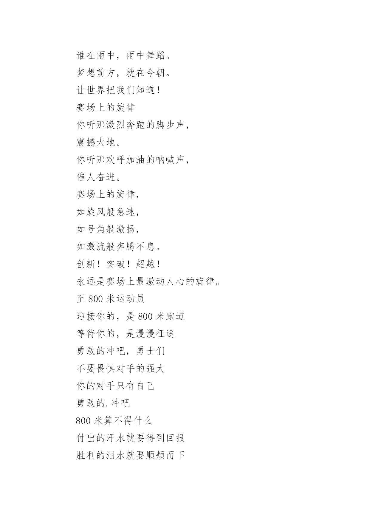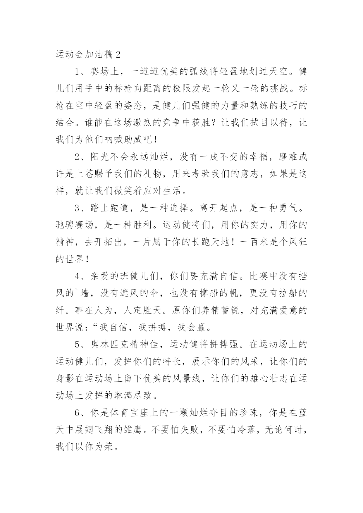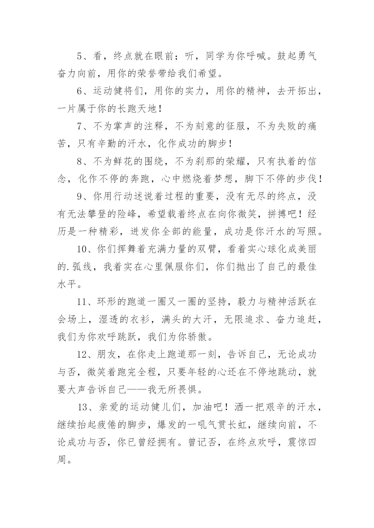运动会加油稿运动会加油稿在日新月异的现代社会中,我们需要用到加油稿的情形越来越多,加油稿可以增添对方必胜的勇气和信心。你知道加油稿怎样写才规范吗?下面是小编收集整理的运动会加油稿,希望对大家有所帮助。运动会加油稿11、不为掌声的诠释、不为刻意的征服、只有辛勤的汗水化作追求的脚步、心中坚定的信念、脚下沉稳的步伐、你用行动诉说着一个不变的真理、没有比脚更长的路、没有比人更高的山、希望在终点向你招手、努力吧用你坚韧不拔的毅志、去迎接终点的鲜花与掌声、相信成功属于你们。2、深深的呼吸,等待你的是艰难的米。相信胜利会属于你们。但在这征途上,需要你勇敢的心去面对。我们在为你加油,你是否听到了我们发自心中的呐喊?困难和胜利都在向你招手,去呀,快去呀,不要犹豫。快去击败困难、快去夺取胜利!相信你会送给我们一个汗水浸湿的微笑!3、这是意志的拼搏,这是速度的挑战,胜利在向你们招手,胜利在向你们呼唤!4、踏上跑道,是一种选择。离开起点,是一种勇气。驰骋赛场,是一种胜利。5、看,终点就在眼前;听,同学为你呼喊。鼓起勇气奋力向前,用你的荣誉带给我们希望。6、运动健将们,用你的实力,用你的精神,去开拓出,一片属于你的长跑天地!7、不为掌声的注释,不为刻意的征服,不为失败的痛苦,只有辛勤的汗水,化作成功的脚步!8、不为鲜花的围绕,不为刹那的荣耀,只有执着的信念,化作不停的奔跑,心中燃烧着梦想,脚下不停的步伐!9、你用行动述说着过程的重要,没有无尽的终点,没有无法攀登的险峰,希望载着终点在向你微笑,拼搏吧!经历是一种精彩,迸发你全部的能量,成功是你汗水的写照。10、你们挥舞着充满力量的双臂,看着实心球化成美丽的.弧线,我着实在心里佩服你们,你们抛出了自己的最佳水平。11、环形的跑道一圈又一圈的坚持,毅力与精神活跃在会场上,湿透的衣衫,满头的大汗,无限追求、奋力追赶,我们为你欢呼跳跃,我们为你骄傲。12、朋友,在你走上跑道那一刻,告诉自己,无论成功与否,微笑着跑完全程,只要年轻的心还在不停地跳动,就要大声告诉自己——我无所畏惧。13、亲爱的运动健儿们,加油吧!洒一把艰辛的汗水,继续抬起疲倦的脚步,爆发的一吼气贯长虹,继续向前,不论成功与否,你已曾经拥有。曾记否,在终点欢呼,震惊四周。14、无论成功与否,我们永远铭记这充满奋斗印记的阳光灿烂的日子15、无论你成功与否,刹那属于你。而你,一定属于永恒!16、只要你没有遗憾地奋斗了,你就不必失望,你的生命已放出了闪光!17、成功永远属于每一个勇敢者!18、我们为你呐喊,力量给你信心给你,因为我们知道那一步步的前进十分勇敢。我们为你呐喊,虽然显得火热,但却希望你能加油。19、你带来的,是拼搏的精神;你带走的,是悦耳的呐喊;你付出的,是淋漓的汗水;你收获的,是轰鸣的掌声。运动的盛会为你们而召开,观众的掌声为你们而拍响,雄壮的号角为你们而擂起,成功的花朵为你们而芳香!20、你是运动场的心脏,跳动梦想;你是漫长路的精神,激励辉煌;你们是将上下求索的人!风为你加油,云为你助兴,坚定,执着,耐力与希望,在延伸的白色跑道中点点凝聚!力量,信念,拼搏与奋斗,在遥远的终点线上渐渐明亮!时代的强音正在你的脚下踏响。21、拼搏者,你是赛场上最亮的点。在你的眼中,不在乎胜利的欢乐和失败的眼泪,完全只是为了展示生命跳跃的节拍。拼搏者,你是生命乐章中最响的音符。在你的心中,只有不停拼搏的信念,用自己坚实的步伐去迈开人生新的旅程。场上的拼搏者,你是我们永远的骄傲!运动会加油稿21、赛场上,一道道优美的弧线将轻盈地划过天空。健儿们用手中的标枪向距离的极限发起一轮又一轮的挑战。标枪在空中轻盈的姿态,是健儿们强健的力量和熟练的技巧的结合。谁能在这场激烈的竞争中获胜?让我们拭目以待,让我们为他们呐喊助威吧!2、阳光不会永远灿烂,没有一成不变的幸福,磨难或许是上苍赐予我们的礼物,用来考验我们的意志,如果是这样,就让我们微笑着应对生活。3、踏上跑道,是一种选择。离开起点,是一种勇气。驰骋赛场,是一种胜利。运动健将们,用你的实力,用你的精神,去开拓出,一片属于你的长跑天地!一百米是个风狂的世界!4、亲爱的班健儿们,你们要充满自信。比赛中没有挡风的`墙,没有遮风的伞,也没有撑船的帆,更没有拉船的纤。事在人为,人定胜天。原你们养精蓄锐,对充满爱意的世界说:“我自信,我拼搏,我会赢。5、奥林匹克精神佳,运动健将拼搏强。在运动场上的运动健儿们,发挥你们的特长,展示你们的风采,让你们的身影在运动场上留下优美的风景线,让你们的雄心壮志在运动场上发挥的淋漓尽致。6、你是体育宝座上的一颗灿烂夺目的珍珠,你是在蓝天中展翅飞翔的雏鹰。不要怕失败,不要怕冷落,无论何时,我们以你为荣。7、青春是不老的誓言,飞扬是年轻的梦想,金色的十月,让我们在这长长的跑道上青春飞扬,现出飒爽的风
