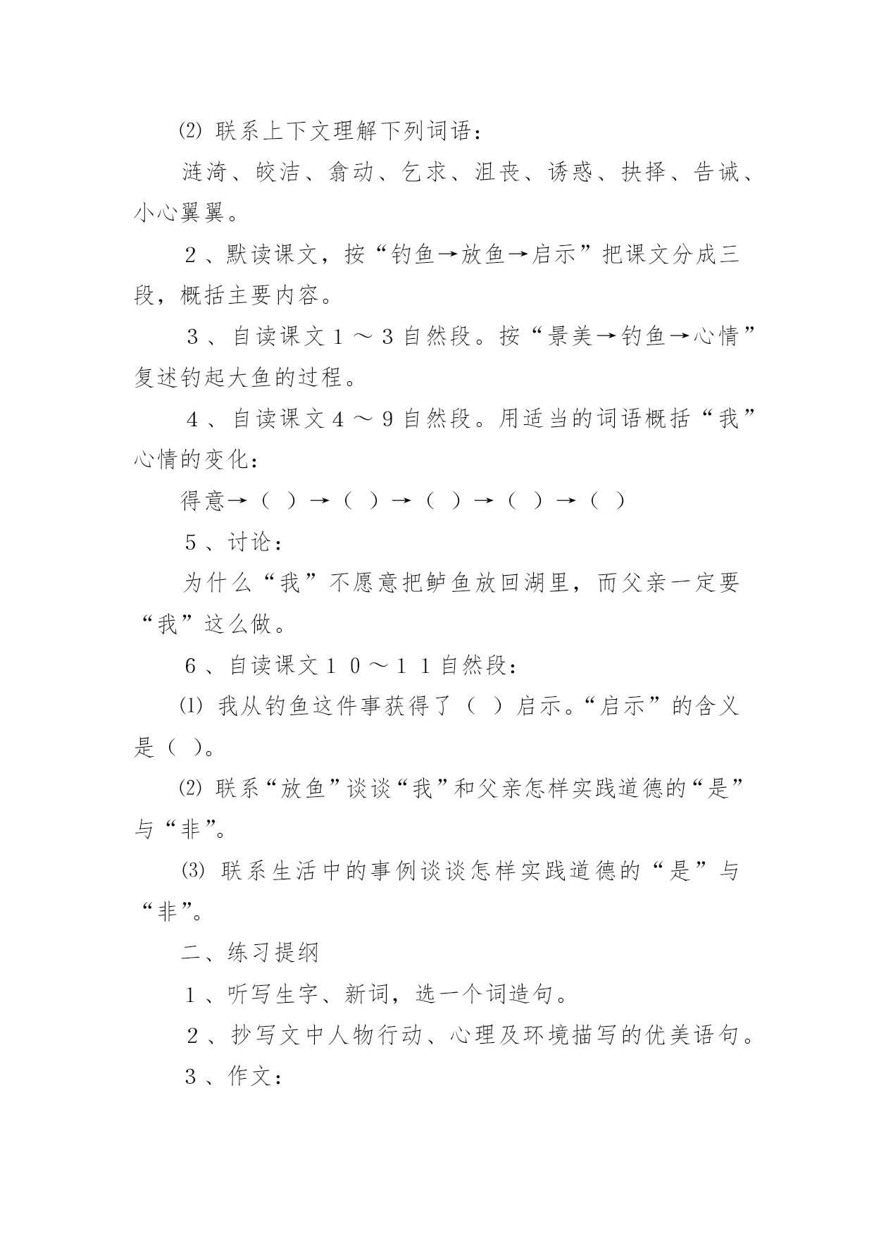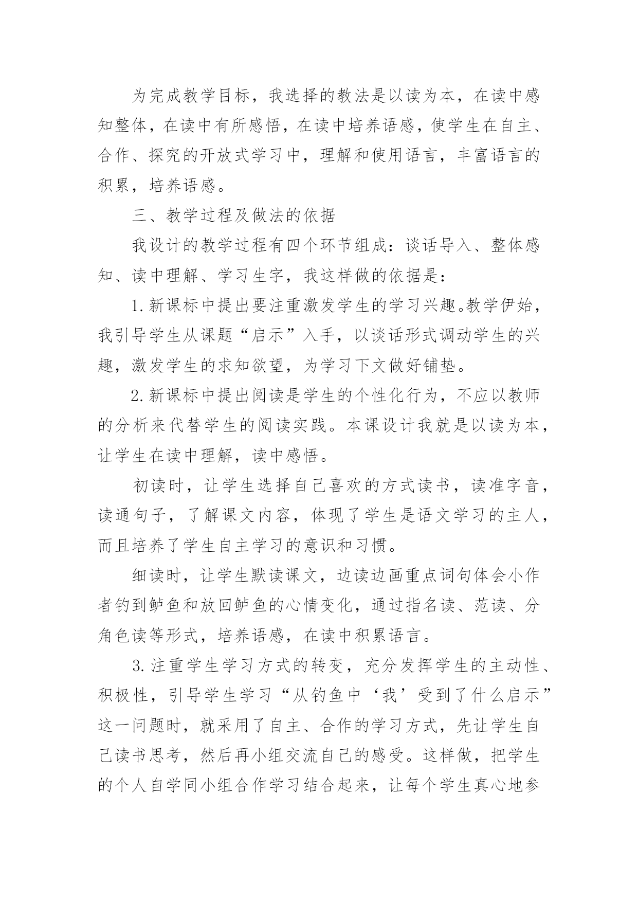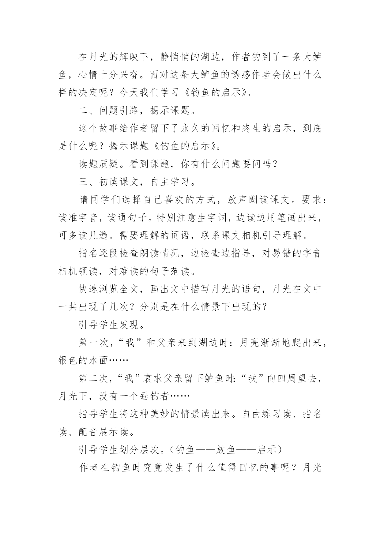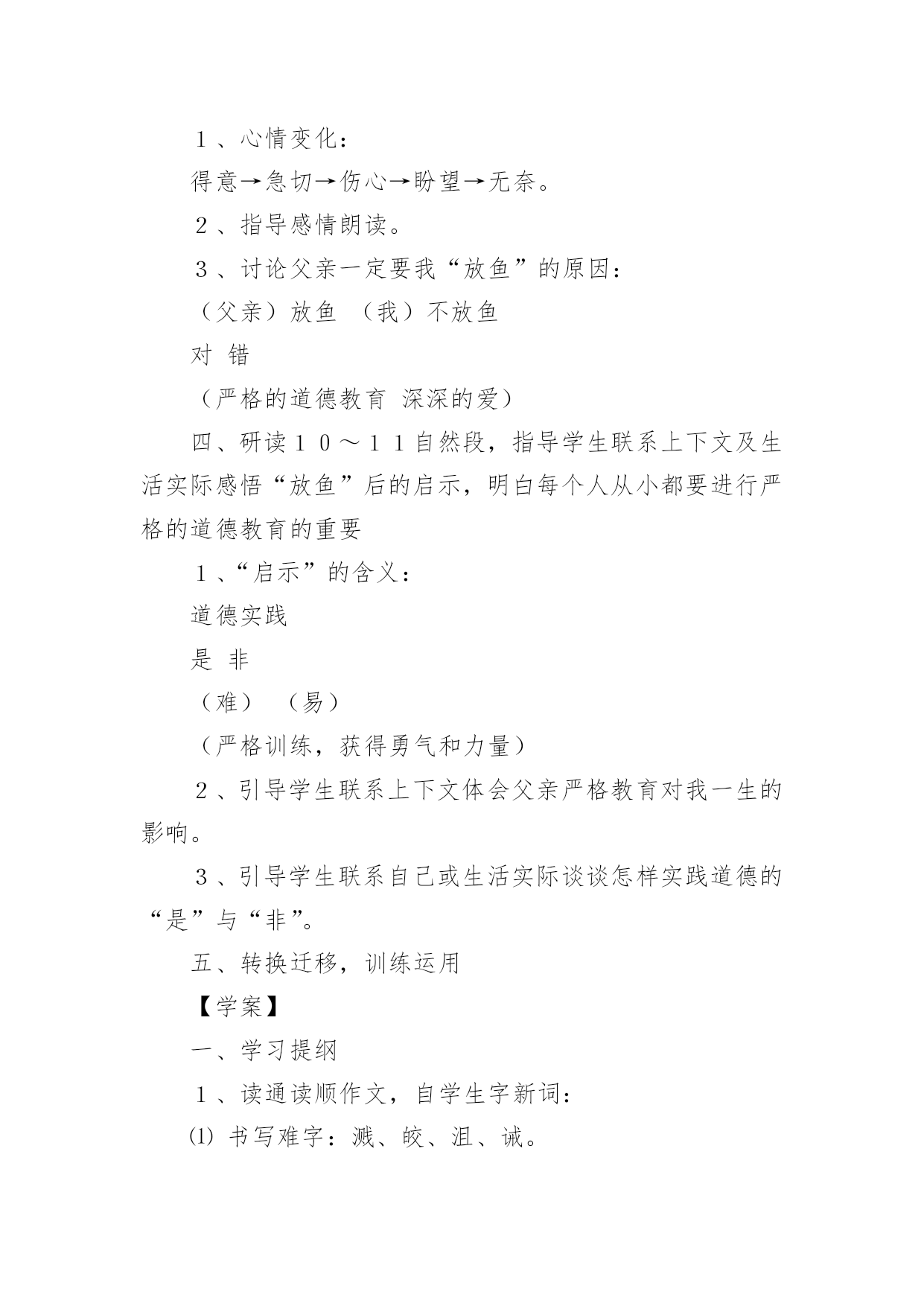 《钓鱼的启示》教学设计作为一位优秀的人民教师,往往需要进行教学设计编写工作,编写教学设计有利于我们科学、合理地支配课堂时间。你知道什么样的教学设计才能切实有效地帮助到我们吗?下面是小编整理的关于《钓鱼的启示》教学设计,欢迎大家借鉴与参考,希望对大家有所帮助。关于《钓鱼的启示》教学设计1一、说教材《钓鱼的启示》是小学语文九年义务教育的一篇讲读课文,写的是34年前“我”和父亲去钓鱼,好不容易钓着了一条大鲈鱼,父亲让“我”把鲈鱼放回湖里,使“我”从中获得终生的启示。依据新课程标准,结合教材和儿童的心理特点及学生实际,确定本课的教学目标是:1、认识本课生字,正确读写9个词语。2、体会作者钓到鲈鱼和放回鲈鱼的心情变化,培养学生的语感。3、教育学生遵守社会公德,做诚实守纪的人。教学重点:抓住重点词句,体会钓到鲈鱼和放回鲈鱼的.心情变化。教学难点:联系上下文内容,体会从钓鱼中受到的启示。二、说教法、学法为完成教学目标,我选择的教法是以读为本,在读中感知整体,在读中有所感悟,在读中培养语感,使学生在自主、合作、探究的开放式学习中,理解和使用语言,丰富语言的积累,培养语感。三、教学过程及做法的依据我设计的教学过程有四个环节组成:谈话导入、整体感知、读中理解、学习生字,我这样做的依据是:1.新课标中提出要注重激发学生的学习兴趣。教学伊始,我引导学生从课题“启示”入手,以谈话形式调动学生的兴趣,激发学生的求知欲望,为学习下文做好铺垫。2.新课标中提出阅读是学生的个性化行为,不应以教师的分析来代替学生的阅读实践。本课设计我就是以读为本,让学生在读中理解,读中感悟。初读时,让学生选择自己喜欢的方式读书,读准字音,读通句子,了解课文内容,体现了学生是语文学习的主人,而且培养了学生自主学习的意识和习惯。细读时,让学生默读课文,边读边画重点词句体会小作者钓到鲈鱼和放回鲈鱼的心情变化,通过指名读、范读、分角色读等形式,培养语感,在读中积累语言。3.注重学生学习方式的转变,充分发挥学生的主动性、积极性,引导学生学习“从钓鱼中‘我’受到了什么启示”这一问题时,就采用了自主、合作的学习方式,先让学生自己读书思考,然后再小组交流自己的感受。这样做,把学生的个人自学同小组合作学习结合起来,让每个学生真心地参与到课堂学习中去充分发挥他们的主体性。4.加强基础知识教学。初读后验收字音,学写生字时,引导学生记难记的字,并进行扩词练习,同时强调学生写字的姿势,帮助学生养成良好的写字习惯。关于《钓鱼的启示》教学设计2教学目标1.正确、流利、有感情地朗读课文。2.理解课文内容,仔细体会“我”的心理变化过程。3.从作者与父亲钓鱼的启示中受到教育,懂得要严格按道德标准来约束、规范自己的言行,做一个正直、守纪的人。教学过程第一课时导入新课检查预习情况:生字生词,朗读情况。重点理解“乞求、不容争辩、*、告诫、抉择”等词语。通读全文,思考课文大意。揭题质疑读课题你有什么疑问?教师归纳:“启示”是什么意思?课文中作者受到了什么启示?为什么钓鱼会使我从中受到启示?这节课我们就围绕大家提出的问题阅读课文,解决疑问。初读理解“启示”的意思是什么?再读课文,作者受到了什么启示,画出有关语句.(道德只是个简单的'是与非的问题,实践起来却很难.)关于《钓鱼的启示》教学设计3【教学目标】1、认识11个生字,会写14个生字。正确读写“捕捞、鱼饵、小心翼翼、操纵、鱼钩、乞求、抉择、皎洁、沮丧、诱惑、告诫、实践”等词语,理解其中带点词。2、理解课文内容,从中体会“我”和“父亲”的心理活动,并能概括“我”心情变化的过程,理解父亲要“我”将鲈鱼放回湖中的理由。3、读懂“我”从钓鱼这件事中获得的启示,明白每个人从小接受严格教育,获得道德实践的勇气和力量的重要。【教学重点】体会人物心理变化过程,理解父亲为什么一定要“我”把鲈鱼放回湖中的原因。【教学难点】感悟从放鱼中得到的启示。【教学过程】一、初读课文,掌握字词,理清写作思路二、指导学生略读、复述钓鱼的过程,体会钓到大鱼的.“得意”三、研读4~9自然段。感悟“放鱼”时的复杂心情及“放鱼”的原因1、心情变化:得意→急切→伤心→盼望→无奈。2、指导感情朗读。3、讨论父亲一定要我“放鱼”的原因:(父亲)放鱼(我)不放鱼对错(严格的道德教育深深的爱)四、研读10~11自然段,指导学生联系上下文及生活实际感悟“放鱼”后的启示,明白每个人从小都要进行严格的道德教育的重要1、“启示”的含义:道德实践是非(难)(易)(严格训练,获得勇气和力量)2、引导学生联系上下文体会父亲严格教育对我一生的影响。3、引导学生联系自己或生活实际谈谈怎样实践道德的“是”与“非”。五、转换迁移,训练运用【学案】一、学习提纲1、读通读顺作文,自学生字新词:⑴书写难字:溅、皎、沮、诫。⑵联系上下文理解下列词语