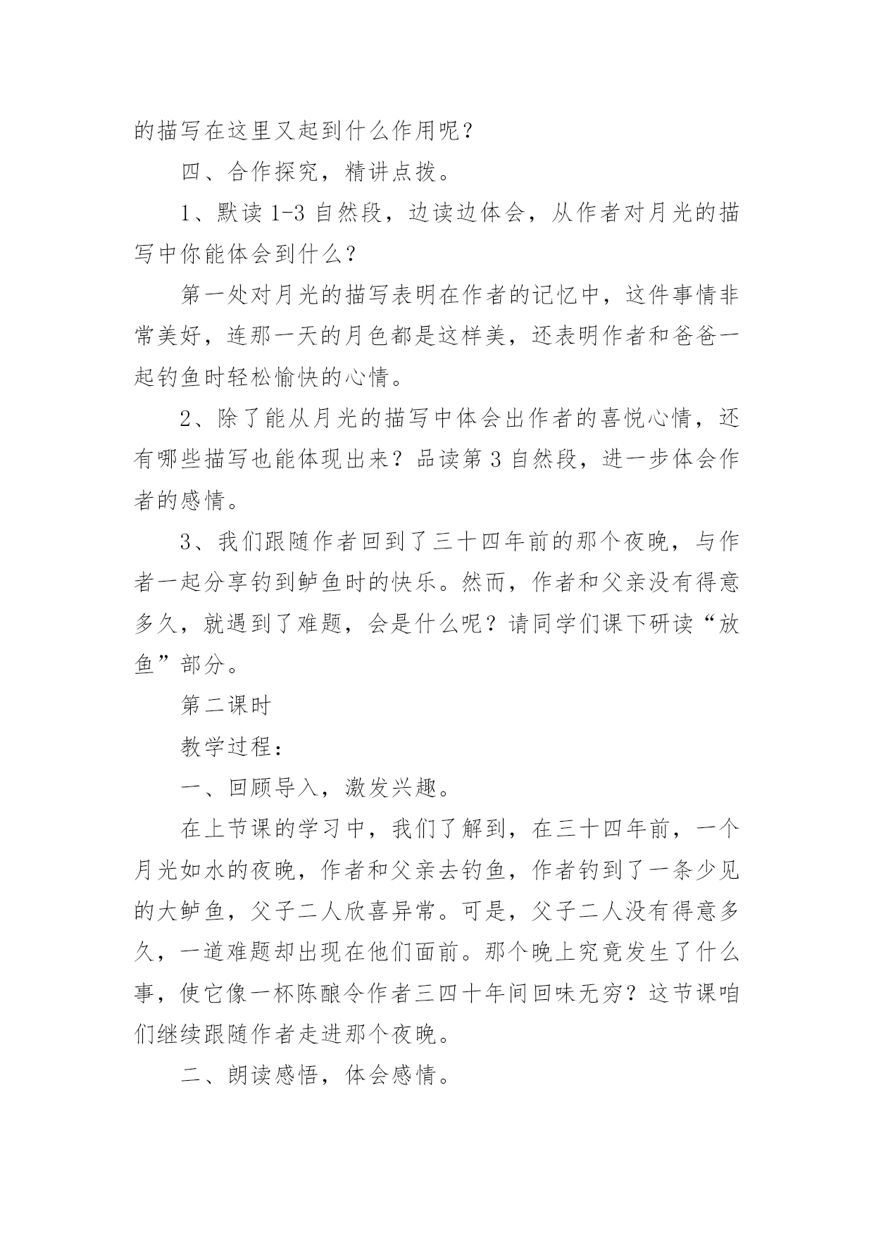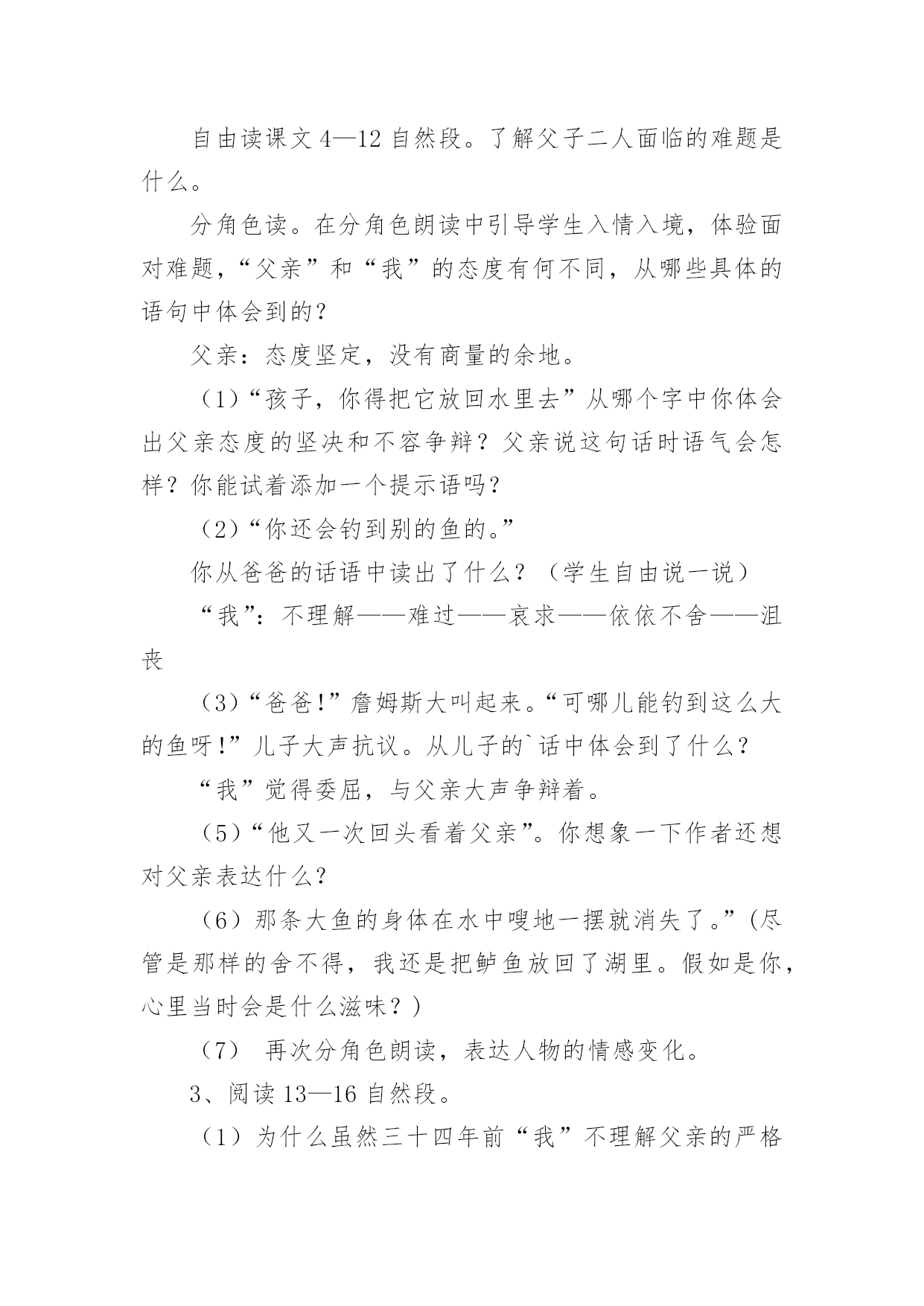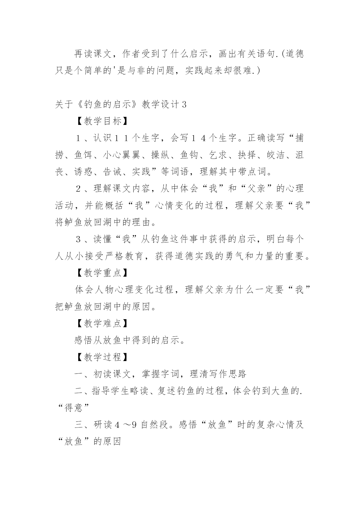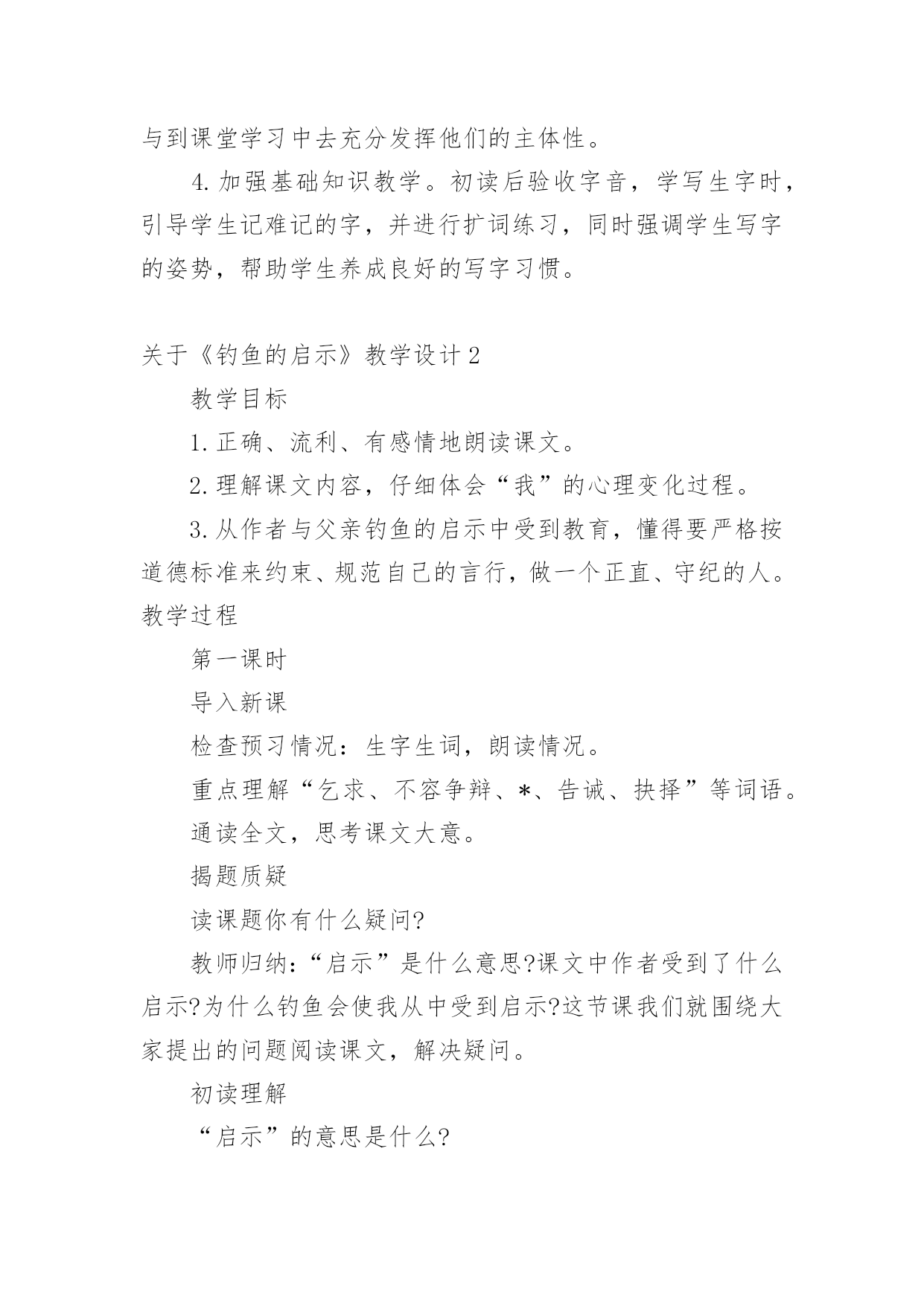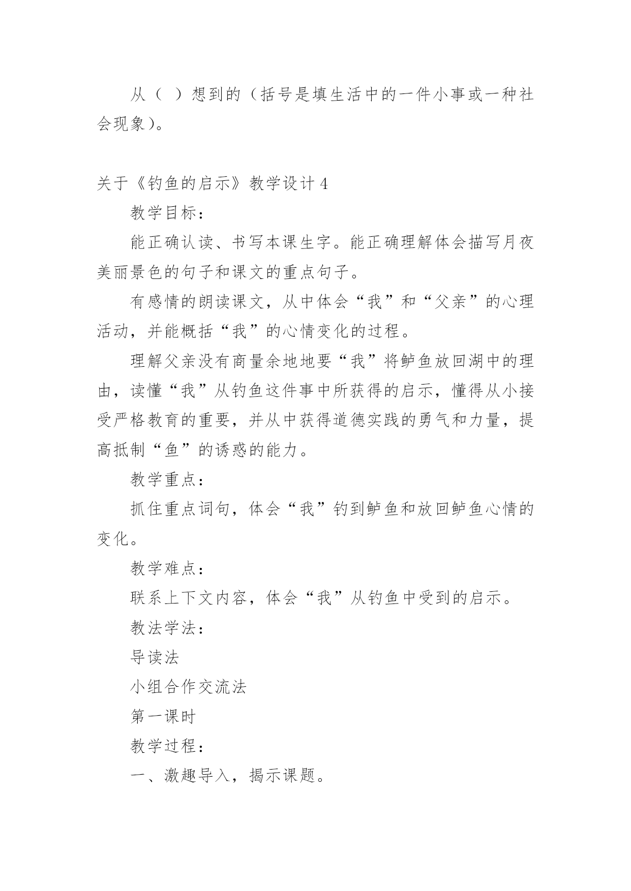 《钓鱼的启示》教学设计作为一位优秀的人民教师,往往需要进行教学设计编写工作,编写教学设计有利于我们科学、合理地支配课堂时间。你知道什么样的教学设计才能切实有效地帮助到我们吗?下面是小编整理的关于《钓鱼的启示》教学设计,欢迎大家借鉴与参考,希望对大家有所帮助。关于《钓鱼的启示》教学设计1一、说教材《钓鱼的启示》是小学语文九年义务教育的一篇讲读课文,写的是34年前“我”和父亲去钓鱼,好不容易钓着了一条大鲈鱼,父亲让“我”把鲈鱼放回湖里,使“我”从中获得终生的启示。依据新课程标准,结合教材和儿童的心理特点及学生实际,确定本课的教学目标是:1、认识本课生字,正确读写9个词语。2、体会作者钓到鲈鱼和放回鲈鱼的心情变化,培养学生的语感。3、教育学生遵守社会公德,做诚实守纪的人。教学重点:抓住重点词句,体会钓到鲈鱼和放回鲈鱼的.心情变化。教学难点:联系上下文内容,体会从钓鱼中受到的启示。二、说教法、学法为完成教学目标,我选择的教法是以读为本,在读中感知整体,在读中有所感悟,在读中培养语感,使学生在自主、合作、探究的开放式学习中,理解和使用语言,丰富语言的积累,培养语感。三、教学过程及做法的依据我设计的教学过程有四个环节组成:谈话导入、整体感知、读中理解、学习生字,我这样做的依据是:1.新课标中提出要注重激发学生的学习兴趣。教学伊始,我引导学生从课题“启示”入手,以谈话形式调动学生的兴趣,激发学生的求知欲望,为学习下文做好铺垫。2.新课标中提出阅读是学生的个性化行为,不应以教师的分析来代替学生的阅读实践。本课设计我就是以读为本,让学生在读中理解,读中感悟。初读时,让学生选择自己喜欢的方式读书,读准字音,读通句子,了解课文内容,体现了学生是语文学习的主人,而且培养了学生自主学习的意识和习惯。细读时,让学生默读课文,边读边画重点词句体会小作者钓到鲈鱼和放回鲈鱼的心情变化,通过指名读、范读、分角色读等形式,培养语感,在读中积累语言。3.注重学生学习方式的转变,充分发挥学生的主动性、积极性,引导学生学习“从钓鱼中‘我’受到了什么启示”这一问题时,就采用了自主、合作的学习方式,先让学生自己读书思考,然后再小组交流自己的感受。这样做,把学生的个人自学同小组合作学习结合起来,让每个学生真心地参与到课堂学习中去充分发挥他们的主体性。4.加强基础知识教学。初读后验收字音,学写生字时,引导学生记难记的字,并进行扩词练习,同时强调学生写字的姿势,帮助学生养成良好的写字习惯。关于《钓鱼的启示》教学设计2教学目标1.正确、流利、有感情地朗读课文。2.理解课文内容,仔细体会“我”的心理变化过程。3.从作者与父亲钓鱼的启示中受到教育,懂得要严格按道德标准来约束、规范自己的言行,做一个正直、守纪的人。教学过程第一课时导入新课检查预习情况:生字生词,朗读情况。重点理解“乞求、不容争辩、*、告诫、抉择”等词语。通读全文,思考课文大意。揭题质疑读课题你有什么疑问?教师归纳:“启示”是什么意思?课文中作者受到了什么启示?为什么钓鱼会使我从中受到启示?这节课我们就围绕大家提出的问题阅读课文,解决疑问。初读理解“启示”的意思是什么?再读课文,作者受到了什么启示,画出有关语句.(道德只是个简单的'是与非的问题,实践起来却很难.)关于《钓鱼的启示》教学设计3【教学目标】1、认识11个生字,会写14个生字。正确读写“捕捞、鱼饵、小心翼翼、操纵、鱼钩、乞求、抉择、皎洁、沮丧、诱惑、告诫、实践”等词语,理解其中带点词。2、理解课文内容,从中体会“我”和“父亲”的心理活动,并能概括“我”心情变化的过程,理解父亲要“我”将鲈鱼放回湖中的理由。3、读懂“我”从钓鱼这件事中获得的启示,明白每个人从小接受严格教育,获得道德实践的勇气和力量的重要。【教学重点】体会人物心理变化过程,理解父亲为什么一定要“我”把鲈鱼放回湖中的原因。【教学难点】感悟从放鱼中得到的启示。【教学过程】一、初读课文,掌握字词,理清写作思路二、指导学生略读、复述钓鱼的过程,体会钓到大鱼的.“得意”三、研读4~9自然段。感悟“放鱼”时的复杂心情及“放鱼”的原因1、心情变化:得意→急切→伤心→盼望→无奈。2、指导感情朗读。3、讨论父亲一定要我“放鱼”的原因:(父亲)放鱼(我)不放鱼对错(严格的道德教育深深的爱)四、研读10~11自然段,指导学生联系上下文及生活实际感悟“放鱼”后的启示,明白每个人从小都要进行严格的道德教育的重要1、“启示”的含义:道德实践是非(难)(易)(严格训练,获得勇气和力量)2、引导学生联系上下文体会父亲严格教育对我一生的影响。3、引导学生联系自己或生活实际谈谈怎样实践道德的“是”与“非”。五、转换迁移,训练运用【学案】一、学习提纲1、读通读顺作文,自学生字新词:⑴书写难字:溅、皎、沮、诫。⑵联系上下文理解下列词语