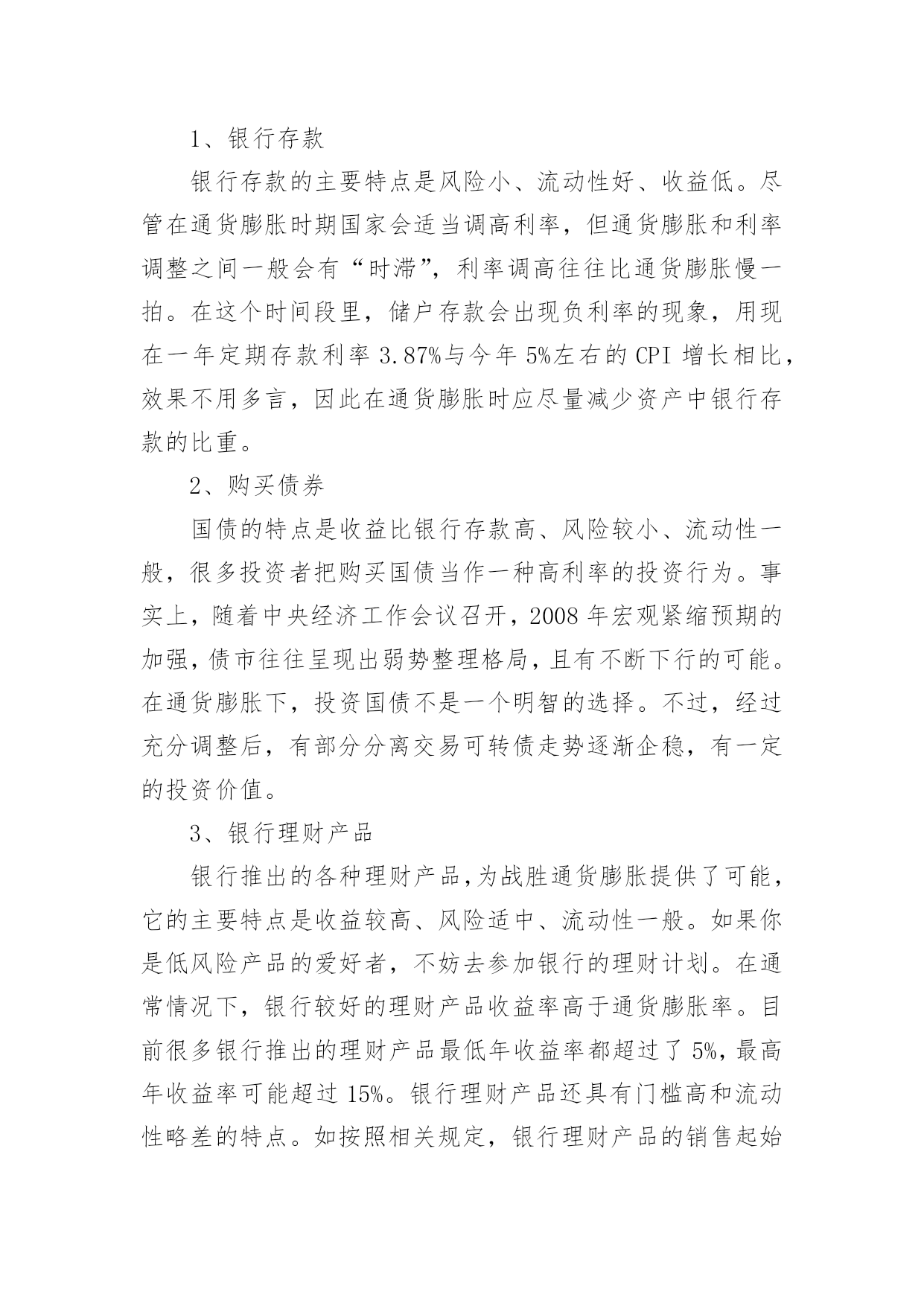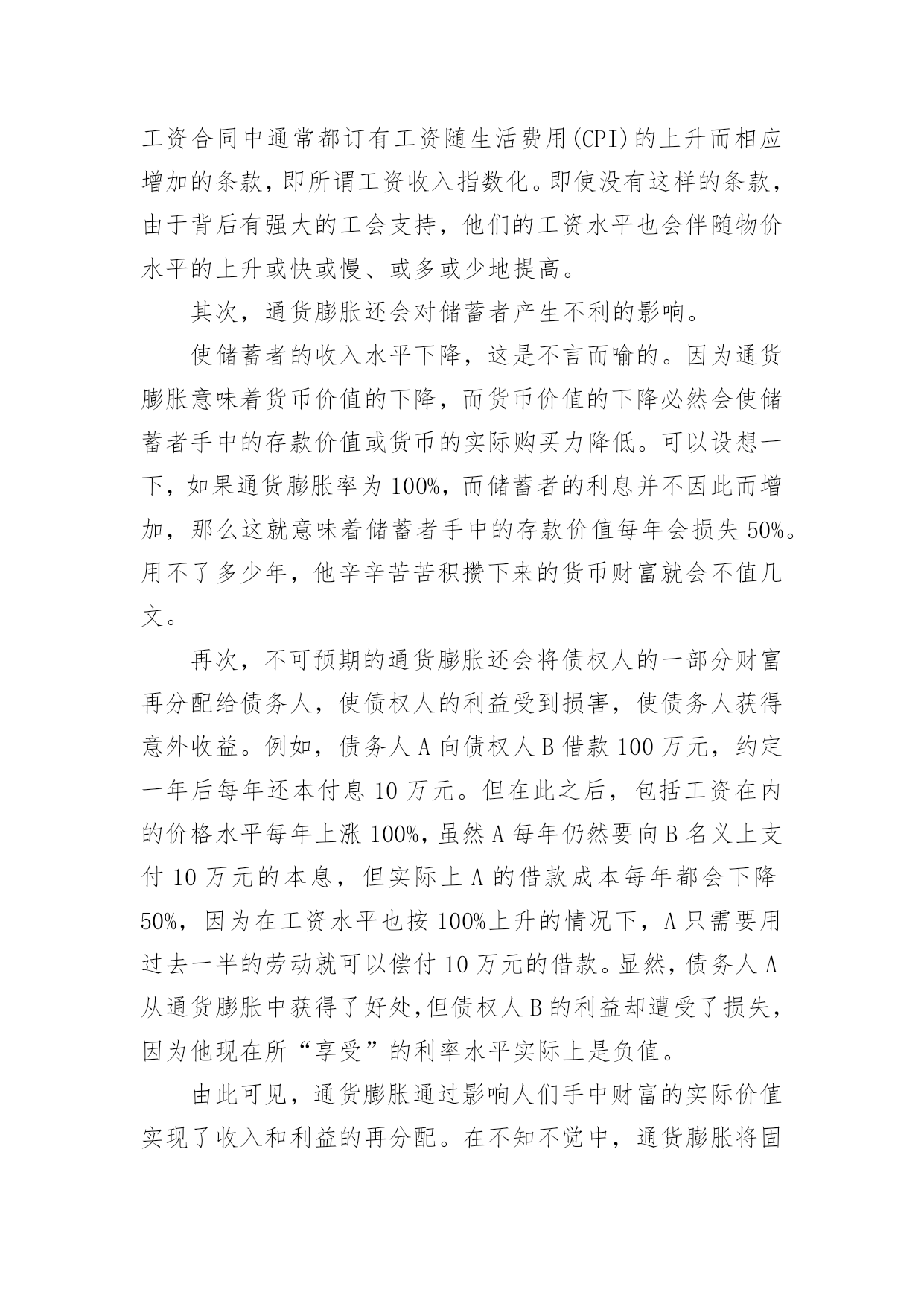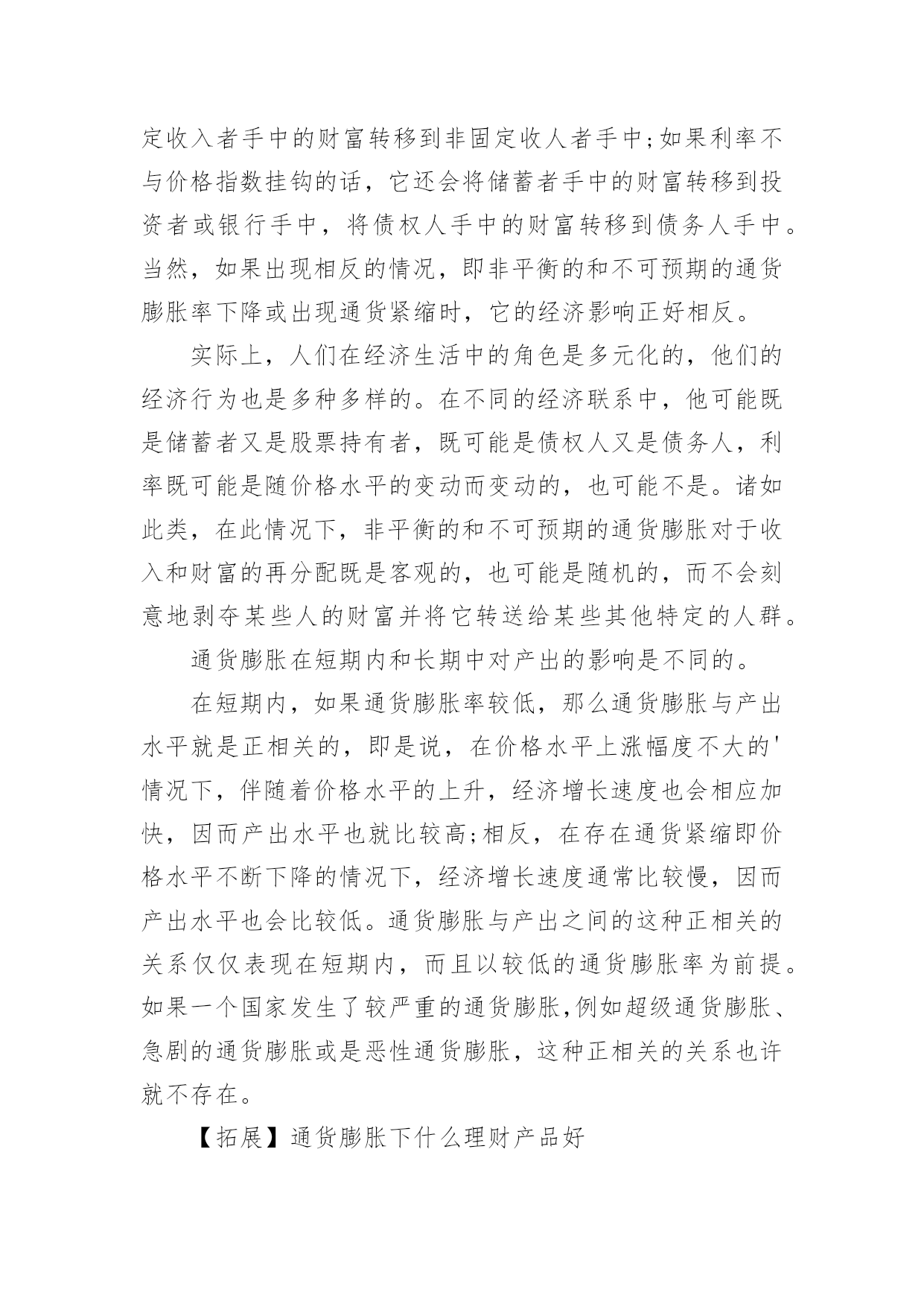 通货膨胀的经济影响通货膨胀的经济影响导语:通货膨胀作为经济运行过程中经常出现的一种经济现象,通常会对经济生活产生多方面的影响。这种影响主要表现在如下三个方面。以下是小编整理的通货膨胀的经济影响,一起来看看吧。通货膨胀对收人以及财富在不同阶层之间再分配的影响在出现平衡的和可预期到的通货膨胀的情况下,每一种商品、每一种生产要素的价格,包括劳动的价格都会按同一比例上升,人们的货币收人和财富的市场价值也会按相同比例上升,在此情况下,通货膨胀不会对人们的收入和财富的再分配产生影响。但是,如果在经济中出现非平衡的或不可预期的通货膨胀的情况,通货膨胀首先会对拥有固定货币收入的人产生不利的影响,因为他的收入水平是固定不变的,因此,随着价格水平的上升,他的货币收入的实际购买力会下降,即实际收入水平会下降。伴随着实际收入水平的下降,对于拥有固定货币收入的人来说他们的生活水平会相应下降。但是,对于那些货币收入不固定即货币收入随价格水平的上升而相应上升的人来说,情况正好相反,他们会从通货膨胀中受益。例如,在伴随着通货膨胀而相应扩张的行业中工作的劳动者,他们的货币收入增长通常会走在物价水平上涨之前;在有强大的工会支持的行业中工作的工人,他们的工资合同中通常都订有工资随生活费用(CPI)的上升而相应增加的条款,即所谓工资收入指数化。即使没有这样的条款,由于背后有强大的工会支持,他们的工资水平也会伴随物价水平的上升或快或慢、或多或少地提高。其次,通货膨胀还会对储蓄者产生不利的影响。使储蓄者的收入水平下降,这是不言而喻的。因为通货膨胀意味着货币价值的下降,而货币价值的下降必然会使储蓄者手中的存款价值或货币的实际购买力降低。可以设想一下,如果通货膨胀率为100%,而储蓄者的利息并不因此而增加,那么这就意味着储蓄者手中的存款价值每年会损失50%。用不了多少年,他辛辛苦苦积攒下来的货币财富就会不值几文。再次,不可预期的通货膨胀还会将债权人的一部分财富再分配给债务人,使债权人的利益受到损害,使债务人获得意外收益。例如,债务人A向债权人B借款100万元,约定一年后每年还本付息10万元。但在此之后,包括工资在内的价格水平每年上涨100%,虽然A每年仍然要向B名义上支付10万元的本息,但实际上A的借款成本每年都会下降50%,因为在工资水平也按100%上升的情况下,A只需要用过去一半的劳动就可以偿付10万元的借款。显然,债务人A从通货膨胀中获得了好处,但债权人B的利益却遭受了损失,因为他现在所“享受”的利率水平实际上是负值。由此可见,通货膨胀通过影响人们手中财富的实际价值实现了收入和利益的再分配。在不知不觉中,通货膨胀将固定收入者手中的财富转移到非固定收人者手中;如果利率不与价格指数挂钩的话,它还会将储蓄者手中的财富转移到投资者或银行手中,将债权人手中的财富转移到债务人手中。当然,如果出现相反的情况,即非平衡的和不可预期的通货膨胀率下降或出现通货紧缩时,它的经济影响正好相反。实际上,人们在经济生活中的角色是多元化的,他们的经济行为也是多种多样的。在不同的经济联系中,他可能既是储蓄者又是股票持有者,既可能是债权人又是债务人,利率既可能是随价格水平的变动而变动的,也可能不是。诸如此类,在此情况下,非平衡的和不可预期的通货膨胀对于收入和财富的再分配既是客观的,也可能是随机的,而不会刻意地剥夺某些人的财富并将它转送给某些其他特定的人群。通货膨胀在短期内和长期中对产出的影响是不同的。在短期内,如果通货膨胀率较低,那么通货膨胀与产出水平就是正相关的,即是说,在价格水平上涨幅度不大的'情况下,伴随着价格水平的上升,经济增长速度也会相应加快,因而产出水平也就比较高;相反,在存在通货紧缩即价格水平不断下降的情况下,经济增长速度通常比较慢,因而产出水平也会比较低。通货膨胀与产出之间的这种正相关的关系仅仅表现在短期内,而且以较低的通货膨胀率为前提。如果一个国家发生了较严重的通货膨胀,例如超级通货膨胀、急剧的通货膨胀或是恶性通货膨胀,这种正相关的关系也许就不存在。【拓展】通货膨胀下什么理财产品好1、银行存款银行存款的主要特点是风险小、流动性好、收益低。尽管在通货膨胀时期国家会适当调高利率,但通货膨胀和利率调整之间一般会有“时滞”,利率调高往往比通货膨胀慢一拍。在这个时间段里,储户存款会出现负利率的现象,用现在一年定期存款利率3.87%与今年5%左右的CPI增长相比,效果不用多言,因此在通货膨胀时应尽量减少资产中银行存款的比重。2、购买债券国债的特点是收益比银行存款高、风险较小、流动性一般,很多投资者把购买国债当作一种高利率的投资行为。事实上,随着中央经济工作会议召开,2008年宏观紧缩预期的加强,债市往往呈现出弱势整理格局,且有不断下行的可能。在通货膨胀下,投资国债不是一个明智的选择。不过,经