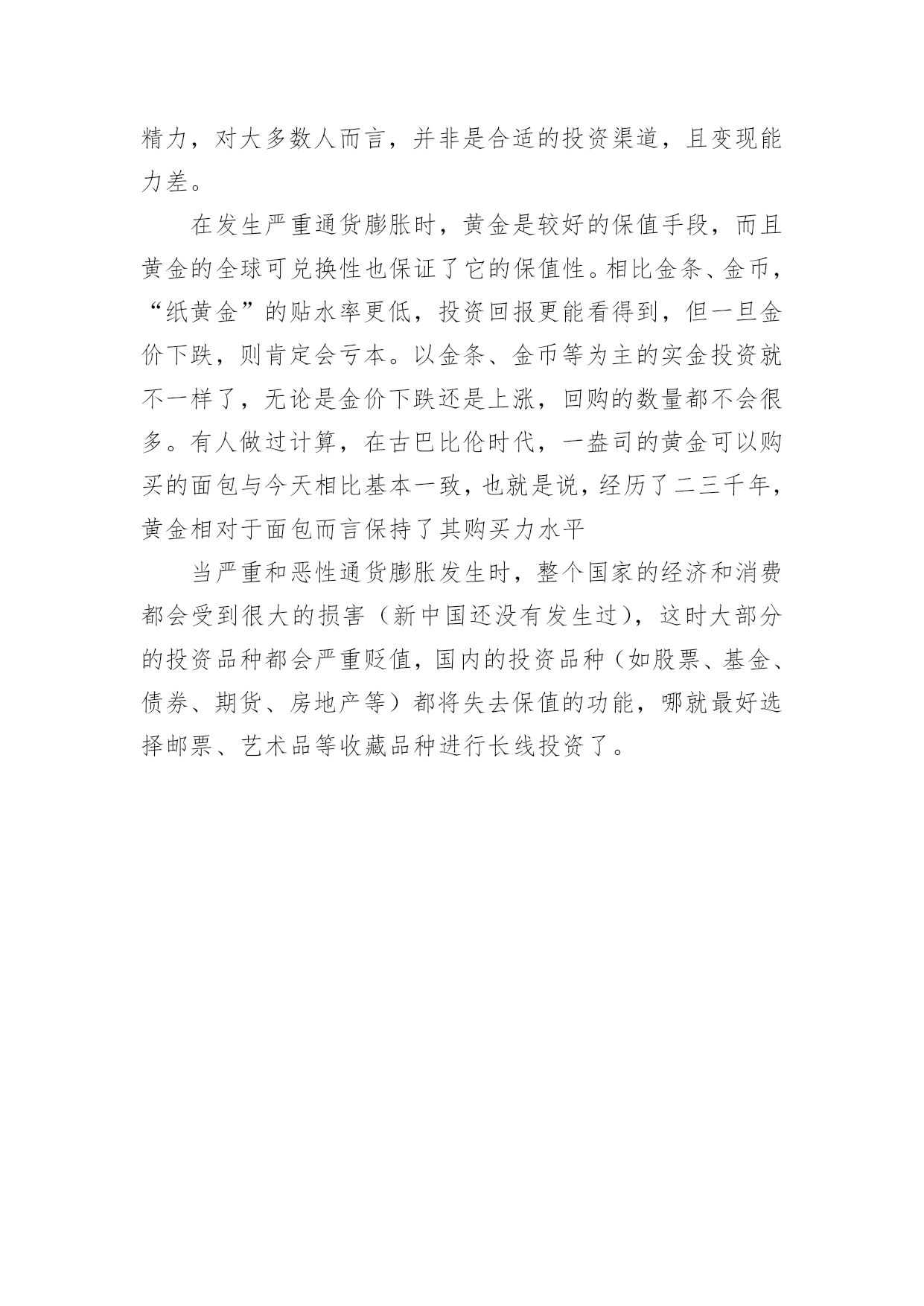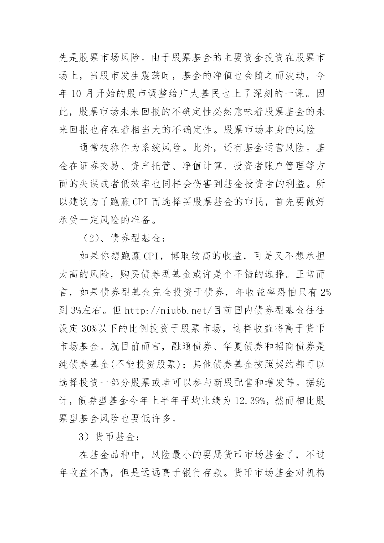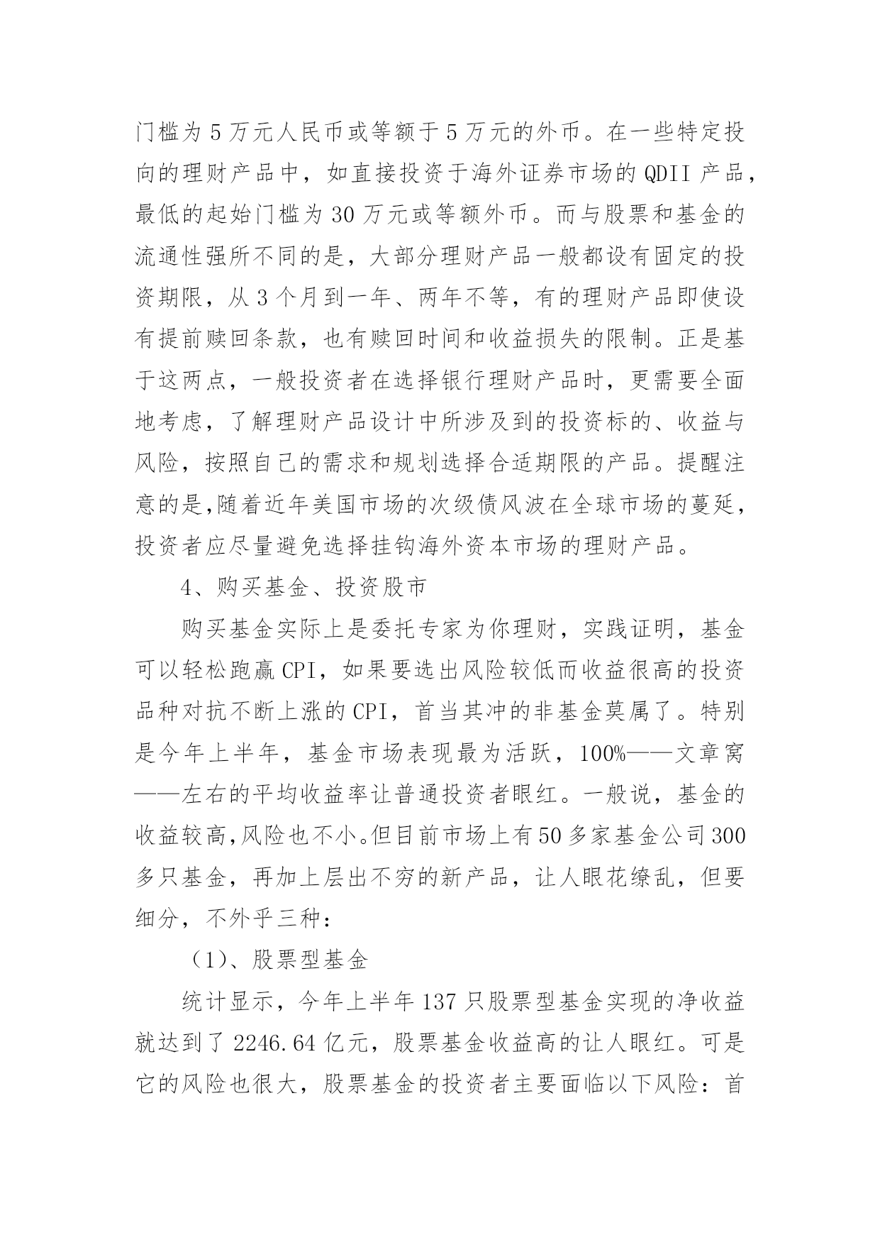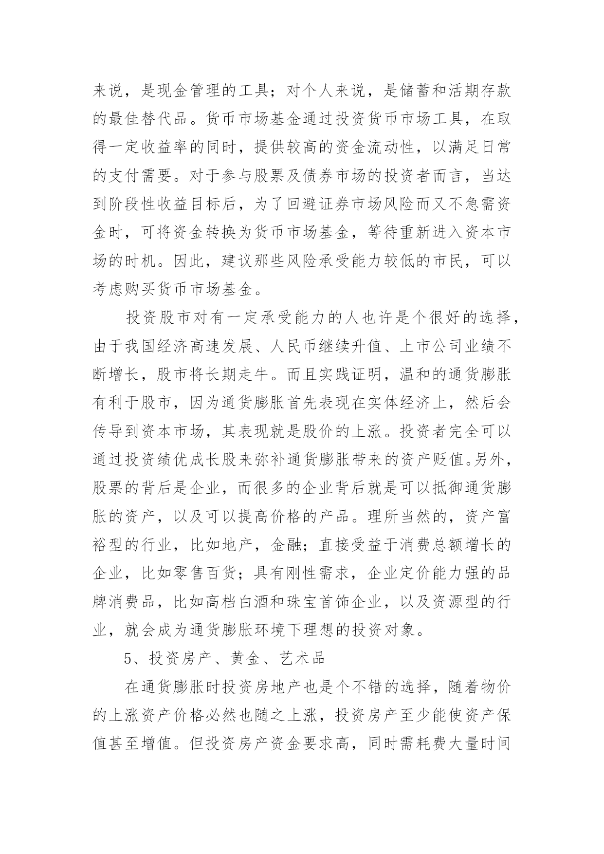 通货膨胀的经济影响通货膨胀的经济影响导语:通货膨胀作为经济运行过程中经常出现的一种经济现象,通常会对经济生活产生多方面的影响。这种影响主要表现在如下三个方面。以下是小编整理的通货膨胀的经济影响,一起来看看吧。通货膨胀对收人以及财富在不同阶层之间再分配的影响在出现平衡的和可预期到的通货膨胀的情况下,每一种商品、每一种生产要素的价格,包括劳动的价格都会按同一比例上升,人们的货币收人和财富的市场价值也会按相同比例上升,在此情况下,通货膨胀不会对人们的收入和财富的再分配产生影响。但是,如果在经济中出现非平衡的或不可预期的通货膨胀的情况,通货膨胀首先会对拥有固定货币收入的人产生不利的影响,因为他的收入水平是固定不变的,因此,随着价格水平的上升,他的货币收入的实际购买力会下降,即实际收入水平会下降。伴随着实际收入水平的下降,对于拥有固定货币收入的人来说他们的生活水平会相应下降。但是,对于那些货币收入不固定即货币收入随价格水平的上升而相应上升的人来说,情况正好相反,他们会从通货膨胀中受益。例如,在伴随着通货膨胀而相应扩张的行业中工作的劳动者,他们的货币收入增长通常会走在物价水平上涨之前;在有强大的工会支持的行业中工作的工人,他们的工资合同中通常都订有工资随生活费用(CPI)的上升而相应增加的条款,即所谓工资收入指数化。即使没有这样的条款,由于背后有强大的工会支持,他们的工资水平也会伴随物价水平的上升或快或慢、或多或少地提高。其次,通货膨胀还会对储蓄者产生不利的影响。使储蓄者的收入水平下降,这是不言而喻的。因为通货膨胀意味着货币价值的下降,而货币价值的下降必然会使储蓄者手中的存款价值或货币的实际购买力降低。可以设想一下,如果通货膨胀率为100%,而储蓄者的利息并不因此而增加,那么这就意味着储蓄者手中的存款价值每年会损失50%。用不了多少年,他辛辛苦苦积攒下来的货币财富就会不值几文。再次,不可预期的通货膨胀还会将债权人的一部分财富再分配给债务人,使债权人的利益受到损害,使债务人获得意外收益。例如,债务人A向债权人B借款100万元,约定一年后每年还本付息10万元。但在此之后,包括工资在内的价格水平每年上涨100%,虽然A每年仍然要向B名义上支付10万元的本息,但实际上A的借款成本每年都会下降50%,因为在工资水平也按100%上升的情况下,A只需要用过去一半的劳动就可以偿付10万元的借款。显然,债务人A从通货膨胀中获得了好处,但债权人B的利益却遭受了损失,因为他现在所“享受”的利率水平实际上是负值。由此可见,通货膨胀通过影响人们手中财富的实际价值实现了收入和利益的再分配。在不知不觉中,通货膨胀将固定收入者手中的财富转移到非固定收人者手中;如果利率不与价格指数挂钩的话,它还会将储蓄者手中的财富转移到投资者或银行手中,将债权人手中的财富转移到债务人手中。当然,如果出现相反的情况,即非平衡的和不可预期的通货膨胀率下降或出现通货紧缩时,它的经济影响正好相反。实际上,人们在经济生活中的角色是多元化的,他们的经济行为也是多种多样的。在不同的经济联系中,他可能既是储蓄者又是股票持有者,既可能是债权人又是债务人,利率既可能是随价格水平的变动而变动的,也可能不是。诸如此类,在此情况下,非平衡的和不可预期的通货膨胀对于收入和财富的再分配既是客观的,也可能是随机的,而不会刻意地剥夺某些人的财富并将它转送给某些其他特定的人群。通货膨胀在短期内和长期中对产出的影响是不同的。在短期内,如果通货膨胀率较低,那么通货膨胀与产出水平就是正相关的,即是说,在价格水平上涨幅度不大的'情况下,伴随着价格水平的上升,经济增长速度也会相应加快,因而产出水平也就比较高;相反,在存在通货紧缩即价格水平不断下降的情况下,经济增长速度通常比较慢,因而产出水平也会比较低。通货膨胀与产出之间的这种正相关的关系仅仅表现在短期内,而且以较低的通货膨胀率为前提。如果一个国家发生了较严重的通货膨胀,例如超级通货膨胀、急剧的通货膨胀或是恶性通货膨胀,这种正相关的关系也许就不存在。【拓展】通货膨胀下什么理财产品好1、银行存款银行存款的主要特点是风险小、流动性好、收益低。尽管在通货膨胀时期国家会适当调高利率,但通货膨胀和利率调整之间一般会有“时滞”,利率调高往往比通货膨胀慢一拍。在这个时间段里,储户存款会出现负利率的现象,用现在一年定期存款利率3.87%与今年5%左右的CPI增长相比,效果不用多言,因此在通货膨胀时应尽量减少资产中银行存款的比重。2、购买债券国债的特点是收益比银行存款高、风险较小、流动性一般,很多投资者把购买国债当作一种高利率的投资行为。事实上,随着中央经济工作会议召开,2008年宏观紧缩预期的加强,债市往往呈现出弱势整理格局,且有不断下行的可能。在通货膨胀下,投资国债不是一个明智的选择。不过,经