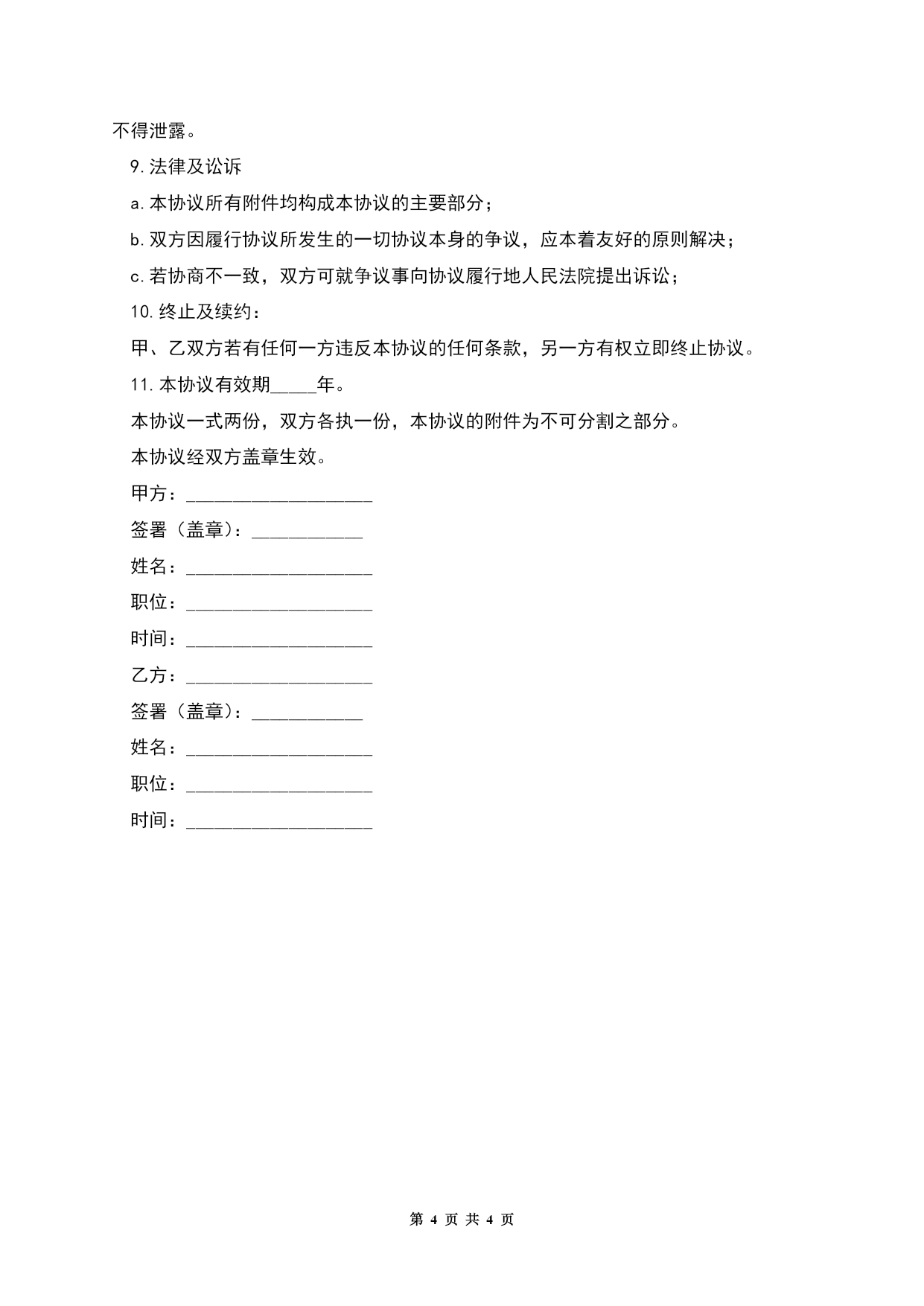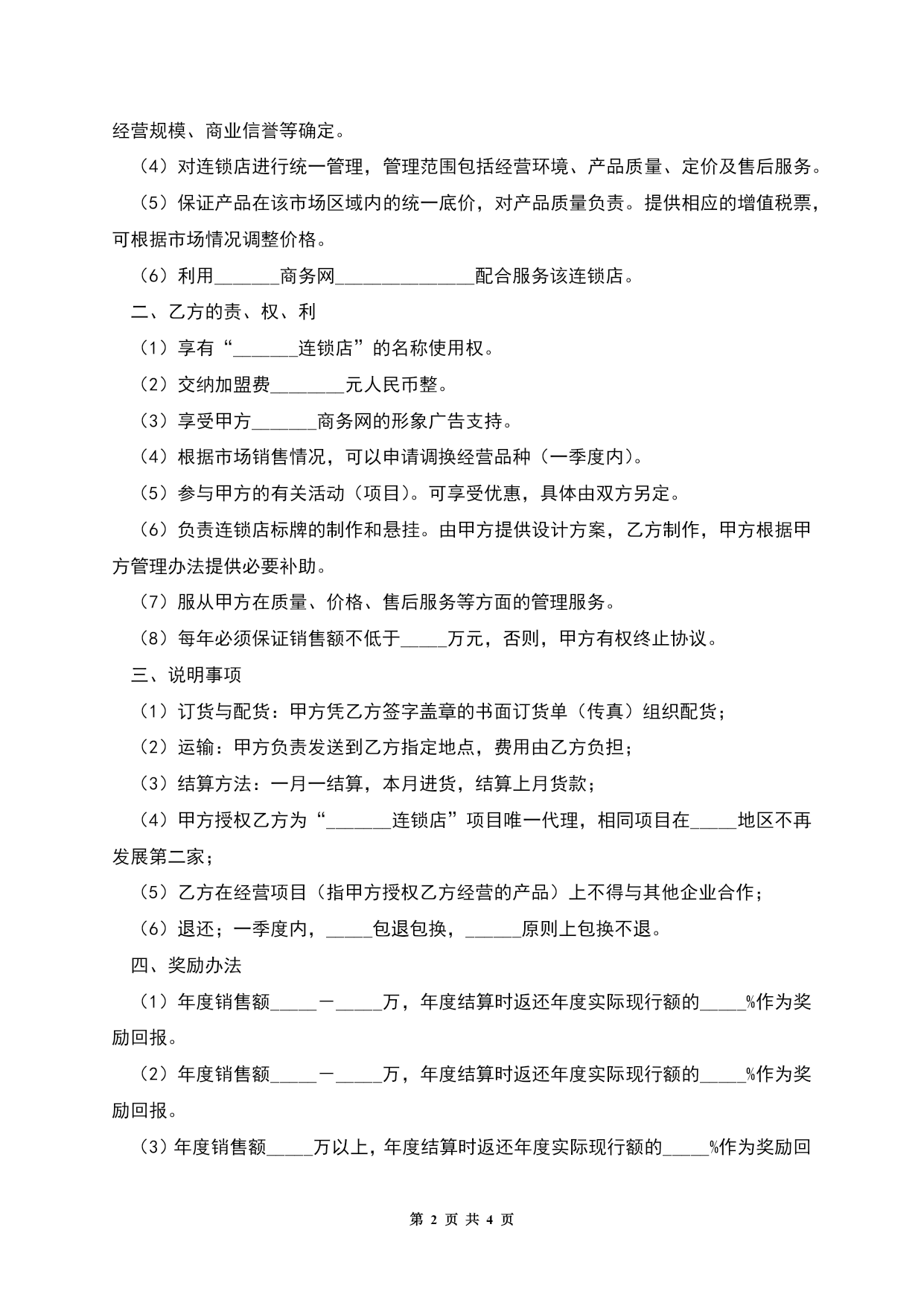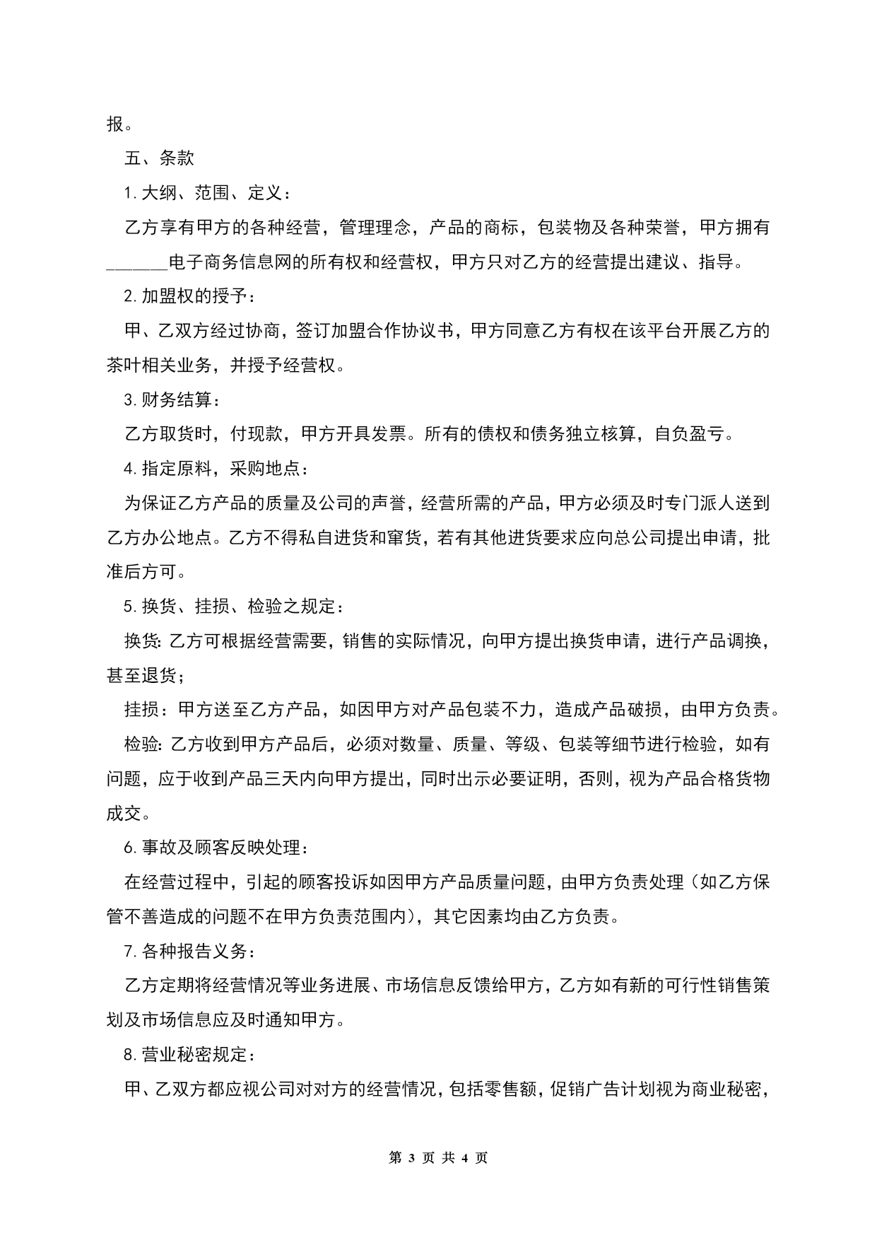 第PAGE\*MERGEFORMAT4页共NUMPAGES\*MERGEFORMAT4页加盟连锁店协议书的范本本协议由以下双方共同签署:甲方:________________________地址:________________________邮编:________________________电话:________________________传真:________________________网址:________________________销售部email:_________________乙方:________________________地址:________________________邮编:________________________电话:________________________传真:________________________网址:________________________为发挥双方优势,经友好协商,现就合作建立_______连锁店达成如下一致合作协议:一、甲方的责、权、利(1)提供连锁店的名称使用权。名称统一为“_______连锁店”。(2)为保证甲方商品的信誉,品牌之声誉,监督乙方在该地区的经营不得有损害甲方商誉行为,乙方与甲方合作为加盟时,须付保证金_____万元人民币给甲方(合作期满,甲方把保证金退还给乙方),中途如有违约行为,根据违约责任大小,甲方有权扣下保证金,甚至继续追加必要的法律责任。为保证公司不断致力开发新产品,提高经营管理水平,制定相应的市场销售策略及甲方在产品注册,包装设计等无形资产,乙方在加入甲方加盟店时,收取乙方加盟费_______元人民币(作为首批进货货款)。以保证甲方利益。(3)甲方向乙方提供_______经营的产品,价值超出加盟费的_____%,具体视乙方的经营规模、商业信誉等确定。(4)对连锁店进行统一管理,管理范围包括经营环境、产品质量、定价及售后服务。(5)保证产品在该市场区域内的统一底价,对产品质量负责。提供相应的增值税票,可根据市场情况调整价格。(6)利用_______商务网_______________配合服务该连锁店。二、乙方的责、权、利(1)享有“_______连锁店”的名称使用权。(2)交纳加盟费________元人民币整。(3)享受甲方_______商务网的形象广告支持。(4)根据市场销售情况,可以申请调换经营品种(一季度内)。(5)参与甲方的有关活动(项目)。可享受优惠,具体由双方另定。(6)负责连锁店标牌的制作和悬挂。由甲方提供设计方案,乙方制作,甲方根据甲方管理办法提供必要补助。(7)服从甲方在质量、价格、售后服务等方面的管理服务。(8)每年必须保证销售额不低于_____万元,否则,甲方有权终止协议。三、说明事项(1)订货与配货:甲方凭乙方签字盖章的书面订货单(传真)组织配货;(2)运输:甲方负责发送到乙方指定地点,费用由乙方负担;(3)结算方法:一月一结算,本月进货,结算上月货款;(4)甲方授权乙方为“_______连锁店”项目唯一代理,相同项目在_____地区不再发展第二家;(5)乙方在经营项目(指甲方授权乙方经营的产品)上不得与其他企业合作;(6)退还;一季度内,_____包退包换,______原则上包换不退。四、奖励办法(1)年度销售额_____-_____万,年度结算时返还年度实际现行额的_____%作为奖励回报。(2)年度销售额_____-_____万,年度结算时返还年度实际现行额的_____%作为奖励回报。(3)年度销售额_____万以上,年度结算时返还年度实际现行额的_____%作为奖励回报。五、条款1.大纲、范围、定义:乙方享有甲方的各种经营,管理理念,产品的商标,包装物及各种荣誉,甲方拥有_______电子商务信息网的所有权和经营权,甲方只对乙方的经营提出建议、指导。2.加盟权的授予:甲、乙双方经过协商,签订加盟合作协议书,甲方同意乙方有权在该平台开展乙方的茶叶相关业务,并授予经营权。3.财务结算:乙方取货时,付现款,甲方开具发票。所有的债权和债务独立核算,自负盈亏。4.指定原料,采购地点:为保证乙方产品的质量及公司的声誉,经营所需的产品,甲方必须及时专门派人送到乙方办公地点。乙方不得私自进货和窜货,若有其他进货要求应向总公司提出申请,批准后方可。5.换货、挂损、检验之规定:换货:乙方可根据经营需要,销售的实际情况,向甲方提出换货申请,进行产品调换,甚至退货;挂损:甲方送至乙方产品,如因甲方对产品包装不力,造成产品破损,由甲方负责。检验:乙方收到甲方产品后,必须对数量、质量、等级、包装等细节进行检验,如有问题,应于收到产品三天内向甲方提出,同时出示必要证明,否则,视为产品合格