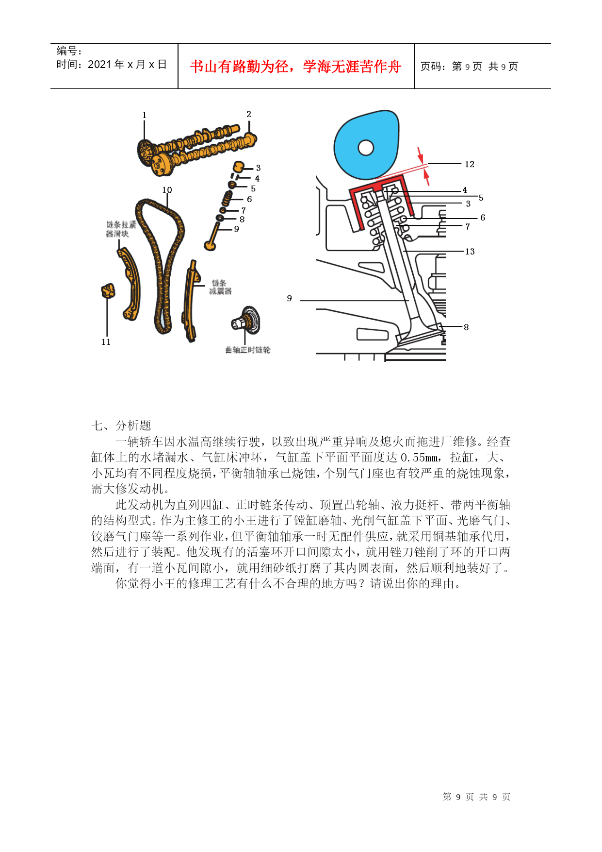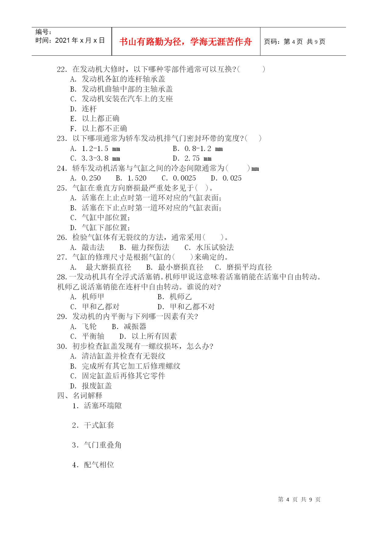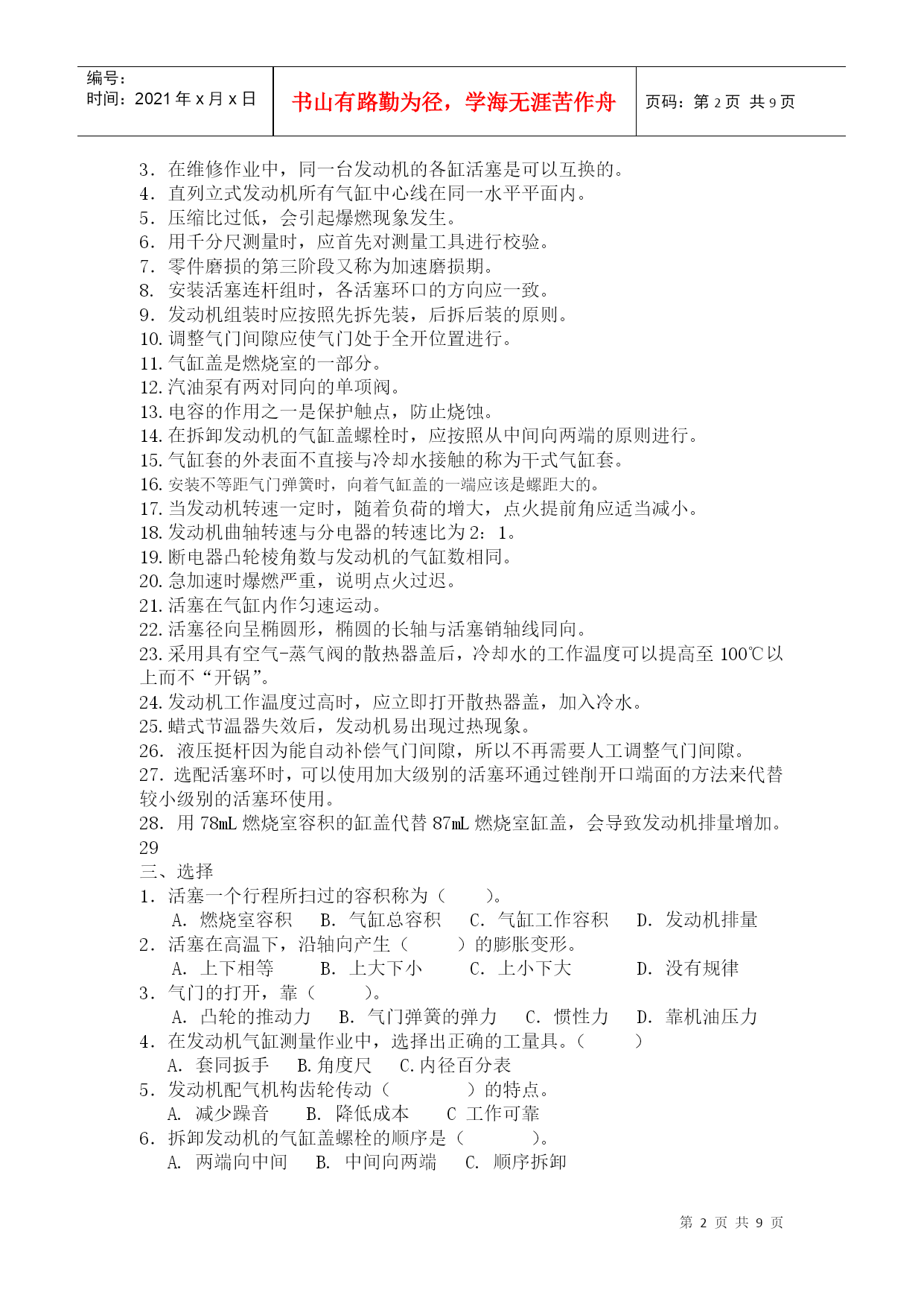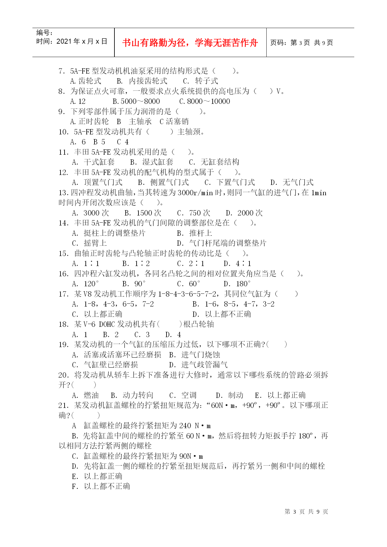编号:时间:2021年x月x日书山有路勤为径,学海无涯苦作舟页码:第PAGE9页共NUMPAGES9页第PAGE\*MERGEFORMAT9页共NUMPAGES\*MERGEFORMAT9页HYPERLINK""一、填空1.汽油机的压缩比一般为;柴油机的压缩比一般为。2.发动机按着火方式的不同,可分为发动机和发动机。3.汽车发动机的作用是将燃烧所产生的转变为。4.活塞的基本结构可分为,和三部分。5.四冲程发动机凸轮轴的布置形式有,和。6.曲轴箱通风方式有和两种。7.活塞常见的损伤有,和等。8.气门工作面磨损,将破坏与的密封性。9.气缸体按曲轴箱的结构形式分为式、式、式三种。丰田5A-FE发动机采用。10.四缸直列四冲程发动机的作功顺序一般是或;六缸直列四冲程发动机作功顺序一般是或。11.曲柄连杆机构的主要零件可分为、和三个组。12.活塞销与销座及连杆小头的配合有及二种形式。13.油环的结构形式有和二种。14.气缸套有和两种。15.曲轴与凸轮轴间的正时传动方式有、、等三种形式。16.丰田5A-FE发动机的曲轴与排气凸轮轴之间采用的是传动;进、排气凸轮轴之间采用齿轮传动,以减小啮合噪声。17.发动机上的英文缩写“DOHC”意为。18.5A-FE发动机润滑油路中,曲轴主轴颈采用润滑。二、判断1.四冲程发动机一个循环,曲轴旋转四周。2.汽油机采用压燃方式点火。3.在维修作业中,同一台发动机的各缸活塞是可以互换的。4.直列立式发动机所有气缸中心线在同一水平平面内。5.压缩比过低,会引起爆燃现象发生。6.用千分尺测量时,应首先对测量工具进行校验。7.零件磨损的第三阶段又称为加速磨损期。8.安装活塞连杆组时,各活塞环口的方向应一致。9.发动机组装时应按照先拆先装,后拆后装的原则。10.调整气门间隙应使气门处于全开位置进行。11.气缸盖是燃烧室的一部分。12.汽油泵有两对同向的单项阀。13.电容的作用之一是保护触点,防止烧蚀。14.在拆卸发动机的气缸盖螺栓时,应按照从中间向两端的原则进行。15.气缸套的外表面不直接与冷却水接触的称为干式气缸套。16.安装不等距气门弹簧时,向着气缸盖的一端应该是螺距大的。17.当发动机转速一定时,随着负荷的增大,点火提前角应适当减小。18.发动机曲轴转速与分电器的转速比为2:1。19.断电器凸轮棱角数与发动机的气缸数相同。20.急加速时爆燃严重,说明点火过迟。21.活塞在气缸内作匀速运动。22.活塞径向呈椭圆形,椭圆的长轴与活塞销轴线同向。23.采用具有空气-蒸气阀的散热器盖后,冷却水的工作温度可以提高至100℃以上而不“开锅”。24.发动机工作温度过高时,应立即打开散热器盖,加入冷水。25.蜡式节温器失效后,发动机易出现过热现象。26.液压挺杆因为能自动补偿气门间隙,所以不再需要人工调整气门间隙。27.选配活塞环时,可以使用加大级别的活塞环通过锉削开口端面的方法来代替较小级别的活塞环使用。28.用78mL燃烧室容积的缸盖代替87mL燃烧室缸盖,会导致发动机排量增加。29三、选择1.活塞一个行程所扫过的容积称为()。A.燃烧室容积B.气缸总容积C.气缸工作容积D.发动机排量2.活塞在高温下,沿轴向产生()的膨胀变形。A.上下相等B.上大下小C.上小下大D.没有规律3.气门的打开,靠()。A.凸轮的推动力B.气门弹簧的弹力C.惯性力D.靠机油压力4.在发动机气缸测量作业中,选择出正确的工量具。()A.套同扳手B.角度尺C.内径百分表5.发动机配气机构齿轮传动()的特点。A.减少躁音B.降低成本C工作可靠6.拆卸发动机的气缸盖螺栓的顺序是()。A.两端向中间B.中间向两端C.顺序拆卸7.5A-FE型发动机机油泵采用的结构形式是()。A.齿轮式B.内接齿轮式C.转子式8.为保证点火可靠,一般要求点火系统提供的高电压为()V。A.12B.5000~8000C.8000~100009.下列零部件属于压力润滑的是()。A.正时齿轮B主轴承C活塞销10.5A-FE型发动机共有()主轴颈。A.6B5C411.丰田5A-FE发动机采用的是()。A.干式缸套B.湿式缸套C.无缸套结构12.丰田5A-FE发动机的配气机构的型式属于()。A.顶置气门式B.侧置气门式C.下置气门式D.无气门式13.四冲程发动机曲轴,当其转速为3000r/min时,则同一气缸的进气门,在1min时间内开闭次数应该是()。A.3000次B.1500次C.750次D.2000次14.丰田5A-FE发动机的气门间隙的调整部位是在()。A.挺柱上的调整
