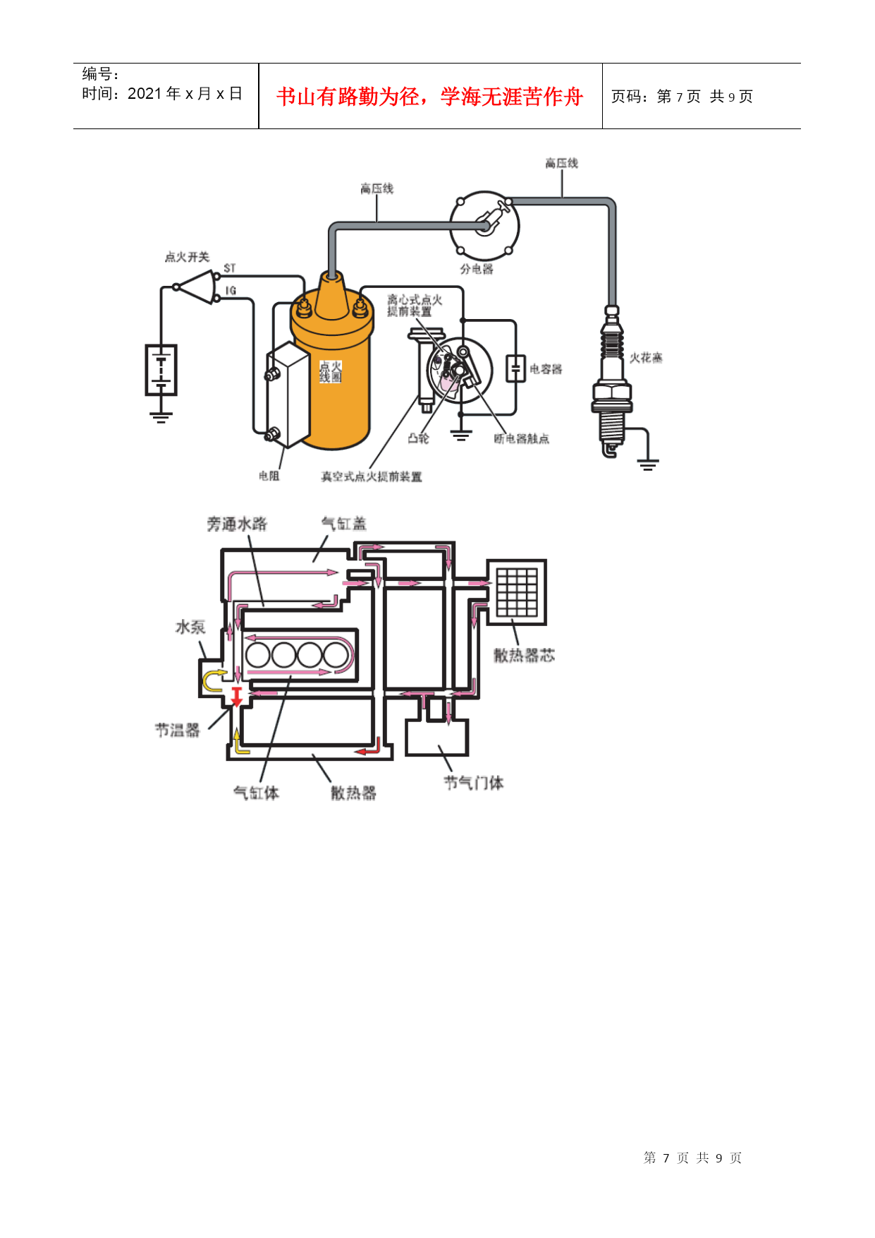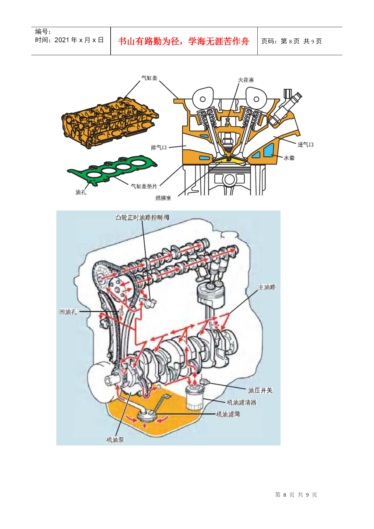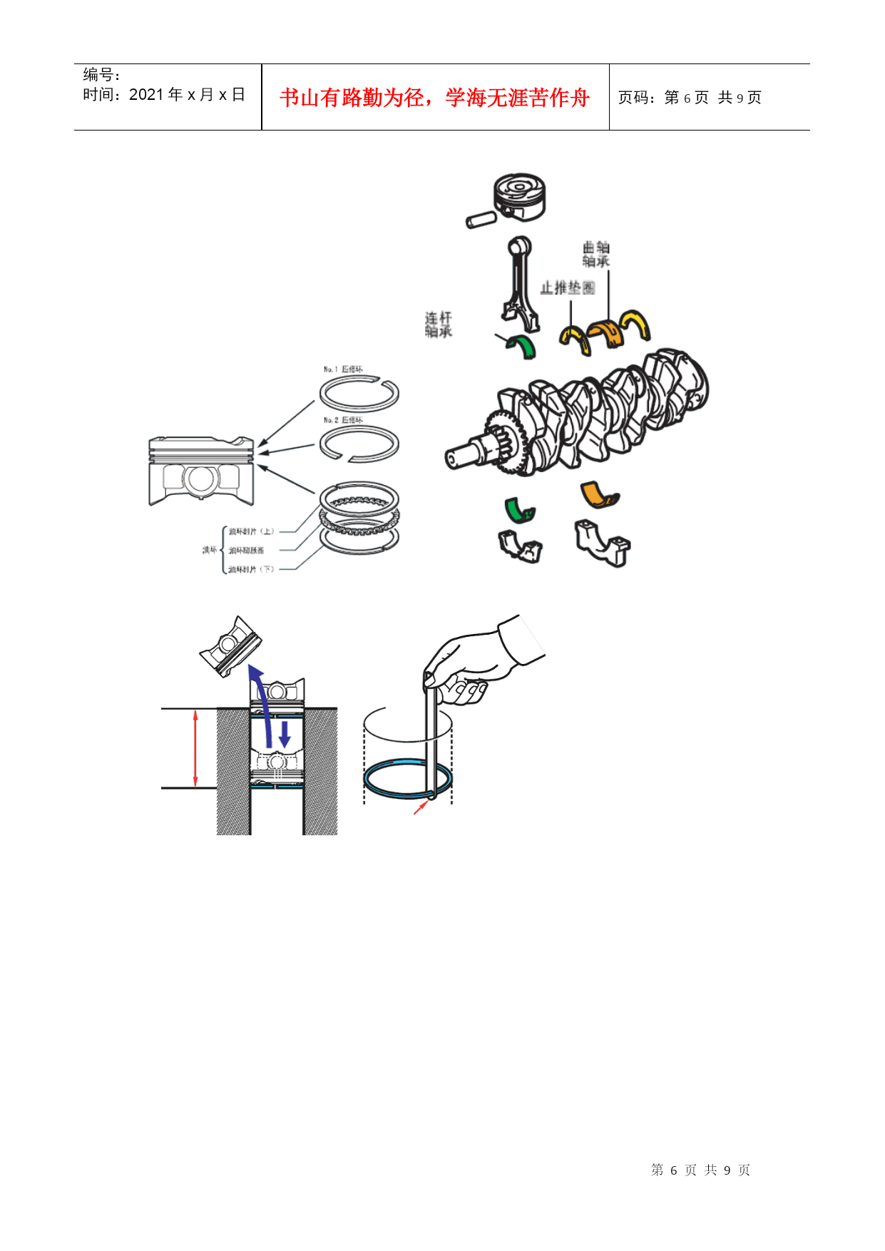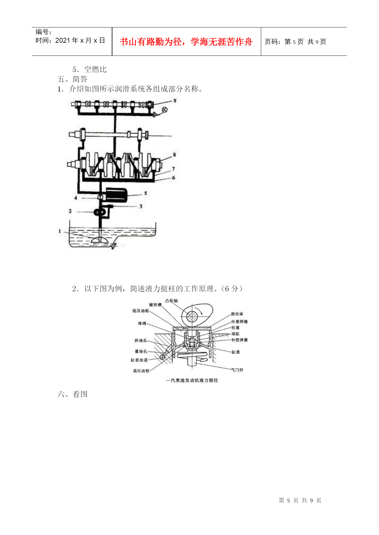 编号:时间:2021年x月x日书山有路勤为径,学海无涯苦作舟页码:第PAGE9页共NUMPAGES9页第PAGE\*MERGEFORMAT9页共NUMPAGES\*MERGEFORMAT9页HYPERLINK""一、填空1.汽油机的压缩比一般为;柴油机的压缩比一般为。2.发动机按着火方式的不同,可分为发动机和发动机。3.汽车发动机的作用是将燃烧所产生的转变为。4.活塞的基本结构可分为,和三部分。5.四冲程发动机凸轮轴的布置形式有,和。6.曲轴箱通风方式有和两种。7.活塞常见的损伤有,和等。8.气门工作面磨损,将破坏与的密封性。9.气缸体按曲轴箱的结构形式分为式、式、式三种。丰田5A-FE发动机采用。10.四缸直列四冲程发动机的作功顺序一般是或;六缸直列四冲程发动机作功顺序一般是或。11.曲柄连杆机构的主要零件可分为、和三个组。12.活塞销与销座及连杆小头的配合有及二种形式。13.油环的结构形式有和二种。14.气缸套有和两种。15.曲轴与凸轮轴间的正时传动方式有、、等三种形式。16.丰田5A-FE发动机的曲轴与排气凸轮轴之间采用的是传动;进、排气凸轮轴之间采用齿轮传动,以减小啮合噪声。17.发动机上的英文缩写“DOHC”意为。18.5A-FE发动机润滑油路中,曲轴主轴颈采用润滑。二、判断1.四冲程发动机一个循环,曲轴旋转四周。2.汽油机采用压燃方式点火。3.在维修作业中,同一台发动机的各缸活塞是可以互换的。4.直列立式发动机所有气缸中心线在同一水平平面内。5.压缩比过低,会引起爆燃现象发生。6.用千分尺测量时,应首先对测量工具进行校验。7.零件磨损的第三阶段又称为加速磨损期。8.安装活塞连杆组时,各活塞环口的方向应一致。9.发动机组装时应按照先拆先装,后拆后装的原则。10.调整气门间隙应使气门处于全开位置进行。11.气缸盖是燃烧室的一部分。12.汽油泵有两对同向的单项阀。13.电容的作用之一是保护触点,防止烧蚀。14.在拆卸发动机的气缸盖螺栓时,应按照从中间向两端的原则进行。15.气缸套的外表面不直接与冷却水接触的称为干式气缸套。16.安装不等距气门弹簧时,向着气缸盖的一端应该是螺距大的。17.当发动机转速一定时,随着负荷的增大,点火提前角应适当减小。18.发动机曲轴转速与分电器的转速比为2:1。19.断电器凸轮棱角数与发动机的气缸数相同。20.急加速时爆燃严重,说明点火过迟。21.活塞在气缸内作匀速运动。22.活塞径向呈椭圆形,椭圆的长轴与活塞销轴线同向。23.采用具有空气-蒸气阀的散热器盖后,冷却水的工作温度可以提高至100℃以上而不“开锅”。24.发动机工作温度过高时,应立即打开散热器盖,加入冷水。25.蜡式节温器失效后,发动机易出现过热现象。26.液压挺杆因为能自动补偿气门间隙,所以不再需要人工调整气门间隙。27.选配活塞环时,可以使用加大级别的活塞环通过锉削开口端面的方法来代替较小级别的活塞环使用。28.用78mL燃烧室容积的缸盖代替87mL燃烧室缸盖,会导致发动机排量增加。29三、选择1.活塞一个行程所扫过的容积称为()。A.燃烧室容积B.气缸总容积C.气缸工作容积D.发动机排量2.活塞在高温下,沿轴向产生()的膨胀变形。A.上下相等B.上大下小C.上小下大D.没有规律3.气门的打开,靠()。A.凸轮的推动力B.气门弹簧的弹力C.惯性力D.靠机油压力4.在发动机气缸测量作业中,选择出正确的工量具。()A.套同扳手B.角度尺C.内径百分表5.发动机配气机构齿轮传动()的特点。A.减少躁音B.降低成本C工作可靠6.拆卸发动机的气缸盖螺栓的顺序是()。A.两端向中间B.中间向两端C.顺序拆卸7.5A-FE型发动机机油泵采用的结构形式是()。A.齿轮式B.内接齿轮式C.转子式8.为保证点火可靠,一般要求点火系统提供的高电压为()V。A.12B.5000~8000C.8000~100009.下列零部件属于压力润滑的是()。A.正时齿轮B主轴承C活塞销10.5A-FE型发动机共有()主轴颈。A.6B5C411.丰田5A-FE发动机采用的是()。A.干式缸套B.湿式缸套C.无缸套结构12.丰田5A-FE发动机的配气机构的型式属于()。A.顶置气门式B.侧置气门式C.下置气门式D.无气门式13.四冲程发动机曲轴,当其转速为3000r/min时,则同一气缸的进气门,在1min时间内开闭次数应该是()。A.3000次B.1500次C.750次D.2000次14.丰田5A-FE发动机的气门间隙的调整部位是在()。A.挺柱上的调整
