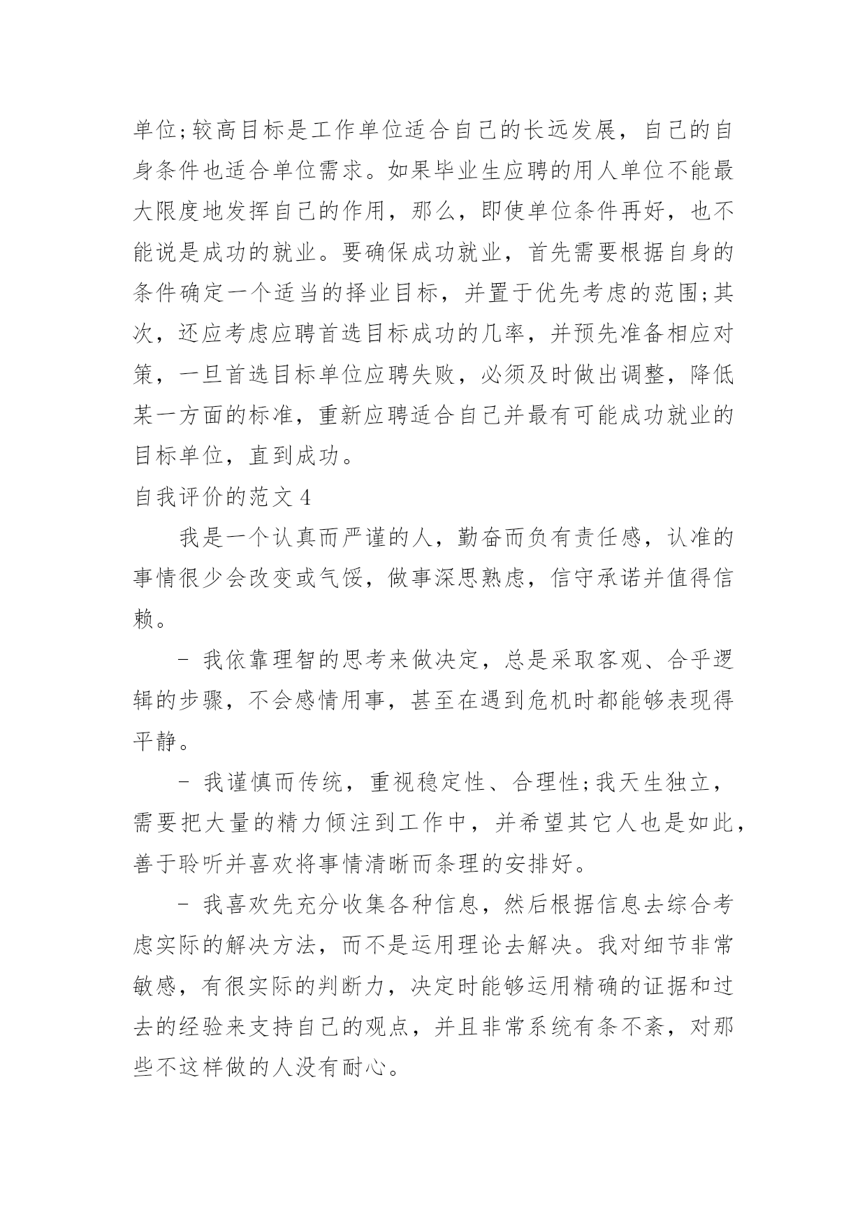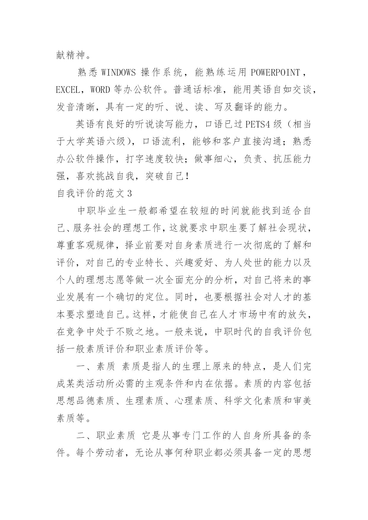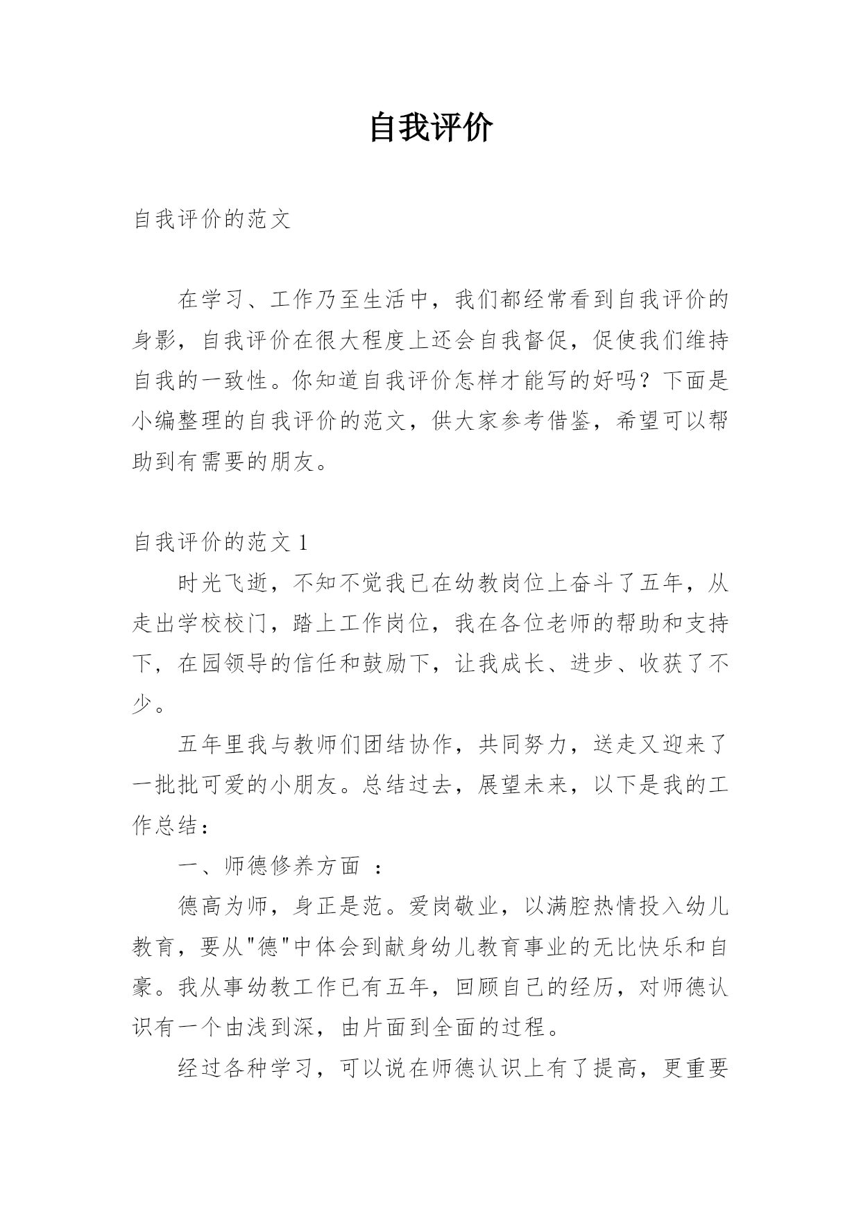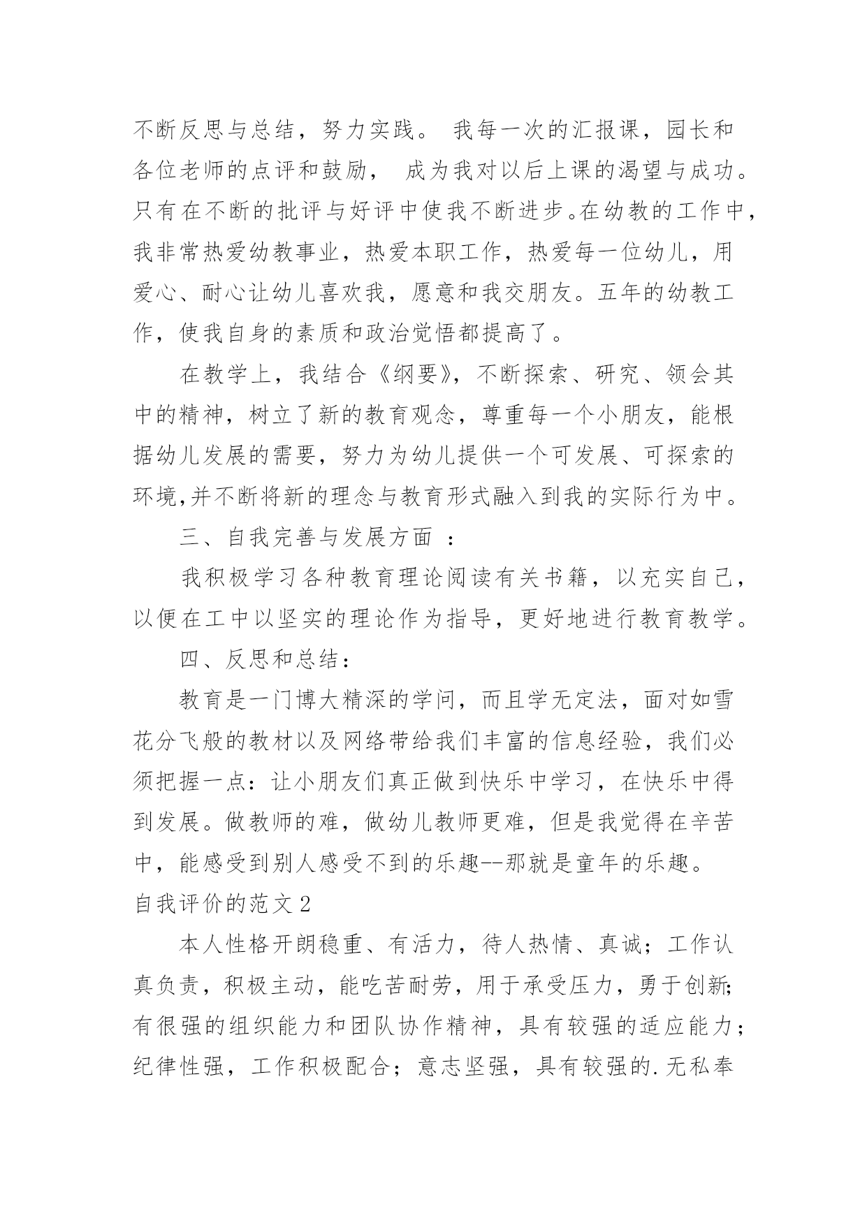 自我评价自我评价的范文在学习、工作乃至生活中,我们都经常看到自我评价的身影,自我评价在很大程度上还会自我督促,促使我们维持自我的一致性。你知道自我评价怎样才能写的好吗?下面是小编整理的自我评价的范文,供大家参考借鉴,希望可以帮助到有需要的朋友。自我评价的范文1时光飞逝,不知不觉我已在幼教岗位上奋斗了五年,从走出学校校门,踏上工作岗位,我在各位老师的帮助和支持下,在园领导的信任和鼓励下,让我成长、进步、收获了不少。五年里我与教师们团结协作,共同努力,送走又迎来了一批批可爱的小朋友。总结过去,展望未来,以下是我的工作总结:一、师德修养方面:德高为师,身正是范。爱岗敬业,以满腔热情投入幼儿教育,要从"德"中体会到献身幼儿教育事业的无比快乐和自豪。我从事幼教工作已有五年,回顾自己的经历,对师德认识有一个由浅到深,由片面到全面的过程。经过各种学习,可以说在师德认识上有了提高,更重要的是,在理论上使我对爱岗敬业有了具体内容和明确目标,我对自己所担负的幼儿教育工作,又有了新的认识。勇于解剖自己,分析自己,正视自己,认真查找自己的缺点和不足,从而不断提高自身的素质和修养。工作中从不迟到和早退,坚持100%出勤,准时参加园长组织的各项会议,认真领会会议精神,虚心向有经验的教师请教和学习。培养跨时代所需要的高素质人才,其基础就是从良好的幼儿教育开始,幼儿教师的一言一行及教育质量,将直接影响到今后小学、中学及大学的学习质量和综合素质能力的提高。人们形容育人职业是"园丁"那是很贴切的,尤其幼儿教育,从事启蒙教育更加显得重要,可以这样说,什么样的教师就培养什么样的学生,育人之本,关键在于师德。二、教育教学方面:我20xx年毕业于湛江市幼儿师范学校,三年的师范生活炼就了我扎实的'基本功,进入工作岗位后,成为一名真正的幼教老师,理论和实践的有机结合,不断在教学中积累总结教育教学经验,与同事们交流、探索研究新方法,新方案;生活中,我和小朋友们打成一片,成为小朋友们的好朋友。在教学中,对自己的工作表现也有满意与不足,但无论怎样,都需要自己踏踏实实的工作,实实在在的做人。作为教学经验尚浅的我,经常向其他老师请教,并观摩她们的教学活动来学以致用,取长补短。为做好教学工作,我认真制定教案,做好每次教师汇报课的工作,并根据小朋友们的特点设计教学活动。在教法上,不断反思与总结,努力实践。我每一次的汇报课,园长和各位老师的点评和鼓励,成为我对以后上课的渴望与成功。只有在不断的批评与好评中使我不断进步。在幼教的工作中,我非常热爱幼教事业,热爱本职工作,热爱每一位幼儿,用爱心、耐心让幼儿喜欢我,愿意和我交朋友。五年的幼教工作,使我自身的素质和政治觉悟都提高了。在教学上,我结合《纲要》,不断探索、研究、领会其中的精神,树立了新的教育观念,尊重每一个小朋友,能根据幼儿发展的需要,努力为幼儿提供一个可发展、可探索的环境,并不断将新的理念与教育形式融入到我的实际行为中。三、自我完善与发展方面:我积极学习各种教育理论阅读有关书籍,以充实自己,以便在工中以坚实的理论作为指导,更好地进行教育教学。四、反思和总结:教育是一门博大精深的学问,而且学无定法,面对如雪花分飞般的教材以及网络带给我们丰富的信息经验,我们必须把握一点:让小朋友们真正做到快乐中学习,在快乐中得到发展。做教师的难,做幼儿教师更难,但是我觉得在辛苦中,能感受到别人感受不到的乐趣--那就是童年的乐趣。自我评价的范文2本人性格开朗稳重、有活力,待人热情、真诚;工作认真负责,积极主动,能吃苦耐劳,用于承受压力,勇于创新;有很强的组织能力和团队协作精神,具有较强的适应能力;纪律性强,工作积极配合;意志坚强,具有较强的.无私奉献精神。熟悉WINDOWS操作系统,能熟练运用POWERPOINT,EXCEL,WORD等办公软件。普通话标准,能用英语自如交谈,发音清晰,具有一定的听、说、读、写及翻译的能力。英语有良好的听说读写能力,口语已过PETS4级(相当于大学英语六级),口语流利,能够和客户直接沟通;熟悉办公软件操作,打字速度较快;做事细心,负责、抗压能力强,喜欢挑战自我,突破自己!自我评价的范文3中职毕业生一般都希望在较短的时间就能找到适合自己、服务社会的理想工作,这就要求中职生要了解社会现状,尊重客观规律,择业前要对自身素质进行一次彻底的了解和评价,对自己的专业特长、兴趣爱好、为人处世的能力以及个人的理想志愿等做一次全面充分的分析,对自己将来的事业发展有一个确切的定位。同时,也要根据社会对人才的基本要求塑造自己。这样,才能使自己在人才市场中有的放矢,在竞争中处于不败之地。一般来说,中职时代的自我评价包括一般素质评价和职业素质评价等。一、素质素质是指人的生理上原来的特点,是人们完成某类活动所必需的主观条件和内在依据。素质的内容包括