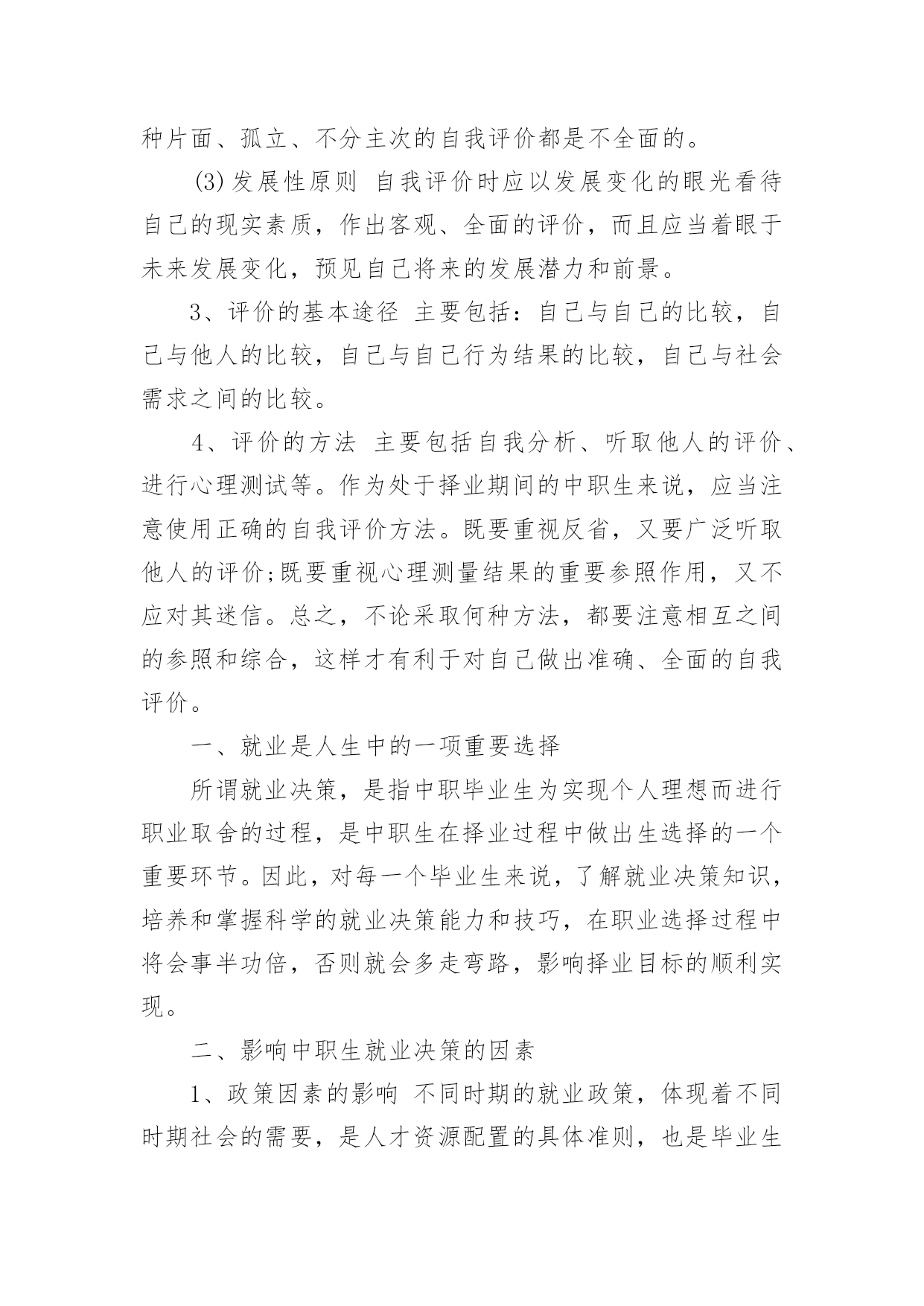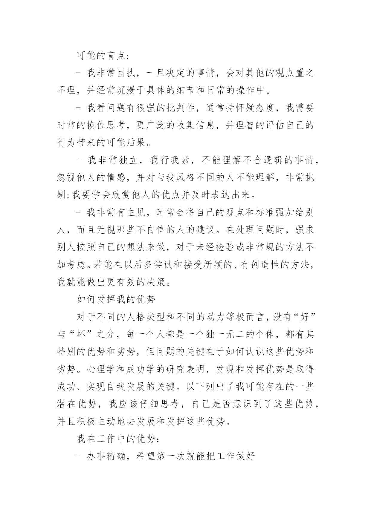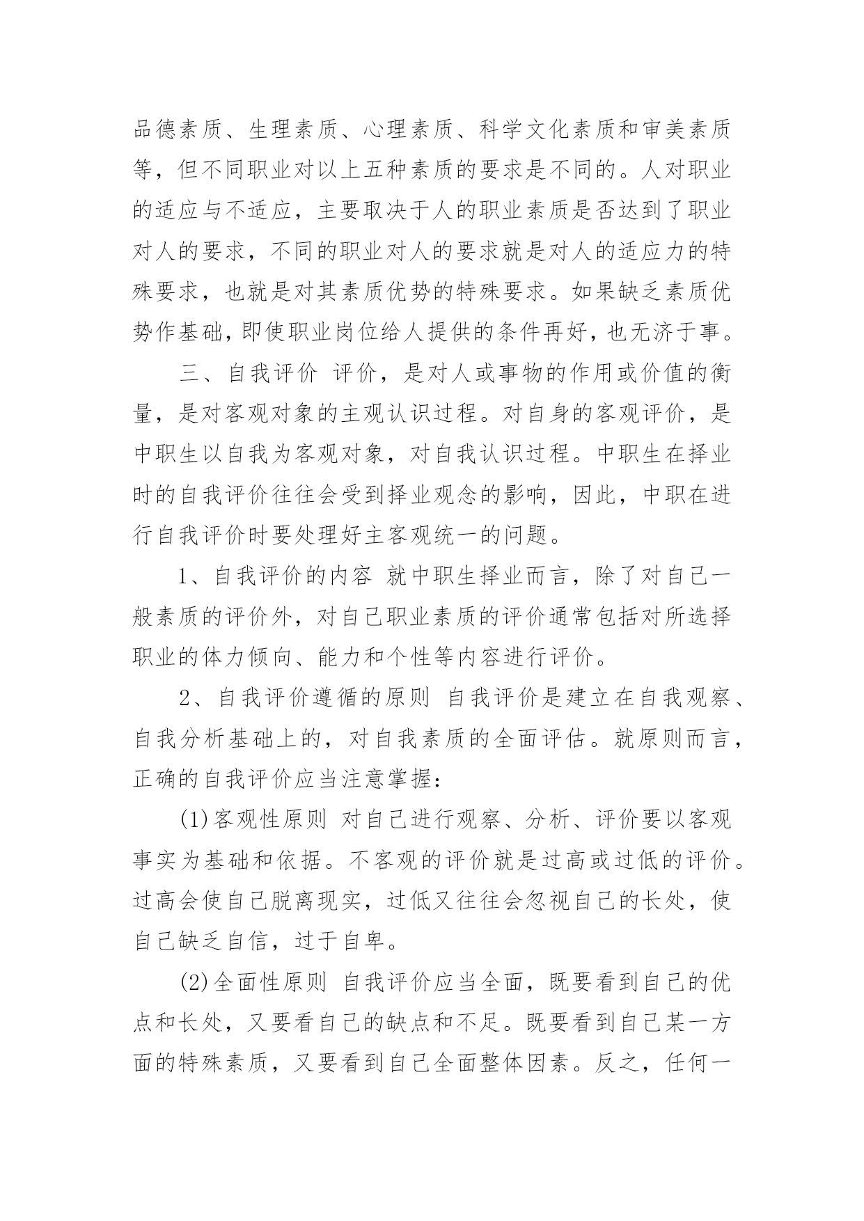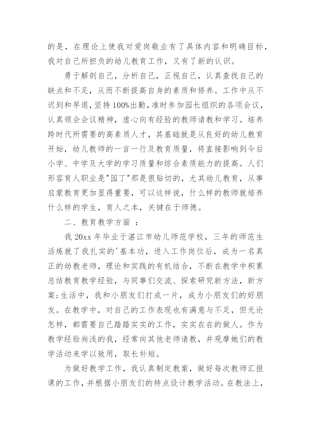 自我评价自我评价的范文在学习、工作乃至生活中,我们都经常看到自我评价的身影,自我评价在很大程度上还会自我督促,促使我们维持自我的一致性。你知道自我评价怎样才能写的好吗?下面是小编整理的自我评价的范文,供大家参考借鉴,希望可以帮助到有需要的朋友。自我评价的范文1时光飞逝,不知不觉我已在幼教岗位上奋斗了五年,从走出学校校门,踏上工作岗位,我在各位老师的帮助和支持下,在园领导的信任和鼓励下,让我成长、进步、收获了不少。五年里我与教师们团结协作,共同努力,送走又迎来了一批批可爱的小朋友。总结过去,展望未来,以下是我的工作总结:一、师德修养方面:德高为师,身正是范。爱岗敬业,以满腔热情投入幼儿教育,要从"德"中体会到献身幼儿教育事业的无比快乐和自豪。我从事幼教工作已有五年,回顾自己的经历,对师德认识有一个由浅到深,由片面到全面的过程。经过各种学习,可以说在师德认识上有了提高,更重要的是,在理论上使我对爱岗敬业有了具体内容和明确目标,我对自己所担负的幼儿教育工作,又有了新的认识。勇于解剖自己,分析自己,正视自己,认真查找自己的缺点和不足,从而不断提高自身的素质和修养。工作中从不迟到和早退,坚持100%出勤,准时参加园长组织的各项会议,认真领会会议精神,虚心向有经验的教师请教和学习。培养跨时代所需要的高素质人才,其基础就是从良好的幼儿教育开始,幼儿教师的一言一行及教育质量,将直接影响到今后小学、中学及大学的学习质量和综合素质能力的提高。人们形容育人职业是"园丁"那是很贴切的,尤其幼儿教育,从事启蒙教育更加显得重要,可以这样说,什么样的教师就培养什么样的学生,育人之本,关键在于师德。二、教育教学方面:我20xx年毕业于湛江市幼儿师范学校,三年的师范生活炼就了我扎实的'基本功,进入工作岗位后,成为一名真正的幼教老师,理论和实践的有机结合,不断在教学中积累总结教育教学经验,与同事们交流、探索研究新方法,新方案;生活中,我和小朋友们打成一片,成为小朋友们的好朋友。在教学中,对自己的工作表现也有满意与不足,但无论怎样,都需要自己踏踏实实的工作,实实在在的做人。作为教学经验尚浅的我,经常向其他老师请教,并观摩她们的教学活动来学以致用,取长补短。为做好教学工作,我认真制定教案,做好每次教师汇报课的工作,并根据小朋友们的特点设计教学活动。在教法上,不断反思与总结,努力实践。我每一次的汇报课,园长和各位老师的点评和鼓励,成为我对以后上课的渴望与成功。只有在不断的批评与好评中使我不断进步。在幼教的工作中,我非常热爱幼教事业,热爱本职工作,热爱每一位幼儿,用爱心、耐心让幼儿喜欢我,愿意和我交朋友。五年的幼教工作,使我自身的素质和政治觉悟都提高了。在教学上,我结合《纲要》,不断探索、研究、领会其中的精神,树立了新的教育观念,尊重每一个小朋友,能根据幼儿发展的需要,努力为幼儿提供一个可发展、可探索的环境,并不断将新的理念与教育形式融入到我的实际行为中。三、自我完善与发展方面:我积极学习各种教育理论阅读有关书籍,以充实自己,以便在工中以坚实的理论作为指导,更好地进行教育教学。四、反思和总结:教育是一门博大精深的学问,而且学无定法,面对如雪花分飞般的教材以及网络带给我们丰富的信息经验,我们必须把握一点:让小朋友们真正做到快乐中学习,在快乐中得到发展。做教师的难,做幼儿教师更难,但是我觉得在辛苦中,能感受到别人感受不到的乐趣--那就是童年的乐趣。自我评价的范文2本人性格开朗稳重、有活力,待人热情、真诚;工作认真负责,积极主动,能吃苦耐劳,用于承受压力,勇于创新;有很强的组织能力和团队协作精神,具有较强的适应能力;纪律性强,工作积极配合;意志坚强,具有较强的.无私奉献精神。熟悉WINDOWS操作系统,能熟练运用POWERPOINT,EXCEL,WORD等办公软件。普通话标准,能用英语自如交谈,发音清晰,具有一定的听、说、读、写及翻译的能力。英语有良好的听说读写能力,口语已过PETS4级(相当于大学英语六级),口语流利,能够和客户直接沟通;熟悉办公软件操作,打字速度较快;做事细心,负责、抗压能力强,喜欢挑战自我,突破自己!自我评价的范文3中职毕业生一般都希望在较短的时间就能找到适合自己、服务社会的理想工作,这就要求中职生要了解社会现状,尊重客观规律,择业前要对自身素质进行一次彻底的了解和评价,对自己的专业特长、兴趣爱好、为人处世的能力以及个人的理想志愿等做一次全面充分的分析,对自己将来的事业发展有一个确切的定位。同时,也要根据社会对人才的基本要求塑造自己。这样,才能使自己在人才市场中有的放矢,在竞争中处于不败之地。一般来说,中职时代的自我评价包括一般素质评价和职业素质评价等。一、素质素质是指人的生理上原来的特点,是人们完成某类活动所必需的主观条件和内在依据。素质的内容包括