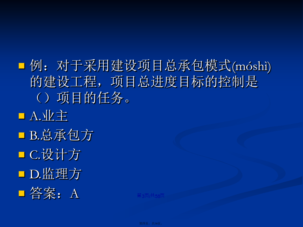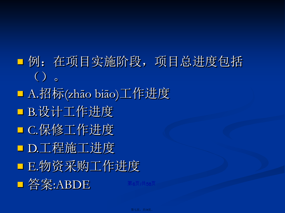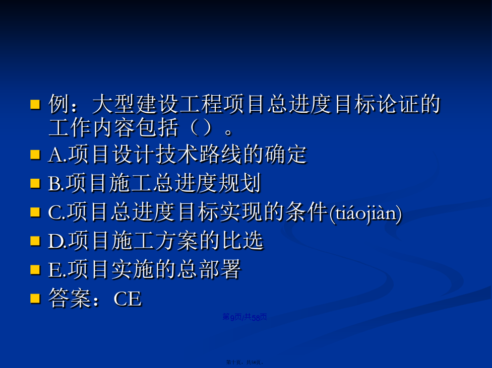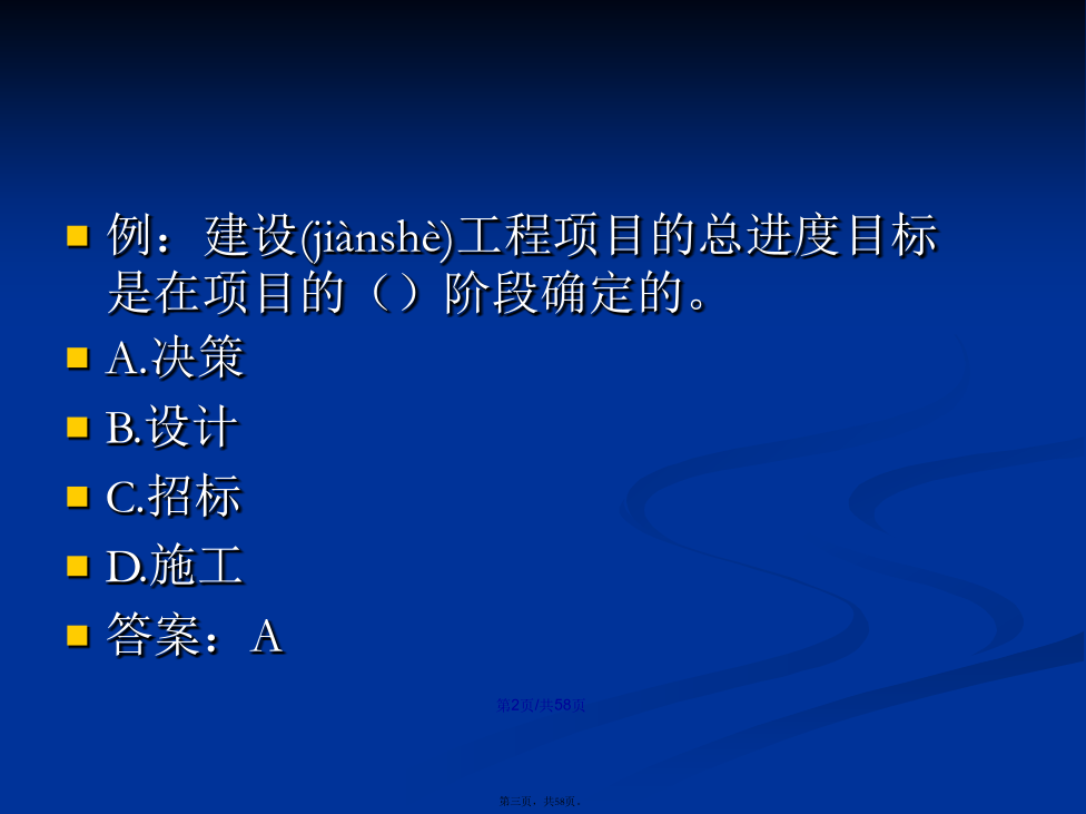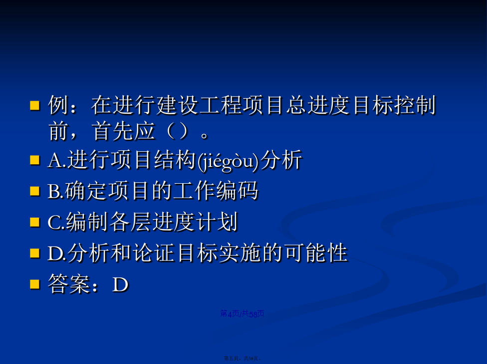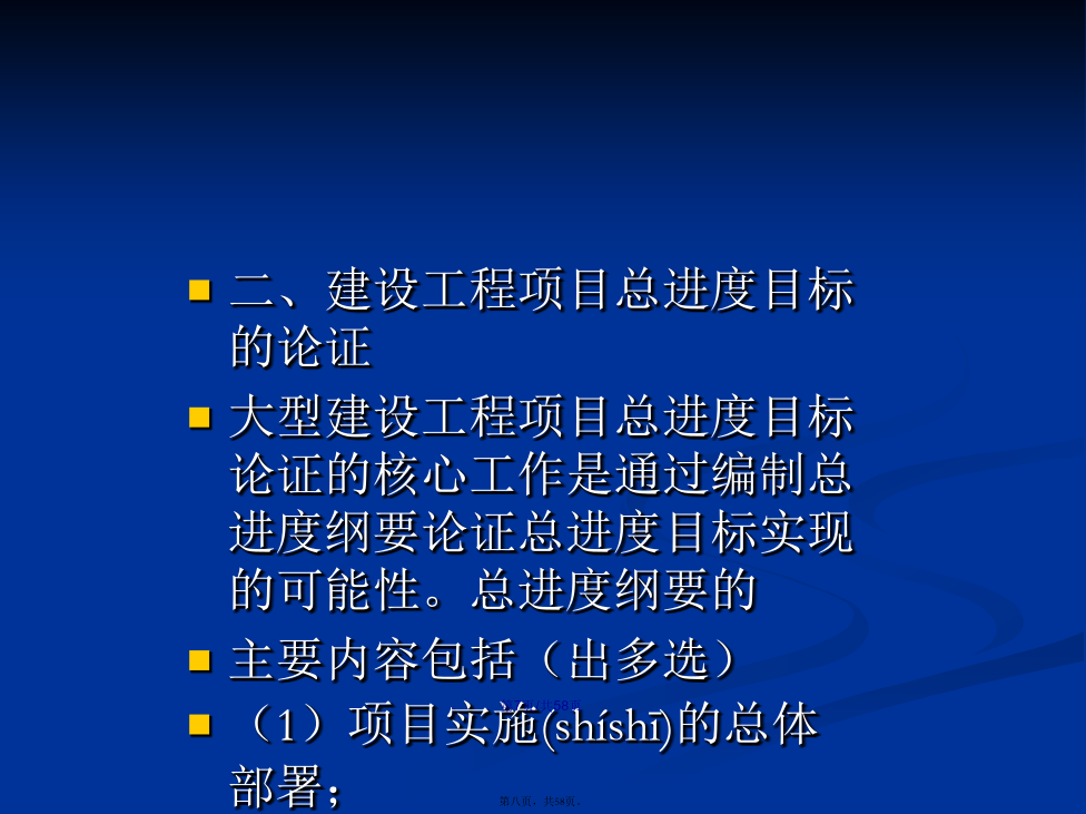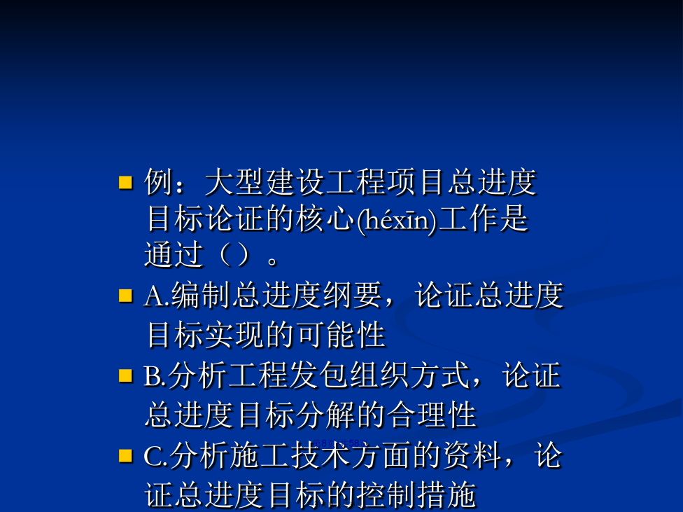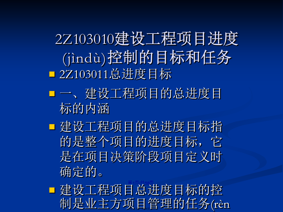 会计学2Z103010建设工程项目进度(jìndù)控制的目标和任务2Z103012进度控制(kòngzhì)的任务2Z103020施工进度计划(jìhuà)的类型及其作用2Z103022控制性施工进度计划(jìhuà)的作用2Z103023实施性施工进度计划(jìhuà)的作用2Z103040施工进度控制(kòngzhì)的任务和措施2Z103042施工进度控制(kòngzhì)的措施