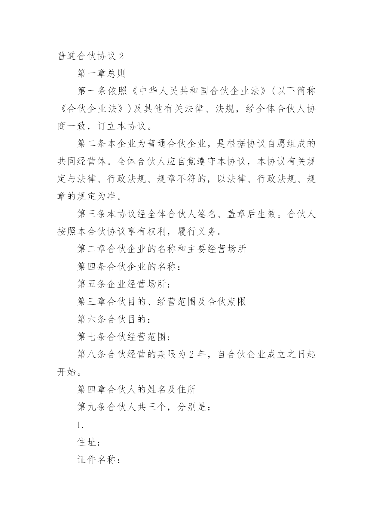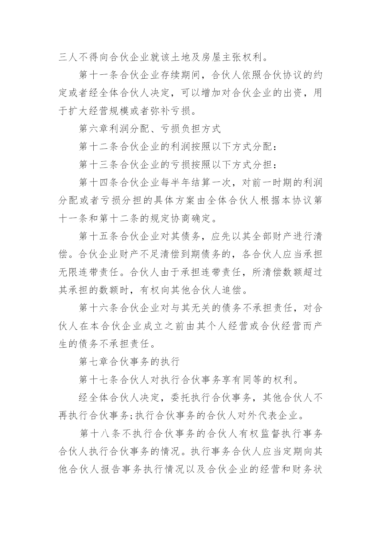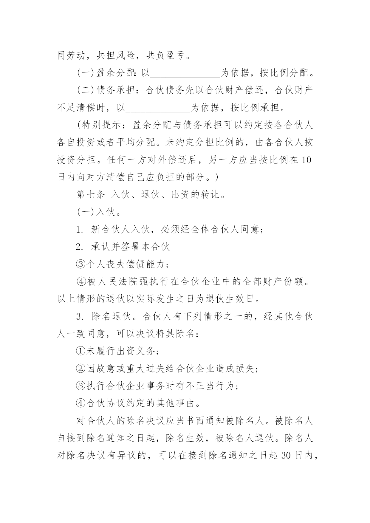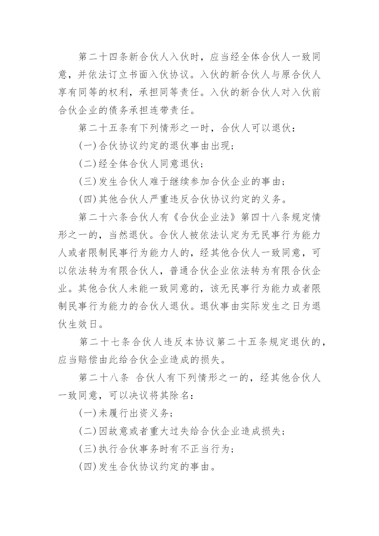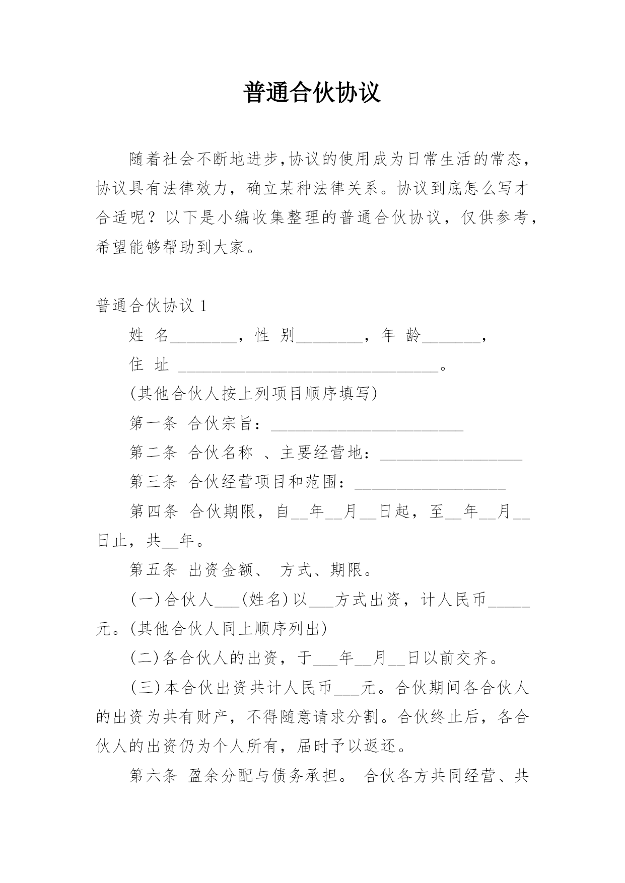 普通合伙协议随着社会不断地进步,协议的使用成为日常生活的常态,协议具有法律效力,确立某种法律关系。协议到底怎么写才合适呢?以下是小编收集整理的普通合伙协议,仅供参考,希望能够帮助到大家。普通合伙协议1姓名________,性别________,年龄_______,住址_______________________________。(其他合伙人按上列项目顺序填写)第一条合伙宗旨:_______________________第二条合伙名称、主要经营地:_________________第三条合伙经营项目和范围:__________________第四条合伙期限,自__年__月__日起,至__年__月__日止,共__年。第五条出资金额、方式、期限。(一)合伙人___(姓名)以___方式出资,计人民币_____元。(其他合伙人同上顺序列出)(二)各合伙人的出资,于___年__月__日以前交齐。(三)本合伙出资共计人民币___元。合伙期间各合伙人的出资为共有财产,不得随意请求分割。合伙终止后,各合伙人的出资仍为个人所有,届时予以返还。第六条盈余分配与债务承担。合伙各方共同经营、共同劳动,共担风险,共负盈亏。(一)盈余分配:以______________为依据,按比例分配。(二)债务承担:合伙债务先以合伙财产偿还,合伙财产不足清偿时,以_____________为依据,按比例承担。(特别提示:盈余分配与债务承担可以约定按各合伙人各自投资或者平均分配。未约定分担比例的,由各合伙人按投资分担。任何一方对外偿还后,另一方应当按比例在10日内向对方清偿自己应负担的部分。)第七条入伙、退伙、出资的转让。(一)入伙。1.新合伙人入伙,必须经全体合伙人同意;2.承认并签署本合伙③个人丧失偿债能力;④被人民法院强执行在合伙企业中的全部财产份额。以上情形的退伙以实际发生之日为退伙生效日。3.除名退伙。合伙人有下列情形之一的,经其他合伙人一致同意,可以决议将其除名:①未履行出资义务;②因故意或重大过失给合伙企业造成损失;③执行合伙企业事务时有不正当行为;④合伙协议约定的其他事由。对合伙人的除名决议应当书面通知被除名人。被除名人自接到除名通知之日起,除名生效,被除名人退伙。除名人对除名决议有异议的,可以在接到除名通知之日起30日内,向人民法院起诉。合伙人退伙后,其他合伙人与该退伙人按退伙时的合伙企业的财产状况进行结算。(三)出资的转让。允许合伙人转让其在合伙中的全部或部分财产份额。在同等条件下,合伙人有优先受让权。如向合伙人以外的第三人转让,第三人应按入伙对待,否则以退伙对待转让人。合伙人以外的第三人受让合伙企业财产份额的,经修改合伙协议即成为合伙企业的合伙人。第八条合伙负责人及合伙事务执行。(一)全体合伙人共同执行合伙企业事务。(适用于规模小的合伙企业。)(二)合伙协议约定或全体合伙人决定,委托_______为合伙负责人,其权限为:1.对外开展业务,订立合同;2.对合伙事业进行日常管理;3.出售合伙的产品(货物)、购进常用货物;4.支付合伙债务;5._____________________。第九条合伙人的权利和义务。(一)合伙人的权利:1.合伙事务的经营权、决定权和监督权,合伙的'经营活动由合伙人共同决定,无论出资多少,每个人都有表决权;2.合伙人享有合伙利益的分配权;3.合伙人分配合伙利益应以出资额比例或者按合同的约定进行,合伙经营积累的财产归合伙人共有;4.合伙人有退伙的权利。(二)合伙人的义务:1.按照合伙协议的约定维护合伙财产的统一;2.分担合伙的经营损失的债务;3.为合伙债务承担连带责任。第十条禁止行为。(一)未经全体合伙人同意,禁止任何合伙人私自以合伙名义进行业务活动;如其业务获得利益归合伙,造成的损失按实际损失进行赔偿。(二)禁止合伙人参与经营与本合伙竞争的业务;(三)除合伙协议另有约定或者经全体合伙人同意外,合伙人不得同本合伙进行交易。(四)合伙人不得从事损害本合伙企业利益的活动。第十一条合伙营业的继续。(一)在退伙的情况下,其余合伙人有权继续以原企业名称继续经营原企业业务,也可以选择、吸收新的合伙人入伙经营。(二)在合伙人死亡或被宣告死亡的情况下,依死亡合伙人的继承人的选择,既可以退继承人应继承的财产份额,继续经营;也可依照合伙协议的约定或者经全体合伙人同意,接纳继承人为新的合伙人继续经营。第十二条合伙的终止和清算。(一)合伙因下列情形解散:1.合伙期限届满;2.全体合伙人同意终止合伙关系;3.已不具备法定合伙人数;4.合伙事务完成或不能完成;5.被依法撤销;6.出现法律、行政法规规定的合伙企业解散的其他原因。(二)合伙的清算:1.合伙解散后应当进行清算,并通知债权人。2.清算人由全体合伙人担任或经全体合伙人过半数同意,自合伙企业解
