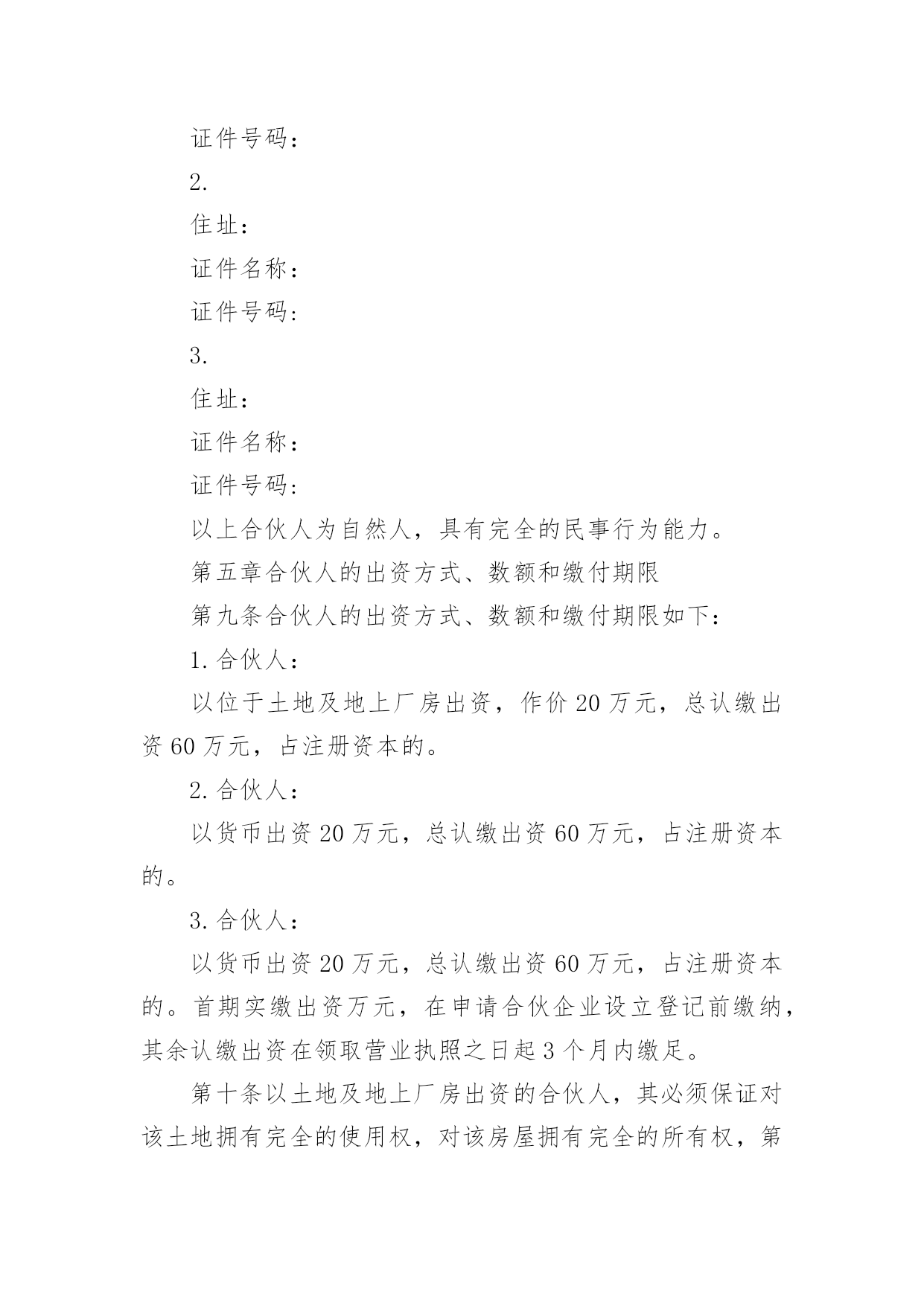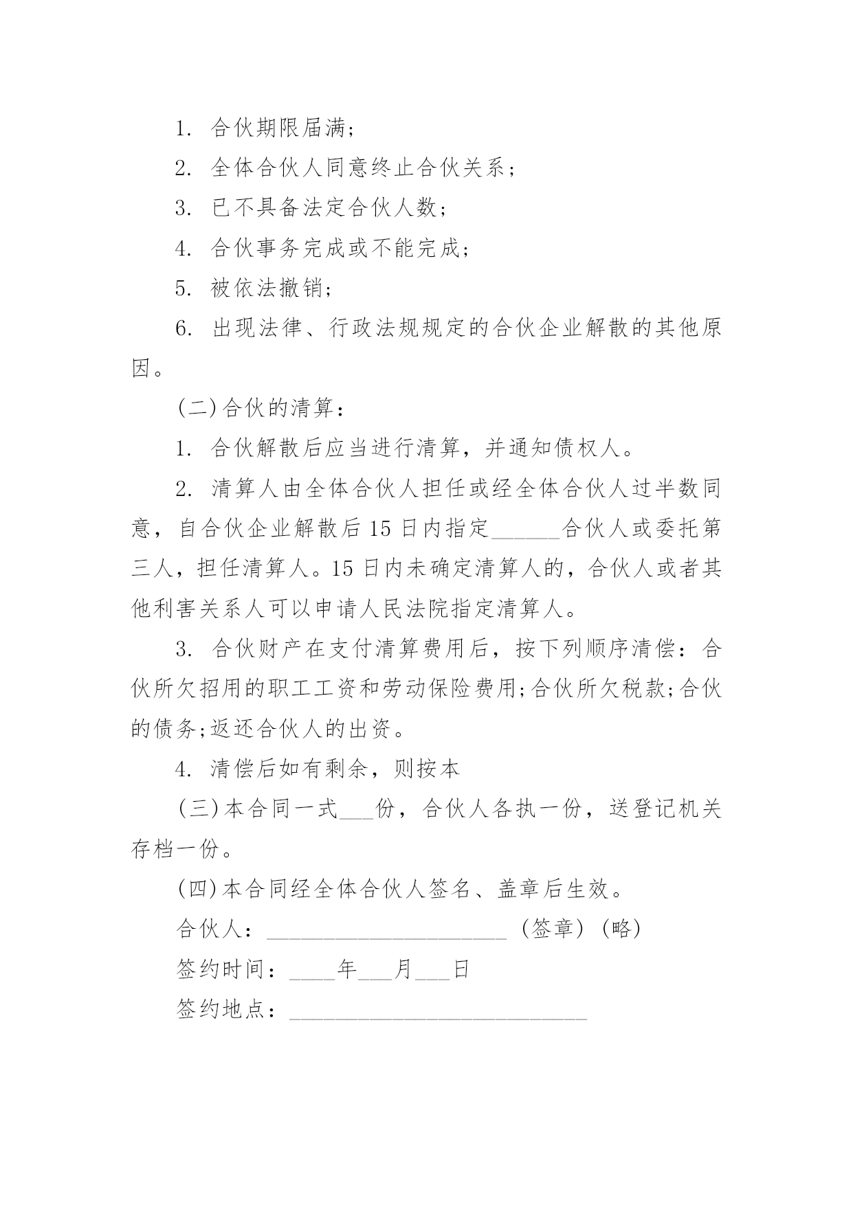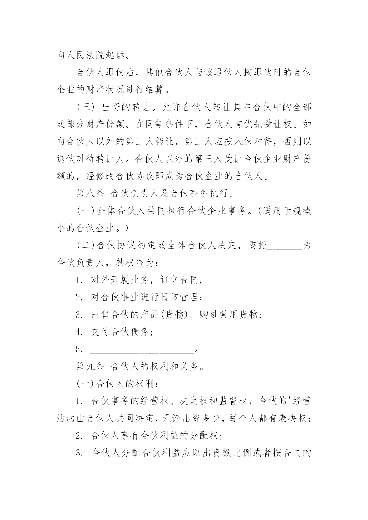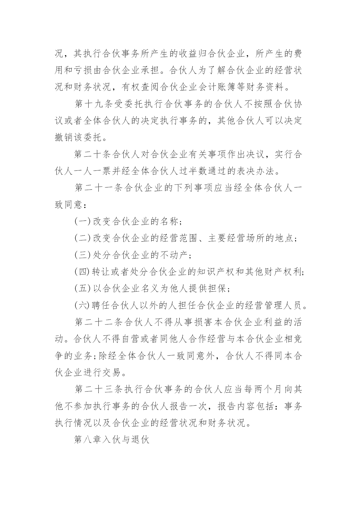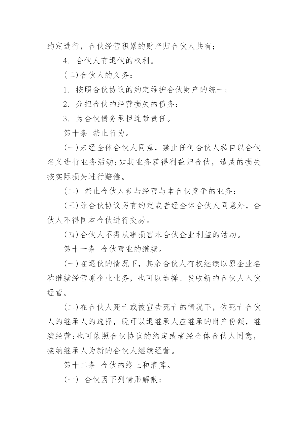普通合伙协议随着社会不断地进步,协议的使用成为日常生活的常态,协议具有法律效力,确立某种法律关系。协议到底怎么写才合适呢?以下是小编收集整理的普通合伙协议,仅供参考,希望能够帮助到大家。普通合伙协议1姓名________,性别________,年龄_______,住址_______________________________。(其他合伙人按上列项目顺序填写)第一条合伙宗旨:_______________________第二条合伙名称、主要经营地:_________________第三条合伙经营项目和范围:__________________第四条合伙期限,自__年__月__日起,至__年__月__日止,共__年。第五条出资金额、方式、期限。(一)合伙人___(姓名)以___方式出资,计人民币_____元。(其他合伙人同上顺序列出)(二)各合伙人的出资,于___年__月__日以前交齐。(三)本合伙出资共计人民币___元。合伙期间各合伙人的出资为共有财产,不得随意请求分割。合伙终止后,各合伙人的出资仍为个人所有,届时予以返还。第六条盈余分配与债务承担。合伙各方共同经营、共同劳动,共担风险,共负盈亏。(一)盈余分配:以______________为依据,按比例分配。(二)债务承担:合伙债务先以合伙财产偿还,合伙财产不足清偿时,以_____________为依据,按比例承担。(特别提示:盈余分配与债务承担可以约定按各合伙人各自投资或者平均分配。未约定分担比例的,由各合伙人按投资分担。任何一方对外偿还后,另一方应当按比例在10日内向对方清偿自己应负担的部分。)第七条入伙、退伙、出资的转让。(一)入伙。1.新合伙人入伙,必须经全体合伙人同意;2.承认并签署本合伙③个人丧失偿债能力;④被人民法院强执行在合伙企业中的全部财产份额。以上情形的退伙以实际发生之日为退伙生效日。3.除名退伙。合伙人有下列情形之一的,经其他合伙人一致同意,可以决议将其除名:①未履行出资义务;②因故意或重大过失给合伙企业造成损失;③执行合伙企业事务时有不正当行为;④合伙协议约定的其他事由。对合伙人的除名决议应当书面通知被除名人。被除名人自接到除名通知之日起,除名生效,被除名人退伙。除名人对除名决议有异议的,可以在接到除名通知之日起30日内,向人民法院起诉。合伙人退伙后,其他合伙人与该退伙人按退伙时的合伙企业的财产状况进行结算。(三)出资的转让。允许合伙人转让其在合伙中的全部或部分财产份额。在同等条件下,合伙人有优先受让权。如向合伙人以外的第三人转让,第三人应按入伙对待,否则以退伙对待转让人。合伙人以外的第三人受让合伙企业财产份额的,经修改合伙协议即成为合伙企业的合伙人。第八条合伙负责人及合伙事务执行。(一)全体合伙人共同执行合伙企业事务。(适用于规模小的合伙企业。)(二)合伙协议约定或全体合伙人决定,委托_______为合伙负责人,其权限为:1.对外开展业务,订立合同;2.对合伙事业进行日常管理;3.出售合伙的产品(货物)、购进常用货物;4.支付合伙债务;5._____________________。第九条合伙人的权利和义务。(一)合伙人的权利:1.合伙事务的经营权、决定权和监督权,合伙的'经营活动由合伙人共同决定,无论出资多少,每个人都有表决权;2.合伙人享有合伙利益的分配权;3.合伙人分配合伙利益应以出资额比例或者按合同的约定进行,合伙经营积累的财产归合伙人共有;4.合伙人有退伙的权利。(二)合伙人的义务:1.按照合伙协议的约定维护合伙财产的统一;2.分担合伙的经营损失的债务;3.为合伙债务承担连带责任。第十条禁止行为。(一)未经全体合伙人同意,禁止任何合伙人私自以合伙名义进行业务活动;如其业务获得利益归合伙,造成的损失按实际损失进行赔偿。(二)禁止合伙人参与经营与本合伙竞争的业务;(三)除合伙协议另有约定或者经全体合伙人同意外,合伙人不得同本合伙进行交易。(四)合伙人不得从事损害本合伙企业利益的活动。第十一条合伙营业的继续。(一)在退伙的情况下,其余合伙人有权继续以原企业名称继续经营原企业业务,也可以选择、吸收新的合伙人入伙经营。(二)在合伙人死亡或被宣告死亡的情况下,依死亡合伙人的继承人的选择,既可以退继承人应继承的财产份额,继续经营;也可依照合伙协议的约定或者经全体合伙人同意,接纳继承人为新的合伙人继续经营。第十二条合伙的终止和清算。(一)合伙因下列情形解散:1.合伙期限届满;2.全体合伙人同意终止合伙关系;3.已不具备法定合伙人数;4.合伙事务完成或不能完成;5.被依法撤销;6.出现法律、行政法规规定的合伙企业解散的其他原因。(二)合伙的清算:1.合伙解散后应当进行清算,并通知债权人。2.清算人由全体合伙人担任或经全体合伙人过半数同意,自合伙企业解