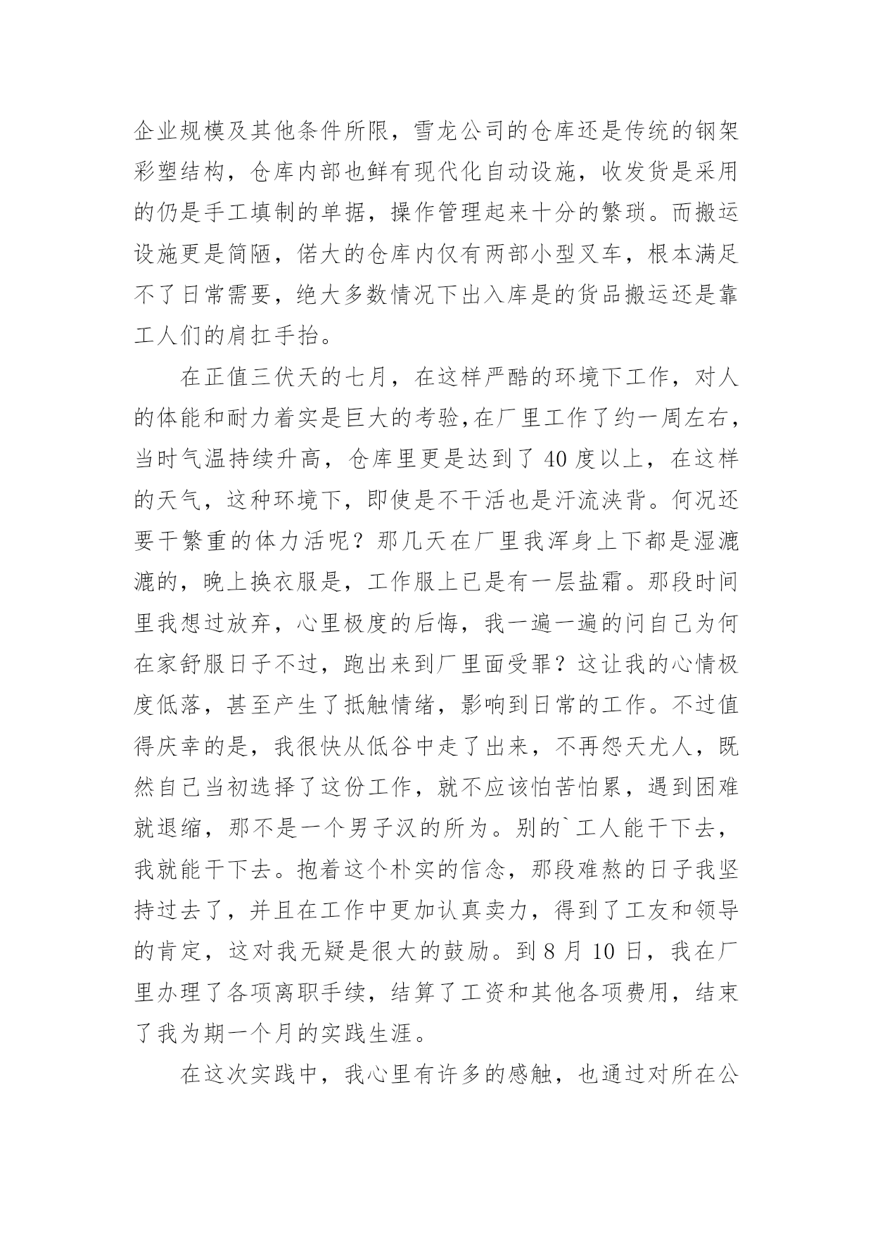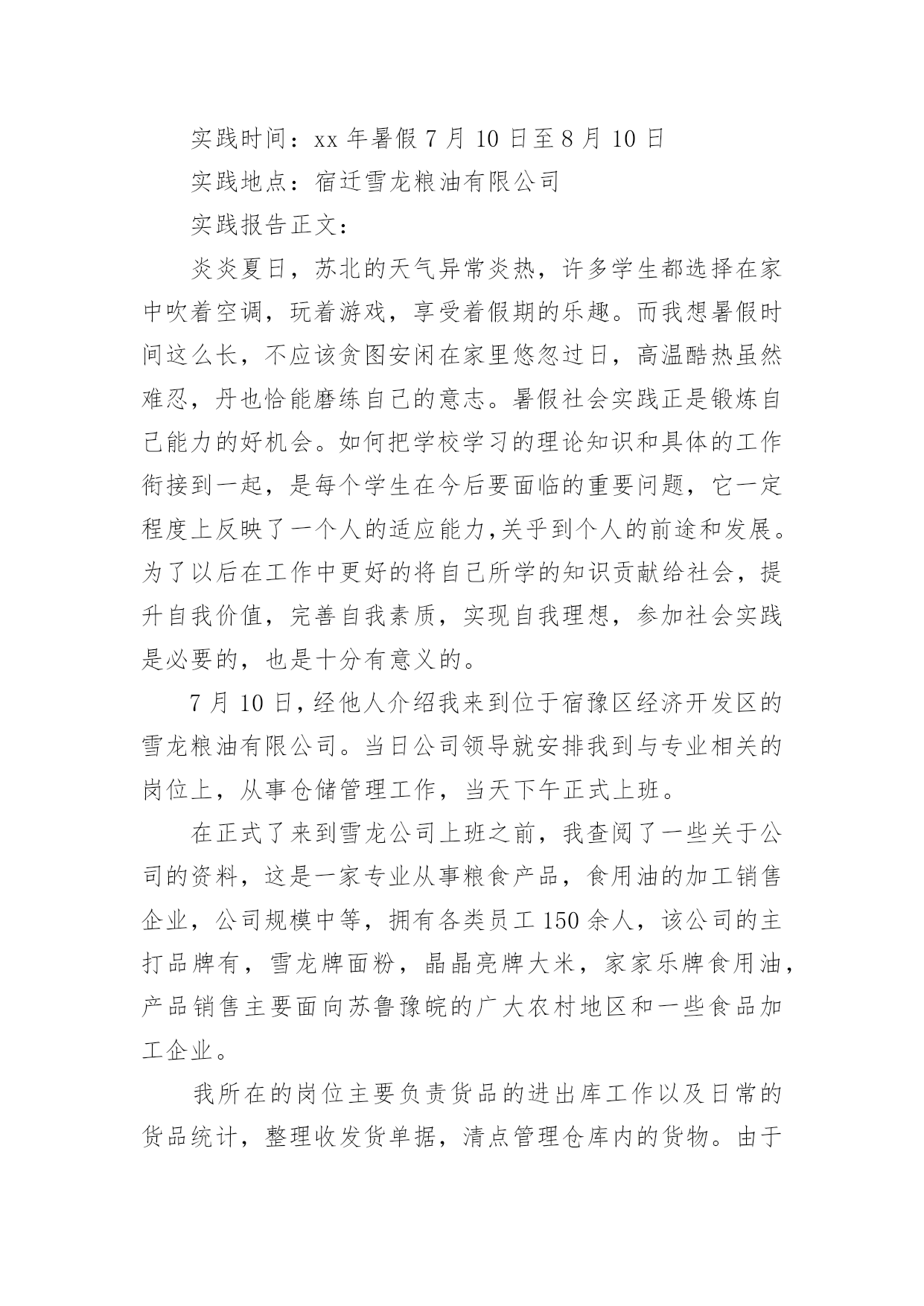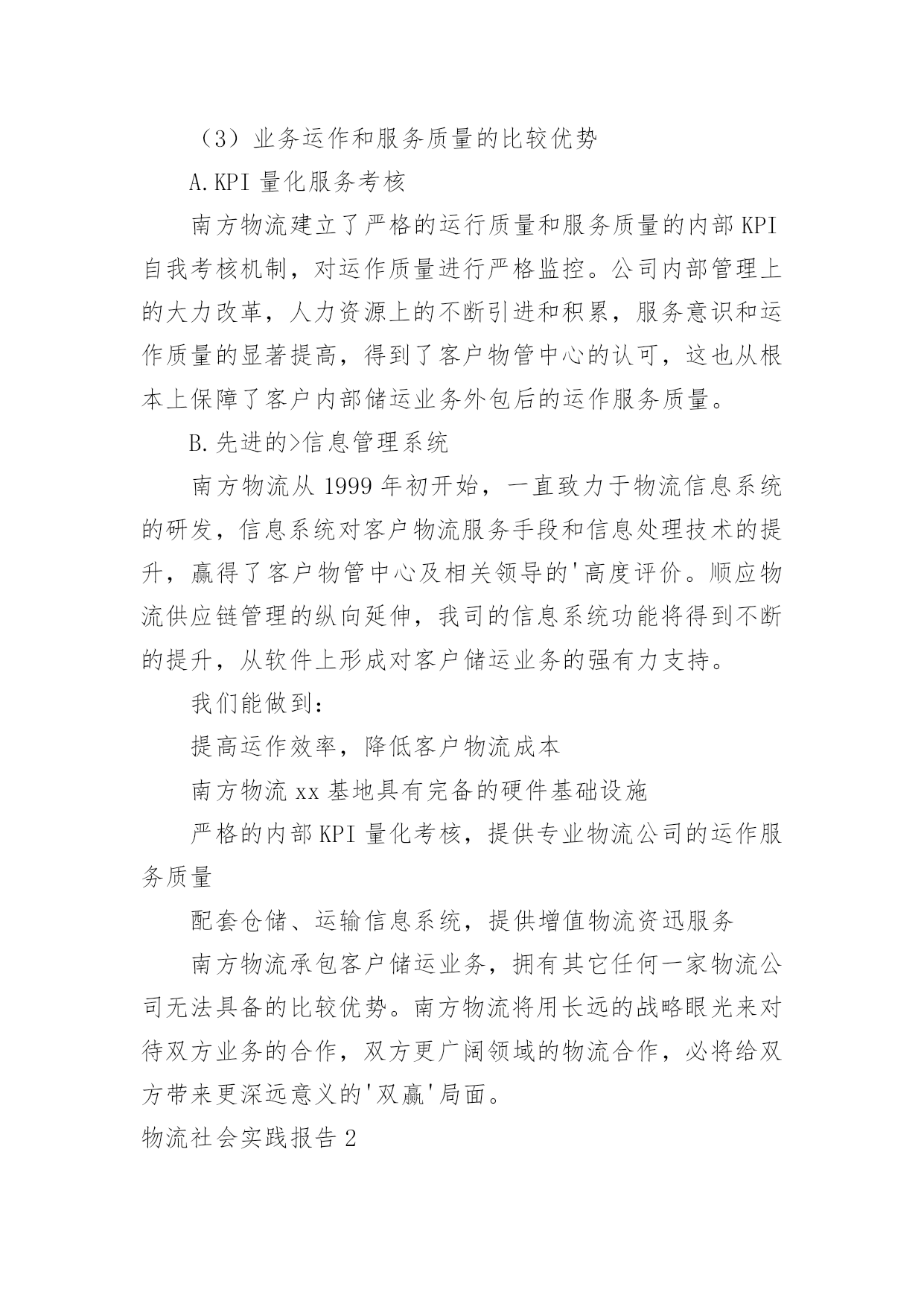 物流社会实践报告物流社会实践报告15篇在经济飞速发展的今天,报告使用的次数愈发增长,我们在写报告的时候要避免篇幅过长。你所见过的报告是什么样的呢?以下是小编为大家收集的物流社会实践报告,希望对大家有所帮助。物流社会实践报告1一实习目的:为了更好的适应以后的学习和工作,在这五天时间里主要学习了物流业的宏观和微观发展以及主要的物流流程。为以后的学习和工作打下坚实的基础,让我们对中国物流业的发展状况有一个比较全新的认识。二实习要求:了解物流的特点,主要设备和作业流程,对其进行分析,并依据学习的理论提出自己的意见,了解物流配送中心的主要流程。三实习单位概要:1.xx南方物流公司介绍:南方物流于1993年开始与TCL合作,至1996年开始成为TCL运输主要合作伙伴,到1999年双方成立'TCL南方物流有限公司',由南方物流在xx>投资1亿元兴建了占地面积100亩的物流基地,从此与TCL进一步形成战略结盟关系,成为物流企业与家电企业合作的典范。xx物流基地于20xx年11月全部建成并正式投入使用,与TCL的合作范围也由初期的单一运输服务,扩展到今天的集运输、仓储、配送、中转、装卸搬运、包装于一体化的物流服务。(1)保障业务运作的平稳过渡南方物流在与客户客户储运业务的长期磨合中,培养了一大批从事客户业务的管理人才和一线操作人才。单公司广州总部及xx基地直接为客户业务提供服务的人员就达100人左右。南方物流对客户生产基地内部储运业务相关的业务范围、业务流程、作业标准、管理模式,以至生产基地环境,设施分布,工作接口,沟通渠道等都已十分熟悉,在长期的业务往来中双方已达到融为一体的程度。(2)完备的硬件基础设施南方物流于20xx年在客户xx生产基地附近购置100亩地产,主要兴建与客户配套服务的仓储项目,一次性建造仓库面积达2.3万平方米,当年投入使用后一直为客户提供仓储服务。南方物流同时在xx基地修建了一栋面积达2千6百多平方米的4层办公楼,一栋面积达3千2百多平方米的5层员工宿舍楼,配套4000多平方米的停车场,以及700平方米的员工食堂。园林式的工作和生活环境,集仓储、办公、员工食宿、司机停车为一体化的物流园区,为承包客户现有的储运业务打造了坚实的基础,具备了其它任何一家物流公司目前无法提供的硬件设施。(3)业务运作和服务质量的比较优势A.KPI量化服务考核南方物流建立了严格的运行质量和服务质量的内部KPI自我考核机制,对运作质量进行严格监控。公司内部管理上的大力改革,人力资源上的不断引进和积累,服务意识和运作质量的显著提高,得到了客户物管中心的认可,这也从根本上保障了客户内部储运业务外包后的运作服务质量。B.先进的>信息管理系统南方物流从1999年初开始,一直致力于物流信息系统的研发,信息系统对客户物流服务手段和信息处理技术的提升,赢得了客户物管中心及相关领导的'高度评价。顺应物流供应链管理的纵向延伸,我司的信息系统功能将得到不断的提升,从软件上形成对客户储运业务的强有力支持。我们能做到:提高运作效率,降低客户物流成本南方物流xx基地具有完备的硬件基础设施严格的内部KPI量化考核,提供专业物流公司的运作服务质量配套仓储、运输信息系统,提供增值物流资迅服务南方物流承包客户储运业务,拥有其它任何一家物流公司无法具备的比较优势。南方物流将用长远的战略眼光来对待双方业务的合作,双方更广阔领域的物流合作,必将给双方带来更深远意义的'双赢'局面。物流社会实践报告2实践时间:xx年暑假7月10日至8月10日实践地点:宿迁雪龙粮油有限公司实践报告正文:炎炎夏日,苏北的天气异常炎热,许多学生都选择在家中吹着空调,玩着游戏,享受着假期的乐趣。而我想暑假时间这么长,不应该贪图安闲在家里悠忽过日,高温酷热虽然难忍,丹也恰能磨练自己的意志。暑假社会实践正是锻炼自己能力的好机会。如何把学校学习的理论知识和具体的工作衔接到一起,是每个学生在今后要面临的重要问题,它一定程度上反映了一个人的适应能力,关乎到个人的前途和发展。为了以后在工作中更好的将自己所学的知识贡献给社会,提升自我价值,完善自我素质,实现自我理想,参加社会实践是必要的,也是十分有意义的。7月10日,经他人介绍我来到位于宿豫区经济开发区的雪龙粮油有限公司。当日公司领导就安排我到与专业相关的岗位上,从事仓储管理工作,当天下午正式上班。在正式了来到雪龙公司上班之前,我查阅了一些关于公司的资料,这是一家专业从事粮食产品,食用油的加工销售企业,公司规模中等,拥有各类员工150余人,该公司的主打品牌有,雪龙牌面粉,晶晶亮牌大米,家家乐牌食用油,产品销售主要面向苏鲁豫皖的广大农村地区和一些食品加工企业。我所在的岗位主要负责货品的进出库工作以及日常的货品统计,整理收发货单据,清点管理仓库内的货物。由于企业规模及其他条件所