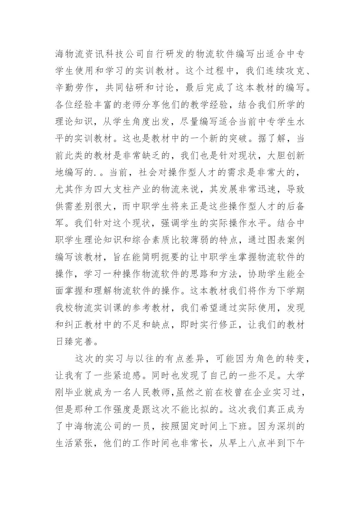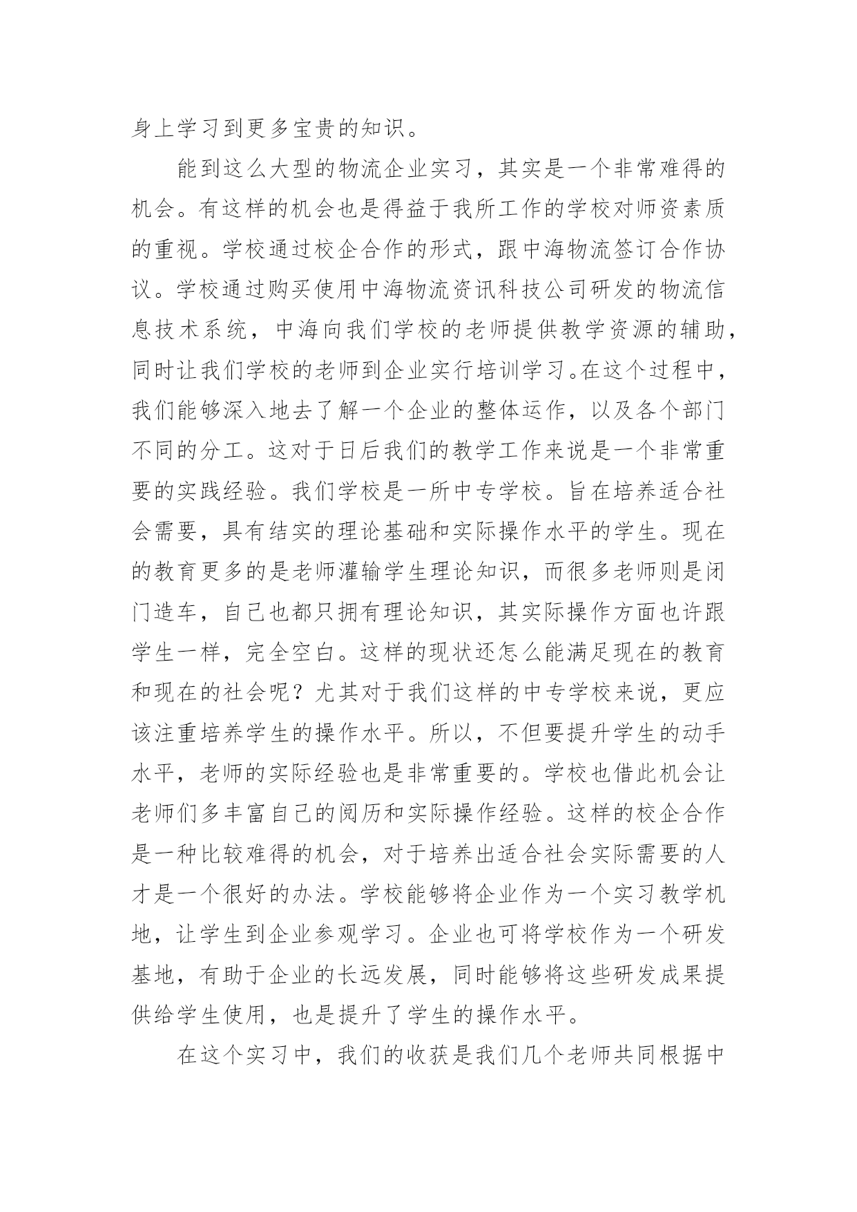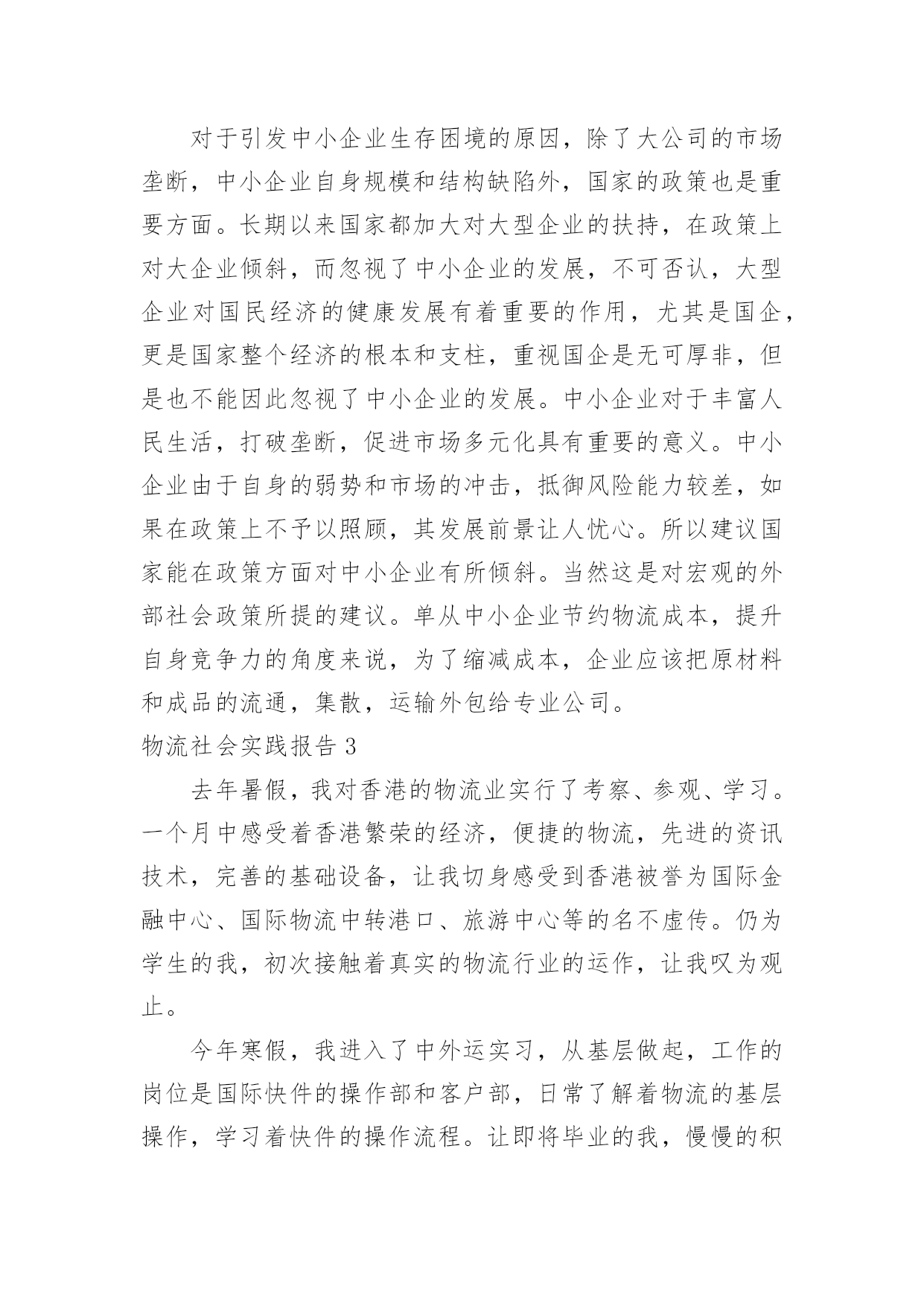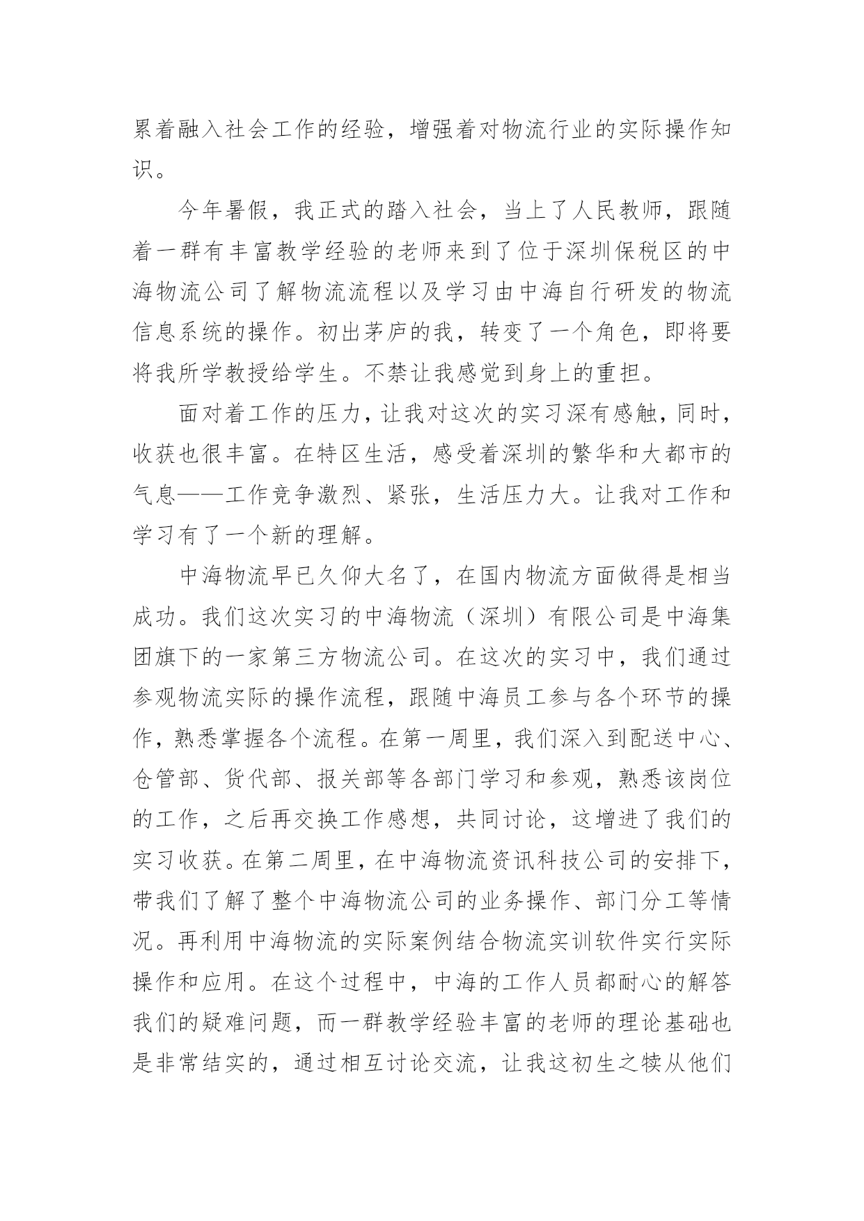 物流社会实践报告物流社会实践报告15篇在经济飞速发展的今天,报告使用的次数愈发增长,我们在写报告的时候要避免篇幅过长。你所见过的报告是什么样的呢?以下是小编为大家收集的物流社会实践报告,希望对大家有所帮助。物流社会实践报告1一实习目的:为了更好的适应以后的学习和工作,在这五天时间里主要学习了物流业的宏观和微观发展以及主要的物流流程。为以后的学习和工作打下坚实的基础,让我们对中国物流业的发展状况有一个比较全新的认识。二实习要求:了解物流的特点,主要设备和作业流程,对其进行分析,并依据学习的理论提出自己的意见,了解物流配送中心的主要流程。三实习单位概要:1.xx南方物流公司介绍:南方物流于1993年开始与TCL合作,至1996年开始成为TCL运输主要合作伙伴,到1999年双方成立'TCL南方物流有限公司',由南方物流在xx>投资1亿元兴建了占地面积100亩的物流基地,从此与TCL进一步形成战略结盟关系,成为物流企业与家电企业合作的典范。xx物流基地于20xx年11月全部建成并正式投入使用,与TCL的合作范围也由初期的单一运输服务,扩展到今天的集运输、仓储、配送、中转、装卸搬运、包装于一体化的物流服务。(1)保障业务运作的平稳过渡南方物流在与客户客户储运业务的长期磨合中,培养了一大批从事客户业务的管理人才和一线操作人才。单公司广州总部及xx基地直接为客户业务提供服务的人员就达100人左右。南方物流对客户生产基地内部储运业务相关的业务范围、业务流程、作业标准、管理模式,以至生产基地环境,设施分布,工作接口,沟通渠道等都已十分熟悉,在长期的业务往来中双方已达到融为一体的程度。(2)完备的硬件基础设施南方物流于20xx年在客户xx生产基地附近购置100亩地产,主要兴建与客户配套服务的仓储项目,一次性建造仓库面积达2.3万平方米,当年投入使用后一直为客户提供仓储服务。南方物流同时在xx基地修建了一栋面积达2千6百多平方米的4层办公楼,一栋面积达3千2百多平方米的5层员工宿舍楼,配套4000多平方米的停车场,以及700平方米的员工食堂。园林式的工作和生活环境,集仓储、办公、员工食宿、司机停车为一体化的物流园区,为承包客户现有的储运业务打造了坚实的基础,具备了其它任何一家物流公司目前无法提供的硬件设施。(3)业务运作和服务质量的比较优势A.KPI量化服务考核南方物流建立了严格的运行质量和服务质量的内部KPI自我考核机制,对运作质量进行严格监控。公司内部管理上的大力改革,人力资源上的不断引进和积累,服务意识和运作质量的显著提高,得到了客户物管中心的认可,这也从根本上保障了客户内部储运业务外包后的运作服务质量。B.先进的>信息管理系统南方物流从1999年初开始,一直致力于物流信息系统的研发,信息系统对客户物流服务手段和信息处理技术的提升,赢得了客户物管中心及相关领导的'高度评价。顺应物流供应链管理的纵向延伸,我司的信息系统功能将得到不断的提升,从软件上形成对客户储运业务的强有力支持。我们能做到:提高运作效率,降低客户物流成本南方物流xx基地具有完备的硬件基础设施严格的内部KPI量化考核,提供专业物流公司的运作服务质量配套仓储、运输信息系统,提供增值物流资迅服务南方物流承包客户储运业务,拥有其它任何一家物流公司无法具备的比较优势。南方物流将用长远的战略眼光来对待双方业务的合作,双方更广阔领域的物流合作,必将给双方带来更深远意义的'双赢'局面。物流社会实践报告2实践时间:xx年暑假7月10日至8月10日实践地点:宿迁雪龙粮油有限公司实践报告正文:炎炎夏日,苏北的天气异常炎热,许多学生都选择在家中吹着空调,玩着游戏,享受着假期的乐趣。而我想暑假时间这么长,不应该贪图安闲在家里悠忽过日,高温酷热虽然难忍,丹也恰能磨练自己的意志。暑假社会实践正是锻炼自己能力的好机会。如何把学校学习的理论知识和具体的工作衔接到一起,是每个学生在今后要面临的重要问题,它一定程度上反映了一个人的适应能力,关乎到个人的前途和发展。为了以后在工作中更好的将自己所学的知识贡献给社会,提升自我价值,完善自我素质,实现自我理想,参加社会实践是必要的,也是十分有意义的。7月10日,经他人介绍我来到位于宿豫区经济开发区的雪龙粮油有限公司。当日公司领导就安排我到与专业相关的岗位上,从事仓储管理工作,当天下午正式上班。在正式了来到雪龙公司上班之前,我查阅了一些关于公司的资料,这是一家专业从事粮食产品,食用油的加工销售企业,公司规模中等,拥有各类员工150余人,该公司的主打品牌有,雪龙牌面粉,晶晶亮牌大米,家家乐牌食用油,产品销售主要面向苏鲁豫皖的广大农村地区和一些食品加工企业。我所在的岗位主要负责货品的进出库工作以及日常的货品统计,整理收发货单据,清点管理仓库内的货物。由于企业规模及其他条件所