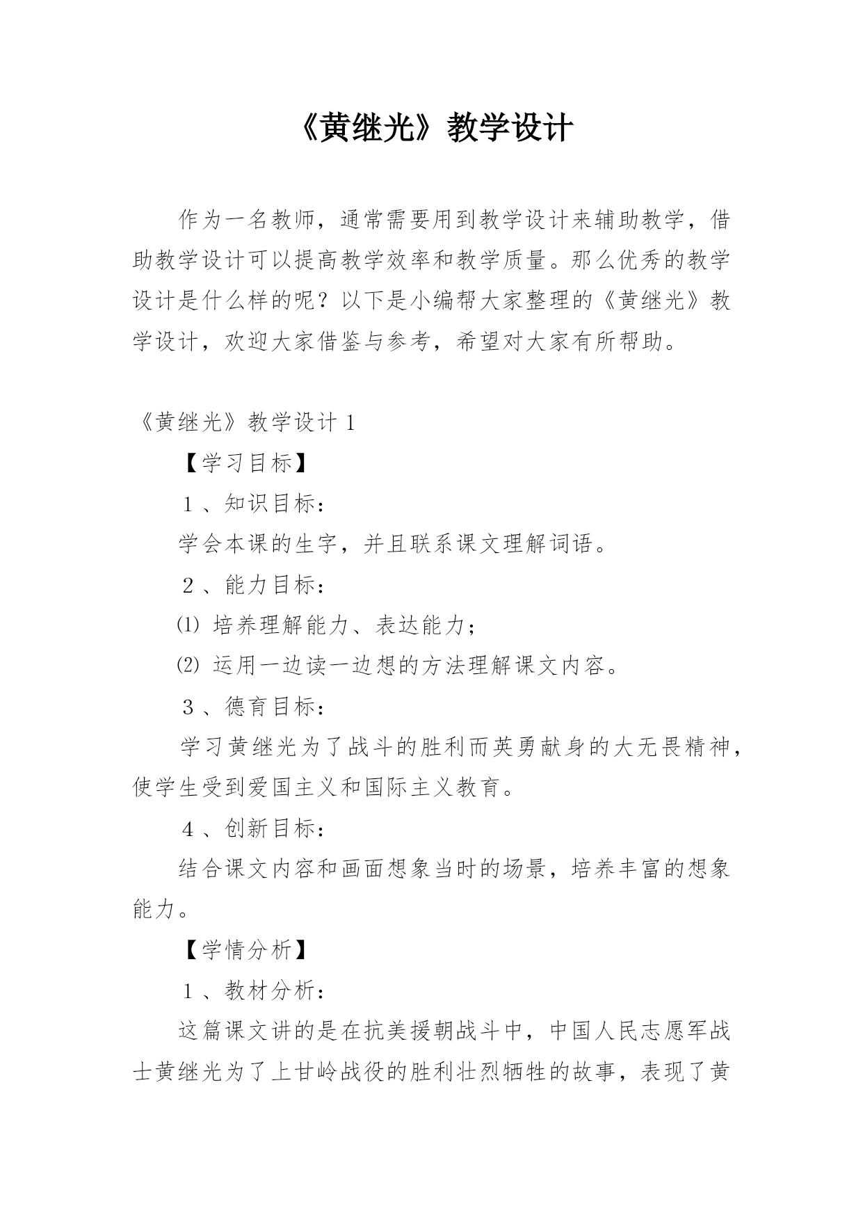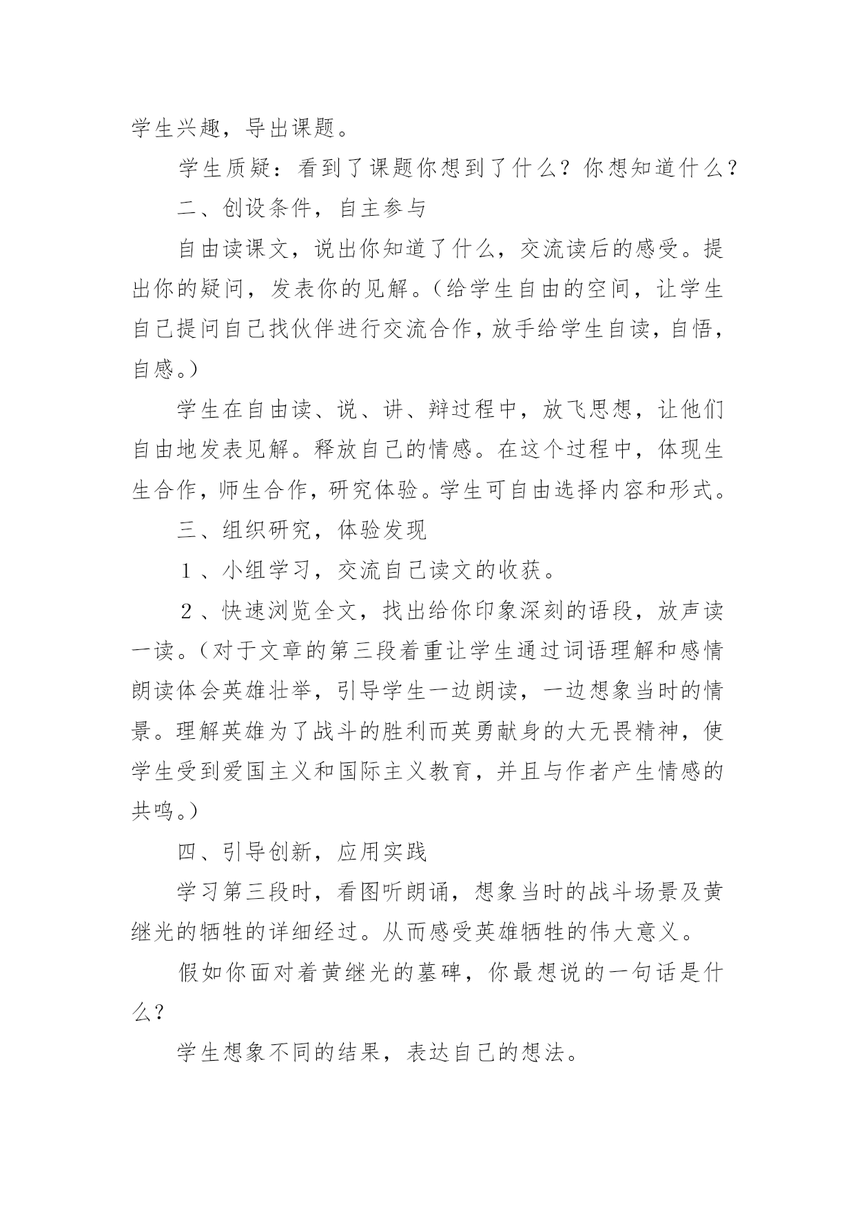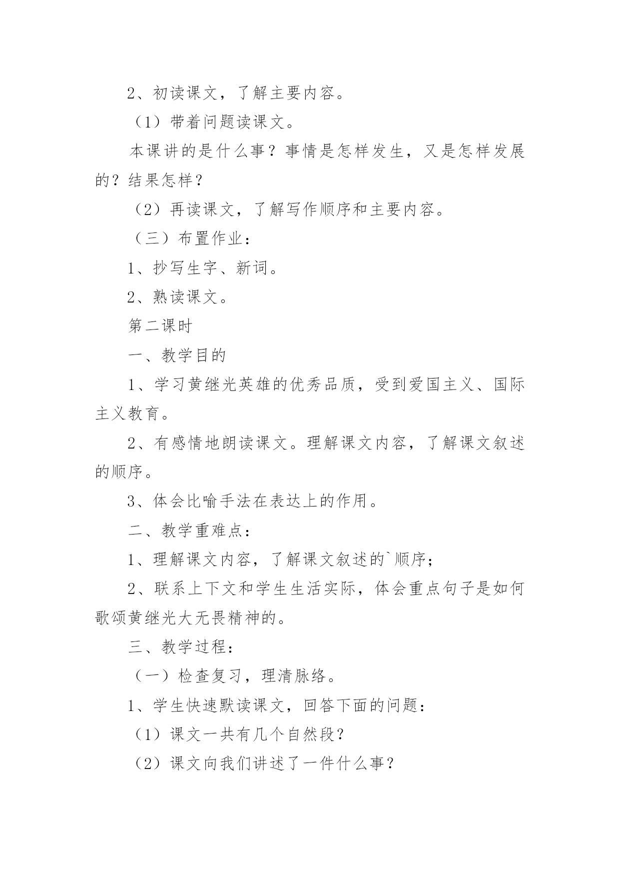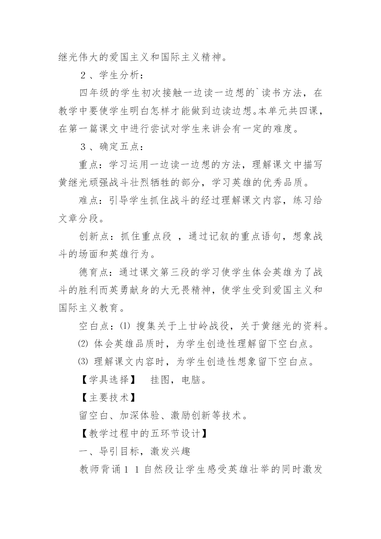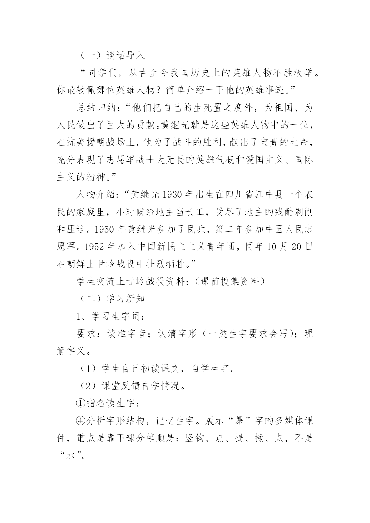《黄继光》教学设计作为一名教师,通常需要用到教学设计来辅助教学,借助教学设计可以提高教学效率和教学质量。那么优秀的教学设计是什么样的呢?以下是小编帮大家整理的《黄继光》教学设计,欢迎大家借鉴与参考,希望对大家有所帮助。《黄继光》教学设计1【学习目标】1、知识目标:学会本课的生字,并且联系课文理解词语。2、能力目标:⑴培养理解能力、表达能力;⑵运用一边读一边想的方法理解课文内容。3、德育目标:学习黄继光为了战斗的胜利而英勇献身的大无畏精神,使学生受到爱国主义和国际主义教育。4、创新目标:结合课文内容和画面想象当时的场景,培养丰富的想象能力。【学情分析】1、教材分析:这篇课文讲的是在抗美援朝战斗中,中国人民志愿军战士黄继光为了上甘岭战役的胜利壮烈牺牲的故事,表现了黄继光伟大的爱国主义和国际主义精神。2、学生分析:四年级的学生初次接触一边读一边想的`读书方法,在教学中要使学生明白怎样才能做到边读边想。本单元共四课,在第一篇课文中进行尝试对学生来讲会有一定的难度。3、确定五点:重点:学习运用一边读一边想的方法,理解课文中描写黄继光顽强战斗壮烈牺牲的部分,学习英雄的优秀品质。难点:引导学生抓住战斗的经过理解课文内容,练习给文章分段。创新点:抓住重点段,通过记叙的重点语句,想象战斗的场面和英雄行为。德育点:通过课文第三段的学习使学生体会英雄为了战斗的胜利而英勇献身的大无畏精神,使学生受到爱国主义和国际主义教育。空白点:⑴搜集关于上甘岭战役,关于黄继光的资料。⑵体会英雄品质时,为学生创造性理解留下空白点。⑶理解课文内容时,为学生创造性想象留下空白点。【学具选择】挂图,电脑。【主要技术】留空白、加深体验、激励创新等技术。【教学过程中的五环节设计】一、导引目标,激发兴趣教师背诵11自然段让学生感受英雄壮举的同时激发学生兴趣,导出课题。学生质疑:看到了课题你想到了什么?你想知道什么?二、创设条件,自主参与自由读课文,说出你知道了什么,交流读后的感受。提出你的疑问,发表你的见解。(给学生自由的空间,让学生自己提问自己找伙伴进行交流合作,放手给学生自读,自悟,自感。)学生在自由读、说、讲、辩过程中,放飞思想,让他们自由地发表见解。释放自己的情感。在这个过程中,体现生生合作,师生合作,研究体验。学生可自由选择内容和形式。三、组织研究,体验发现1、小组学习,交流自己读文的收获。2、快速浏览全文,找出给你印象深刻的语段,放声读一读。(对于文章的第三段着重让学生通过词语理解和感情朗读体会英雄壮举,引导学生一边朗读,一边想象当时的情景。理解英雄为了战斗的胜利而英勇献身的大无畏精神,使学生受到爱国主义和国际主义教育,并且与作者产生情感的共鸣。)四、引导创新,应用实践学习第三段时,看图听朗诵,想象当时的战斗场景及黄继光的牺牲的详细经过。从而感受英雄牺牲的伟大意义。假如你面对着黄继光的墓碑,你最想说的一句话是什么?学生想象不同的结果,表达自己的想法。五、反思小结,巩固提高1、谈谈自己的收获。(写作方法方面的,情感体验方面的,观察方面的,学习方法方面的,学生根据自己所得,自由谈。)2、出示练习。【研究性作业】背诵或摘记文章当中你印象最深刻的句段。【板书】【教学后记】在教学的过程中,以上的五个环节,并不是按我所写的顺序不变的,而是五个环节有机融合,相互渗透。在研究中体验,在体验中创新,并不断地进行阶段性地小结,在师生的相互合作与交流的过程中实现教学目标。《黄继光》教学设计2第一课时一、教学目的:1、理解课文的时代背景。2、学习本课生字新词。3、初读课文,了解课文的主要内容。二、教学重难点:掌握课文生字新词,初步了解课文主要内容;让学生理解课文的时代背景。三、教学过程:(一)谈话导入“同学们,从古至今我国历史上的英雄人物不胜枚举。你最敬佩哪位英雄人物?简单介绍一下他的英雄事迹。”总结归纳:“他们把自己的生死置之度外,为祖国、为人民做出了巨大的贡献。黄继光就是这些英雄人物中的一位,在抗美援朝战场上,他为了战斗的胜利,献出了宝贵的生命,充分表现了志愿军战士大无畏的英雄气概和爱国主义、国际主义的精神。”人物介绍:“黄继光1930年出生在四川省江中县一个农民的家庭里,小时候给地主当长工,受尽了地主的残酷剥削和压迫。1950年黄继光参加了民兵,第二年参加中国人民志愿军。1952年加入中国新民主主义青年团,同年10月20日在朝鲜上甘岭战役中壮烈牺牲。”学生交流上甘岭战役资料:(课前搜集资料)(二)学习新知1、学习生字词:要求:读准字音;认清字形(一类生字要求会写);理解字义。(1)学生自己初读课文,自学生字。(2)课堂反馈自学情况。①指名读生字:④分析字形结构,记忆生字。展示“暴”字的多媒体课件,重点是靠下部分笔顺是:竖钩、点、提、撇、点,不是“水”。⑤理解词语学生可以先自己从文