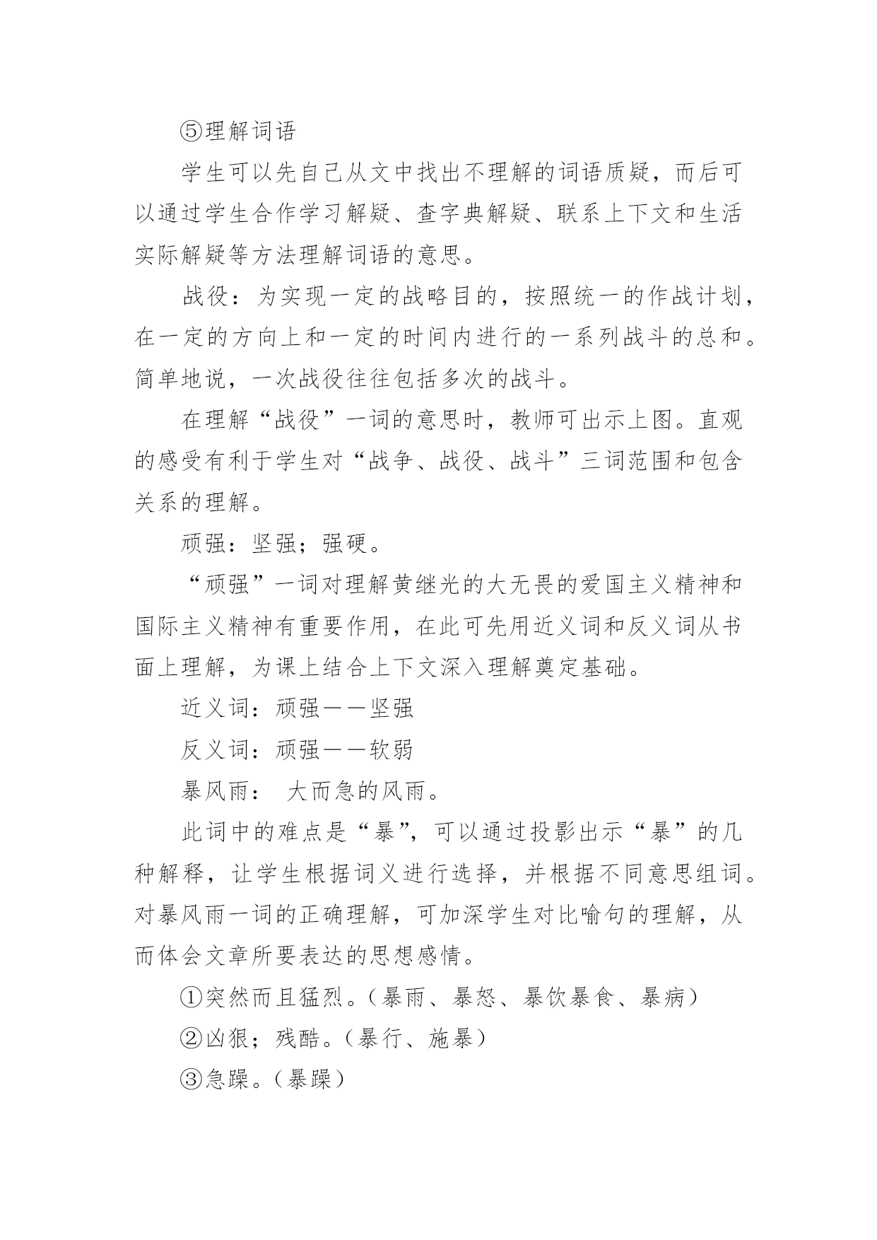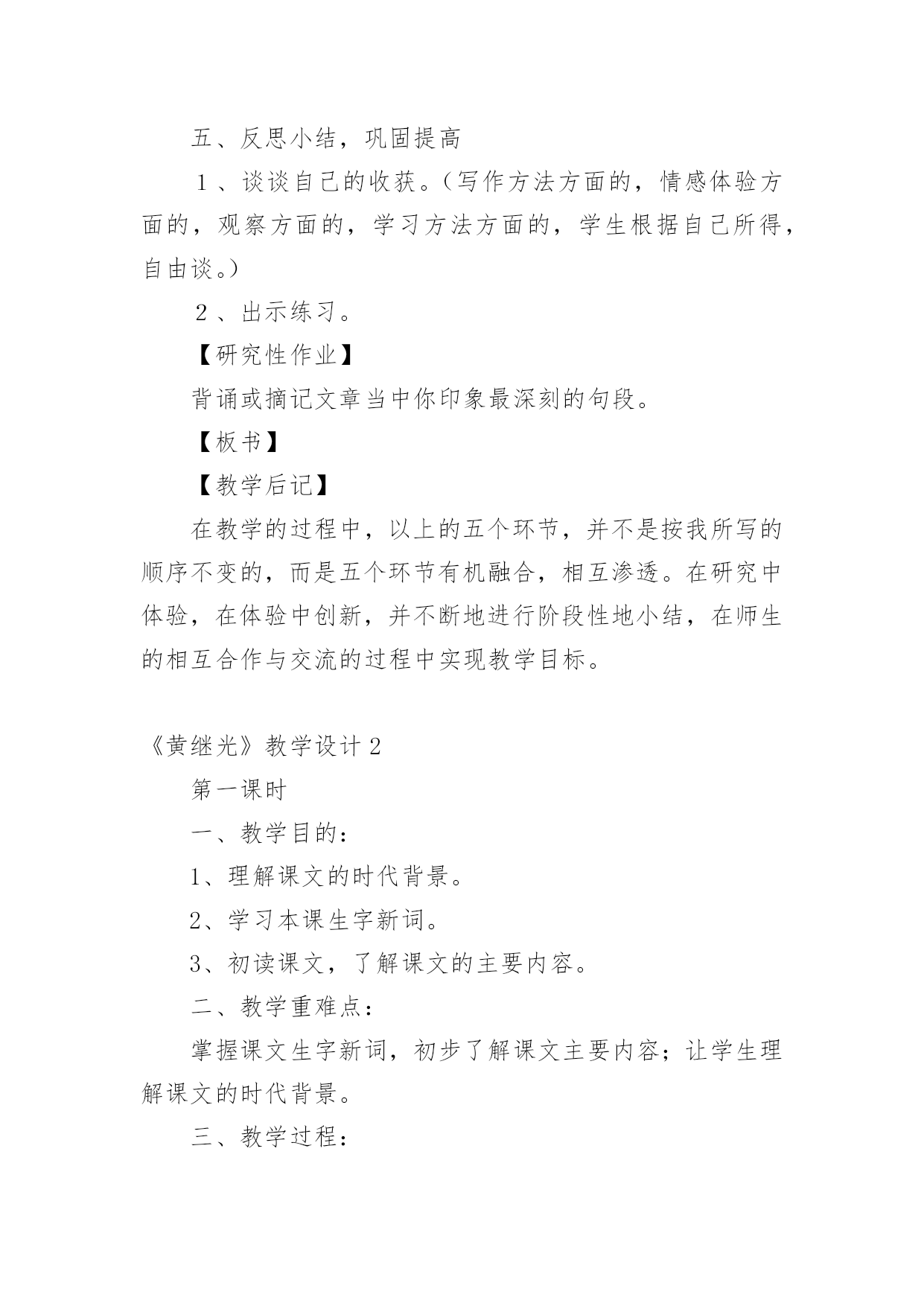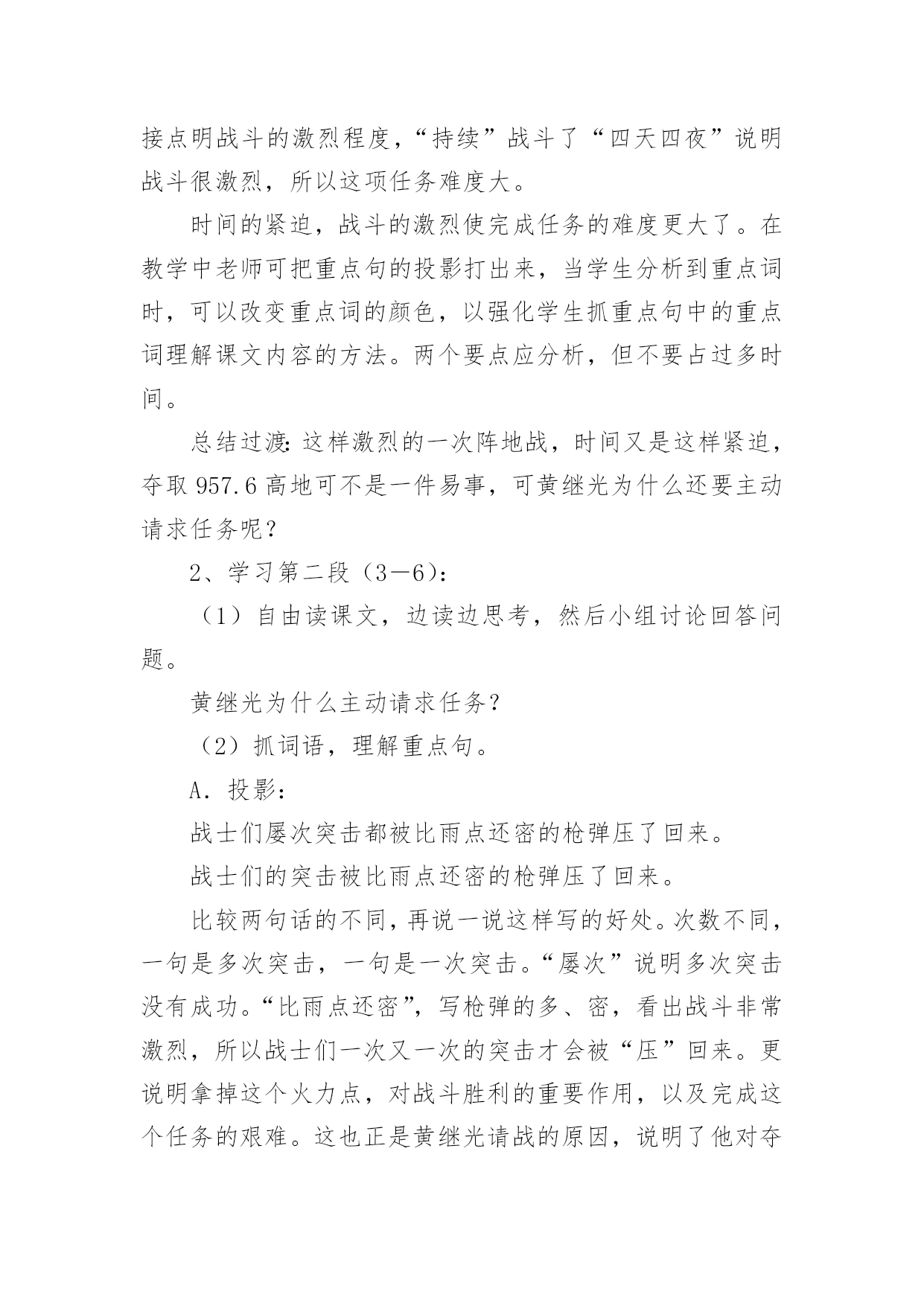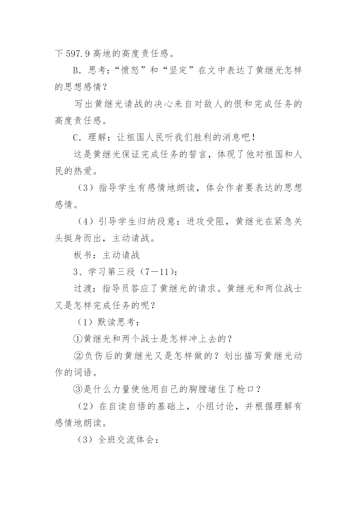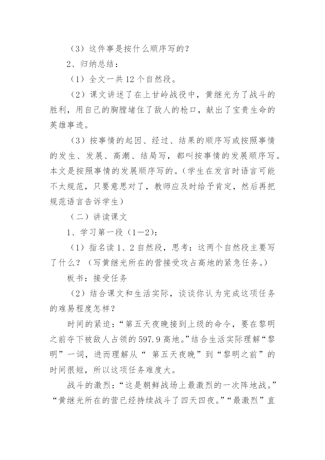 《黄继光》教学设计作为一名教师,通常需要用到教学设计来辅助教学,借助教学设计可以提高教学效率和教学质量。那么优秀的教学设计是什么样的呢?以下是小编帮大家整理的《黄继光》教学设计,欢迎大家借鉴与参考,希望对大家有所帮助。《黄继光》教学设计1【学习目标】1、知识目标:学会本课的生字,并且联系课文理解词语。2、能力目标:⑴培养理解能力、表达能力;⑵运用一边读一边想的方法理解课文内容。3、德育目标:学习黄继光为了战斗的胜利而英勇献身的大无畏精神,使学生受到爱国主义和国际主义教育。4、创新目标:结合课文内容和画面想象当时的场景,培养丰富的想象能力。【学情分析】1、教材分析:这篇课文讲的是在抗美援朝战斗中,中国人民志愿军战士黄继光为了上甘岭战役的胜利壮烈牺牲的故事,表现了黄继光伟大的爱国主义和国际主义精神。2、学生分析:四年级的学生初次接触一边读一边想的`读书方法,在教学中要使学生明白怎样才能做到边读边想。本单元共四课,在第一篇课文中进行尝试对学生来讲会有一定的难度。3、确定五点:重点:学习运用一边读一边想的方法,理解课文中描写黄继光顽强战斗壮烈牺牲的部分,学习英雄的优秀品质。难点:引导学生抓住战斗的经过理解课文内容,练习给文章分段。创新点:抓住重点段,通过记叙的重点语句,想象战斗的场面和英雄行为。德育点:通过课文第三段的学习使学生体会英雄为了战斗的胜利而英勇献身的大无畏精神,使学生受到爱国主义和国际主义教育。空白点:⑴搜集关于上甘岭战役,关于黄继光的资料。⑵体会英雄品质时,为学生创造性理解留下空白点。⑶理解课文内容时,为学生创造性想象留下空白点。【学具选择】挂图,电脑。【主要技术】留空白、加深体验、激励创新等技术。【教学过程中的五环节设计】一、导引目标,激发兴趣教师背诵11自然段让学生感受英雄壮举的同时激发学生兴趣,导出课题。学生质疑:看到了课题你想到了什么?你想知道什么?二、创设条件,自主参与自由读课文,说出你知道了什么,交流读后的感受。提出你的疑问,发表你的见解。(给学生自由的空间,让学生自己提问自己找伙伴进行交流合作,放手给学生自读,自悟,自感。)学生在自由读、说、讲、辩过程中,放飞思想,让他们自由地发表见解。释放自己的情感。在这个过程中,体现生生合作,师生合作,研究体验。学生可自由选择内容和形式。三、组织研究,体验发现1、小组学习,交流自己读文的收获。2、快速浏览全文,找出给你印象深刻的语段,放声读一读。(对于文章的第三段着重让学生通过词语理解和感情朗读体会英雄壮举,引导学生一边朗读,一边想象当时的情景。理解英雄为了战斗的胜利而英勇献身的大无畏精神,使学生受到爱国主义和国际主义教育,并且与作者产生情感的共鸣。)四、引导创新,应用实践学习第三段时,看图听朗诵,想象当时的战斗场景及黄继光的牺牲的详细经过。从而感受英雄牺牲的伟大意义。假如你面对着黄继光的墓碑,你最想说的一句话是什么?学生想象不同的结果,表达自己的想法。五、反思小结,巩固提高1、谈谈自己的收获。(写作方法方面的,情感体验方面的,观察方面的,学习方法方面的,学生根据自己所得,自由谈。)2、出示练习。【研究性作业】背诵或摘记文章当中你印象最深刻的句段。【板书】【教学后记】在教学的过程中,以上的五个环节,并不是按我所写的顺序不变的,而是五个环节有机融合,相互渗透。在研究中体验,在体验中创新,并不断地进行阶段性地小结,在师生的相互合作与交流的过程中实现教学目标。《黄继光》教学设计2第一课时一、教学目的:1、理解课文的时代背景。2、学习本课生字新词。3、初读课文,了解课文的主要内容。二、教学重难点:掌握课文生字新词,初步了解课文主要内容;让学生理解课文的时代背景。三、教学过程:(一)谈话导入“同学们,从古至今我国历史上的英雄人物不胜枚举。你最敬佩哪位英雄人物?简单介绍一下他的英雄事迹。”总结归纳:“他们把自己的生死置之度外,为祖国、为人民做出了巨大的贡献。黄继光就是这些英雄人物中的一位,在抗美援朝战场上,他为了战斗的胜利,献出了宝贵的生命,充分表现了志愿军战士大无畏的英雄气概和爱国主义、国际主义的精神。”人物介绍:“黄继光1930年出生在四川省江中县一个农民的家庭里,小时候给地主当长工,受尽了地主的残酷剥削和压迫。1950年黄继光参加了民兵,第二年参加中国人民志愿军。1952年加入中国新民主主义青年团,同年10月20日在朝鲜上甘岭战役中壮烈牺牲。”学生交流上甘岭战役资料:(课前搜集资料)(二)学习新知1、学习生字词:要求:读准字音;认清字形(一类生字要求会写);理解字义。(1)学生自己初读课文,自学生字。(2)课堂反馈自学情况。①指名读生字:④分析字形结构,记忆生字。展示“暴”字的多媒体课件,重点是靠下部分笔顺是:竖钩、点、提、撇、点,不是“水”。⑤理解词语学生可以先自己从文