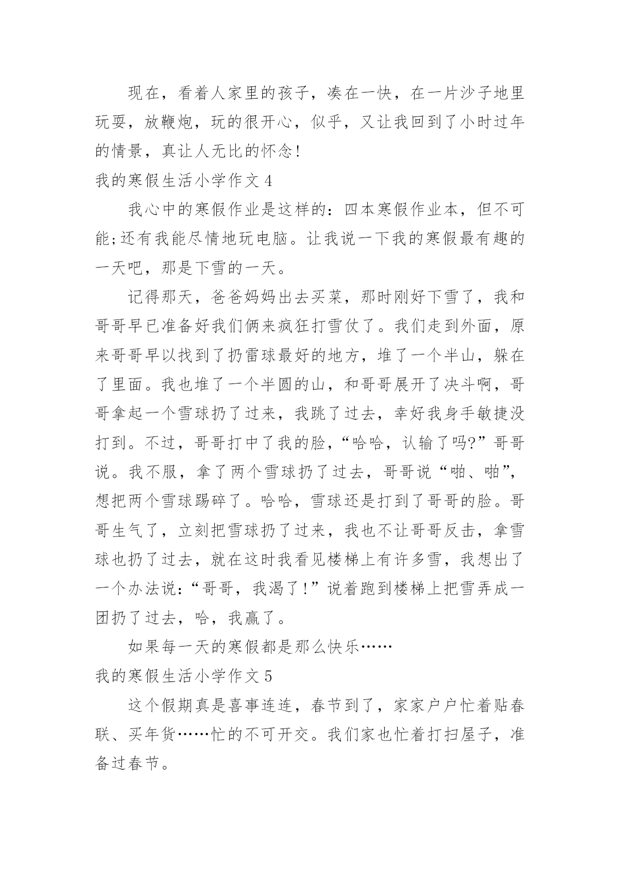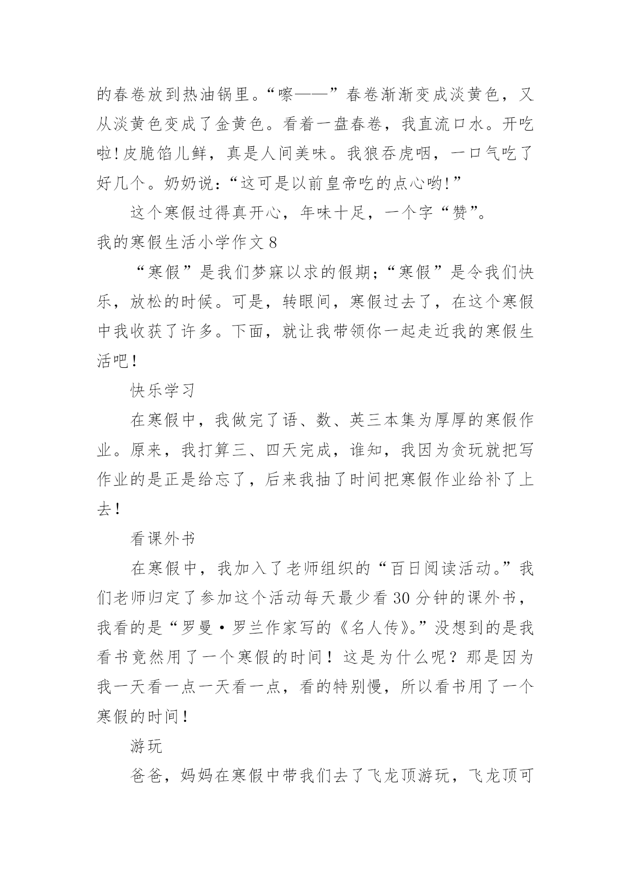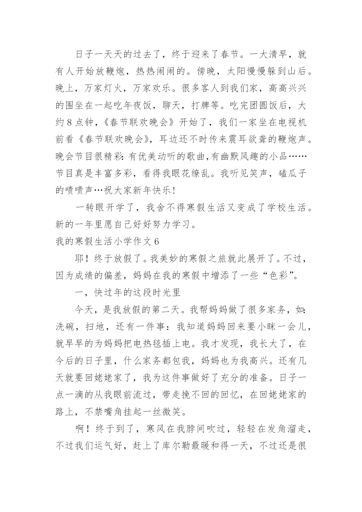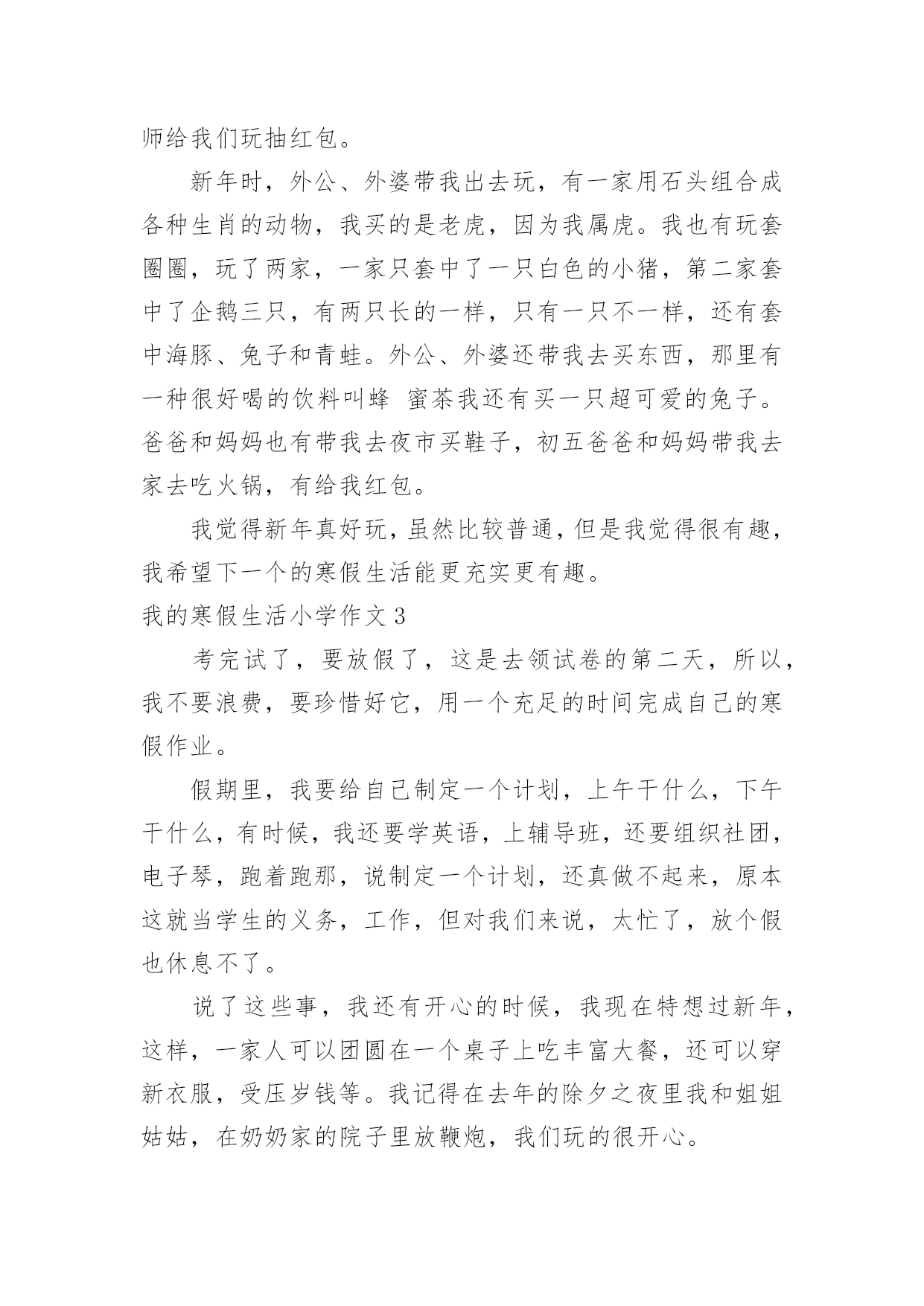 我的寒假生活小学作文我的寒假生活小学作文我的寒假生活小学作文1不知不觉中,一学期就这样过去了,在紧张的一学期过去后,寒假便成了我们放松的一个好时期。我的假期生活就像巴赫的钢琴曲一般,绚烂多彩;又像雨后的彩虹一样,颜色丰富。说到寒假,首先想到的就是新年了,鞭炮声不绝,家家户户都贴上了春联,而远方的游子,也都在这天回来,与家人团聚,其乐融融。当然我最期待的,还是新年的压岁钱,每次看到红包满满的,心里都很高兴,不知道你们是不是和我想的一样呢?虽然这个寒假只有短短的3个星期,但我依然过得很充实,悄悄告诉你们,今年寒假,爸爸竟然破例给我买了10本课外书,以往他可是从不让我看课外书的啊!《伊索寓言》,《繁星春水》,《王尔德童话》,《小王子》还有好多呢,真是充实了我的整个寒假。这就是我的寒假生活,除了玩乐之外,别忘了解决寒假作业哦。我的寒假生活小学作文2我今年的寒假生活虽然有些普通,但是仍然有一些事情让我觉得很有趣。我一直都在辅导班直到除夕的前一天才开始放假。不过我在辅导班也学了很多,最好玩的是主任和老师给我们玩抽红包。新年时,外公、外婆带我出去玩,有一家用石头组合成各种生肖的动物,我买的是老虎,因为我属虎。我也有玩套圈圈,玩了两家,一家只套中了一只白色的小猪,第二家套中了企鹅三只,有两只长的一样,只有一只不一样,还有套中海豚、兔子和青蛙。外公、外婆还带我去买东西,那里有一种很好喝的饮料叫蜂蜜茶我还有买一只超可爱的兔子。爸爸和妈妈也有带我去夜市买鞋子,初五爸爸和妈妈带我去家去吃火锅,有给我红包。我觉得新年真好玩,虽然比较普通,但是我觉得很有趣,我希望下一个的寒假生活能更充实更有趣。我的寒假生活小学作文3考完试了,要放假了,这是去领试卷的第二天,所以,我不要浪费,要珍惜好它,用一个充足的时间完成自己的寒假作业。假期里,我要给自己制定一个计划,上午干什么,下午干什么,有时候,我还要学英语,上辅导班,还要组织社团,电子琴,跑着跑那,说制定一个计划,还真做不起来,原本这就当学生的义务,工作,但对我们来说,太忙了,放个假也休息不了。说了这些事,我还有开心的时候,我现在特想过新年,这样,一家人可以团圆在一个桌子上吃丰富大餐,还可以穿新衣服,受压岁钱等。我记得在去年的除夕之夜里我和姐姐姑姑,在奶奶家的院子里放鞭炮,我们玩的很开心。现在,看着人家里的孩子,凑在一快,在一片沙子地里玩耍,放鞭炮,玩的很开心,似乎,又让我回到了小时过年的情景,真让人无比的怀念!我的寒假生活小学作文4我心中的寒假作业是这样的:四本寒假作业本,但不可能;还有我能尽情地玩电脑。让我说一下我的寒假最有趣的一天吧,那是下雪的一天。记得那天,爸爸妈妈出去买菜,那时刚好下雪了,我和哥哥早已准备好我们俩来疯狂打雪仗了。我们走到外面,原来哥哥早以找到了扔雷球最好的地方,堆了一个半山,躲在了里面。我也堆了一个半圆的山,和哥哥展开了决斗啊,哥哥拿起一个雪球扔了过来,我跳了过去,幸好我身手敏捷没打到。不过,哥哥打中了我的脸,“哈哈,认输了吗?”哥哥说。我不服,拿了两个雪球扔了过去,哥哥说“啪、啪”,想把两个雪球踢碎了。哈哈,雪球还是打到了哥哥的脸。哥哥生气了,立刻把雪球扔了过来,我也不让哥哥反击,拿雪球也扔了过去,就在这时我看见楼梯上有许多雪,我想出了一个办法说:“哥哥,我渴了!”说着跑到楼梯上把雪弄成一团扔了过去,哈,我赢了。如果每一天的寒假都是那么快乐……我的寒假生活小学作文5这个假期真是喜事连连,春节到了,家家户户忙着贴春联、买年货……忙的不可开交。我们家也忙着打扫屋子,准备过春节。日子一天天的过去了,终于迎来了春节。一大清早,就有人开始放鞭炮,热热闹闹的。傍晚,太阳慢慢躲到山后。晚上,万家灯火,万家欢乐。很多客人到我们家,高高兴兴的围坐在一起吃年夜饭,聊天,打牌等。吃完团圆饭后,大约8点钟,《春节联欢晚会》开始了,我们一家坐在电视机前看《春节联欢晚会》,耳边还不时传来震耳欲聋的鞭炮声。晚会节目很精彩:有优美动听的歌曲,有幽默风趣的小品……节目真是丰富多彩,看得我眼花缭乱。我听见笑声,磕瓜子的啧啧声…祝大家新年快乐!一转眼开学了,我舍不得寒假生活又变成了学校生活。新的一年里愿自己好好努力学习。我的寒假生活小学作文6耶!终于放假了。我美妙的寒假之旅就此展开了。不过,因为成绩的偏差,妈妈在我的寒假中增添了一些“色彩”。一,快过年的这段时光里今天,是我放假的第二天。我帮妈妈做了很多家务,如:洗碗,扫地,还有一件事:我知道妈妈回来要小眯一会儿,就早早的为妈妈把电热毯插上电。我才发现,我长大了,在今后的日子里,什么家务都包我,妈妈也为我高兴。还有几天就要回姥姥家了,我为这件事做好了充分的准备。日子一点一滴的从我眼前流过,带走挽不回的回忆,在回姥姥家的路上,不禁嘴角挂起一丝微笑。啊!终于到了,寒风在我脖