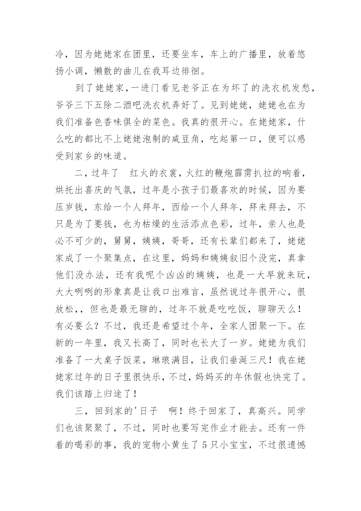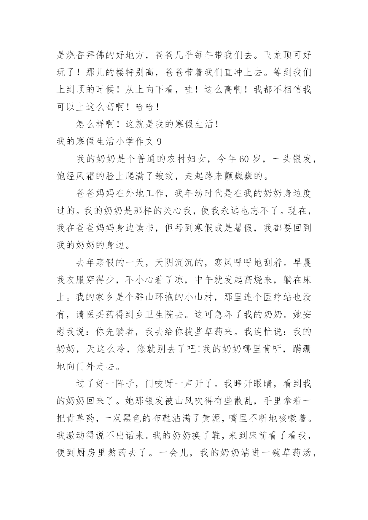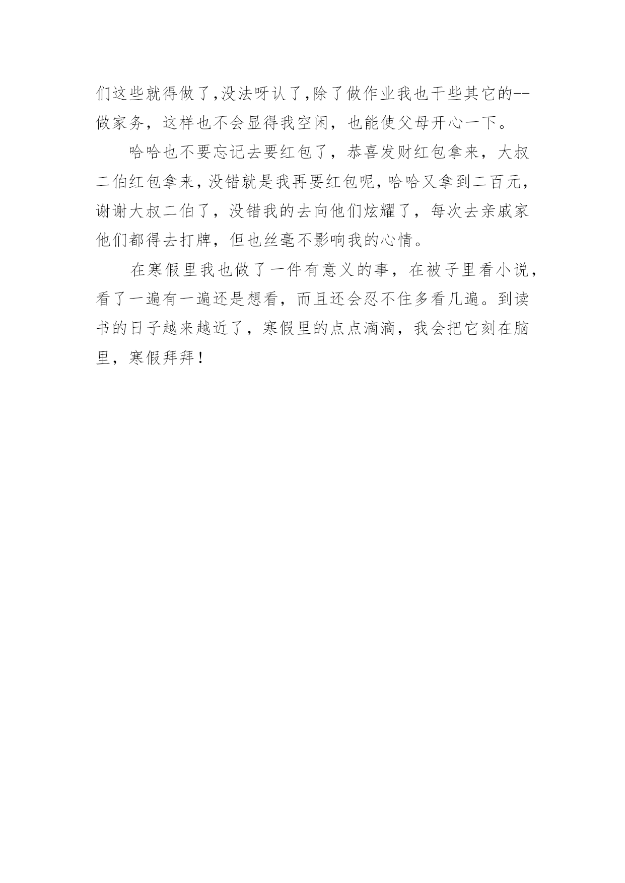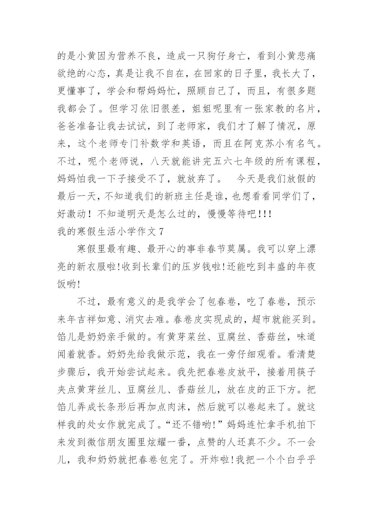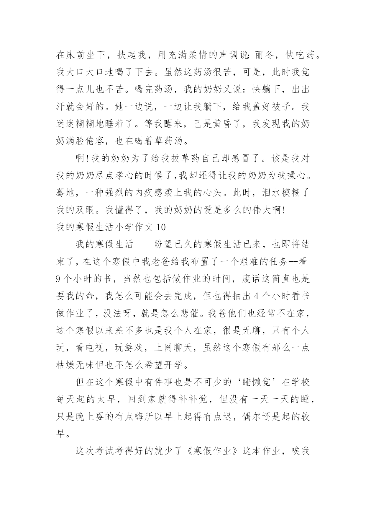 我的寒假生活小学作文我的寒假生活小学作文我的寒假生活小学作文1不知不觉中,一学期就这样过去了,在紧张的一学期过去后,寒假便成了我们放松的一个好时期。我的假期生活就像巴赫的钢琴曲一般,绚烂多彩;又像雨后的彩虹一样,颜色丰富。说到寒假,首先想到的就是新年了,鞭炮声不绝,家家户户都贴上了春联,而远方的游子,也都在这天回来,与家人团聚,其乐融融。当然我最期待的,还是新年的压岁钱,每次看到红包满满的,心里都很高兴,不知道你们是不是和我想的一样呢?虽然这个寒假只有短短的3个星期,但我依然过得很充实,悄悄告诉你们,今年寒假,爸爸竟然破例给我买了10本课外书,以往他可是从不让我看课外书的啊!《伊索寓言》,《繁星春水》,《王尔德童话》,《小王子》还有好多呢,真是充实了我的整个寒假。这就是我的寒假生活,除了玩乐之外,别忘了解决寒假作业哦。我的寒假生活小学作文2我今年的寒假生活虽然有些普通,但是仍然有一些事情让我觉得很有趣。我一直都在辅导班直到除夕的前一天才开始放假。不过我在辅导班也学了很多,最好玩的是主任和老师给我们玩抽红包。新年时,外公、外婆带我出去玩,有一家用石头组合成各种生肖的动物,我买的是老虎,因为我属虎。我也有玩套圈圈,玩了两家,一家只套中了一只白色的小猪,第二家套中了企鹅三只,有两只长的一样,只有一只不一样,还有套中海豚、兔子和青蛙。外公、外婆还带我去买东西,那里有一种很好喝的饮料叫蜂蜜茶我还有买一只超可爱的兔子。爸爸和妈妈也有带我去夜市买鞋子,初五爸爸和妈妈带我去家去吃火锅,有给我红包。我觉得新年真好玩,虽然比较普通,但是我觉得很有趣,我希望下一个的寒假生活能更充实更有趣。我的寒假生活小学作文3考完试了,要放假了,这是去领试卷的第二天,所以,我不要浪费,要珍惜好它,用一个充足的时间完成自己的寒假作业。假期里,我要给自己制定一个计划,上午干什么,下午干什么,有时候,我还要学英语,上辅导班,还要组织社团,电子琴,跑着跑那,说制定一个计划,还真做不起来,原本这就当学生的义务,工作,但对我们来说,太忙了,放个假也休息不了。说了这些事,我还有开心的时候,我现在特想过新年,这样,一家人可以团圆在一个桌子上吃丰富大餐,还可以穿新衣服,受压岁钱等。我记得在去年的除夕之夜里我和姐姐姑姑,在奶奶家的院子里放鞭炮,我们玩的很开心。现在,看着人家里的孩子,凑在一快,在一片沙子地里玩耍,放鞭炮,玩的很开心,似乎,又让我回到了小时过年的情景,真让人无比的怀念!我的寒假生活小学作文4我心中的寒假作业是这样的:四本寒假作业本,但不可能;还有我能尽情地玩电脑。让我说一下我的寒假最有趣的一天吧,那是下雪的一天。记得那天,爸爸妈妈出去买菜,那时刚好下雪了,我和哥哥早已准备好我们俩来疯狂打雪仗了。我们走到外面,原来哥哥早以找到了扔雷球最好的地方,堆了一个半山,躲在了里面。我也堆了一个半圆的山,和哥哥展开了决斗啊,哥哥拿起一个雪球扔了过来,我跳了过去,幸好我身手敏捷没打到。不过,哥哥打中了我的脸,“哈哈,认输了吗?”哥哥说。我不服,拿了两个雪球扔了过去,哥哥说“啪、啪”,想把两个雪球踢碎了。哈哈,雪球还是打到了哥哥的脸。哥哥生气了,立刻把雪球扔了过来,我也不让哥哥反击,拿雪球也扔了过去,就在这时我看见楼梯上有许多雪,我想出了一个办法说:“哥哥,我渴了!”说着跑到楼梯上把雪弄成一团扔了过去,哈,我赢了。如果每一天的寒假都是那么快乐……我的寒假生活小学作文5这个假期真是喜事连连,春节到了,家家户户忙着贴春联、买年货……忙的不可开交。我们家也忙着打扫屋子,准备过春节。日子一天天的过去了,终于迎来了春节。一大清早,就有人开始放鞭炮,热热闹闹的。傍晚,太阳慢慢躲到山后。晚上,万家灯火,万家欢乐。很多客人到我们家,高高兴兴的围坐在一起吃年夜饭,聊天,打牌等。吃完团圆饭后,大约8点钟,《春节联欢晚会》开始了,我们一家坐在电视机前看《春节联欢晚会》,耳边还不时传来震耳欲聋的鞭炮声。晚会节目很精彩:有优美动听的歌曲,有幽默风趣的小品……节目真是丰富多彩,看得我眼花缭乱。我听见笑声,磕瓜子的啧啧声…祝大家新年快乐!一转眼开学了,我舍不得寒假生活又变成了学校生活。新的一年里愿自己好好努力学习。我的寒假生活小学作文6耶!终于放假了。我美妙的寒假之旅就此展开了。不过,因为成绩的偏差,妈妈在我的寒假中增添了一些“色彩”。一,快过年的这段时光里今天,是我放假的第二天。我帮妈妈做了很多家务,如:洗碗,扫地,还有一件事:我知道妈妈回来要小眯一会儿,就早早的为妈妈把电热毯插上电。我才发现,我长大了,在今后的日子里,什么家务都包我,妈妈也为我高兴。还有几天就要回姥姥家了,我为这件事做好了充分的准备。日子一点一滴的从我眼前流过,带走挽不回的回忆,在回姥姥家的路上,不禁嘴角挂起一丝微笑。啊!终于到了,寒风在我脖