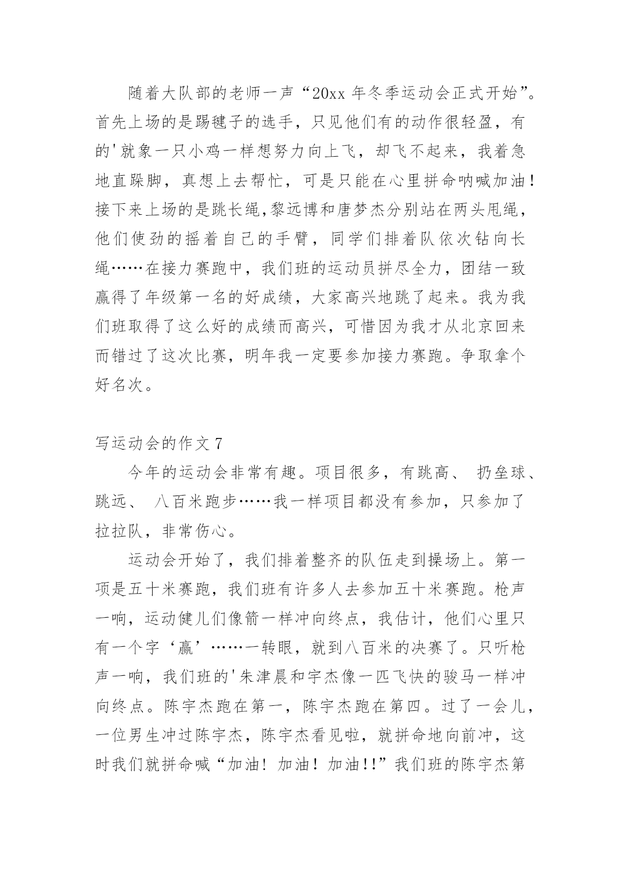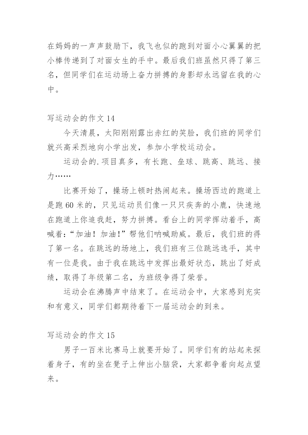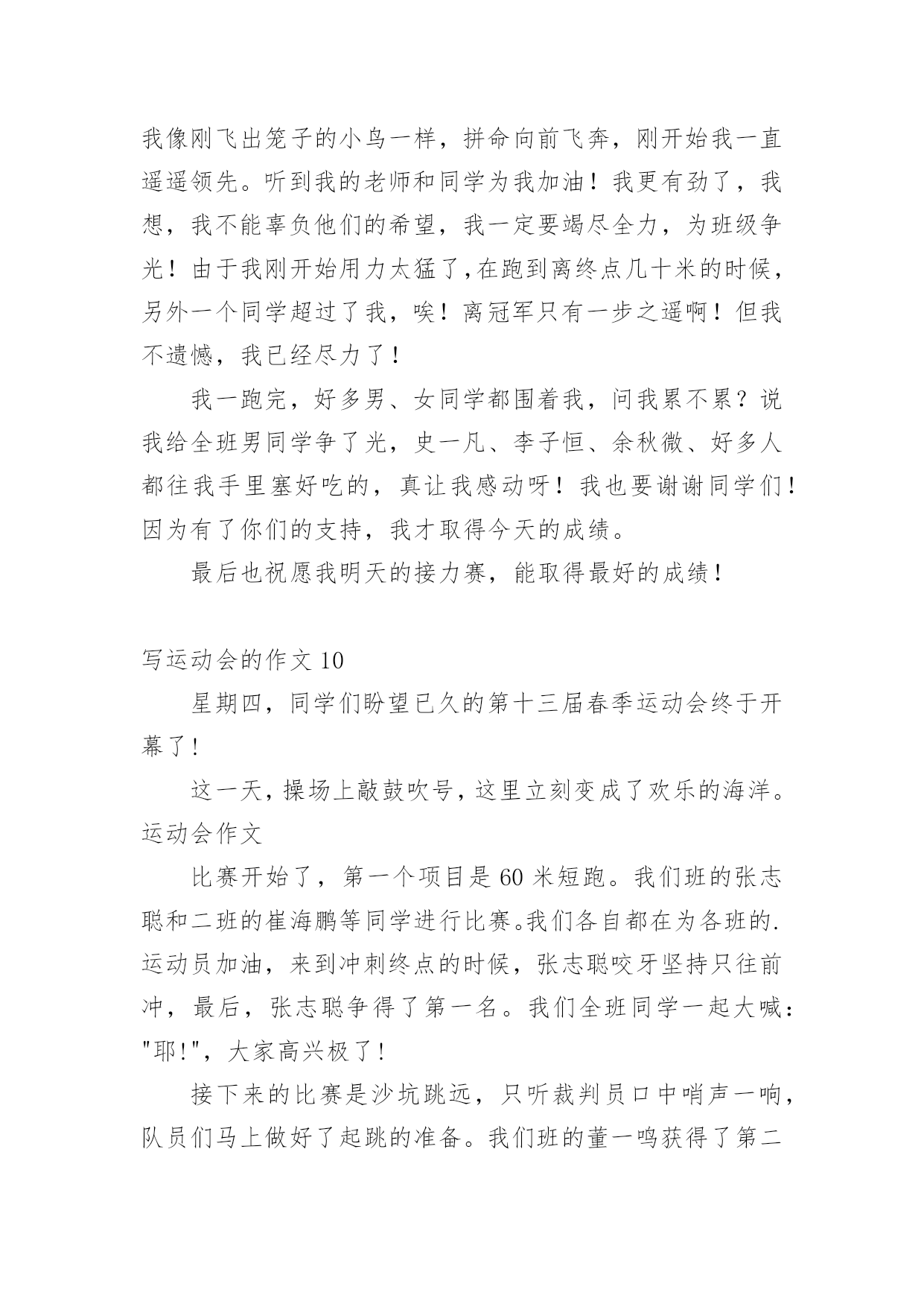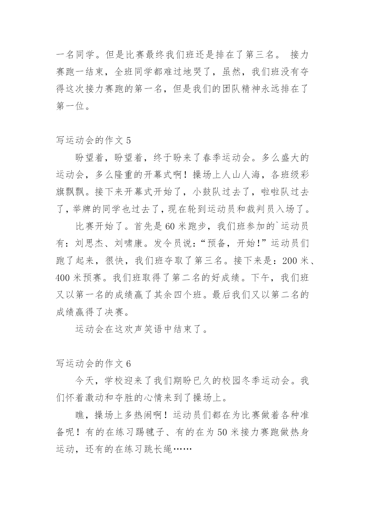 写运动会的作文写运动会的作文【荐】在学习、工作乃至生活中,大家都经常看到作文的身影吧,作文是通过文字来表达一个主题意义的记叙方法。作文的注意事项有许多,你确定会写吗?下面是小编为大家收集的写运动会的作文,仅供参考,大家一起来看看吧。写运动会的作文1在星期三我们建设路小学开展了一年一度的春季运动会,在这里各班的运动健将都来了。首先是开幕式,开幕式足足用了一个多小时,开始比赛了,先是二年级的,我们班的同学说“跑的真快啊,如风一般”又有的同学说:“怎么还没到六年级呢?”我们都在那皱眉头,不知道什么时候才能到六年级比赛,我焦急万分,我们大约又等了一个小时,终于看到六年级的同学出场了,他们个个卯足了劲,好似马上离弦的箭。老师举起乌黑的发令枪,周围一切都静了下来,运动员们各占一条跑道,他们屏住呼吸,全神贯注,向战士们在等待着冲锋的号令,“砰”的.一声一颗红色信号弹腾空而起,场上身穿各色衣衫的运动员,“唰”的一声从起跑线上冲了出去,像一片彩云在骄阳似火的天气下冲向终点。我们班的范奥君赢得了冠军,他是我们全班的骄傲。在比赛中不仅要有实力还要有勇气,所以范奥君不仅有实力还有身先士卒的勇气。写运动会的作文2我们期盼已久的运动会终于到来了,操场上人流如潮,当人们都坐在观众席上时,突然间锣鼓喧天,声震四方。这时是鼓号队、花束队上场了,后来接着就是运动员入场了。开幕式过后,激动人心的比赛就开始了。首先就是田径比赛,我们班有位同学参加了200米的比赛。当运动员们站在起跑线上时,我们一双双眼睛凝视着他们,可想而知,啦啦队的队员是多么激动啊!“预备,跑!”发令员一发令,一个个运动员像一支支离了弦的箭一般“发射”了出去。瞬间操场上像炸了锅一般。我们站起来,摇起了双手,大声呐喊道:“加油!加油!快跑啊,超过他,加油啊!”我们班的`运动员听到了我们的加油声,一鼓气冲向了终点,把第一的宝座夺了过来。我们班的喝彩声响彻云霄。有了第一次的成功,后来的比赛我们班是连连夺冠。时间飞快,转眼间一天半的时间过去了,当我们听到我班总分第一的喜讯时,全班同学的喝彩声再一次回想在赛场上!写运动会的作文3等啊等,盼啊盼,热闹的运动会开始了!一走进操场就会听到悦耳的声音,一个个精神十足的运动员大摇大摆的`走着,还向我们招手呢。比赛开始了,运动员像箭一样的冲向终点,我们都大声喊着:“加油,加油!”运动员们听到了我们的喊声,就更加带劲了。比赛非常激烈,运动员一个个冲过终点,我们看到运动员们都累得满头大汗。滚轮胎的比赛开始了,一个个运动员把轮胎滚得飞快,这个运动员把轮胎传递给那个运动员,大家忙得不亦乐乎。没错,这个项目只有大家团结一致才能获胜,还需要我们的鼓励。这一次运动会,让我知道了“团结一心,土变金”的道理。只要大家团结一致,就一定会成功。我喜欢这难忘有趣的运动会。写运动会的作文4星期五,天气晴朗,万里无云,学校举行了一年一度的冬季运动会。比赛的项目有:跑步、跳高、跳远、跳绳等,其中,让我最难忘的就是接力赛跑的那一刻。只听裁判员一声哨响,五名同学像利箭一样射出,比赛刚开始,我们班还可以数一数二,可是,当轮到石云琴同学接棒时,只听到“砰”的.一声,接力棒落到了地上,这一刻,永远留在了我的心中。“完了!完了!”我大声地喊着。轮到我接棒时,我心里想:我们一定要把第一夺回来,于是我一把抓过接力棒,飞快地向前冲去,此时,耳边只听见同学们在拼命的呼喊:“加油,加油……”在同学们的呼喊声中,返回时,我发现自己已经超过了一名同学。但是比赛最终我们班还是排在了第三名。接力赛跑一结束,全班同学都难过地哭了,虽然,我们班没有夺得这次接力赛跑的第一名,但是我们的团队精神永远排在了第一位。写运动会的作文5盼望着,盼望着,终于盼来了春季运动会。多么盛大的运动会,多么隆重的开幕式啊!操场上人山人海,各班级彩旗飘飘。接下来开幕式开始了,小鼓队过去了,啦啦队过去了,举牌的同学也过去了,现在轮到运动员和裁判员入场了。比赛开始了。首先是60米跑步,我们班参加的`运动员有:刘思杰、刘啸康。发令员说:“预备,开始!”运动员们跑了起来,很快,我们班夺取了第三名。接下来是:200米、400米预赛。我们班取得了第二名的好成绩。下午,我们班又以第一名的成绩赢了其余四个班。最后我们又以第二名的成绩赢得了决赛。运动会在这欢声笑语中结束了。写运动会的作文6今天,学校迎来了我们期盼已久的校园冬季运动会。我们怀着激动和夺胜的心情来到了操场上。瞧,操场上多热闹啊!运动员们都在为比赛做着各种准备呢!有的在练习踢毽子、有的在为50米接力赛跑做热身运动,还有的在练习跳长绳……随着大队部的老师一声“20xx年冬季运动会正式开始”。首先上场的是踢毽子的选手,只见他们有的动作很轻盈,有的'就象一只小鸡一样想努力向上飞,却飞不起来,我着急地直跺脚,真想上去帮忙