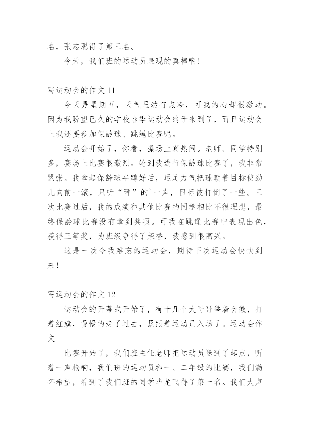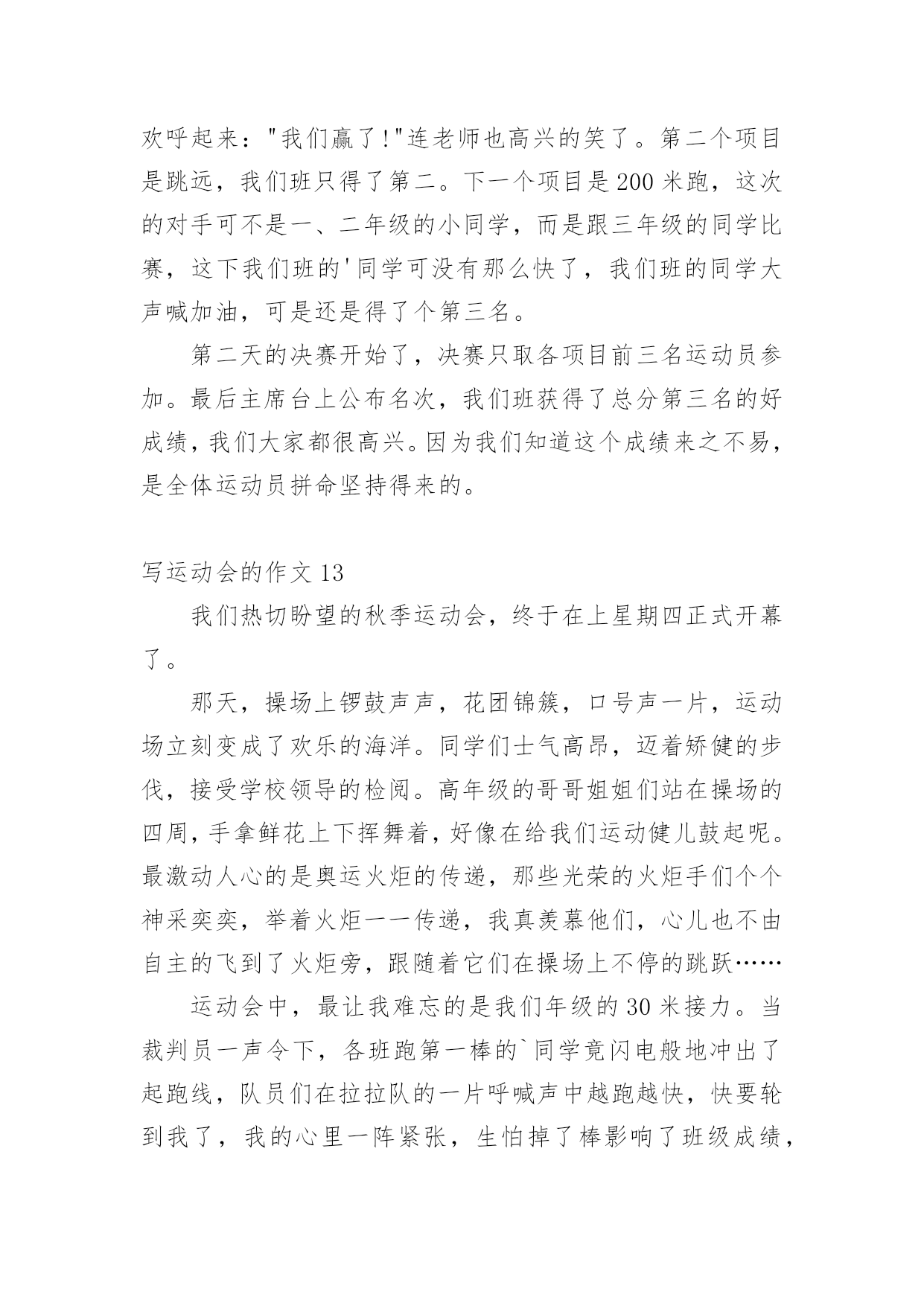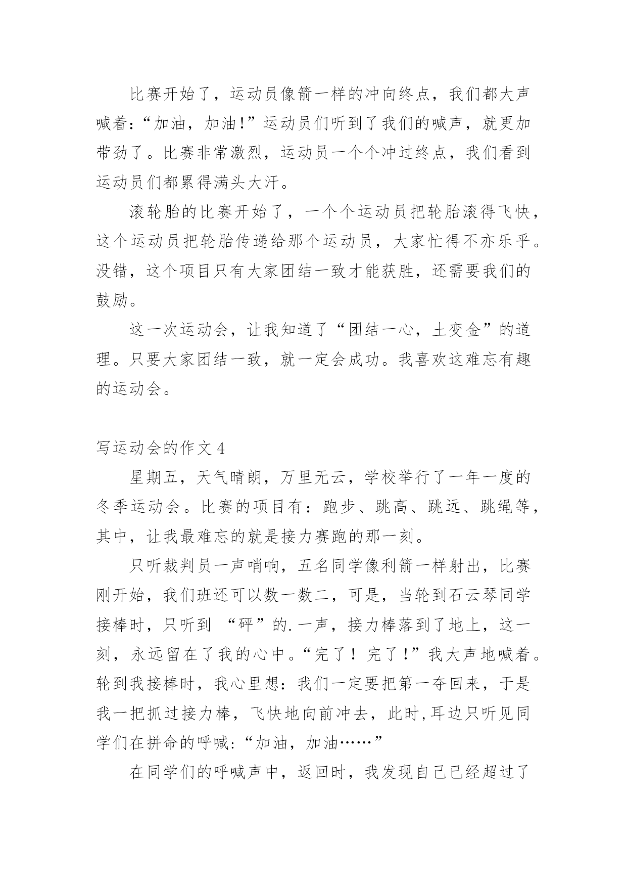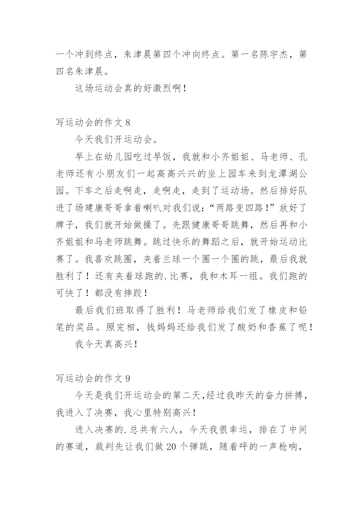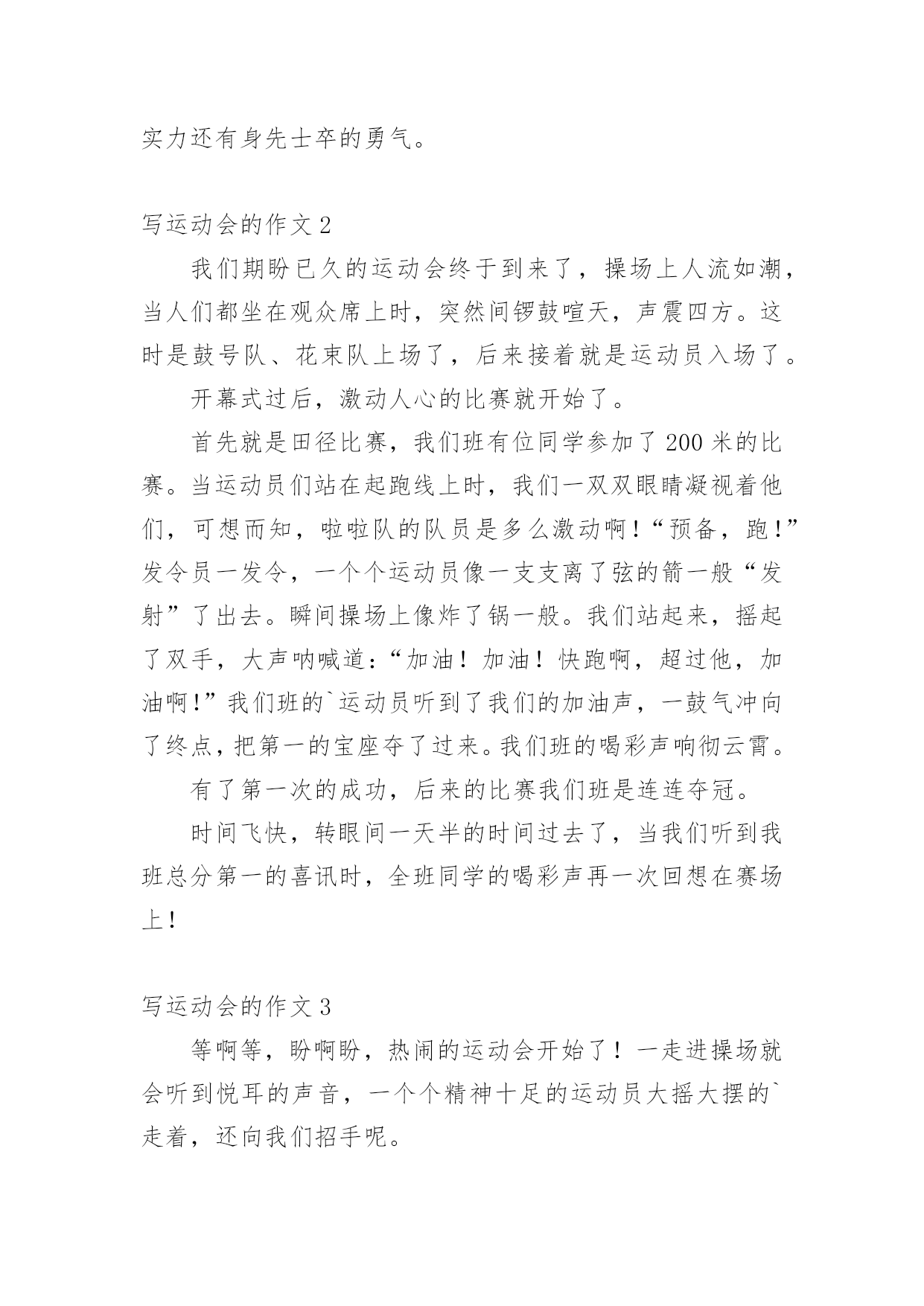 写运动会的作文写运动会的作文【荐】在学习、工作乃至生活中,大家都经常看到作文的身影吧,作文是通过文字来表达一个主题意义的记叙方法。作文的注意事项有许多,你确定会写吗?下面是小编为大家收集的写运动会的作文,仅供参考,大家一起来看看吧。写运动会的作文1在星期三我们建设路小学开展了一年一度的春季运动会,在这里各班的运动健将都来了。首先是开幕式,开幕式足足用了一个多小时,开始比赛了,先是二年级的,我们班的同学说“跑的真快啊,如风一般”又有的同学说:“怎么还没到六年级呢?”我们都在那皱眉头,不知道什么时候才能到六年级比赛,我焦急万分,我们大约又等了一个小时,终于看到六年级的同学出场了,他们个个卯足了劲,好似马上离弦的箭。老师举起乌黑的发令枪,周围一切都静了下来,运动员们各占一条跑道,他们屏住呼吸,全神贯注,向战士们在等待着冲锋的号令,“砰”的.一声一颗红色信号弹腾空而起,场上身穿各色衣衫的运动员,“唰”的一声从起跑线上冲了出去,像一片彩云在骄阳似火的天气下冲向终点。我们班的范奥君赢得了冠军,他是我们全班的骄傲。在比赛中不仅要有实力还要有勇气,所以范奥君不仅有实力还有身先士卒的勇气。写运动会的作文2我们期盼已久的运动会终于到来了,操场上人流如潮,当人们都坐在观众席上时,突然间锣鼓喧天,声震四方。这时是鼓号队、花束队上场了,后来接着就是运动员入场了。开幕式过后,激动人心的比赛就开始了。首先就是田径比赛,我们班有位同学参加了200米的比赛。当运动员们站在起跑线上时,我们一双双眼睛凝视着他们,可想而知,啦啦队的队员是多么激动啊!“预备,跑!”发令员一发令,一个个运动员像一支支离了弦的箭一般“发射”了出去。瞬间操场上像炸了锅一般。我们站起来,摇起了双手,大声呐喊道:“加油!加油!快跑啊,超过他,加油啊!”我们班的`运动员听到了我们的加油声,一鼓气冲向了终点,把第一的宝座夺了过来。我们班的喝彩声响彻云霄。有了第一次的成功,后来的比赛我们班是连连夺冠。时间飞快,转眼间一天半的时间过去了,当我们听到我班总分第一的喜讯时,全班同学的喝彩声再一次回想在赛场上!写运动会的作文3等啊等,盼啊盼,热闹的运动会开始了!一走进操场就会听到悦耳的声音,一个个精神十足的运动员大摇大摆的`走着,还向我们招手呢。比赛开始了,运动员像箭一样的冲向终点,我们都大声喊着:“加油,加油!”运动员们听到了我们的喊声,就更加带劲了。比赛非常激烈,运动员一个个冲过终点,我们看到运动员们都累得满头大汗。滚轮胎的比赛开始了,一个个运动员把轮胎滚得飞快,这个运动员把轮胎传递给那个运动员,大家忙得不亦乐乎。没错,这个项目只有大家团结一致才能获胜,还需要我们的鼓励。这一次运动会,让我知道了“团结一心,土变金”的道理。只要大家团结一致,就一定会成功。我喜欢这难忘有趣的运动会。写运动会的作文4星期五,天气晴朗,万里无云,学校举行了一年一度的冬季运动会。比赛的项目有:跑步、跳高、跳远、跳绳等,其中,让我最难忘的就是接力赛跑的那一刻。只听裁判员一声哨响,五名同学像利箭一样射出,比赛刚开始,我们班还可以数一数二,可是,当轮到石云琴同学接棒时,只听到“砰”的.一声,接力棒落到了地上,这一刻,永远留在了我的心中。“完了!完了!”我大声地喊着。轮到我接棒时,我心里想:我们一定要把第一夺回来,于是我一把抓过接力棒,飞快地向前冲去,此时,耳边只听见同学们在拼命的呼喊:“加油,加油……”在同学们的呼喊声中,返回时,我发现自己已经超过了一名同学。但是比赛最终我们班还是排在了第三名。接力赛跑一结束,全班同学都难过地哭了,虽然,我们班没有夺得这次接力赛跑的第一名,但是我们的团队精神永远排在了第一位。写运动会的作文5盼望着,盼望着,终于盼来了春季运动会。多么盛大的运动会,多么隆重的开幕式啊!操场上人山人海,各班级彩旗飘飘。接下来开幕式开始了,小鼓队过去了,啦啦队过去了,举牌的同学也过去了,现在轮到运动员和裁判员入场了。比赛开始了。首先是60米跑步,我们班参加的`运动员有:刘思杰、刘啸康。发令员说:“预备,开始!”运动员们跑了起来,很快,我们班夺取了第三名。接下来是:200米、400米预赛。我们班取得了第二名的好成绩。下午,我们班又以第一名的成绩赢了其余四个班。最后我们又以第二名的成绩赢得了决赛。运动会在这欢声笑语中结束了。写运动会的作文6今天,学校迎来了我们期盼已久的校园冬季运动会。我们怀着激动和夺胜的心情来到了操场上。瞧,操场上多热闹啊!运动员们都在为比赛做着各种准备呢!有的在练习踢毽子、有的在为50米接力赛跑做热身运动,还有的在练习跳长绳……随着大队部的老师一声“20xx年冬季运动会正式开始”。首先上场的是踢毽子的选手,只见他们有的动作很轻盈,有的'就象一只小鸡一样想努力向上飞,却飞不起来,我着急地直跺脚,真想上去帮忙