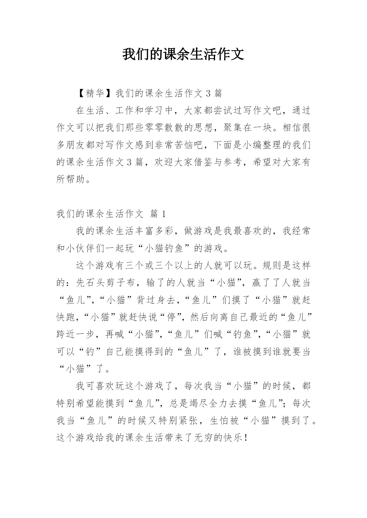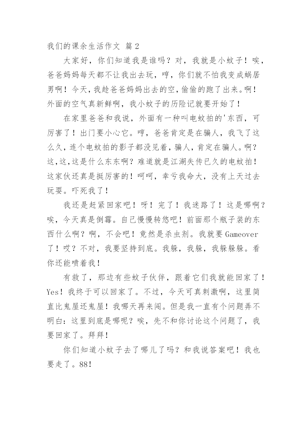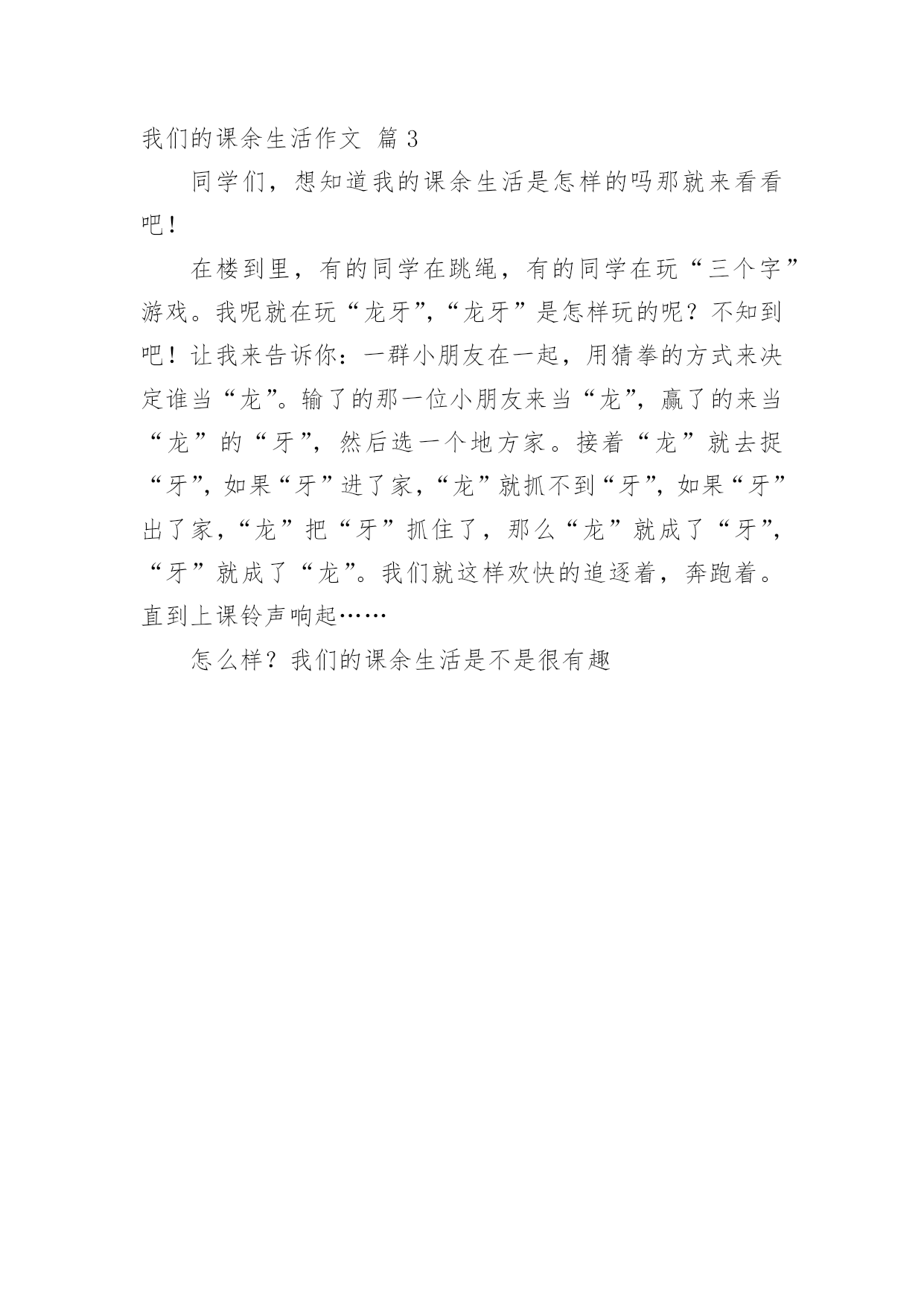 我们的课余生活作文【精华】我们的课余生活作文3篇在生活、工作和学习中,大家都尝试过写作文吧,通过作文可以把我们那些零零散散的思想,聚集在一块。相信很多朋友都对写作文感到非常苦恼吧,下面是小编整理的我们的课余生活作文3篇,欢迎大家借鉴与参考,希望对大家有所帮助。我们的课余生活作文篇1我的课余生活丰富多彩,做游戏是我最喜欢的,我经常和小伙伴们一起玩“小猫钓鱼”的游戏。这个游戏有三个或三个以上的人就可以玩。规则是这样的:先石头剪子布,输了的人就当“小猫”,赢了了人就当“鱼儿”,“小猫”背过身去,“鱼儿”们摸了“小猫”就赶快跑,“小猫”就赶快说“停”,然后向离自己最近的“鱼儿”跨近一步,再喊“小猫”,“鱼儿”们喊“钓鱼”,“小猫”就可以“钓”自己能摸得到的“鱼儿”了,谁被摸到谁就要当“小猫”了。我可喜欢玩这个游戏了,每次我当“小猫”的时候,都特别希望能摸到“鱼儿”,总是竭尽全力去摸“鱼儿”;每次我当“鱼儿”的时候又特别紧张,生怕被“小猫”摸到了。这个游戏给我的课余生活带来了无穷的快乐!我们的课余生活作文篇2大家好,你们知道我是谁吗?对,我就是小蚊子!唉,爸爸妈妈每天都不让我出去玩,哼,你们就不怕我变成蜗居男啊!今天,我趁爸爸妈妈出去的空,偷偷的跑了出来。啊!外面的空气真新鲜啊,我小蚊子的历险记就要开始了!在家里爸爸和我说,外面有一种叫电蚊拍的'东西,可厉害了!出门要小心它。哼,爸爸肯定是在骗人,我飞了这么久,连个电蚊拍的影子都没见着,骗人,肯定在骗人。啊?这,这,这是什么东东啊?难道就是江湖失传已久的电蚊拍!这家伙还真是挺厉害的!呵呵,幸亏我命大,没有上天过去玩耍。吓死我了!我还是赶紧回家吧!呀!完了!我迷路了!这是哪啊?唉,今天真是倒霉。自己慢慢转悠吧!前面那个瓶子装的东西什么啊?啊,不会吧!竟然是杀虫剂。我就要Gameover了!哎?不对,我要坚持到底。我躲,我躲,我躲躲躲。看你还能喷着我!有救了,那边有些蚊子伙伴,跟着它们我就能回家了!Yes!我终于可以回家了。不过,今天可真刺激啊,这里简直比鬼屋还鬼屋!我哪天再来闯。但是我一直有个问题弄不明白:这里到底是哪呢?唉,先不和你讨论这个问题了,我要回家了。拜拜!你们知道小蚊子去了哪儿了吗?和我说答案吧!我也要走了。88!我们的课余生活作文篇3同学们,想知道我的课余生活是怎样的吗那就来看看吧!在楼到里,有的同学在跳绳,有的同学在玩“三个字”游戏。我呢就在玩“龙牙”,“龙牙”是怎样玩的呢?不知到吧!让我来告诉你:一群小朋友在一起,用猜拳的方式来决定谁当“龙”。输了的那一位小朋友来当“龙”,赢了的来当“龙”的“牙”,然后选一个地方家。接着“龙”就去捉“牙”,如果“牙”进了家,“龙”就抓不到“牙”,如果“牙”出了家,“龙”把“牙”抓住了,那么“龙”就成了“牙”,“牙”就成了“龙”。我们就这样欢快的追逐着,奔跑着。直到上课铃声响起……怎么样?我们的课余生活是不是很有趣