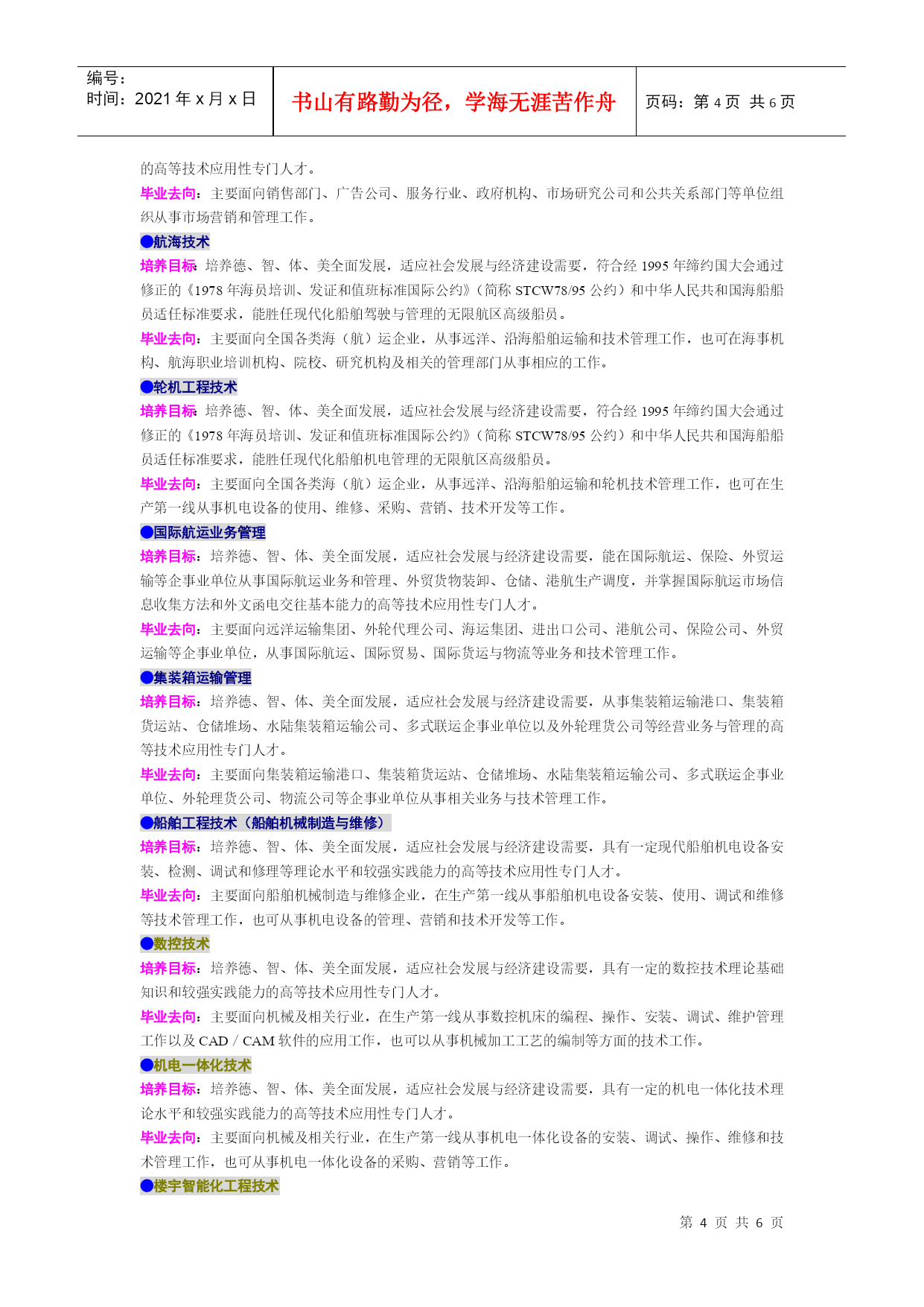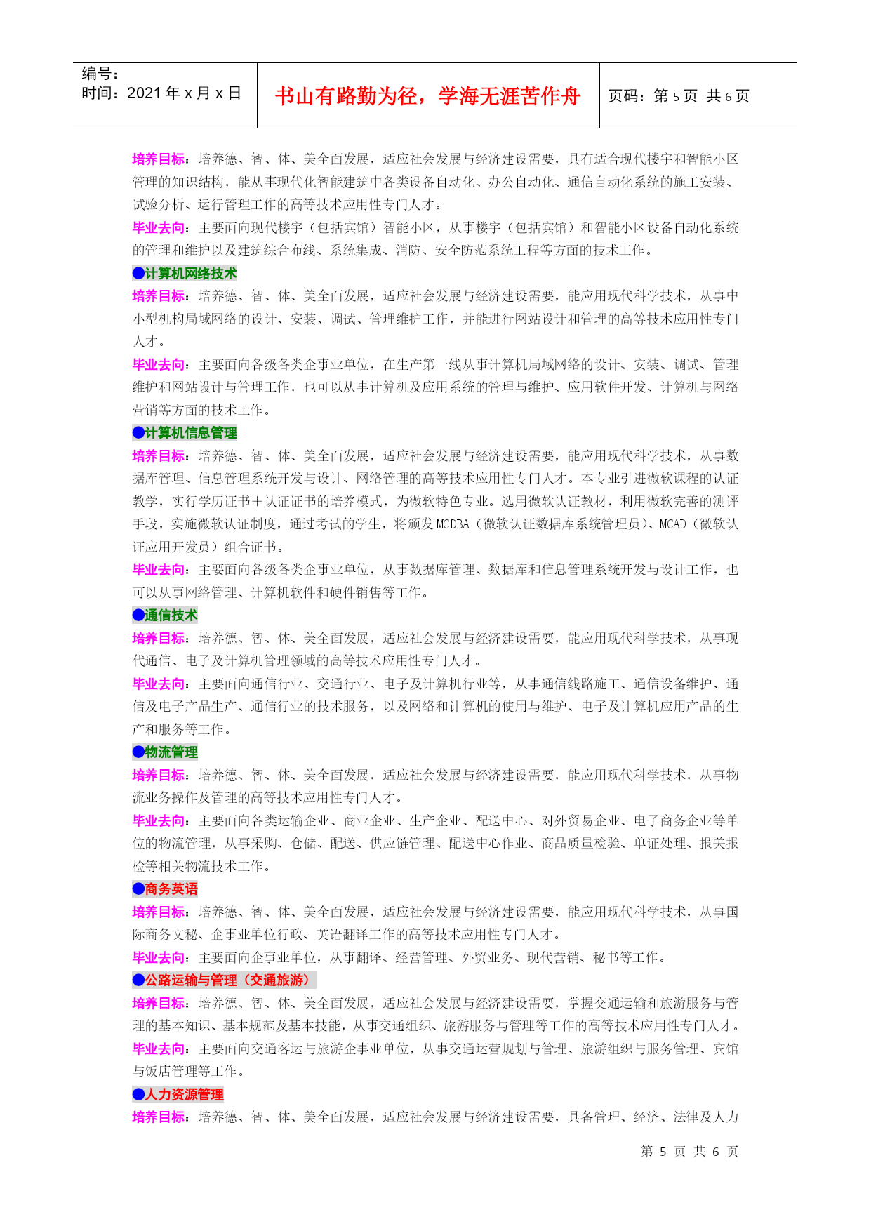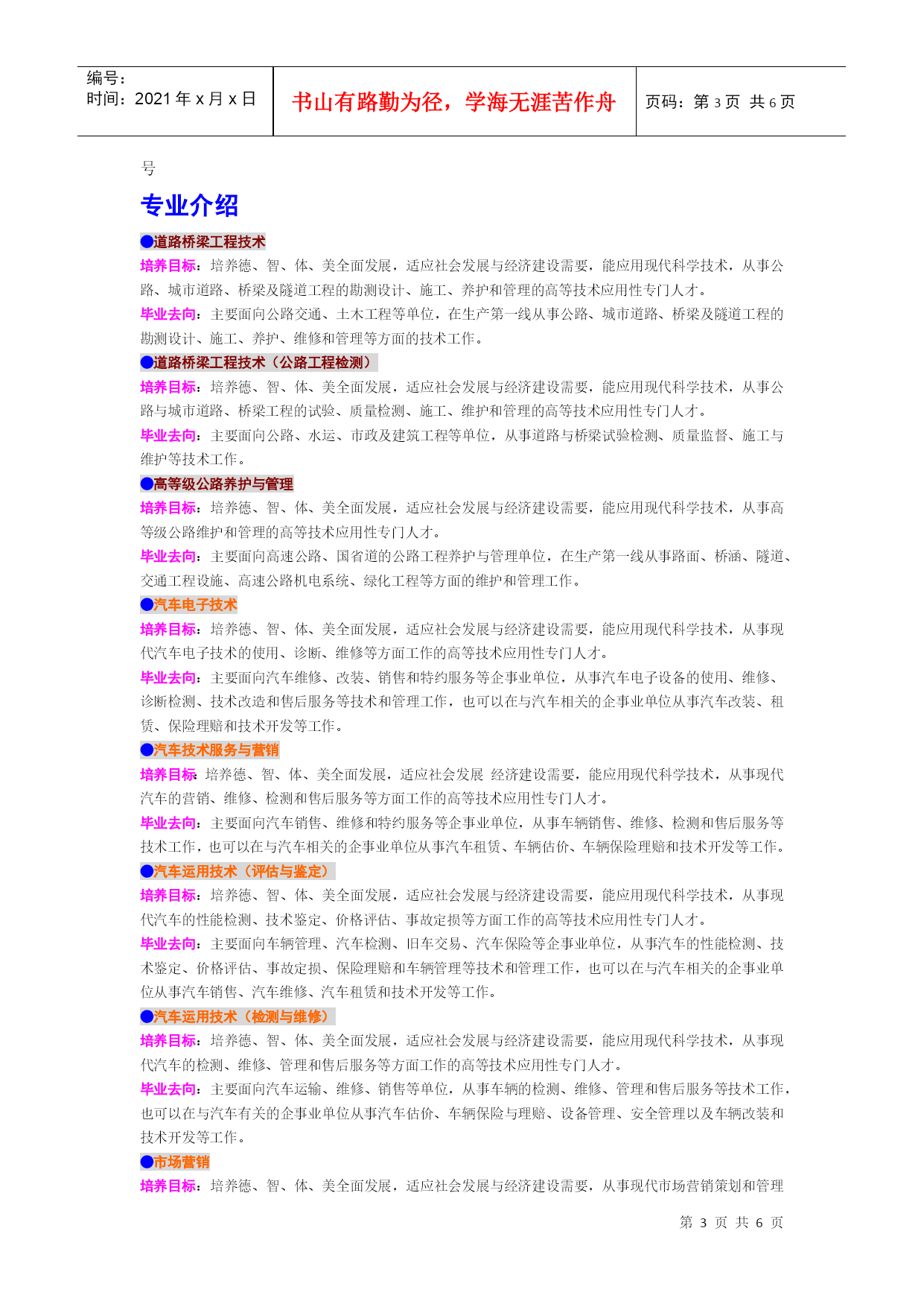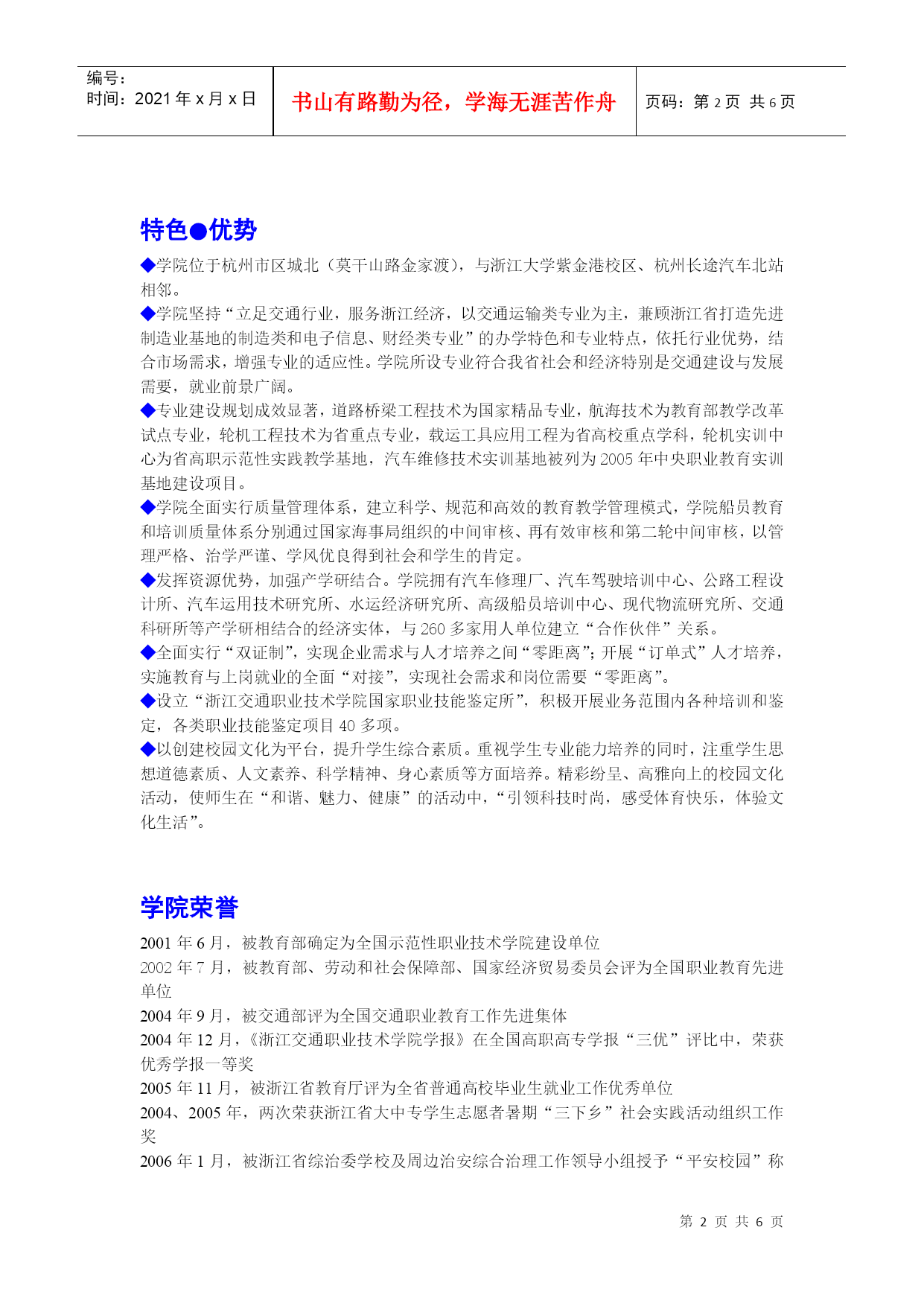 编号:时间:2021年x月x日书山有路勤为径,学海无涯苦作舟页码:第PAGE6页共NUMPAGES6页第PAGE\*MERGEFORMAT6页共NUMPAGES\*MERGEFORMAT6页浙江交通职业技术学院学院代码:042国标代码:12036学院概况●我院前身为浙江省交通学校,创建于1958年,1999年经国家教育部批准成立,属公办普通高等学校。●学院占地面积685亩,校舍建筑面积15万平方米,拥有现代化、数字化的教育教学基础设施和先进的现代教育教学技术设备。图书馆藏书34.05万册,固定资产1.4亿元。●全日制在校生6000余名,教职工455名。有高级职称教师124名,全国交通高等职业教育专业带头人2名,浙江省高校中青年学科带头人1名,省交通系统“283”拔尖人才4名,省“新世纪151人才工程”第三层次培养人员1名。●学院设有路桥系、汽车系、机电系、管理与信息系、人文系、海运学院、成人教育学院等5系2院,开设26个全日制高职专业和16个成人高职专业。●道路桥梁工程技术、航海技术和轮机工程技术三个专业分别被确定为国家精品专业、教育部教学改革试点专业和省重点专业。●学院坚持以社会需求为目标,学生就业为导向,能力培养为主线,素质教育为基础的办学指导思想,培养适应生产、建设、管理和服务第一线需要的高等技术应用型专门人才。学生毕业时,拥有相应的专业岗位技能资格证书,毕业—-上岗“零距离”,历届毕业生深受用人单位欢迎,2004年、2005年我院毕业生初次就业率分别为95.08%、96.47%。●学院设有同济大学、大连海事大学、武汉理工大学等3所高校8个专业的函授、网络教育专科及“专升本”教育。学生在校学习期间可以参加相应专业的“专升本”自学考试,在毕业前可以参加全省“专升本”考试。●学院建立了一系列的“奖、助、贷、减、补”等制度和措施,并为学生提供大量勤工助学的机会,帮助和扶持家庭困难学生完成学业。●学院高度重视国际交流、产学研结合和校企合作。目前,学院已与丰田汽车(中国)有限公司合作T-TEP项目(丰田汽车技术教育),与路桥、汽车、海运、物流、宾馆、计算机、通信等相关的91家企事业单位共同建立教育教学实训基地,为学生提供了广阔的实习、实训和就业空间。●学院坚持“立足浙江交通,依托交通行业,服务浙江经济,以交通运输类专业为主,兼顾浙江省打造先进制造业基地的制造类和电子信息、财经类专业”的办学特色和专业特点,充分依托行业优势,结合市场需求,增强专业的适应性。学院的发展目标是建成全国一流、具有交通行业特色的全国示范性高等职业技术学院。学院地址:杭州市莫干山路金家渡邮政编码:311112招生热线:0571-884818808848175888481749传真:0571-88481880学院网址:HYPERLINK"http://www.zjvtit.edu.cn"www.zjvtit.edu.cnE-mail:zhbb@zjvtit.edu.cn公交线路:杭州市区武林广场(杭州大厦)67路公交车至“交通学院”终点站联系人:任老师鞠老师项老师洪老师特色●优势◆学院位于杭州市区城北(莫干山路金家渡),与浙江大学紫金港校区、杭州长途汽车北站相邻。◆学院坚持“立足交通行业,服务浙江经济,以交通运输类专业为主,兼顾浙江省打造先进制造业基地的制造类和电子信息、财经类专业”的办学特色和专业特点,依托行业优势,结合市场需求,增强专业的适应性。学院所设专业符合我省社会和经济特别是交通建设与发展需要,就业前景广阔。◆专业建设规划成效显著,道路桥梁工程技术为国家精品专业,航海技术为教育部教学改革试点专业,轮机工程技术为省重点专业,载运工具应用工程为省高校重点学科,轮机实训中心为省高职示范性实践教学基地,汽车维修技术实训基地被列为2005年中央职业教育实训基地建设项目。◆学院全面实行质量管理体系,建立科学、规范和高效的教育教学管理模式,学院船员教育和培训质量体系分别通过国家海事局组织的中间审核、再有效审核和第二轮中间审核,以管理严格、治学严谨、学风优良得到社会和学生的肯定。◆发挥资源优势,加强产学研结合。学院拥有汽车修理厂、汽车驾驶培训中心、公路工程设计所、汽车运用技术研究所、水运经济研究所、高级船员培训中心、现代物流研究所、交通科研所等产学研相结合的经济实体,与260多家用人单位建立“合作伙伴”关系。◆全面实行“双证制”,实现企业需求与人才培养之间“零距离”;开展“订单式”人才培养,实施教育与上岗就业的全面“对接”,实现社会需求和岗位需要“零距离”。◆设立“浙江交通职业技术学院国家职业技能鉴定所”,积极开展业务范围内各种培训和鉴定,各类职业技能鉴定项目40多项。
