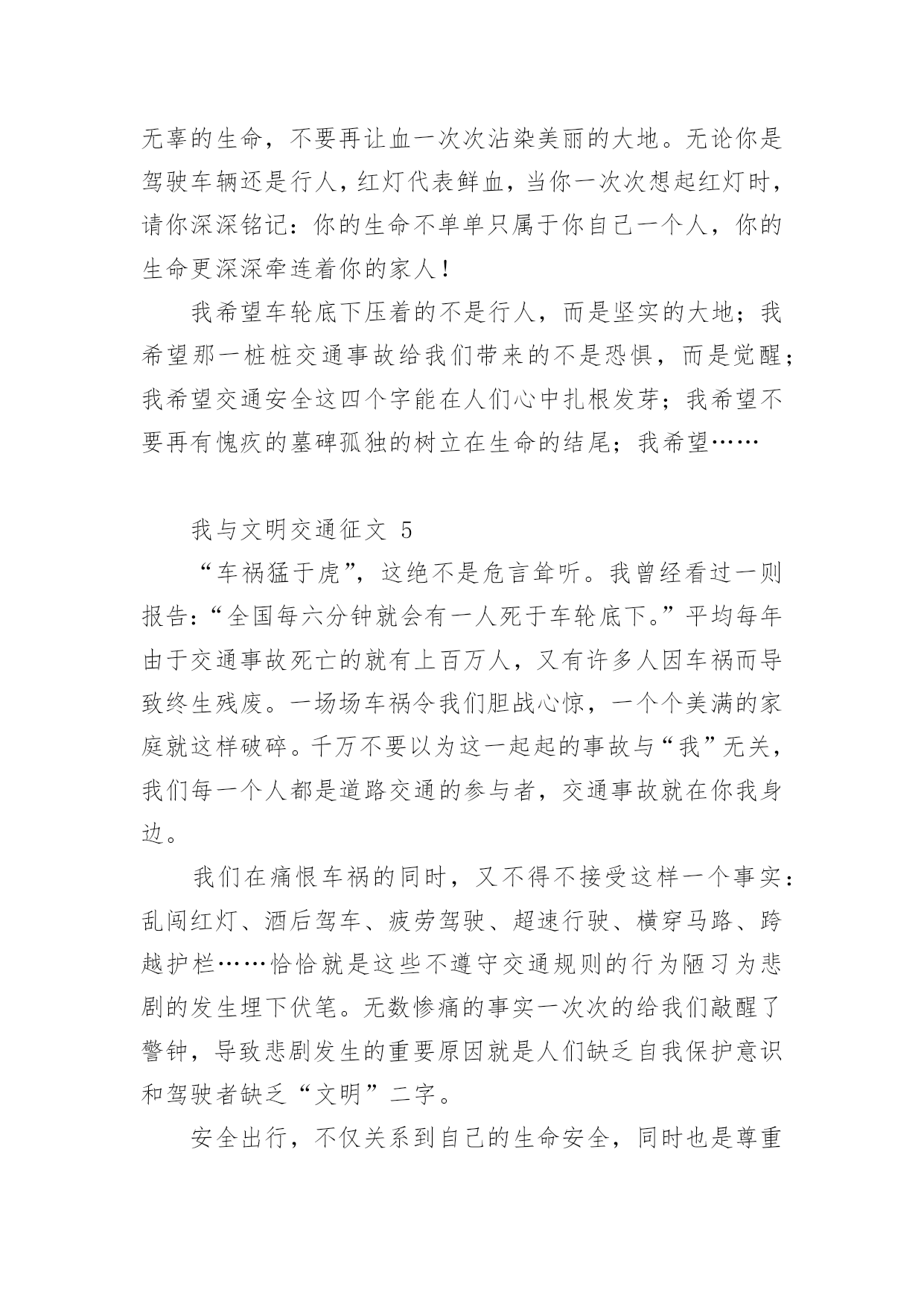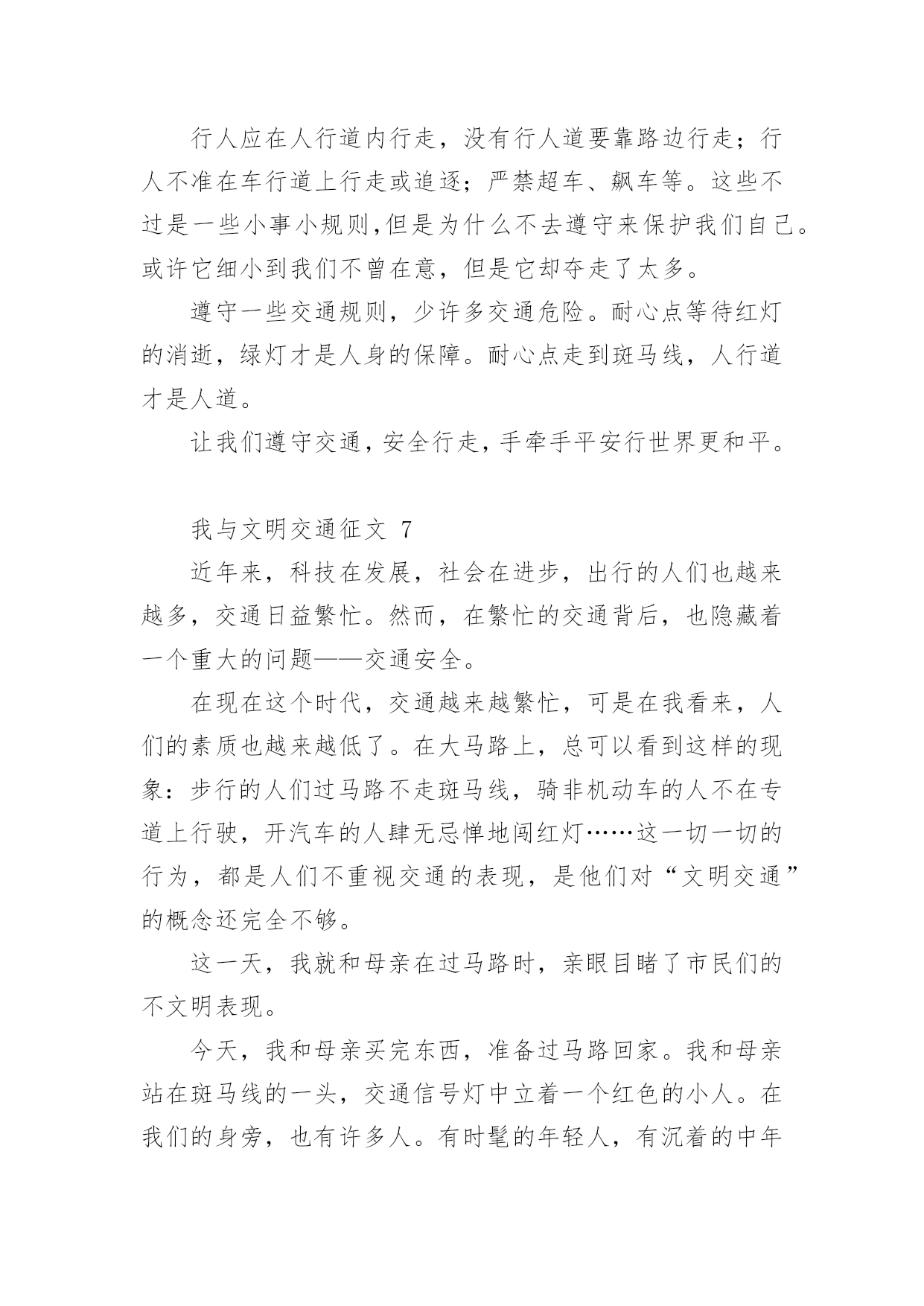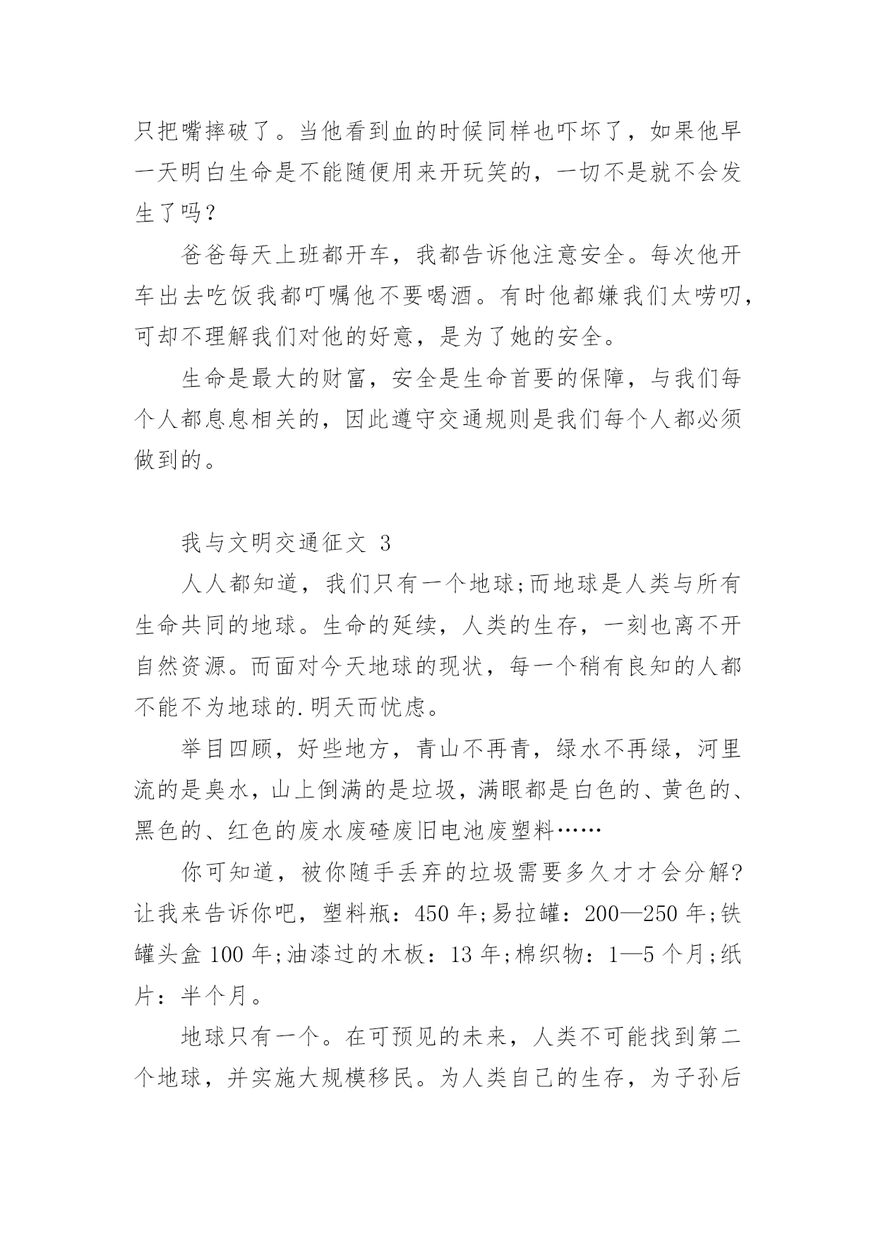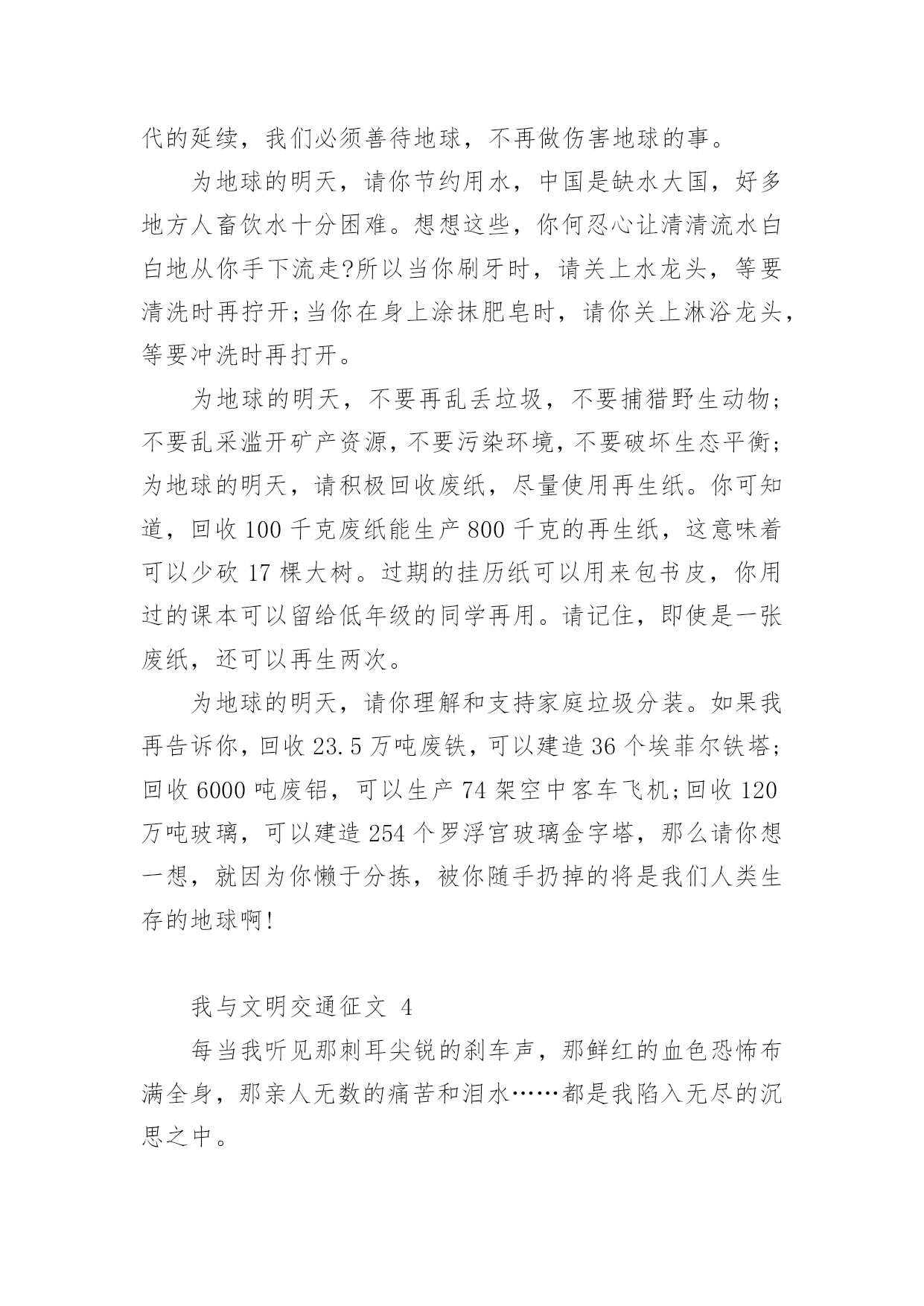 我与文明交通征文我与文明交通征文(精选35篇)无论在学习、工作或是生活中,大家都有写征文的经历,对征文很是熟悉吧,写征文是培养人们的观察力、联想力、想象力、思考力和记忆力的重要手段。那要怎么写好征文呢?以下是小编整理的我与文明交通征文,欢迎阅读与收藏。我与文明交通征文1生命只有一次,生命对于我们每一个人来说都很重要。可近年来,因为交通事故使无数人失去了自己宝贵的生命。这是因为有些人总是酒后驾驶,而发生重大事故。现在每个路口都安装了红绿灯,可因为有些人乱闯红灯,发生了交通事故。因为这些原因发生的事故是数不胜数,可那些不遵守交通规则的人就是不吸取教训,依然闯红灯、酒后驾车。今天,我又在电视上看到了一件重大安全事故,是一件闯红灯后发生的事故。公路上的车辆川流不息,到了红绿灯处,是红灯,所有的车都停了下来。唯独有一辆机动车为了节省时间,一下子冲了过去。刚好侧面也飞驰而来一辆面包车。只听“呯”一声巨响,面包车和机动车相撞了,两辆车已撞得不成样子。一位车主被撞飞到护栏边,一动不动。面包车车主被卡在车座里已经奄奄一息。旁边是他的妻子也仅有一丝气息。后面坐着两个五六岁的孩子哭着喊爸爸妈妈,可见他们俩已被吓坏了。真是可怜!救护车马上来了,经过救治,面包车、机动车车主当场死亡。那位女士被送到医院后,医生用尽了全力救治,已无回天子术了。那两个孩子就这样失去了父母成了孤儿。他们原本幸福美好的家庭破碎了,试问,这何尝不是因为哪位机动车主不遵守交通规则而产生的后果呢?不遵守交通规则的.人后果就是这样,那么遵守交通规则不乱闯红灯的人呢?我比较喜欢骑自行车,每到星期天我就会骑车赶集。到了红绿灯处我会先看看是红灯还是绿灯,我们都要做一个遵守交通规则的人。这一次是红灯,我就停下来。这时,有一位叔叔想闯红灯,往前走了走,但马上又向后倒了倒。我想,他应该是看到我们都停在那里自己,不好意思,所以打消了闯红灯的念头。绿灯亮了,大家都有秩序的走了,个个都平安无事。而那些闯红灯的人呢?他们为自己的行为付出了惨痛的代价。生命只有一次,失去了就无法挽回,我们要珍爱生命,不能拿自己的生命当做儿戏。只有遵守交通规则,我们才能做到关爱生命,平安出行。我与文明交通征文2随着社会的发展汽车越来越多了,人们的生活也比以前方便了,马路也越来越拥挤了。看到川流不息的车辆,使我们感到社会经济的发展真是突飞猛进,让我们欣慰。可任何事情都是相对的。汽车给我们带来的灾祸数不胜数。马路上上演的悲剧真是一幕又一幕。有些司机不遵守交通规则给于我们的教训是惨痛的。我虽然不开车,也不大懂交通规则,但我挺爱看赛车节目的,我想如果一个F1赛车手能在弯道上超车他就离夺冠不远了。可是司机不是赛车手,如果急于超车、闯红灯,那他就会离危险不远了。出车祸的机率就大大提高了,我们既没有受过F1赛车手的转业训练,我们的车也不像赛车那样有马力,又何必超车呢?我们知道安全是第一的,是健康与财富的.保障。刚才我写的虽然有点可怕,但这种交通事故就在我们身边:记得有一次妈妈下班回家,天色比较晚了,他飞快的骑车在回家的路上。忽然冷不防从马路上拐来一辆出租车,车速很快也不打拐弯灯,妈妈躲闪不及一下被车撞倒了,出租车司机被吓坏了,妈妈也吓得魂飞魄散。当我们赶到时,妈妈站不起来了,脸色惨白,出了一身冷汗。万幸的是妈妈只受了轻伤。可是这个故事却给了妈妈和出租车司机留下了沉痛的记忆和深刻的教训。如果妈妈能慢点骑,不急着赶路,出租车司机能文明驾驶,不乱停乱靠一切都不会发生。和我最好的小朋友杨光,他最爱在马路上骑自行车兜风了,觉得这样很神气很过瘾。一天,他自己骑车横穿马路,飞也似的旁若无人,这时来了一辆汽车开得很快,他慌了手脚躲闪不及一下子撞倒了护栏上。幸好撞到了护栏上,幸好只把嘴摔破了。当他看到血的时候同样也吓坏了,如果他早一天明白生命是不能随便用来开玩笑的,一切不是就不会发生了吗?爸爸每天上班都开车,我都告诉他注意安全。每次他开车出去吃饭我都叮嘱他不要喝酒。有时他都嫌我们太唠叨,可却不理解我们对他的好意,是为了她的安全。生命是最大的财富,安全是生命首要的保障,与我们每个人都息息相关的,因此遵守交通规则是我们每个人都必须做到的。我与文明交通征文3人人都知道,我们只有一个地球;而地球是人类与所有生命共同的地球。生命的延续,人类的生存,一刻也离不开自然资源。而面对今天地球的现状,每一个稍有良知的人都不能不为地球的.明天而忧虑。举目四顾,好些地方,青山不再青,绿水不再绿,河里流的是臭水,山上倒满的是垃圾,满眼都是白色的、黄色的、黑色的、红色的废水废碴废旧电池废塑料……你可知道,被你随手丢弃的垃圾需要多久才才会分解?让我来告诉你吧,塑料瓶:450年;易拉罐:200—250年;铁罐头盒100年;油漆过的木板:13年;棉织物:1—5个月;纸片:半个月。地球只有