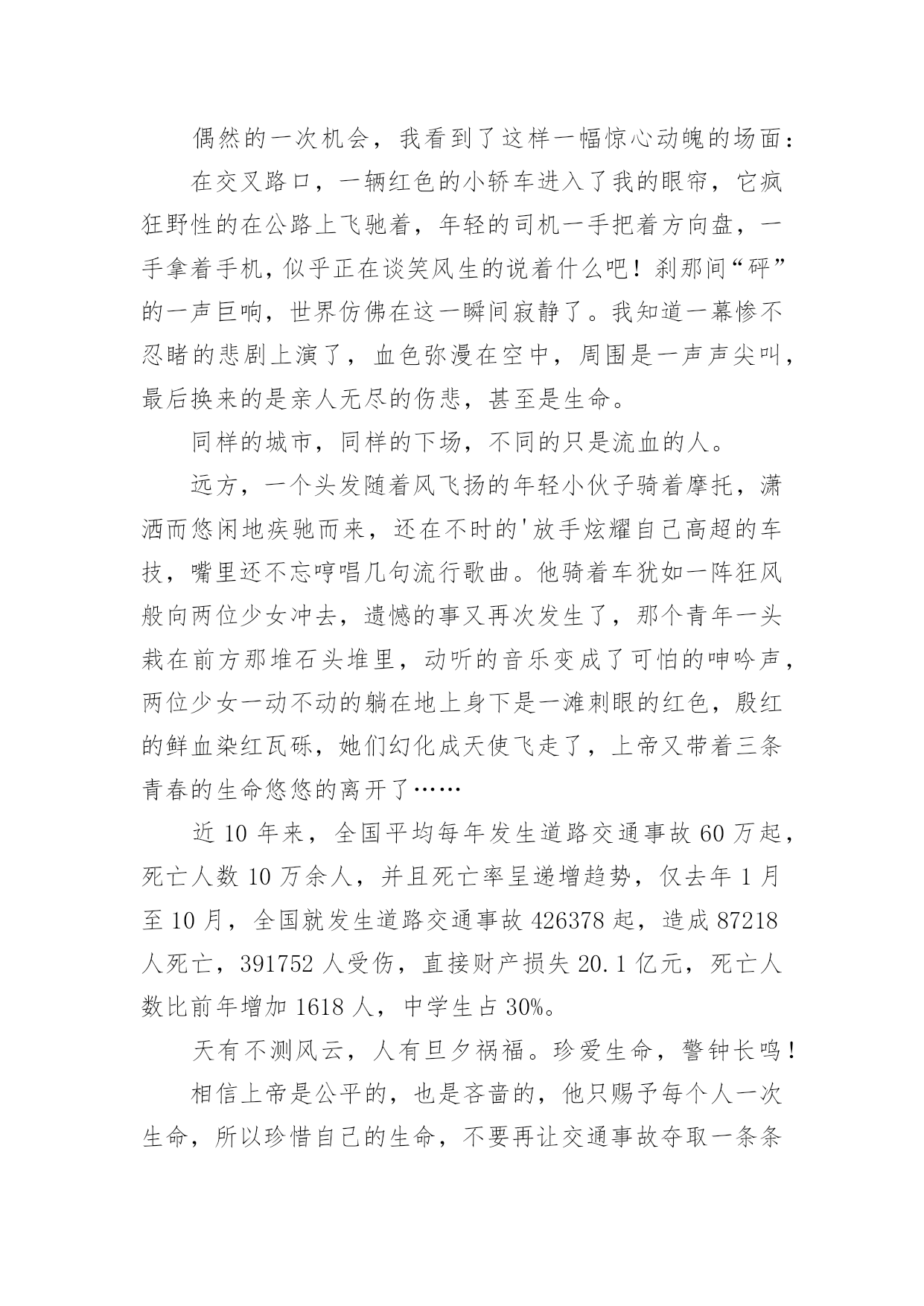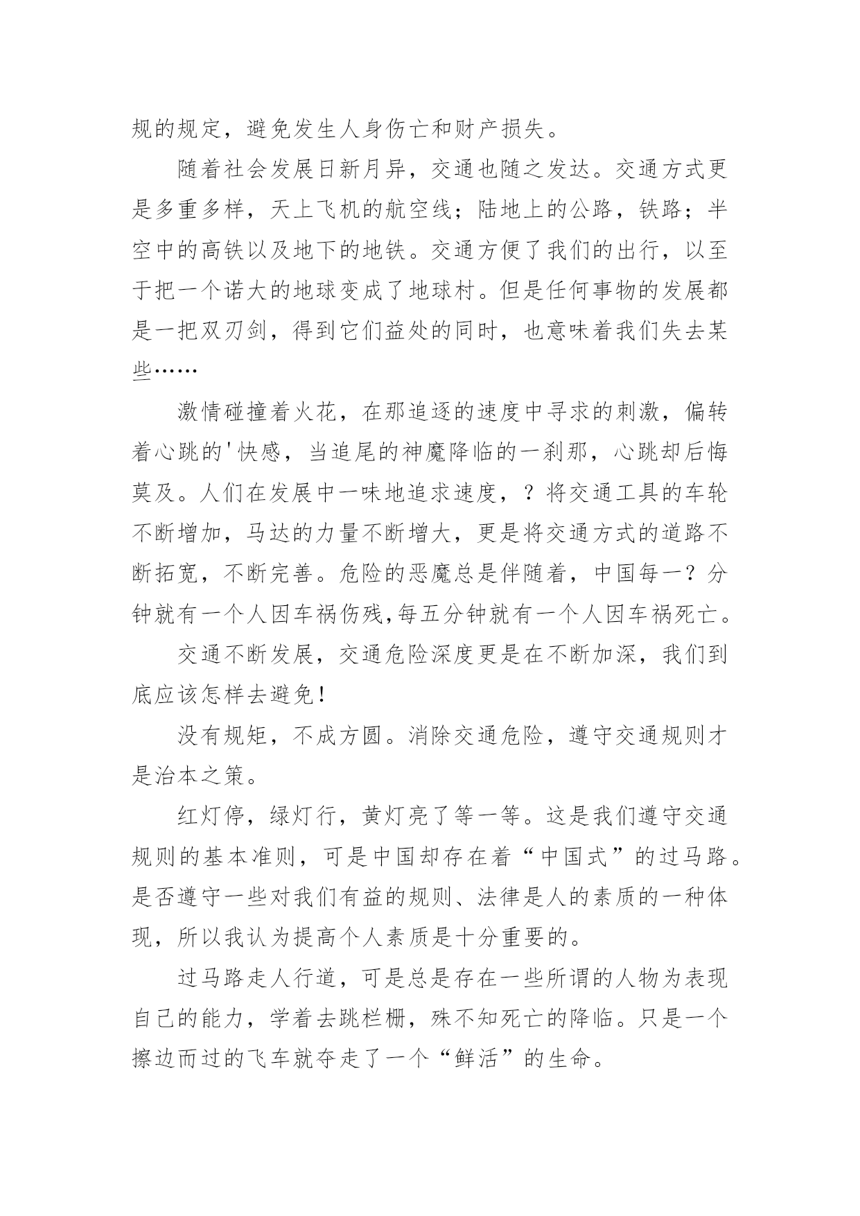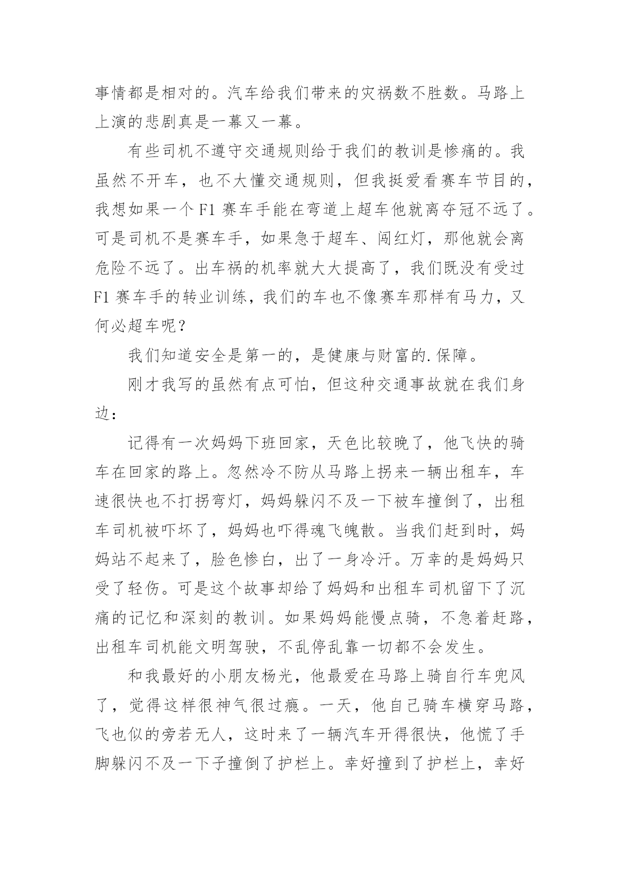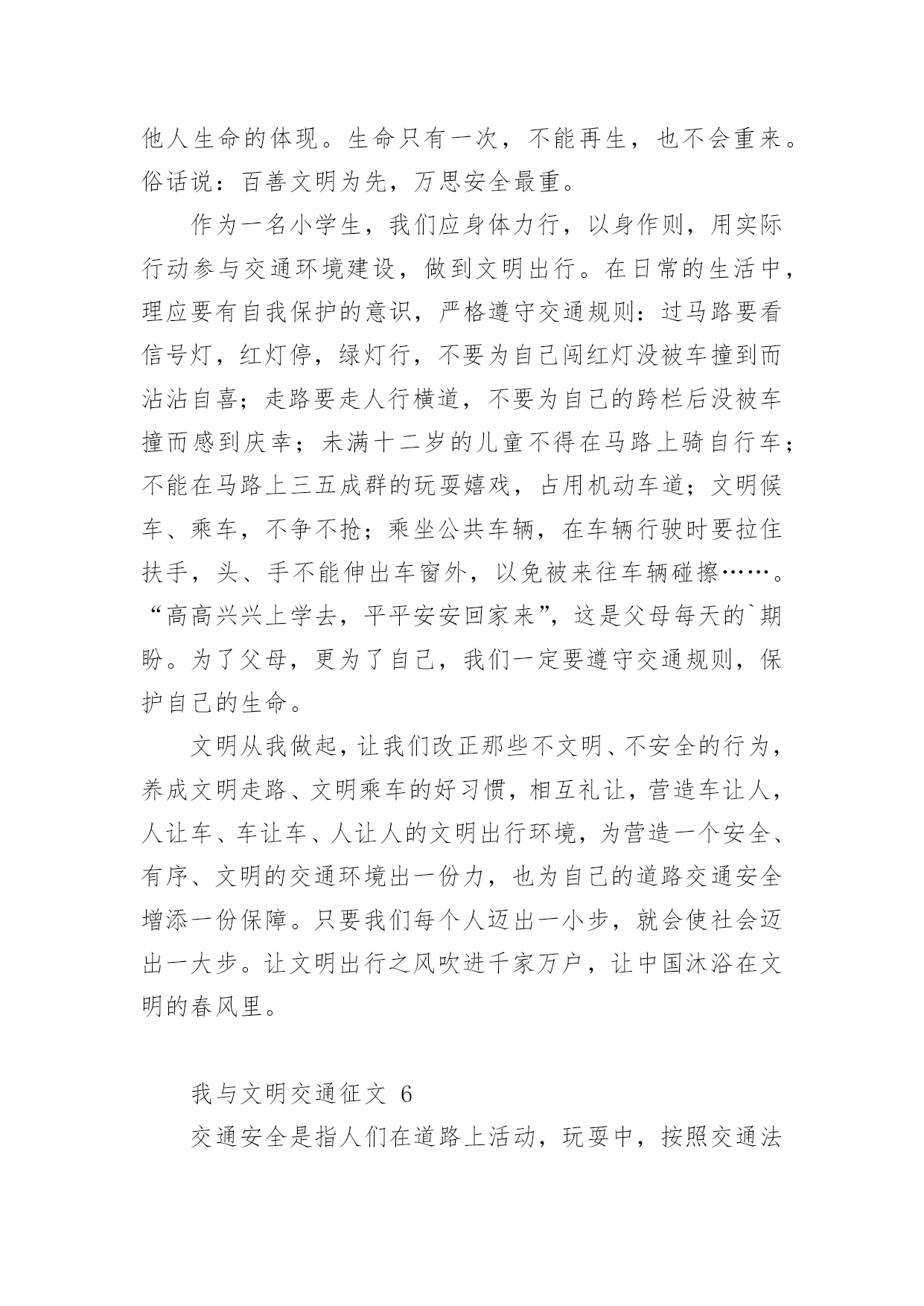 我与文明交通征文我与文明交通征文(精选35篇)无论在学习、工作或是生活中,大家都有写征文的经历,对征文很是熟悉吧,写征文是培养人们的观察力、联想力、想象力、思考力和记忆力的重要手段。那要怎么写好征文呢?以下是小编整理的我与文明交通征文,欢迎阅读与收藏。我与文明交通征文1生命只有一次,生命对于我们每一个人来说都很重要。可近年来,因为交通事故使无数人失去了自己宝贵的生命。这是因为有些人总是酒后驾驶,而发生重大事故。现在每个路口都安装了红绿灯,可因为有些人乱闯红灯,发生了交通事故。因为这些原因发生的事故是数不胜数,可那些不遵守交通规则的人就是不吸取教训,依然闯红灯、酒后驾车。今天,我又在电视上看到了一件重大安全事故,是一件闯红灯后发生的事故。公路上的车辆川流不息,到了红绿灯处,是红灯,所有的车都停了下来。唯独有一辆机动车为了节省时间,一下子冲了过去。刚好侧面也飞驰而来一辆面包车。只听“呯”一声巨响,面包车和机动车相撞了,两辆车已撞得不成样子。一位车主被撞飞到护栏边,一动不动。面包车车主被卡在车座里已经奄奄一息。旁边是他的妻子也仅有一丝气息。后面坐着两个五六岁的孩子哭着喊爸爸妈妈,可见他们俩已被吓坏了。真是可怜!救护车马上来了,经过救治,面包车、机动车车主当场死亡。那位女士被送到医院后,医生用尽了全力救治,已无回天子术了。那两个孩子就这样失去了父母成了孤儿。他们原本幸福美好的家庭破碎了,试问,这何尝不是因为哪位机动车主不遵守交通规则而产生的后果呢?不遵守交通规则的.人后果就是这样,那么遵守交通规则不乱闯红灯的人呢?我比较喜欢骑自行车,每到星期天我就会骑车赶集。到了红绿灯处我会先看看是红灯还是绿灯,我们都要做一个遵守交通规则的人。这一次是红灯,我就停下来。这时,有一位叔叔想闯红灯,往前走了走,但马上又向后倒了倒。我想,他应该是看到我们都停在那里自己,不好意思,所以打消了闯红灯的念头。绿灯亮了,大家都有秩序的走了,个个都平安无事。而那些闯红灯的人呢?他们为自己的行为付出了惨痛的代价。生命只有一次,失去了就无法挽回,我们要珍爱生命,不能拿自己的生命当做儿戏。只有遵守交通规则,我们才能做到关爱生命,平安出行。我与文明交通征文2随着社会的发展汽车越来越多了,人们的生活也比以前方便了,马路也越来越拥挤了。看到川流不息的车辆,使我们感到社会经济的发展真是突飞猛进,让我们欣慰。可任何事情都是相对的。汽车给我们带来的灾祸数不胜数。马路上上演的悲剧真是一幕又一幕。有些司机不遵守交通规则给于我们的教训是惨痛的。我虽然不开车,也不大懂交通规则,但我挺爱看赛车节目的,我想如果一个F1赛车手能在弯道上超车他就离夺冠不远了。可是司机不是赛车手,如果急于超车、闯红灯,那他就会离危险不远了。出车祸的机率就大大提高了,我们既没有受过F1赛车手的转业训练,我们的车也不像赛车那样有马力,又何必超车呢?我们知道安全是第一的,是健康与财富的.保障。刚才我写的虽然有点可怕,但这种交通事故就在我们身边:记得有一次妈妈下班回家,天色比较晚了,他飞快的骑车在回家的路上。忽然冷不防从马路上拐来一辆出租车,车速很快也不打拐弯灯,妈妈躲闪不及一下被车撞倒了,出租车司机被吓坏了,妈妈也吓得魂飞魄散。当我们赶到时,妈妈站不起来了,脸色惨白,出了一身冷汗。万幸的是妈妈只受了轻伤。可是这个故事却给了妈妈和出租车司机留下了沉痛的记忆和深刻的教训。如果妈妈能慢点骑,不急着赶路,出租车司机能文明驾驶,不乱停乱靠一切都不会发生。和我最好的小朋友杨光,他最爱在马路上骑自行车兜风了,觉得这样很神气很过瘾。一天,他自己骑车横穿马路,飞也似的旁若无人,这时来了一辆汽车开得很快,他慌了手脚躲闪不及一下子撞倒了护栏上。幸好撞到了护栏上,幸好只把嘴摔破了。当他看到血的时候同样也吓坏了,如果他早一天明白生命是不能随便用来开玩笑的,一切不是就不会发生了吗?爸爸每天上班都开车,我都告诉他注意安全。每次他开车出去吃饭我都叮嘱他不要喝酒。有时他都嫌我们太唠叨,可却不理解我们对他的好意,是为了她的安全。生命是最大的财富,安全是生命首要的保障,与我们每个人都息息相关的,因此遵守交通规则是我们每个人都必须做到的。我与文明交通征文3人人都知道,我们只有一个地球;而地球是人类与所有生命共同的地球。生命的延续,人类的生存,一刻也离不开自然资源。而面对今天地球的现状,每一个稍有良知的人都不能不为地球的.明天而忧虑。举目四顾,好些地方,青山不再青,绿水不再绿,河里流的是臭水,山上倒满的是垃圾,满眼都是白色的、黄色的、黑色的、红色的废水废碴废旧电池废塑料……你可知道,被你随手丢弃的垃圾需要多久才才会分解?让我来告诉你吧,塑料瓶:450年;易拉罐:200—250年;铁罐头盒100年;油漆过的木板:13年;棉织物:1—5个月;纸片:半个月。地球只有