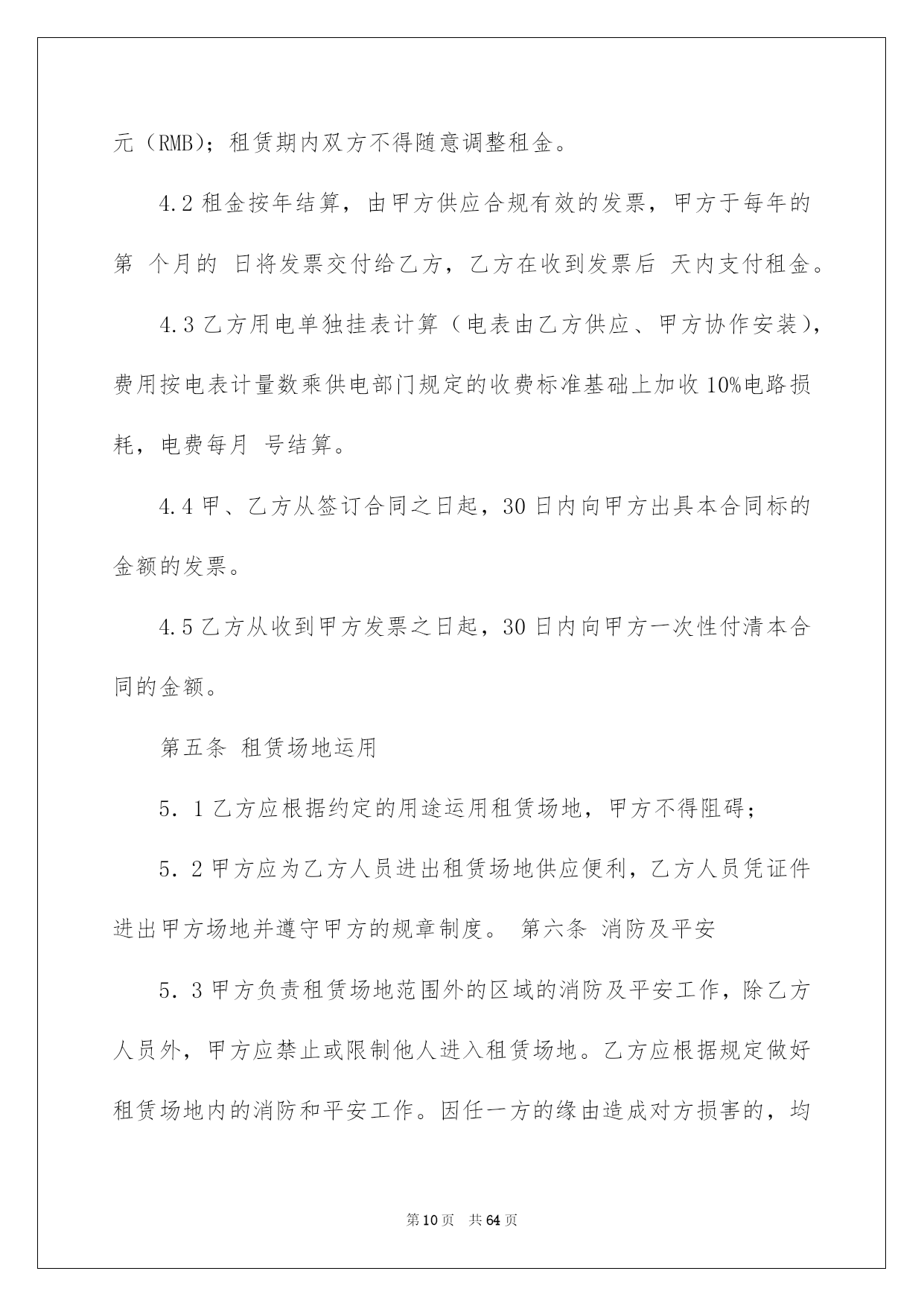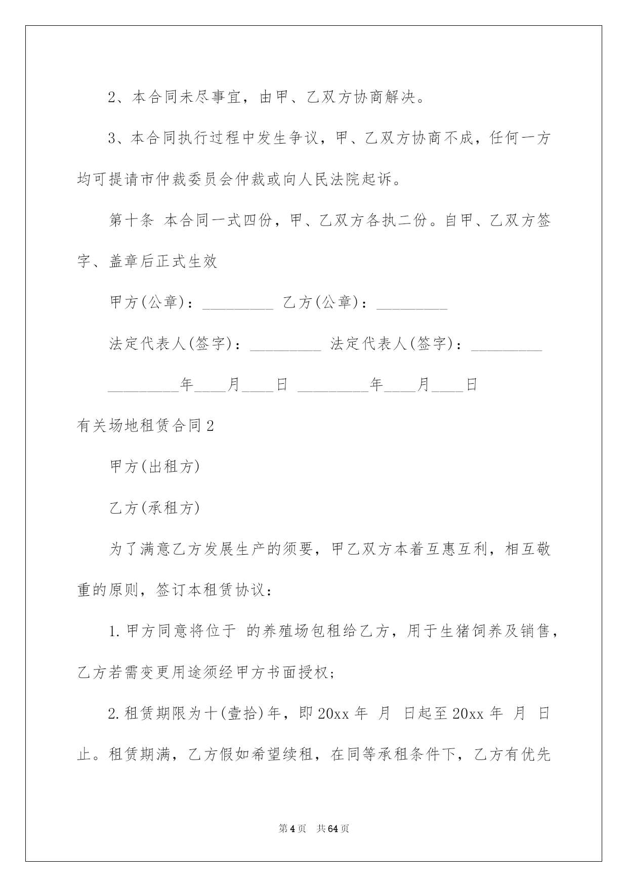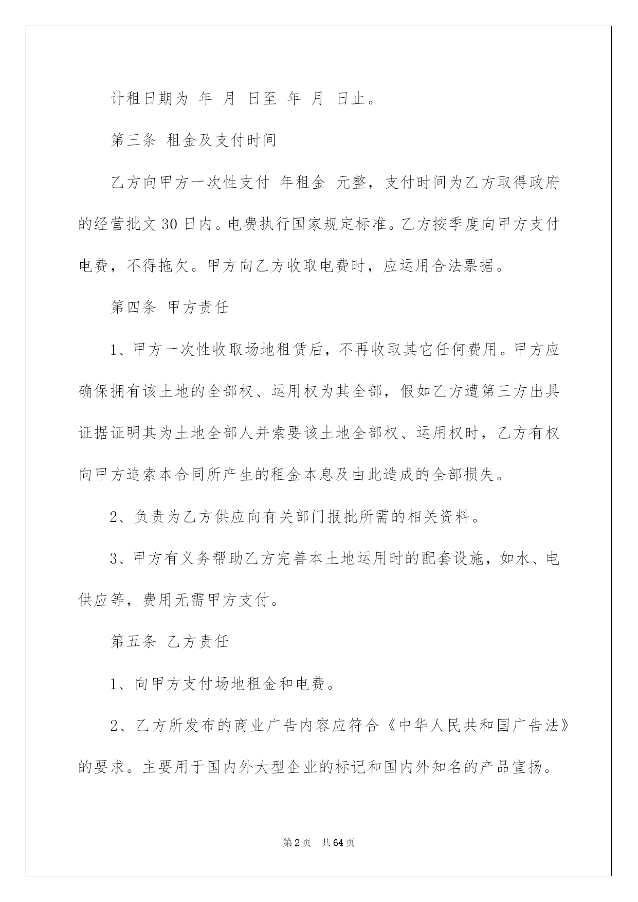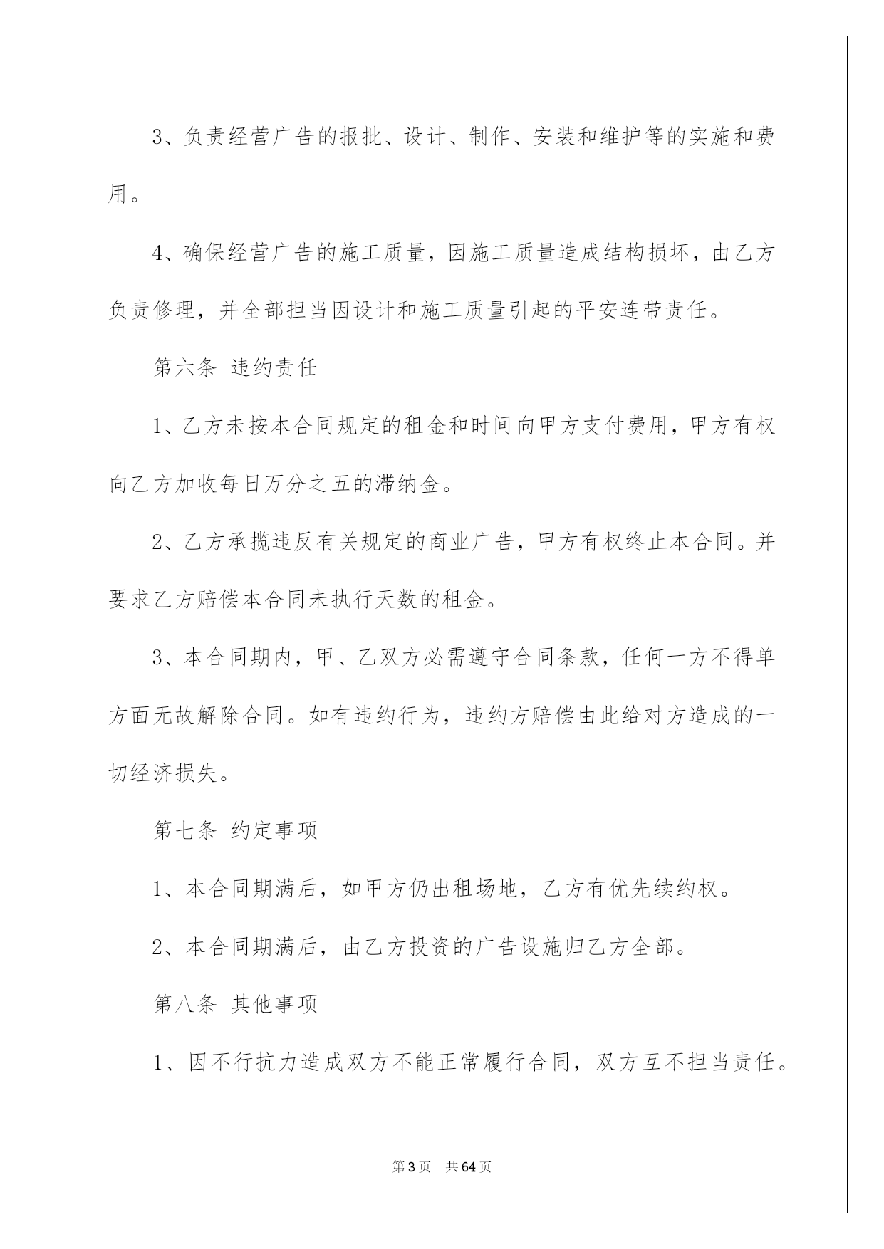第PAGE\*Arabic\*MERGEFORMAT64页共NUMPAGES\*Arabic\*MERGEFORMAT64页第PAGE\*MERGEFORMAT64页共NUMPAGES\*MERGEFORMAT64页第PAGE\*MERGEFORMAT64页共NUMPAGES\*MERGEFORMAT64页第PAGE\*MERGEFORMAT64页共NUMPAGES\*MERGEFORMAT64页第PAGE\*MERGEFORMAT64页共NUMPAGES\*MERGEFORMAT64页第PAGE\*MERGEFORMAT64页共NUMPAGES\*MERGEFORMAT64页第PAGE\*MERGEFORMAT64页共NUMPAGES\*MERGEFORMAT64页第PAGE\*MERGEFORMAT64页共NUMPAGES\*MERGEFORMAT64页第PAGE\*MERGEFORMAT64页共NUMPAGES\*MERGEFORMAT64页第PAGE\*MERGEFORMAT64页共NUMPAGES\*MERGEFORMAT64页第PAGE\*MERGEFORMAT64页共NUMPAGES\*MERGEFORMAT64页2022场地租赁合同有关场地租赁合同15篇在人们越来越信任法律的社会中,我们用到合同的地方越来越多,签订合同可以明确双方当事人的权利和义务。那么大家知道正规的合同书怎么写吗?以下是我帮大家整理的有关场地租赁合同,希望对大家有所帮助。有关场地租赁合同1甲方:乙方:本着互惠互利、共同发展的宗旨,依据国家有关法律规定,经友好协商,就乙方租用甲方场地经营商业广告事宜,双方达成一样看法,特签订本合同。第一条租赁标的乙方租用甲方位于,东西长3.5米,南北长3.5米,总计12.5平方米,做为乙方经营商业广告的场地。其次条租赁期限计租日期为年月日至年月日止。第三条租金及支付时间乙方向甲方一次性支付年租金元整,支付时间为乙方取得政府的经营批文30日内。电费执行国家规定标准。乙方按季度向甲方支付电费,不得拖欠。甲方向乙方收取电费时,应运用合法票据。第四条甲方责任1、甲方一次性收取场地租赁后,不再收取其它任何费用。甲方应确保拥有该土地的全部权、运用权为其全部,假如乙方遭第三方出具证据证明其为土地全部人并索要该土地全部权、运用权时,乙方有权向甲方追索本合同所产生的租金本息及由此造成的全部损失。2、负责为乙方供应向有关部门报批所需的相关资料。3、甲方有义务帮助乙方完善本土地运用时的配套设施,如水、电供应等,费用无需甲方支付。第五条乙方责任1、向甲方支付场地租金和电费。2、乙方所发布的商业广告内容应符合《中华人民共和国广告法》的要求。主要用于国内外大型企业的标记和国内外知名的产品宣扬。3、负责经营广告的报批、设计、制作、安装和维护等的实施和费用。4、确保经营广告的施工质量,因施工质量造成结构损坏,由乙方负责修理,并全部担当因设计和施工质量引起的平安连带责任。第六条违约责任1、乙方未按本合同规定的租金和时间向甲方支付费用,甲方有权向乙方加收每日万分之五的滞纳金。2、乙方承揽违反有关规定的商业广告,甲方有权终止本合同。并要求乙方赔偿本合同未执行天数的租金。3、本合同期内,甲、乙双方必需遵守合同条款,任何一方不得单方面无故解除合同。如有违约行为,违约方赔偿由此给对方造成的一切经济损失。第七条约定事项1、本合同期满后,如甲方仍出租场地,乙方有优先续约权。2、本合同期满后,由乙方投资的广告设施归乙方全部。第八条其他事项1、因不行抗力造成双方不能正常履行合同,双方互不担当责任。2、本合同未尽事宜,由甲、乙双方协商解决。3、本合同执行过程中发生争议,甲、乙双方协商不成,任何一方均可提请市仲裁委员会仲裁或向人民法院起诉。第十条本合同一式四份,甲、乙双方各执二份。自甲、乙双方签字、盖章后正式生效甲方(公章):_________乙方(公章):_________法定代表人(签字):_________法定代表人(签字):__________________年____月____日_________年____月____日有关场地租赁合同2甲方(出租方)乙方(承租方)为了满意乙方发展生产的须要,甲乙双方本着互惠互利,相互敬重的原则,签订本租赁协议:1.甲方同意将位于的养殖场包租给乙方,用于生猪饲养及销售,乙方若需变更用途须经甲方书面授权;2.租赁期限为十(壹拾)年,即20xx年月日起至20xx年月日止。租赁期满,乙方假如希望续租,在同等承租条件下,乙方有优先权;3.该租赁物为包括(详见清单一);4.该租赁