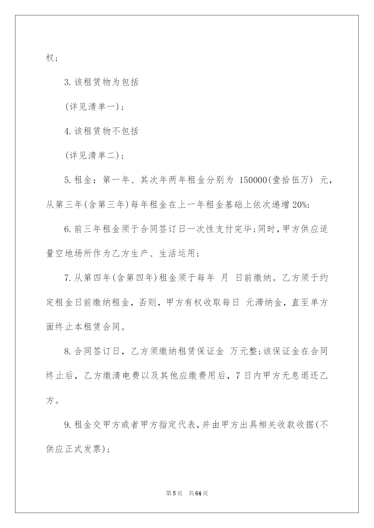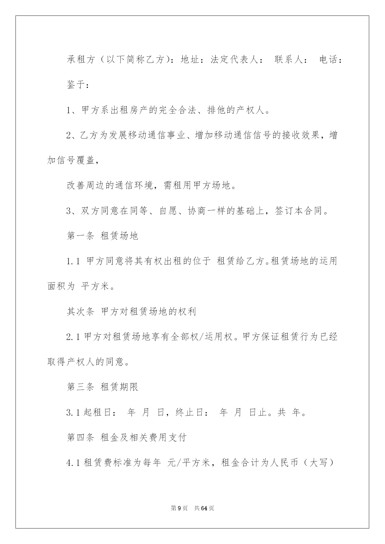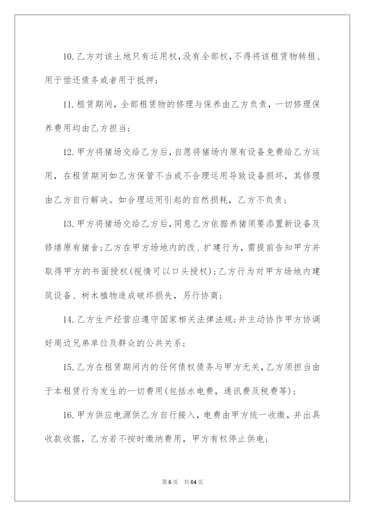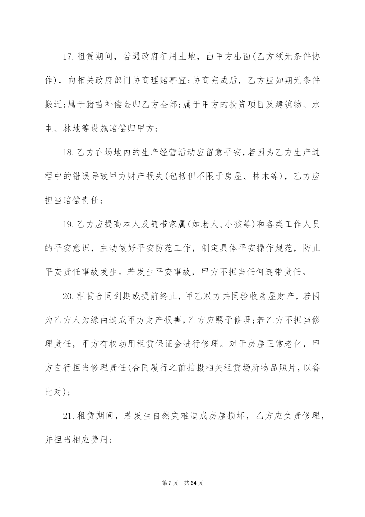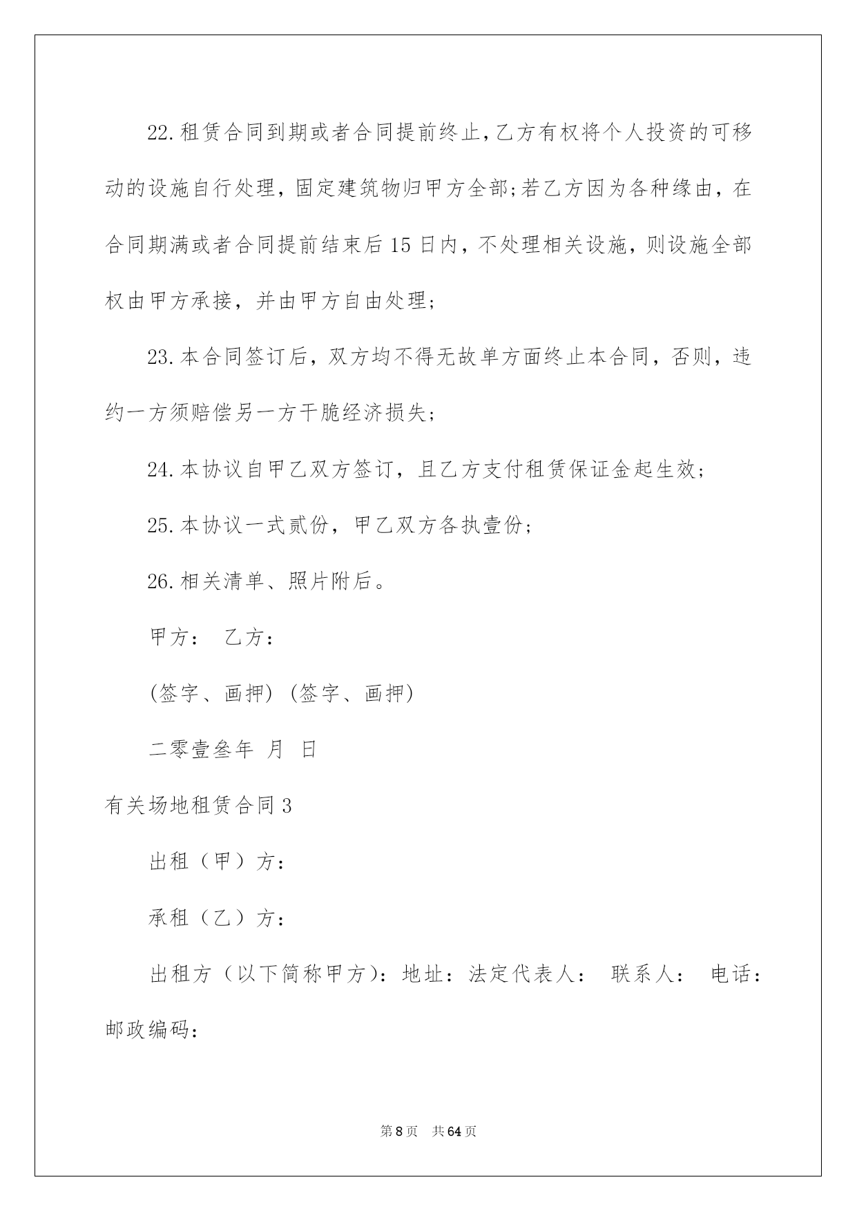 第PAGE\*Arabic\*MERGEFORMAT64页共NUMPAGES\*Arabic\*MERGEFORMAT64页第PAGE\*MERGEFORMAT64页共NUMPAGES\*MERGEFORMAT64页第PAGE\*MERGEFORMAT64页共NUMPAGES\*MERGEFORMAT64页第PAGE\*MERGEFORMAT64页共NUMPAGES\*MERGEFORMAT64页第PAGE\*MERGEFORMAT64页共NUMPAGES\*MERGEFORMAT64页第PAGE\*MERGEFORMAT64页共NUMPAGES\*MERGEFORMAT64页第PAGE\*MERGEFORMAT64页共NUMPAGES\*MERGEFORMAT64页第PAGE\*MERGEFORMAT64页共NUMPAGES\*MERGEFORMAT64页第PAGE\*MERGEFORMAT64页共NUMPAGES\*MERGEFORMAT64页第PAGE\*MERGEFORMAT64页共NUMPAGES\*MERGEFORMAT64页第PAGE\*MERGEFORMAT64页共NUMPAGES\*MERGEFORMAT64页2022场地租赁合同有关场地租赁合同15篇在人们越来越信任法律的社会中,我们用到合同的地方越来越多,签订合同可以明确双方当事人的权利和义务。那么大家知道正规的合同书怎么写吗?以下是我帮大家整理的有关场地租赁合同,希望对大家有所帮助。有关场地租赁合同1甲方:乙方:本着互惠互利、共同发展的宗旨,依据国家有关法律规定,经友好协商,就乙方租用甲方场地经营商业广告事宜,双方达成一样看法,特签订本合同。第一条租赁标的乙方租用甲方位于,东西长3.5米,南北长3.5米,总计12.5平方米,做为乙方经营商业广告的场地。其次条租赁期限计租日期为年月日至年月日止。第三条租金及支付时间乙方向甲方一次性支付年租金元整,支付时间为乙方取得政府的经营批文30日内。电费执行国家规定标准。乙方按季度向甲方支付电费,不得拖欠。甲方向乙方收取电费时,应运用合法票据。第四条甲方责任1、甲方一次性收取场地租赁后,不再收取其它任何费用。甲方应确保拥有该土地的全部权、运用权为其全部,假如乙方遭第三方出具证据证明其为土地全部人并索要该土地全部权、运用权时,乙方有权向甲方追索本合同所产生的租金本息及由此造成的全部损失。2、负责为乙方供应向有关部门报批所需的相关资料。3、甲方有义务帮助乙方完善本土地运用时的配套设施,如水、电供应等,费用无需甲方支付。第五条乙方责任1、向甲方支付场地租金和电费。2、乙方所发布的商业广告内容应符合《中华人民共和国广告法》的要求。主要用于国内外大型企业的标记和国内外知名的产品宣扬。3、负责经营广告的报批、设计、制作、安装和维护等的实施和费用。4、确保经营广告的施工质量,因施工质量造成结构损坏,由乙方负责修理,并全部担当因设计和施工质量引起的平安连带责任。第六条违约责任1、乙方未按本合同规定的租金和时间向甲方支付费用,甲方有权向乙方加收每日万分之五的滞纳金。2、乙方承揽违反有关规定的商业广告,甲方有权终止本合同。并要求乙方赔偿本合同未执行天数的租金。3、本合同期内,甲、乙双方必需遵守合同条款,任何一方不得单方面无故解除合同。如有违约行为,违约方赔偿由此给对方造成的一切经济损失。第七条约定事项1、本合同期满后,如甲方仍出租场地,乙方有优先续约权。2、本合同期满后,由乙方投资的广告设施归乙方全部。第八条其他事项1、因不行抗力造成双方不能正常履行合同,双方互不担当责任。2、本合同未尽事宜,由甲、乙双方协商解决。3、本合同执行过程中发生争议,甲、乙双方协商不成,任何一方均可提请市仲裁委员会仲裁或向人民法院起诉。第十条本合同一式四份,甲、乙双方各执二份。自甲、乙双方签字、盖章后正式生效甲方(公章):_________乙方(公章):_________法定代表人(签字):_________法定代表人(签字):__________________年____月____日_________年____月____日有关场地租赁合同2甲方(出租方)乙方(承租方)为了满意乙方发展生产的须要,甲乙双方本着互惠互利,相互敬重的原则,签订本租赁协议:1.甲方同意将位于的养殖场包租给乙方,用于生猪饲养及销售,乙方若需变更用途须经甲方书面授权;2.租赁期限为十(壹拾)年,即20xx年月日起至20xx年月日止。租赁期满,乙方假如希望续租,在同等承租条件下,乙方有优先权;3.该租赁物为包括(详见清单一);4.该租赁